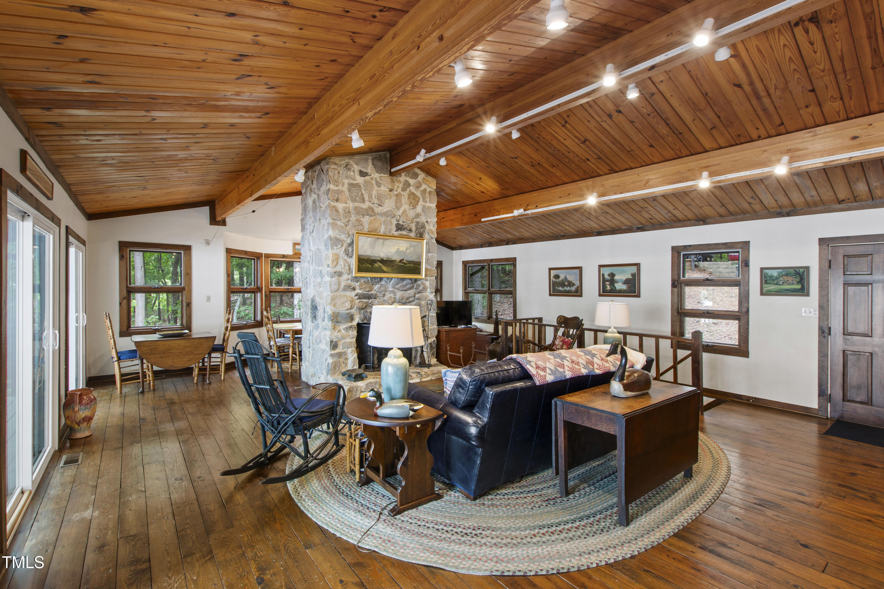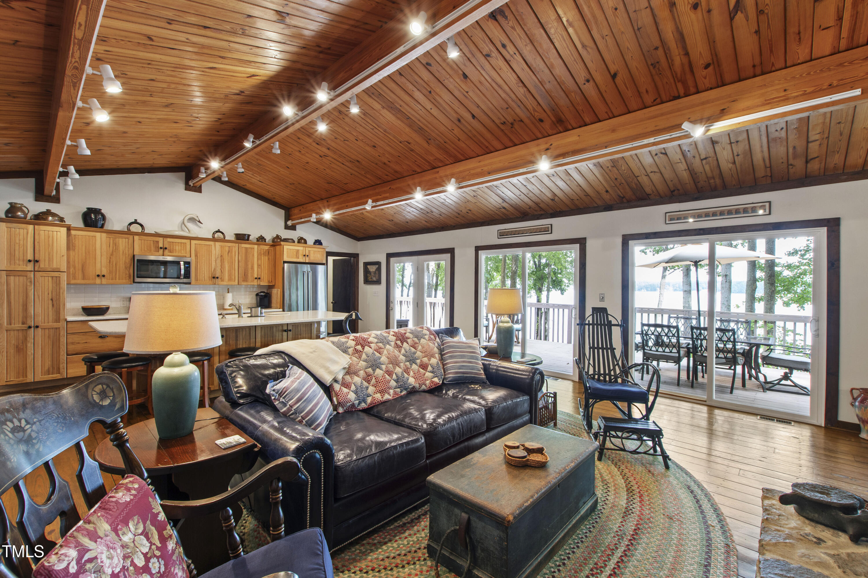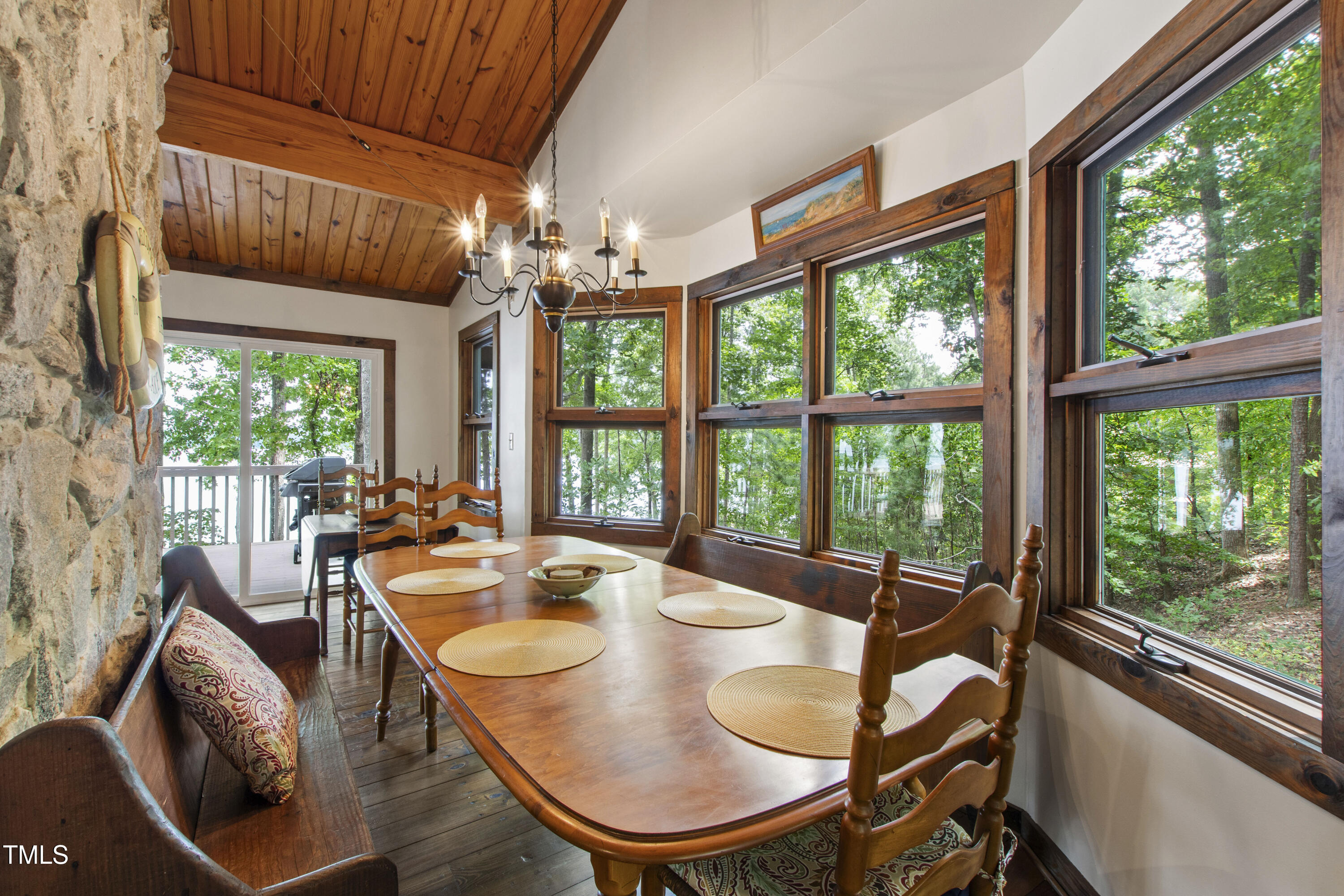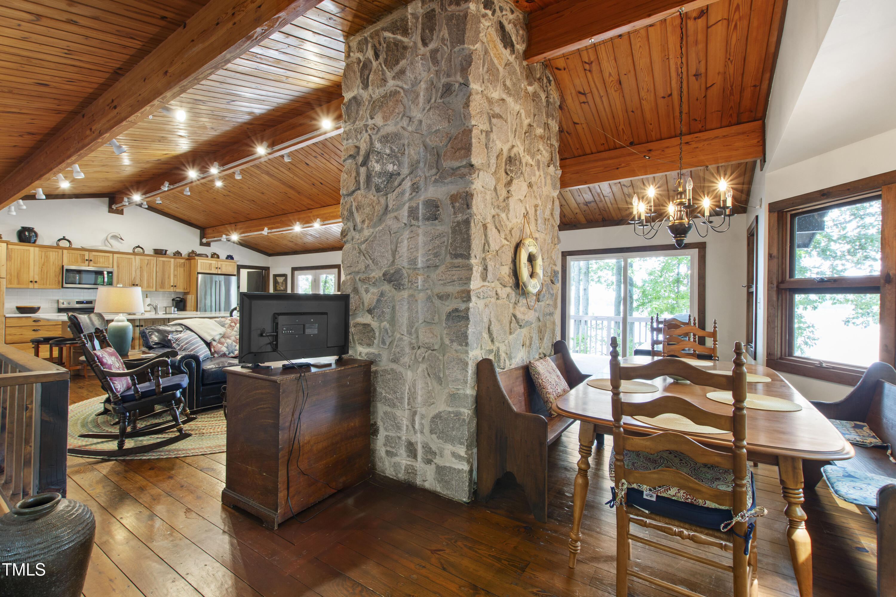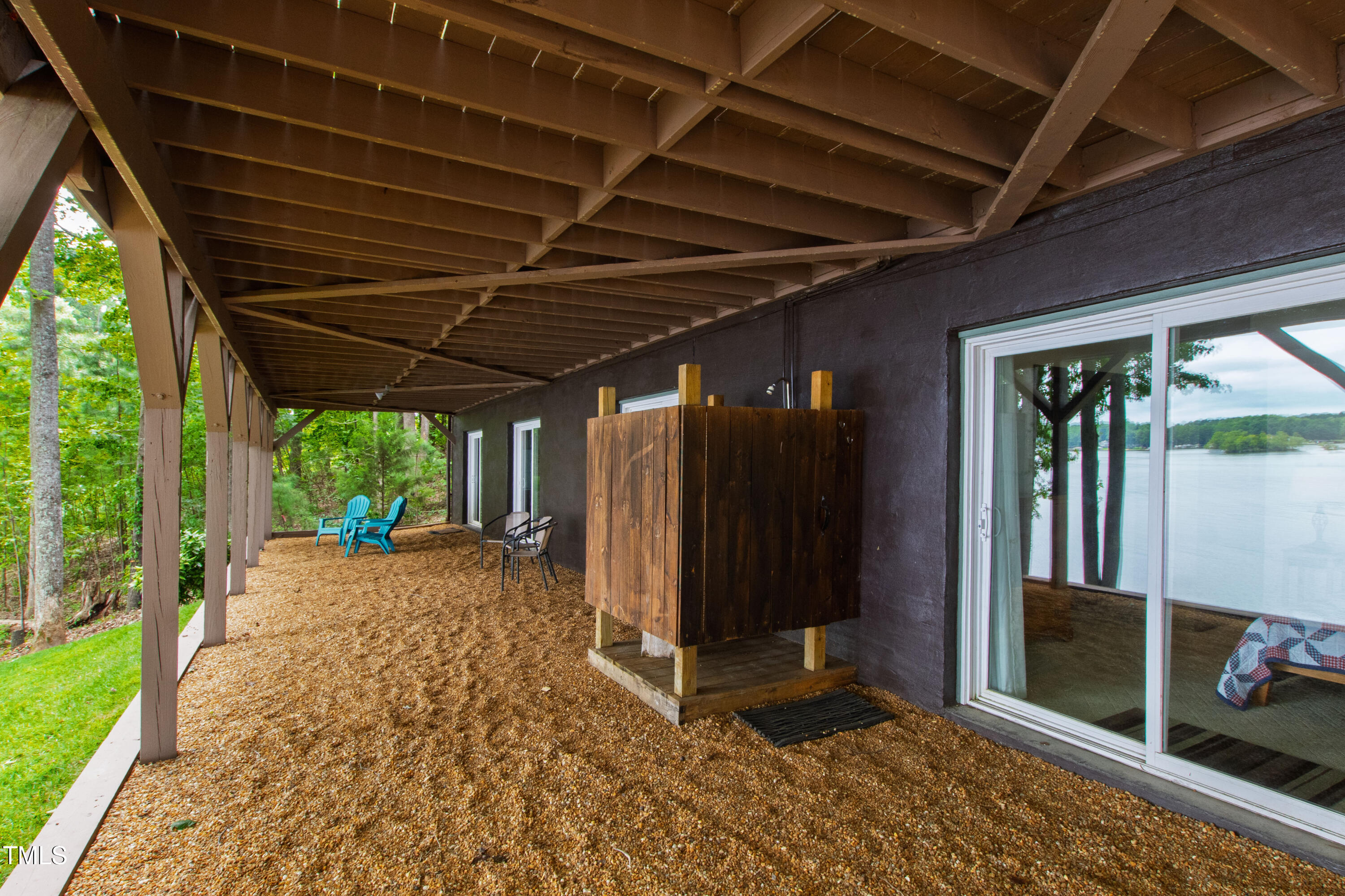 Experience the potential of this truly unique lakeside-living opportunity. Whether you seek a full-time residence in an utterly idyllic location, a vacation escape with unmatched privacy, or a one-of-a-kind investment with endless future build potential, 154 N Triton Drive delivers on every front. Set in the charming yet convenient town of Littleton, North Carolina, this 4 bedroom Lake Gaston lodge on the lake's southeast side is the perfect waterfront home. With 200+ feet of bulkhead, main lake, deep water frontage, the home is also flanked by two approved building lots each with permitted in-ground septic systems and rip rap. These lots are ready to build three-bedroom houses to create a private family compound, or they could remain as a wooded 2+ acre retreat with 700 feet of unobstructed main lake frontage on the widest part of the lake - a rarity for Lake Gaston properties. The main level of this cabin-inspired home boasts a desirable open floor-plan, with architecturally appealing, vaulted, wood-beamed ceilings, pristine hardwood floors throughout, and a spectacular wall of windows allowing for endless natural light and 24/7 lake views. A gourmet, customized kitchen with oversized island and recently updated stainless steel appliances perfectly matches the overall aesthetic of the property. The kitchen sits adjacent to the utmost inviting living room space, complete with a charming stone-work, wood-burning fireplace which dually splits the space from the cozy dining room, perfect for family dinners of all sizes. The primary suite offers serene lake views and private comfort, while an additional bedroom on this level is ideally situated for flexible guest or family use. The lower level basement is anchored in a must-have bonus space, the ideal landing pad following a sun-filled day out on the water. Two additional lake-facing bedrooms feature stunning panoramic views, creating a true retreat for guests or family members. A generously sized laundry room with full size washer and dryer, utility sink, storage shelves and beverage refrigerator finish off this space. As you step outside, you're greeted by unparalleled main lake views from the abode's stunning back deck, stretching the length of the home - a space prime for morning coffees or evening grilling. Tiered landscaping and a thoughtfully designed stone-lit pathway guide you through the terraced backyard, where cozy gathering areas--like a fire pit and stone patio--bring function and serenity to this outdoor sanctuary. Once you reach the 8 foot-deep water, a generously-sized dock awaits, boasting dual boat slips with all-weather coverage and an upper deck perfect for catching rays and enjoying the stunning North Carolina sunsets. Best of all, the home is located at the end of a quiet cul de sac just minutes from marinas, grocery stores and waterfront restaurants, with Eatons Ferry Bridge within close proximity allowing for quick and opportune access across the lake. Triton Point Community offers two community boat docks which are just yards away from the property and provide additional, effortless access to the water.
