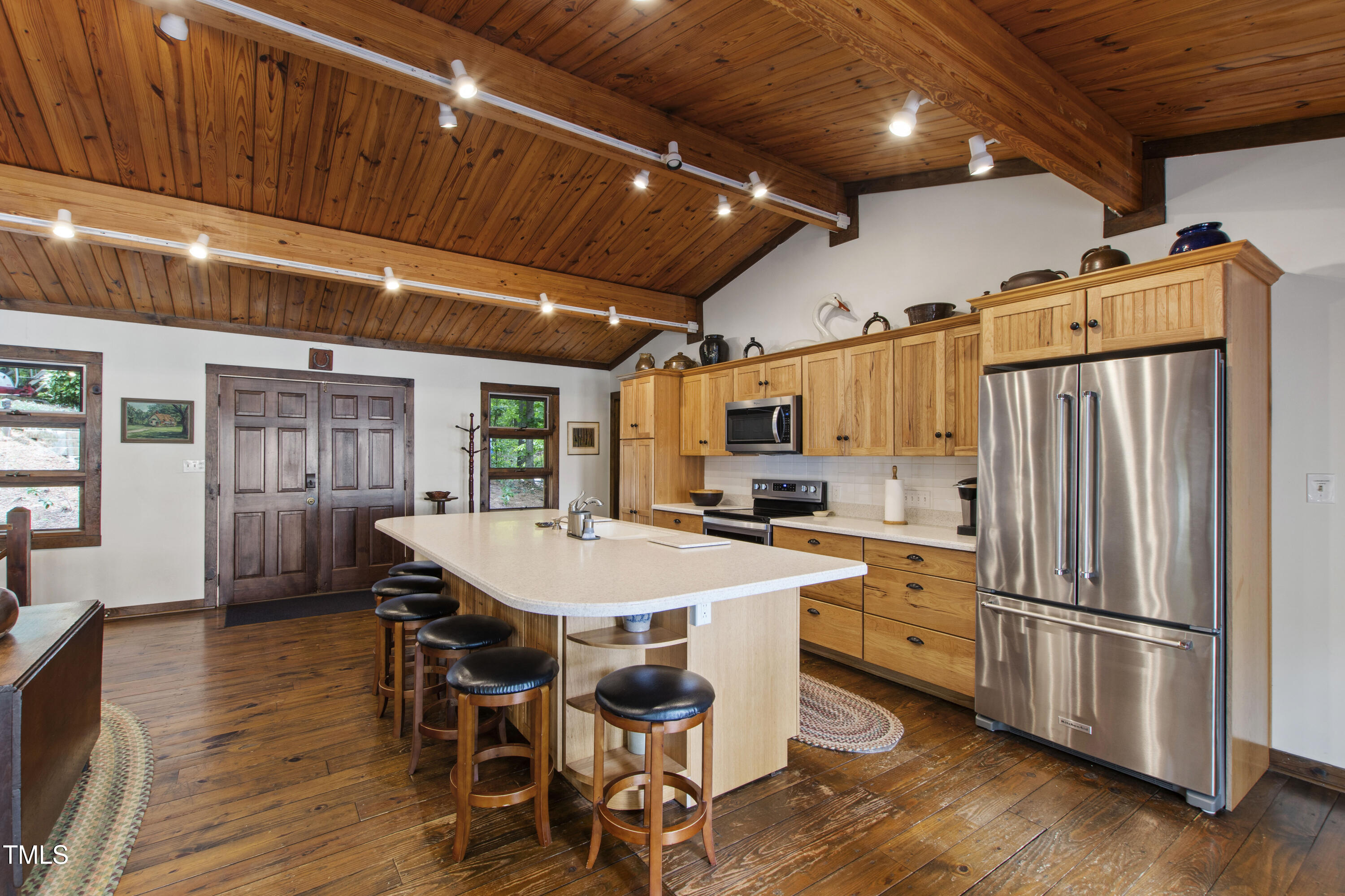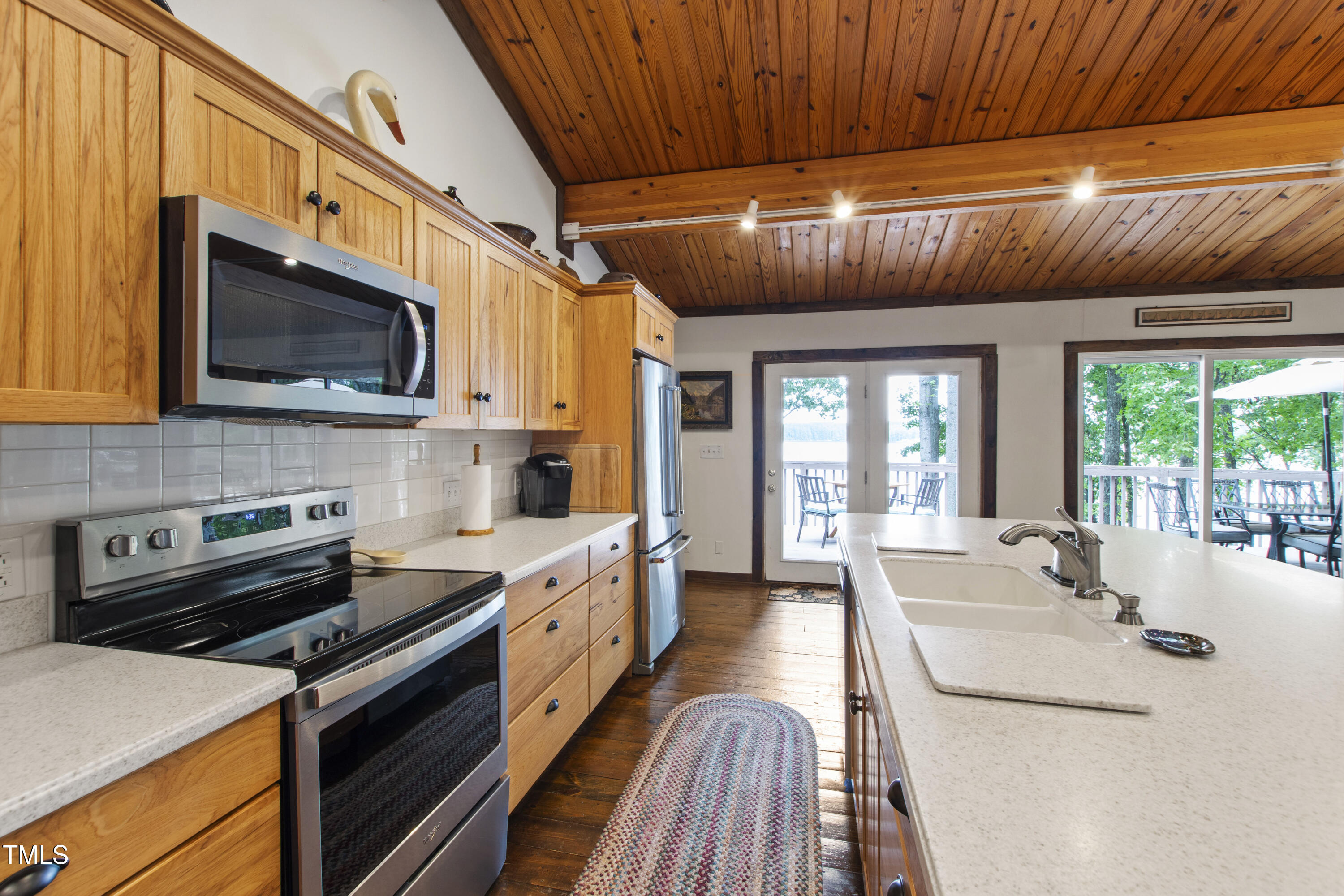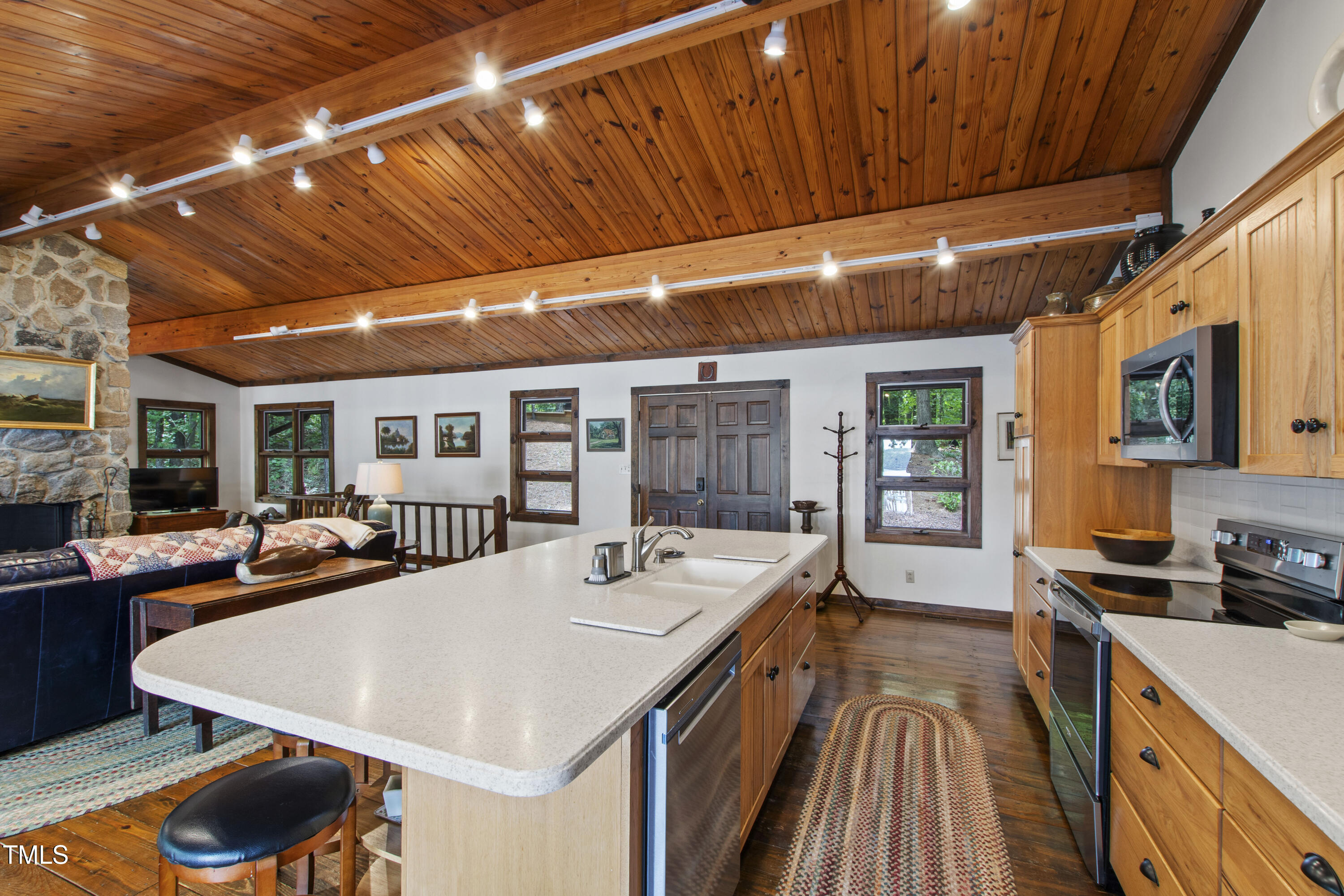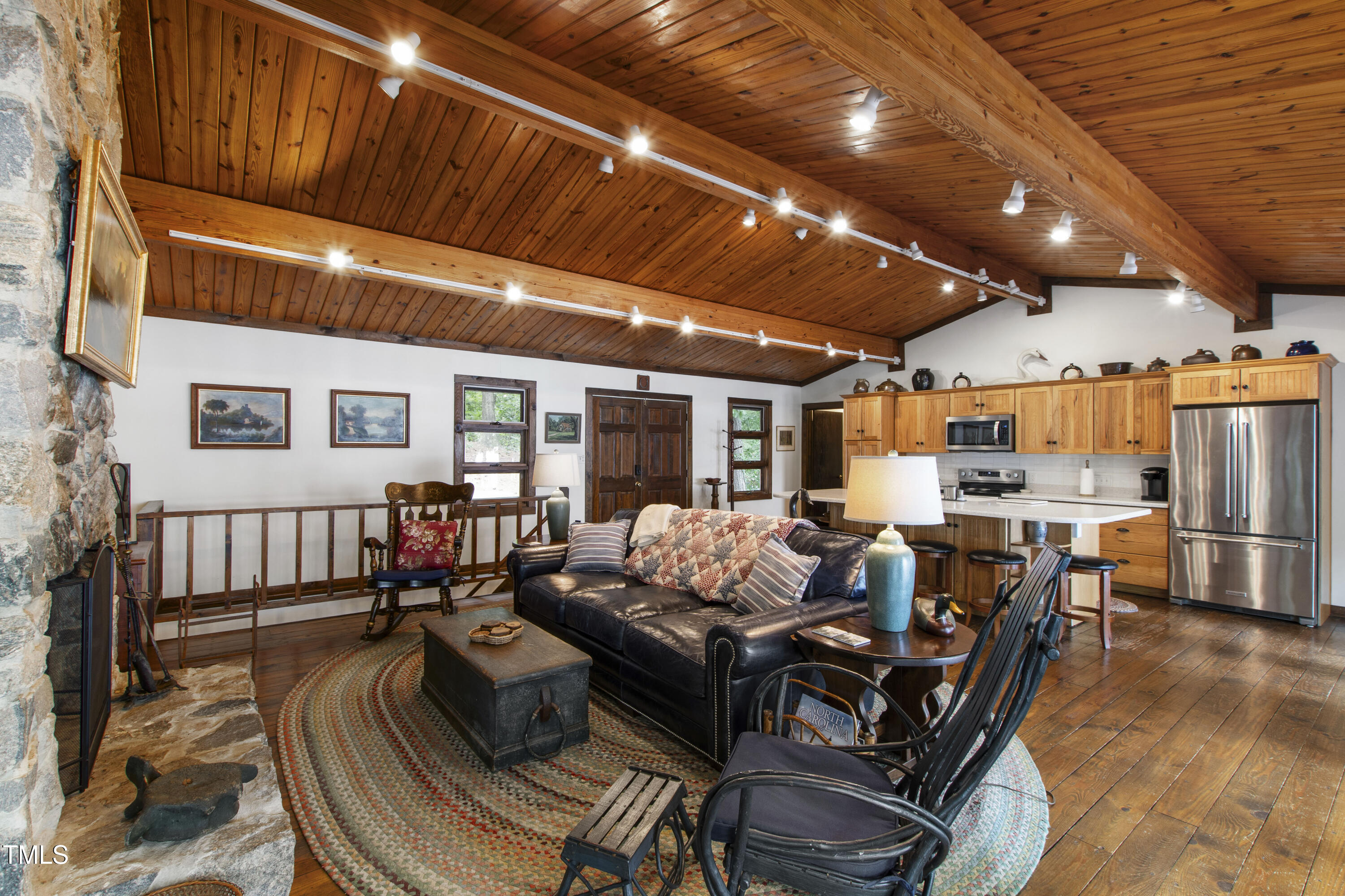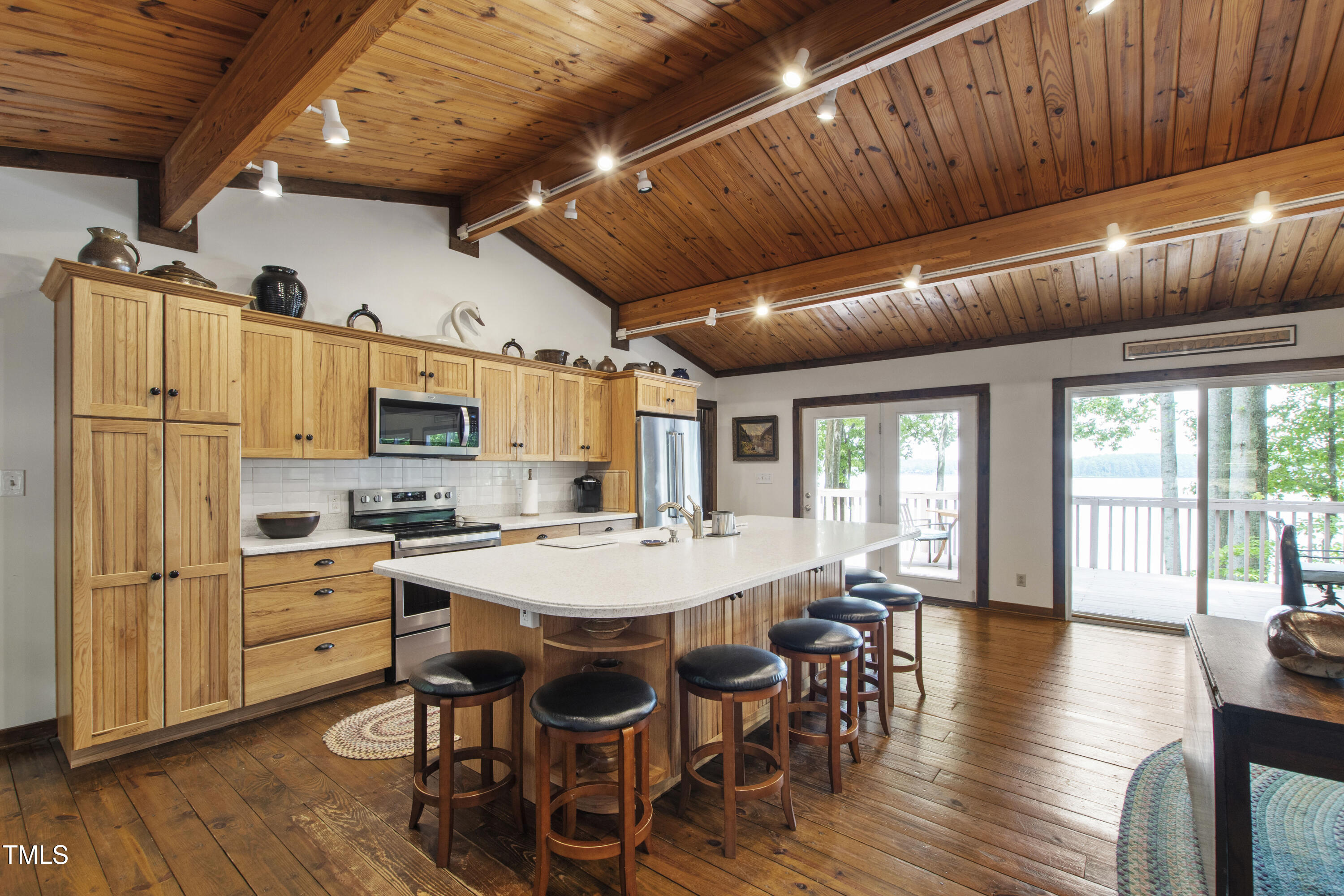 Experience the potential of this truly unique lakeside-living opportunity. Whether you seek a full-time residence in an utterly idyllic location, a vacation escape with unmatched privacy, or a one-of-a-kind investment with endless future build potential, 154 N Triton Drive delivers on every front. Set in the charming yet convenient town of Littleton, North Carolina, this 4 bedroom Lake Gaston lodge on the lake's southeast side is the perfect waterfront home. With 200+ feet of bulkhead, main lake, deep water frontage, the home is also flanked by two approved building lots each with permitted in-ground septic systems and rip rap. These lots are ready to build three-bedroom houses to create a private family compound, or they could remain as a wooded 2+ acre retreat with 700 feet of unobstructed main lake frontage on the widest part of the lake - a rarity for Lake Gaston properties. The main level of this cabin-inspired home boasts a desirable open floor-plan, with architecturally appealing, vaulted, wood-beamed ceilings, pristine hardwood floors throughout, and a spectacular wall of windows allowing for endless natural light and 24/7 lake views. A gourmet, customized kitchen with oversized island and recently updated stainless steel appliances perfectly matches the overall aesthetic of the property. The kitchen sits adjacent to the utmost inviting living room space, complete with a charming stone-work, wood-burning fireplace which dually splits the space from the cozy dining room, perfect for family dinners of all sizes. The primary suite offers serene lake views and private comfort, while an additional bedroom on this level is ideally situated for flexible guest or family use. The lower level basement is anchored in a must-have bonus space, the ideal landing pad following a sun-filled day out on the water. Two additional lake-facing bedrooms feature stunning panoramic views, creating a true retreat for guests or family members. A generously sized laundry room with full size washer and dryer, utility sink, storage shelves and beverage refrigerator finish off this space. As you step outside, you're greeted by unparalleled main lake views from the abode's stunning back deck, stretching the length of the home - a space prime for morning coffees or evening grilling. Tiered landscaping and a thoughtfully designed stone-lit pathway guide you through the terraced backyard, where cozy gathering areas--like a fire pit and stone patio--bring function and serenity to this outdoor sanctuary. Once you reach the 8 foot-deep water, a generously-sized dock awaits, boasting dual boat slips with all-weather coverage and an upper deck perfect for catching rays and enjoying the stunning North Carolina sunsets. Best of all, the home is located at the end of a quiet cul de sac just minutes from marinas, grocery stores and waterfront restaurants, with Eatons Ferry Bridge within close proximity allowing for quick and opportune access across the lake. Triton Point Community offers two community boat docks which are just yards away from the property and provide additional, effortless access to the water.