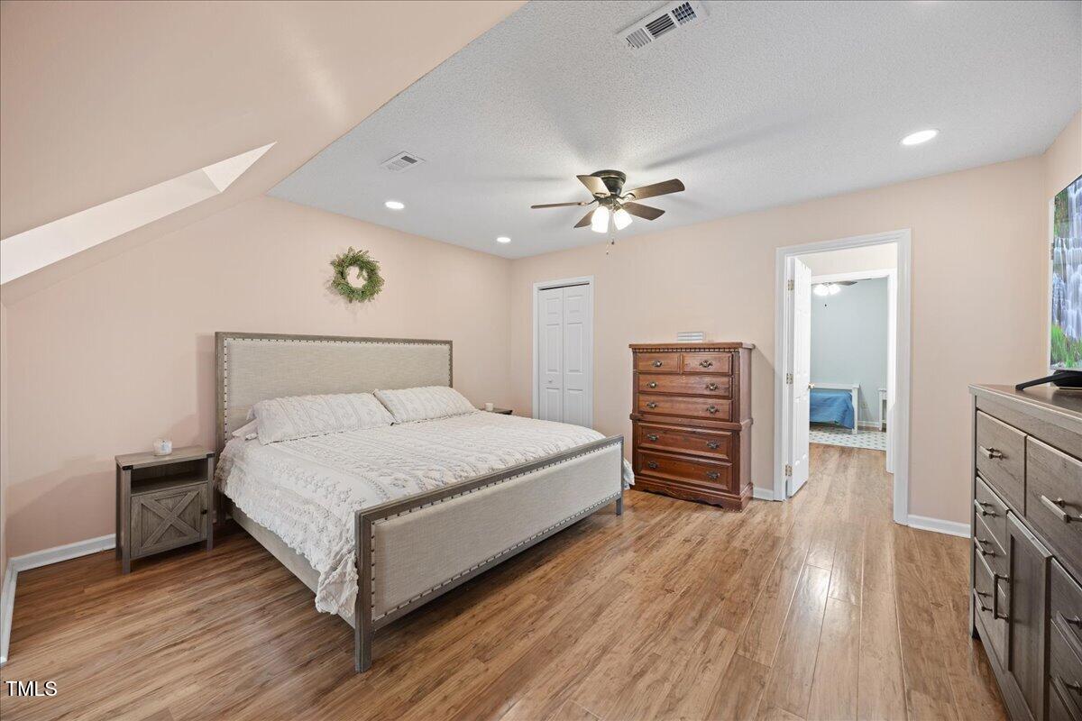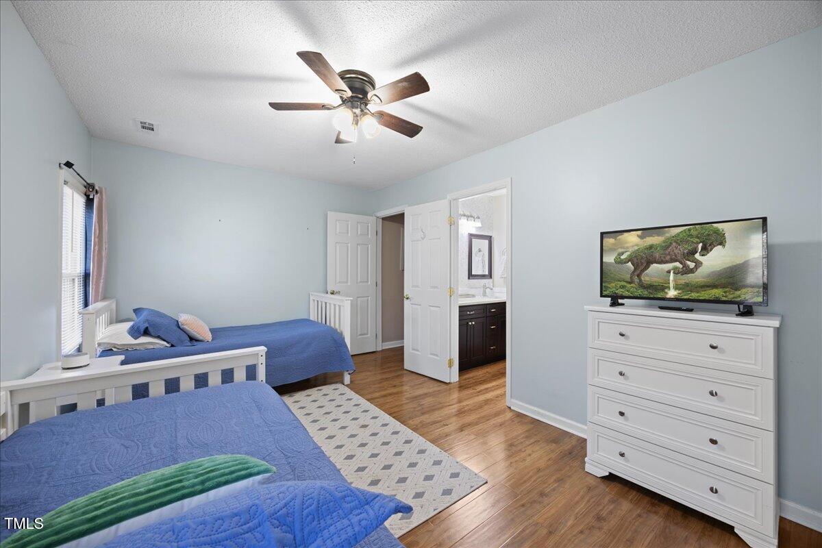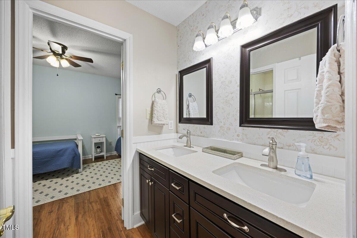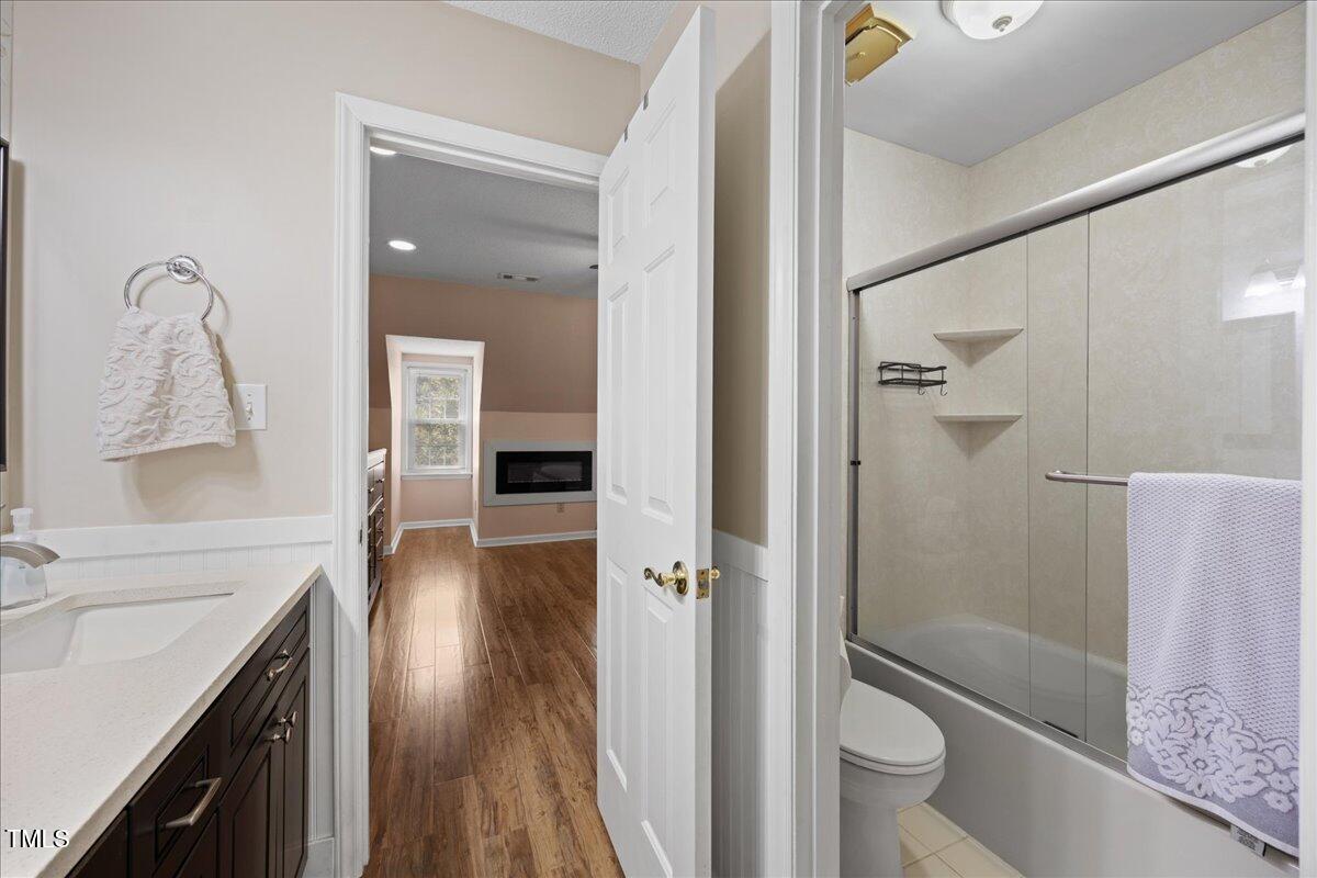 Upstairs, you'll find two generously sized bedrooms, each with ceiling fans. The primary bedroom includes recessed lighting and an electric fireplace, adding warmth and charm. The full bathroom features an updated quartz vanity, enhancing the home's modern appeal.