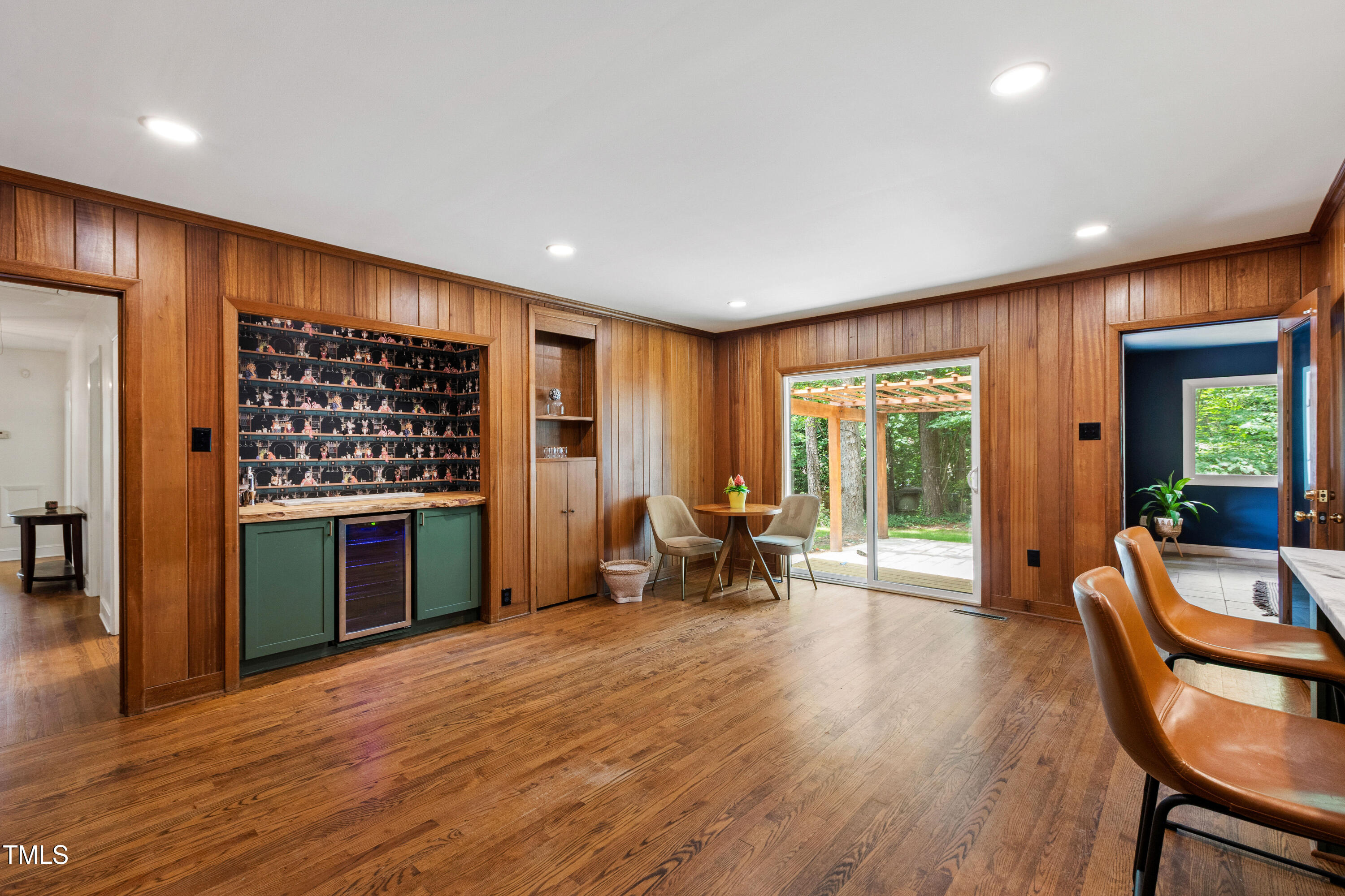 The family room is a particularly charming space, offering a sense of warmth and sophistication with its mahogany bookshelves and cozy fireplace. It also provides direct access to a beautiful sunroom that overlooks the private backyard.