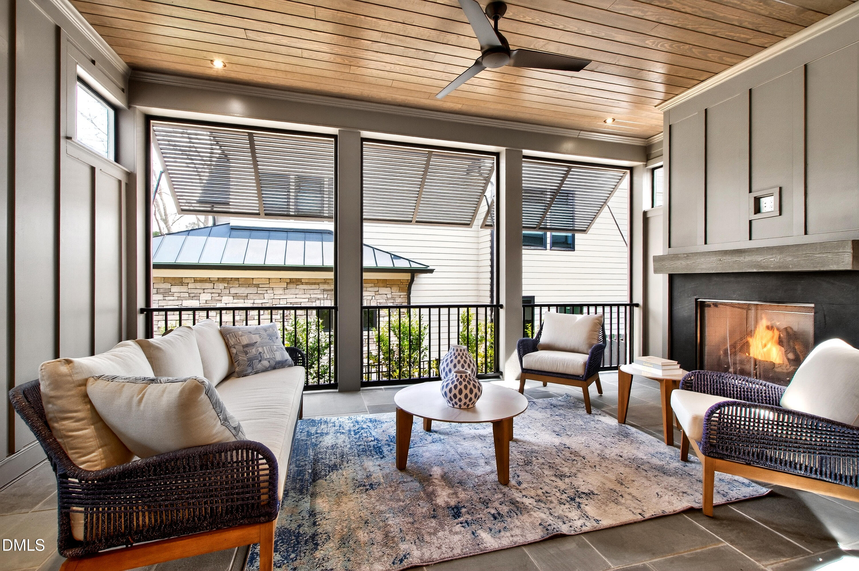 At the heart of the home is a stunning chef's kitchen with a large quartz island, gas range, custom cabinetry, and a scullery with beverage refrigerator--perfect for entertaining and everyday living. The kitchen opens to a spacious family room with built-in wood shelving, gas fireplace with quartz surround, and accordion-style sliding doors leading to a screened porch with a second fireplace, creating a seamless indoor-outdoor living experience. The main level also includes a dining room, mudroom with custom cabinetry, and convenient entry-level two-car garage. A uniquely designed study just a few steps above the main level features custom millwork and beautiful corner windows, offering a private and inspiring workspace.