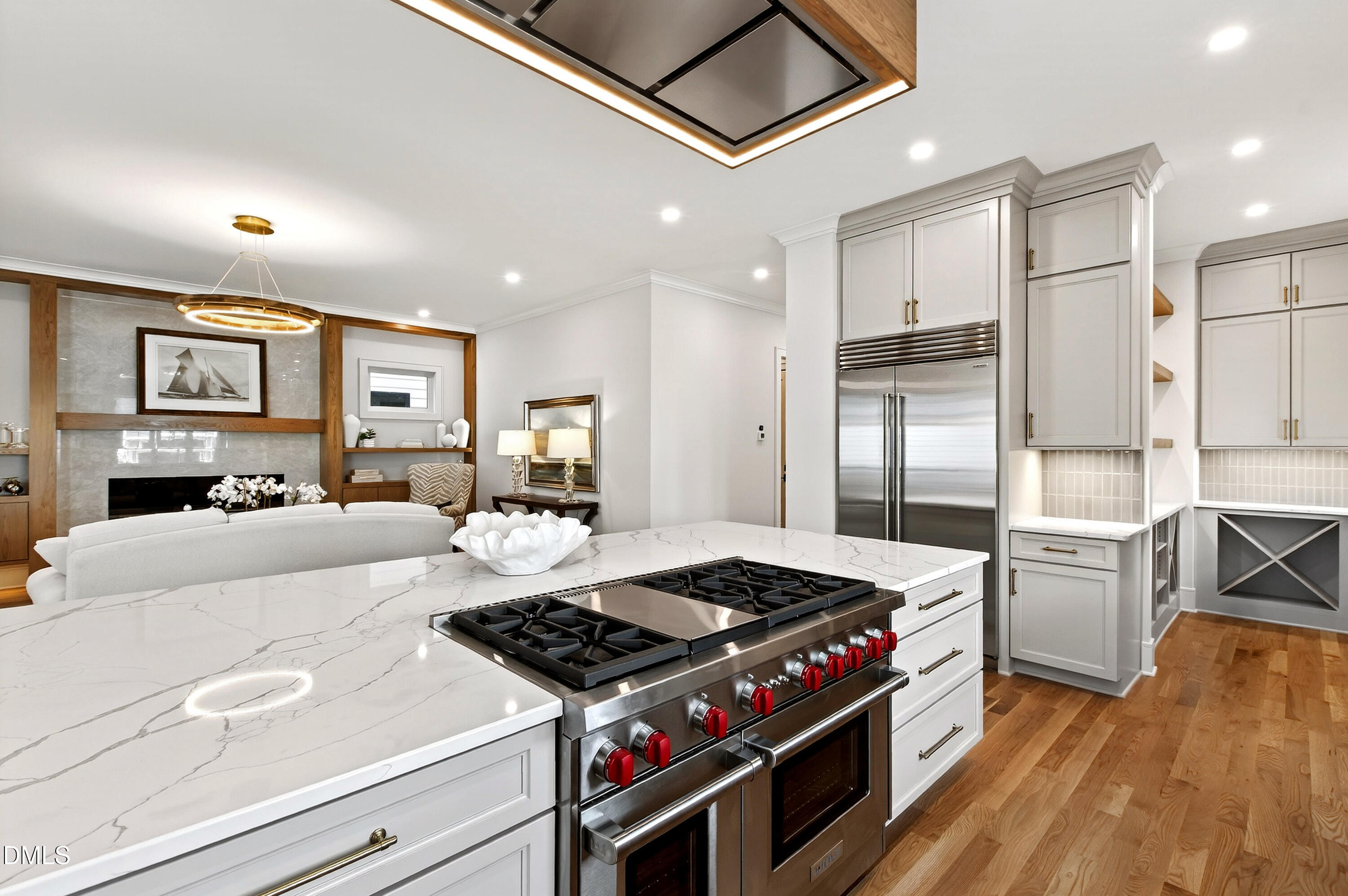 • APPLIANCES Built-In Refrigerator, Dishwasher, Disposal, Free-Standing Gas Range, Microwave, Range Hood, Stainless Steel Appliance(s), Tankless Water Heater, Wine Refrigerator