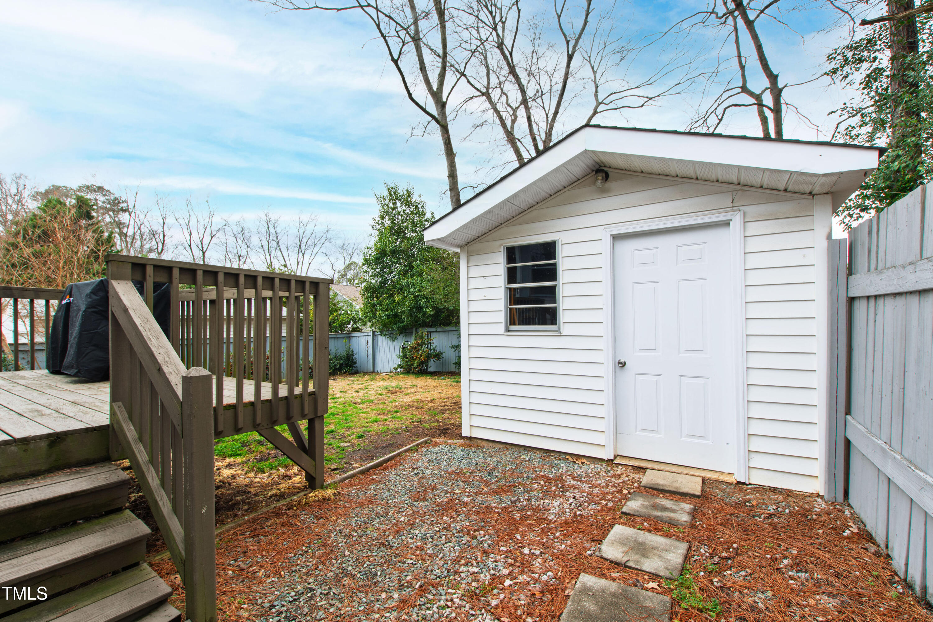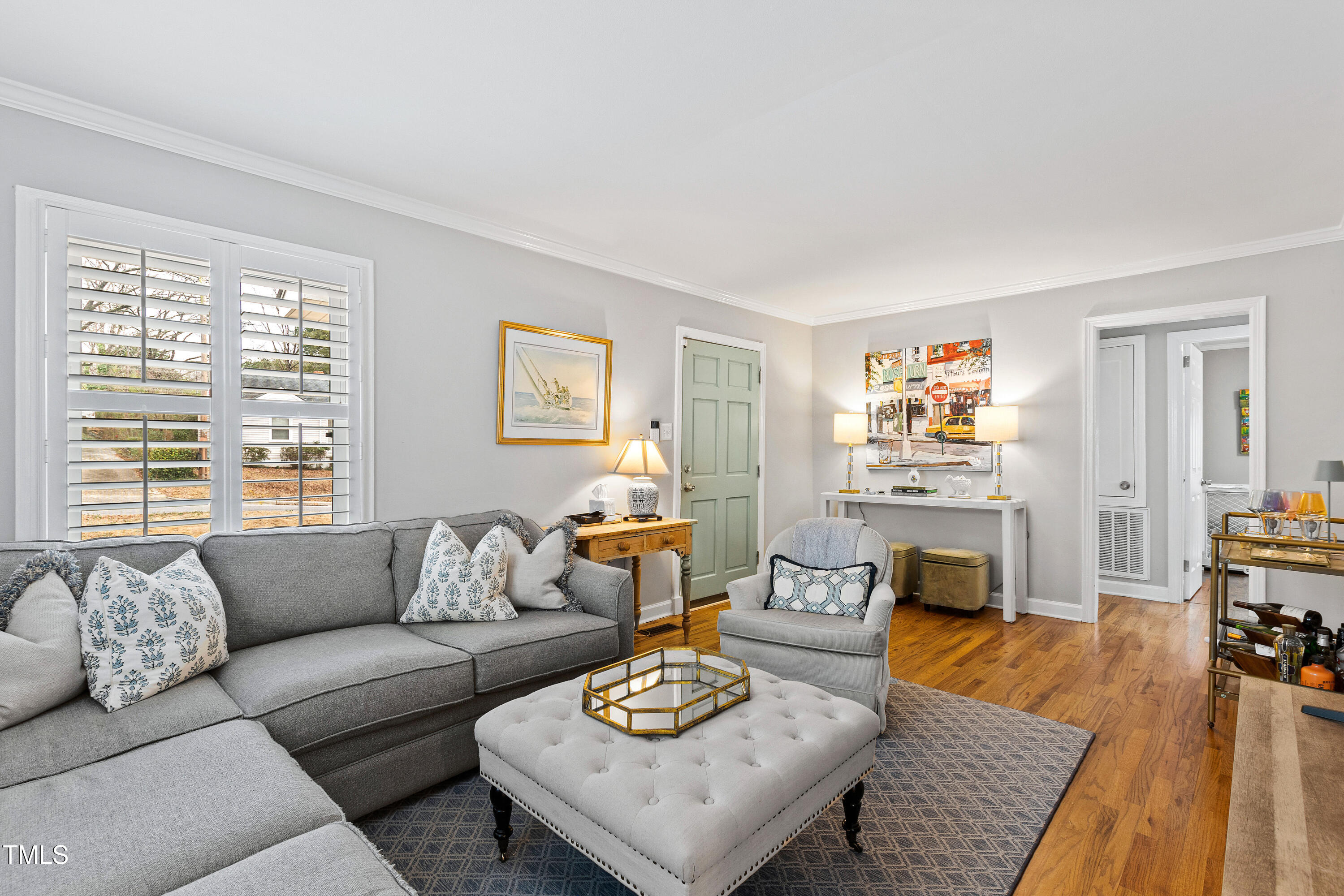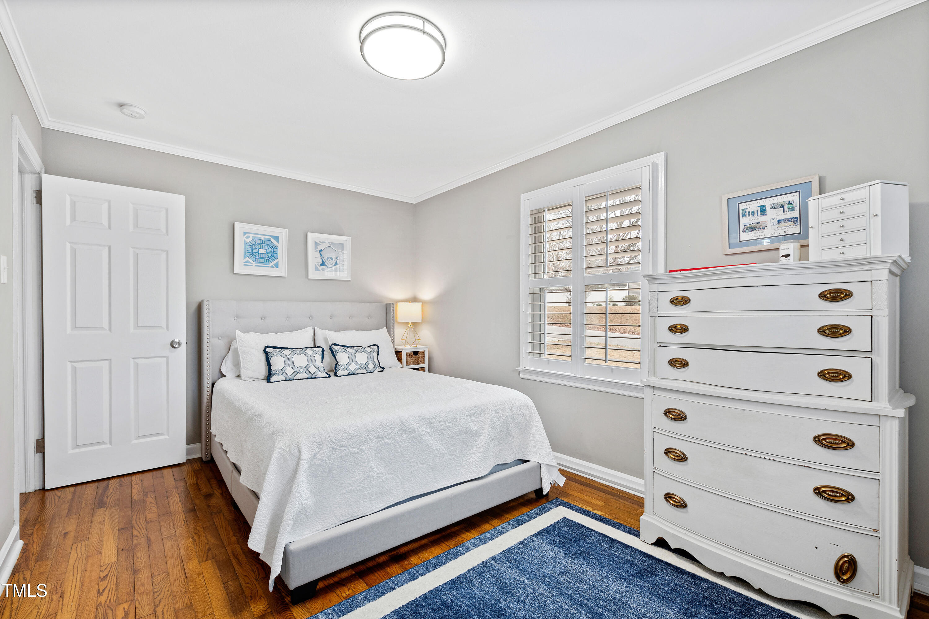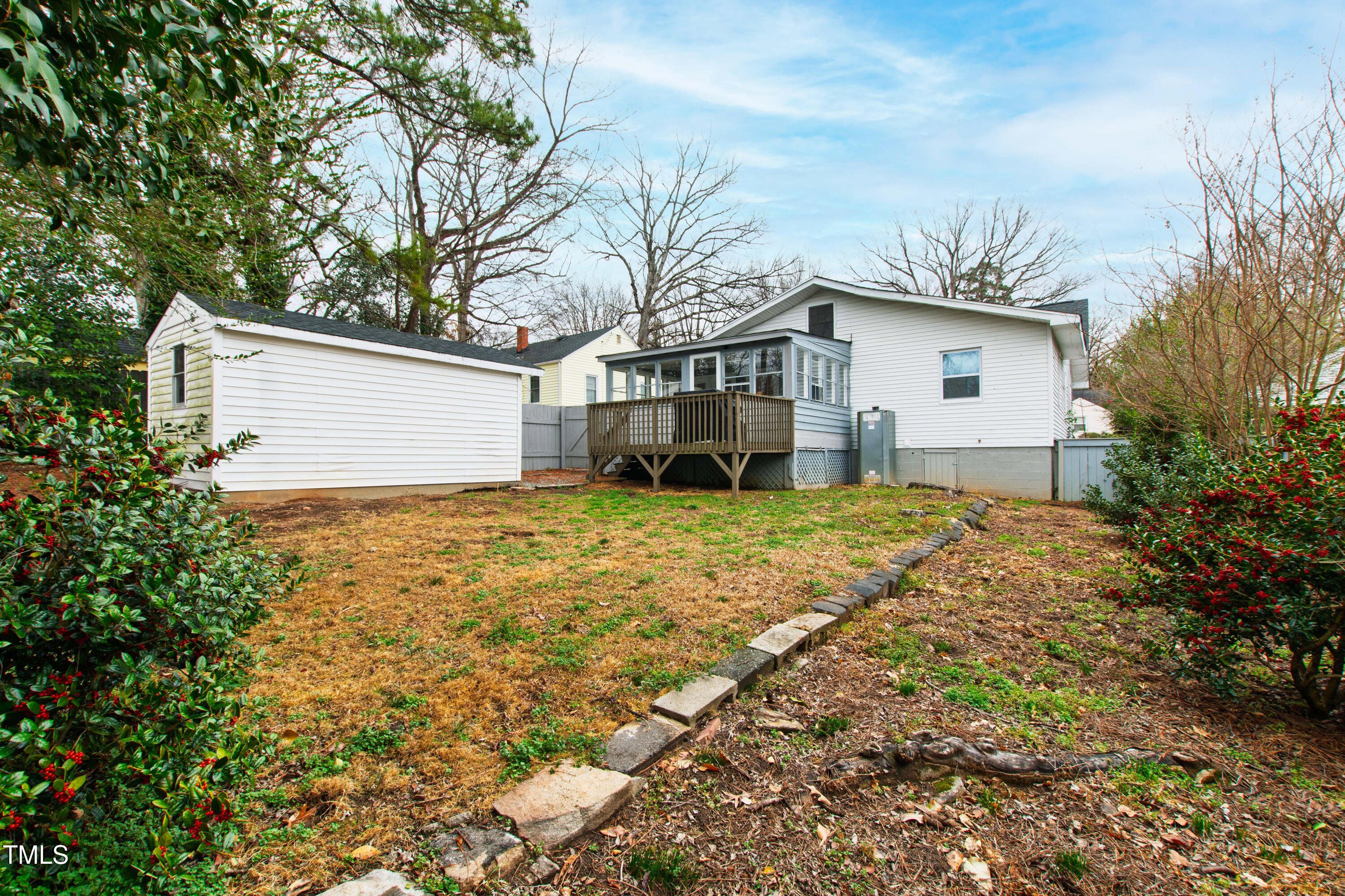 This quintessential Belvidere Park ranch has been thoughtfully updated to meet the needs and standards of today's buyer. Features include beautiful hardwood floors, crown moldings and plantation shutters. There are 2 bedrooms and a bathroom off of the family room in the front of the home, while the primary suite is privately located off the back of the home. The stunning, white kitchen features quartz countertops, a herringbone tile backsplash, stainless steel appliances, a breakfast bar, and opens into a charming dining area. The enclosed porch adds an extra space to relax or entertain. There is a deck with plenty of room for a grill, a fenced backyard and storage shed with electricity. Conveniently located to Lion's Park, the shops and restaurants in Mordecai, and downtown Raleigh.