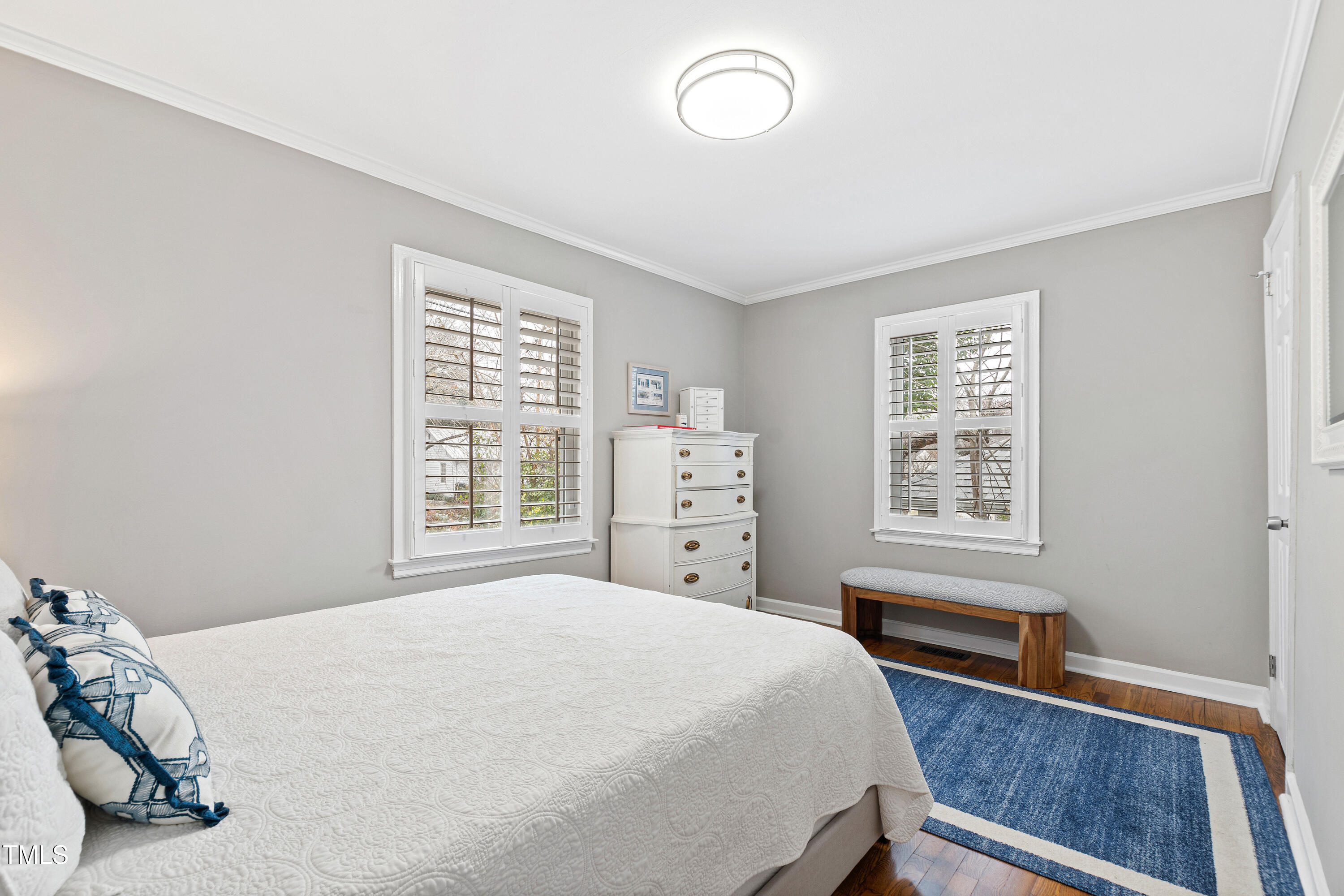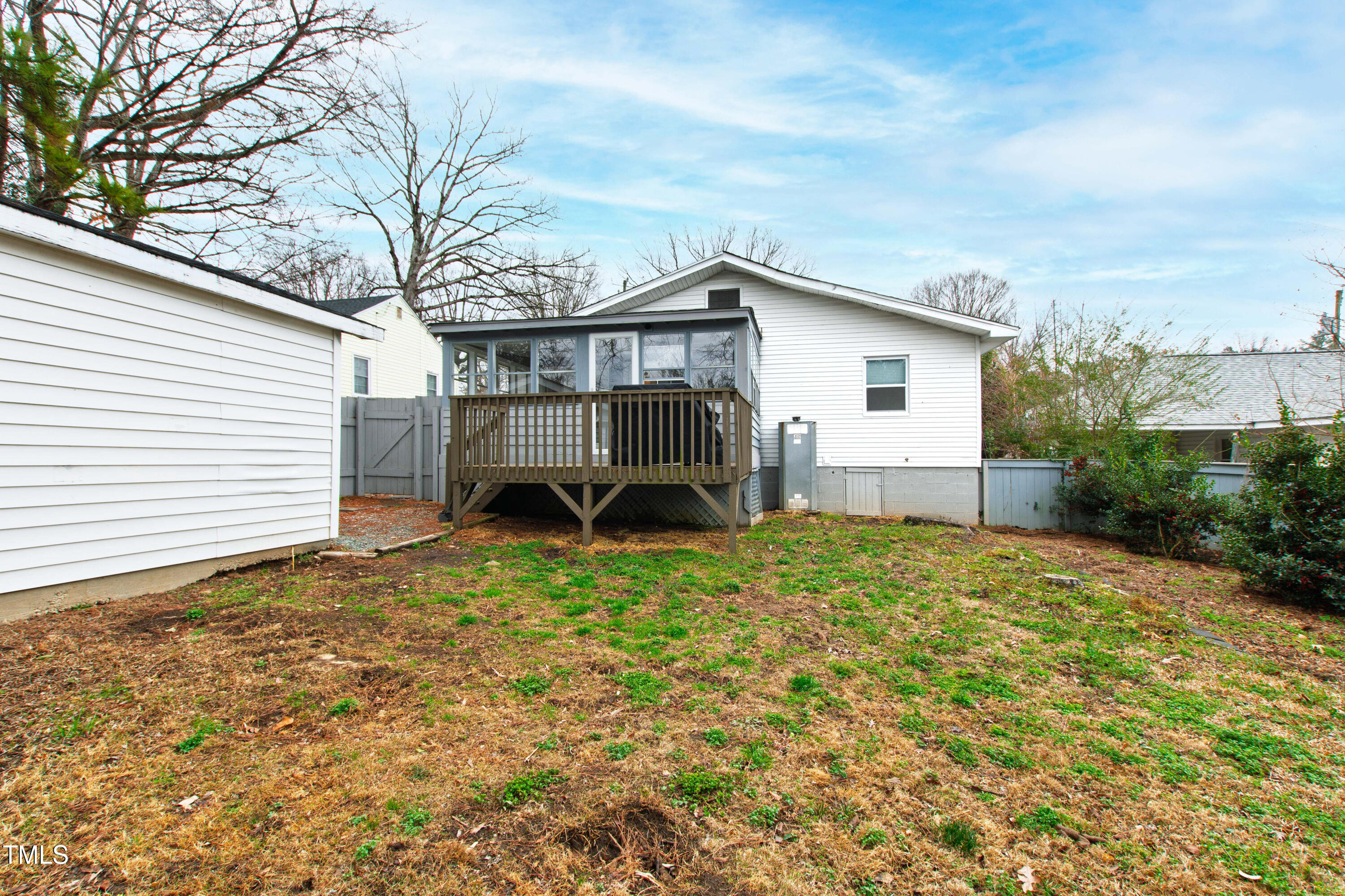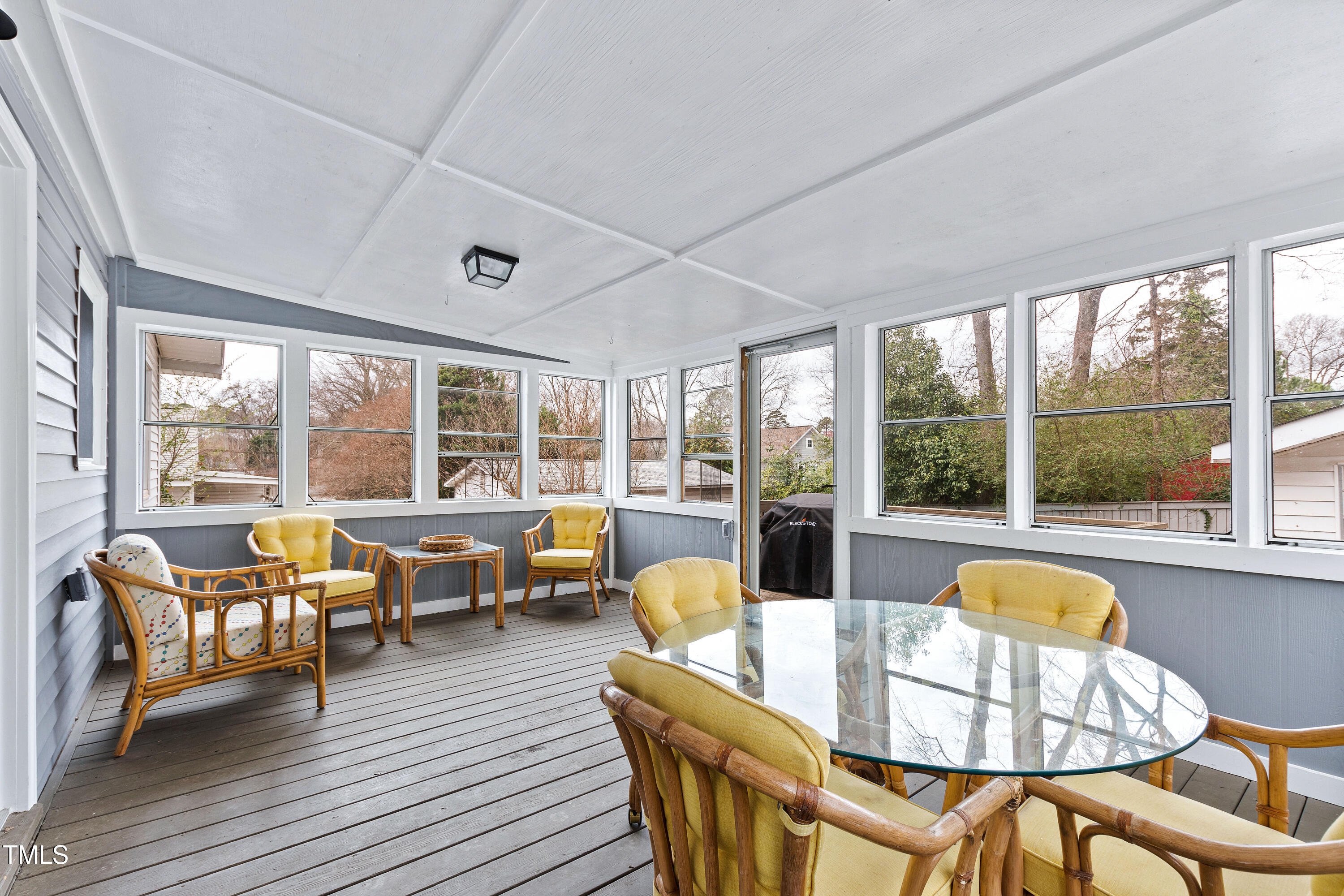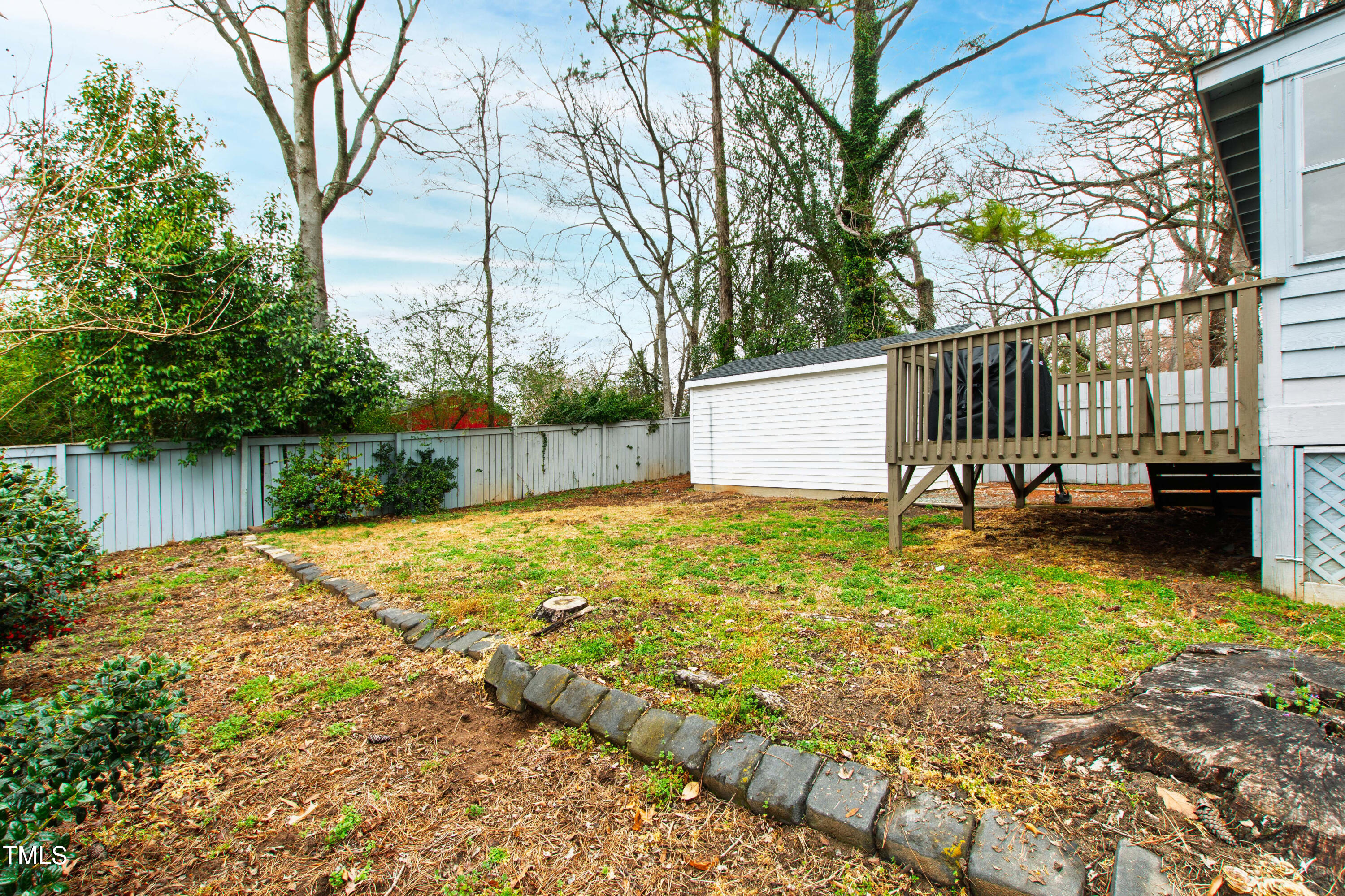 This quintessential Belvidere Park ranch has been thoughtfully updated to meet the needs and standards of today's buyer. Features include beautiful hardwood floors, crown moldings and plantation shutters. There are 2 bedrooms and a bathroom off of the family room in the front of the home, while the primary suite is privately located off the back of the home. The stunning, white kitchen features quartz countertops, a herringbone tile backsplash, stainless steel appliances, a breakfast bar, and opens into a charming dining area. The enclosed porch adds an extra space to relax or entertain. There is a deck with plenty of room for a grill, a fenced backyard and storage shed with electricity. Conveniently located to Lion's Park, the shops and restaurants in Mordecai, and downtown Raleigh.