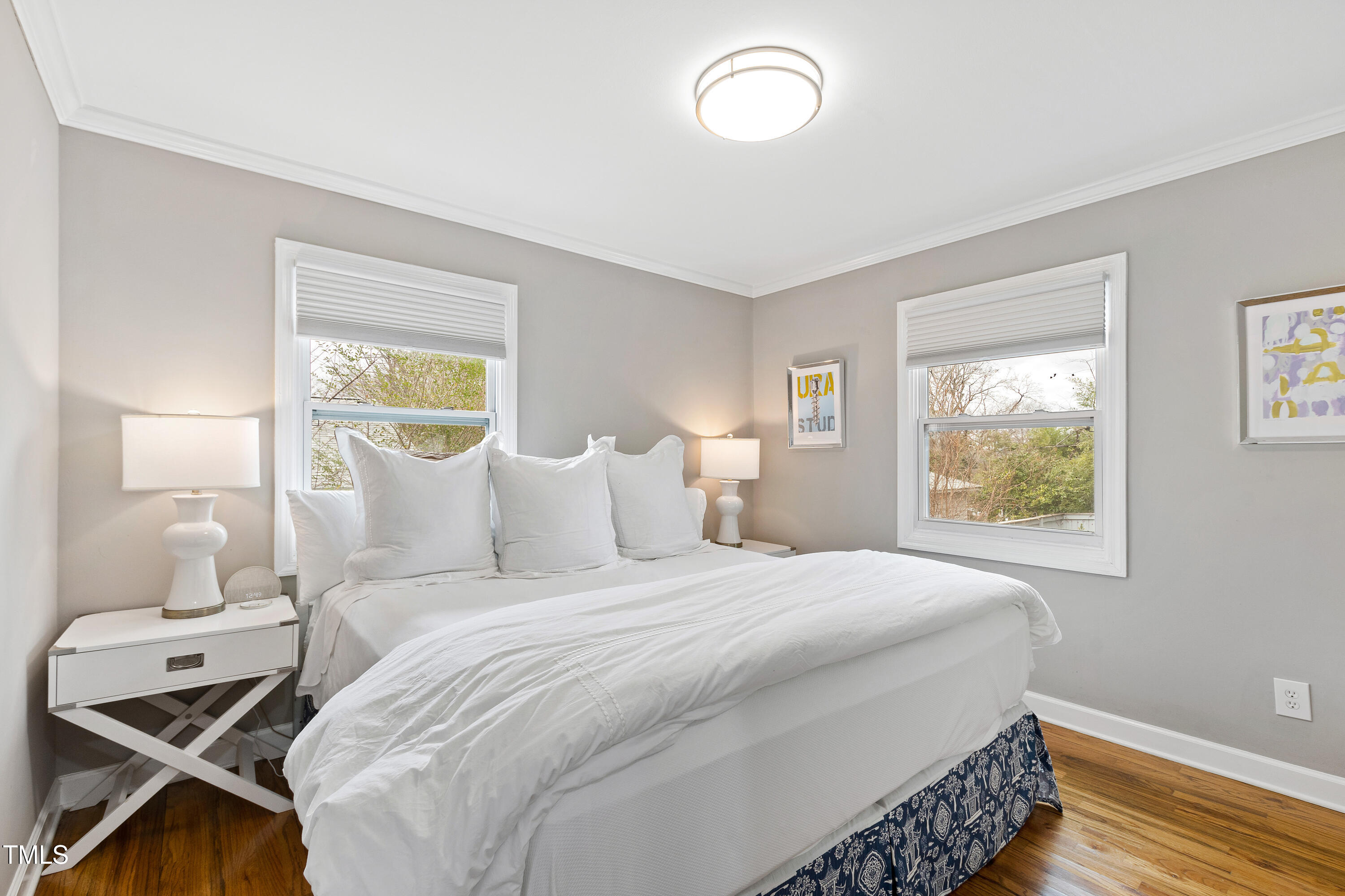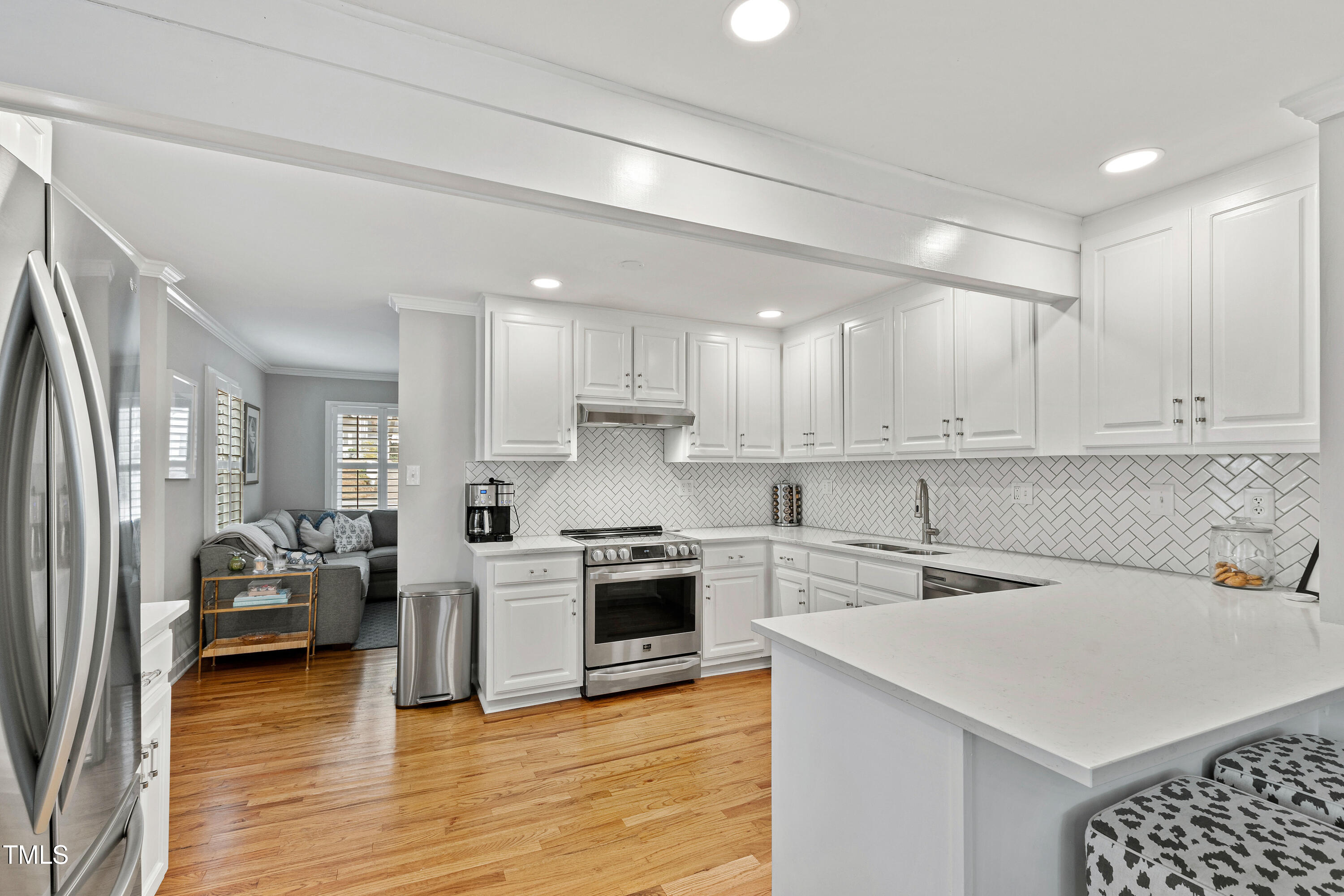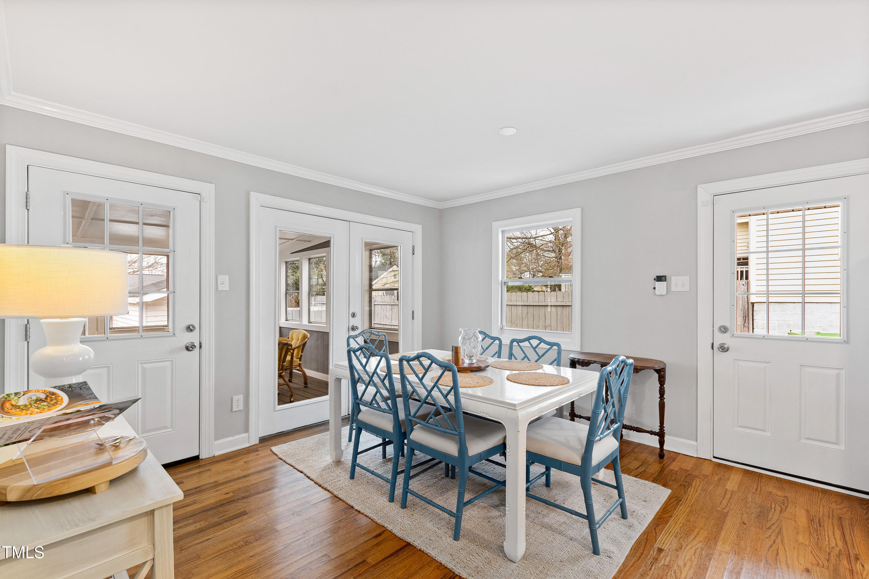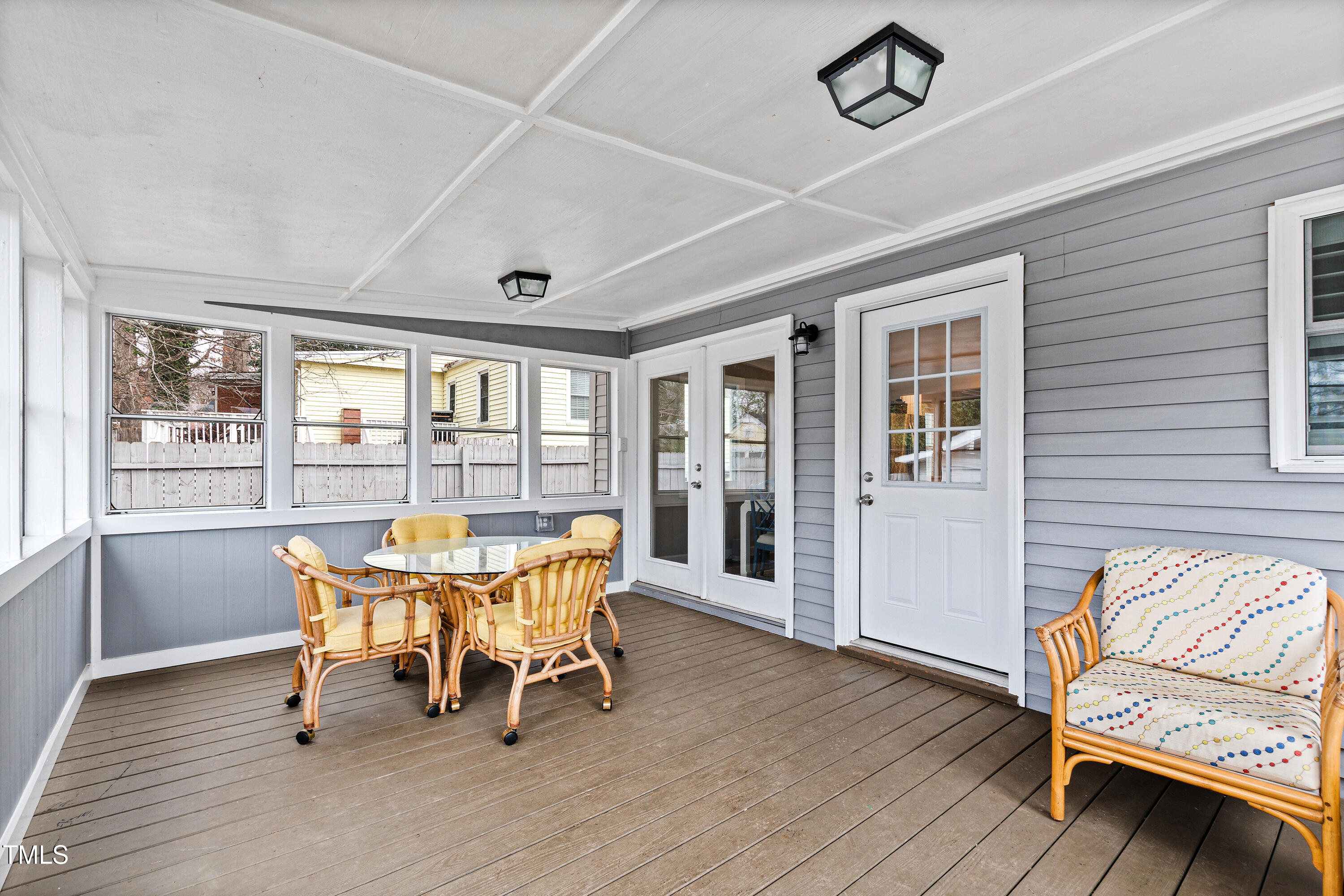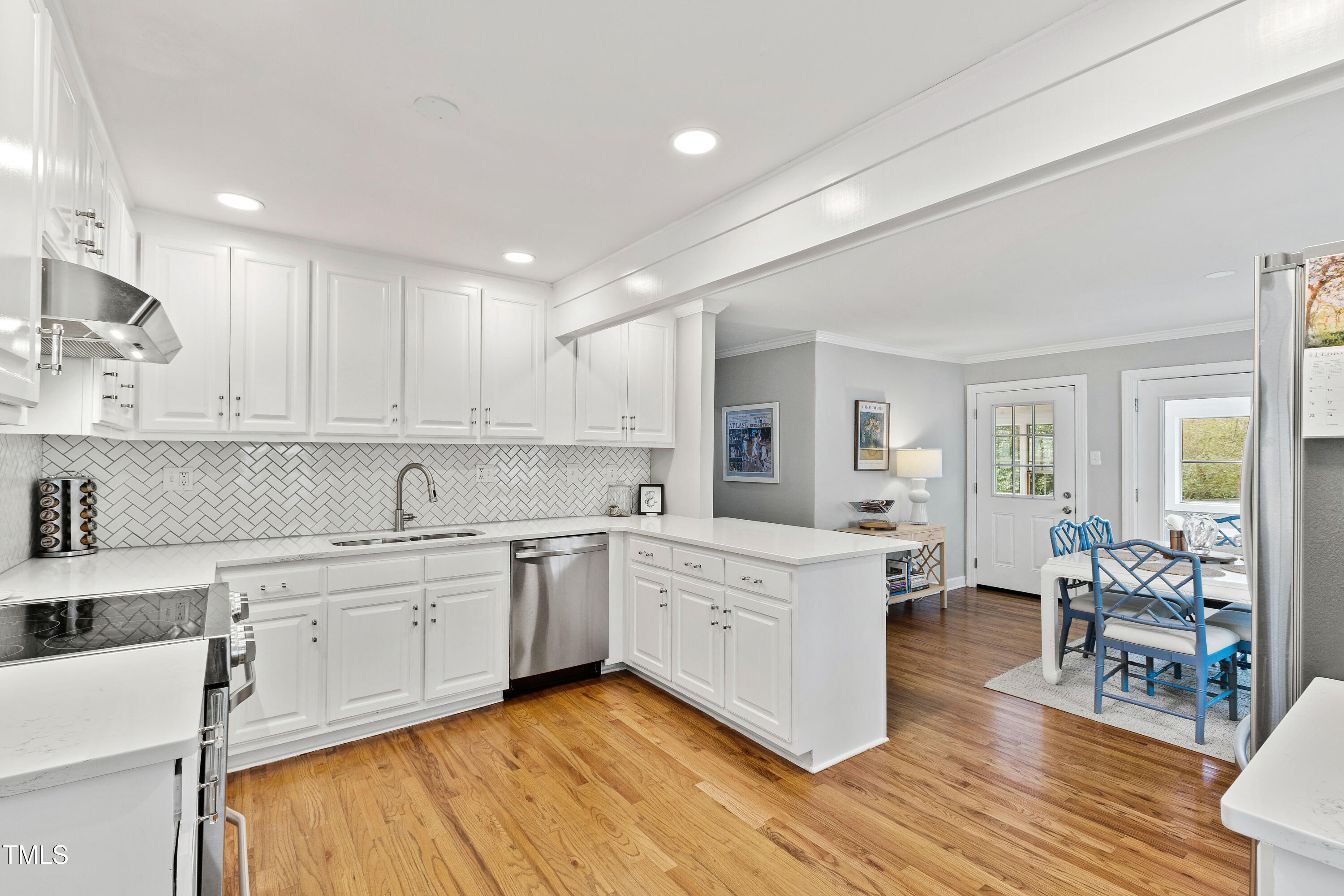 This quintessential Belvidere Park ranch has been thoughtfully updated to meet the needs and standards of today's buyer. Features include beautiful hardwood floors, crown moldings and plantation shutters. There are 2 bedrooms and a bathroom off of the family room in the front of the home, while the primary suite is privately located off the back of the home. The stunning, white kitchen features quartz countertops, a herringbone tile backsplash, stainless steel appliances, a breakfast bar, and opens into a charming dining area. The enclosed porch adds an extra space to relax or entertain. There is a deck with plenty of room for a grill, a fenced backyard and storage shed with electricity. Conveniently located to Lion's Park, the shops and restaurants in Mordecai, and downtown Raleigh.