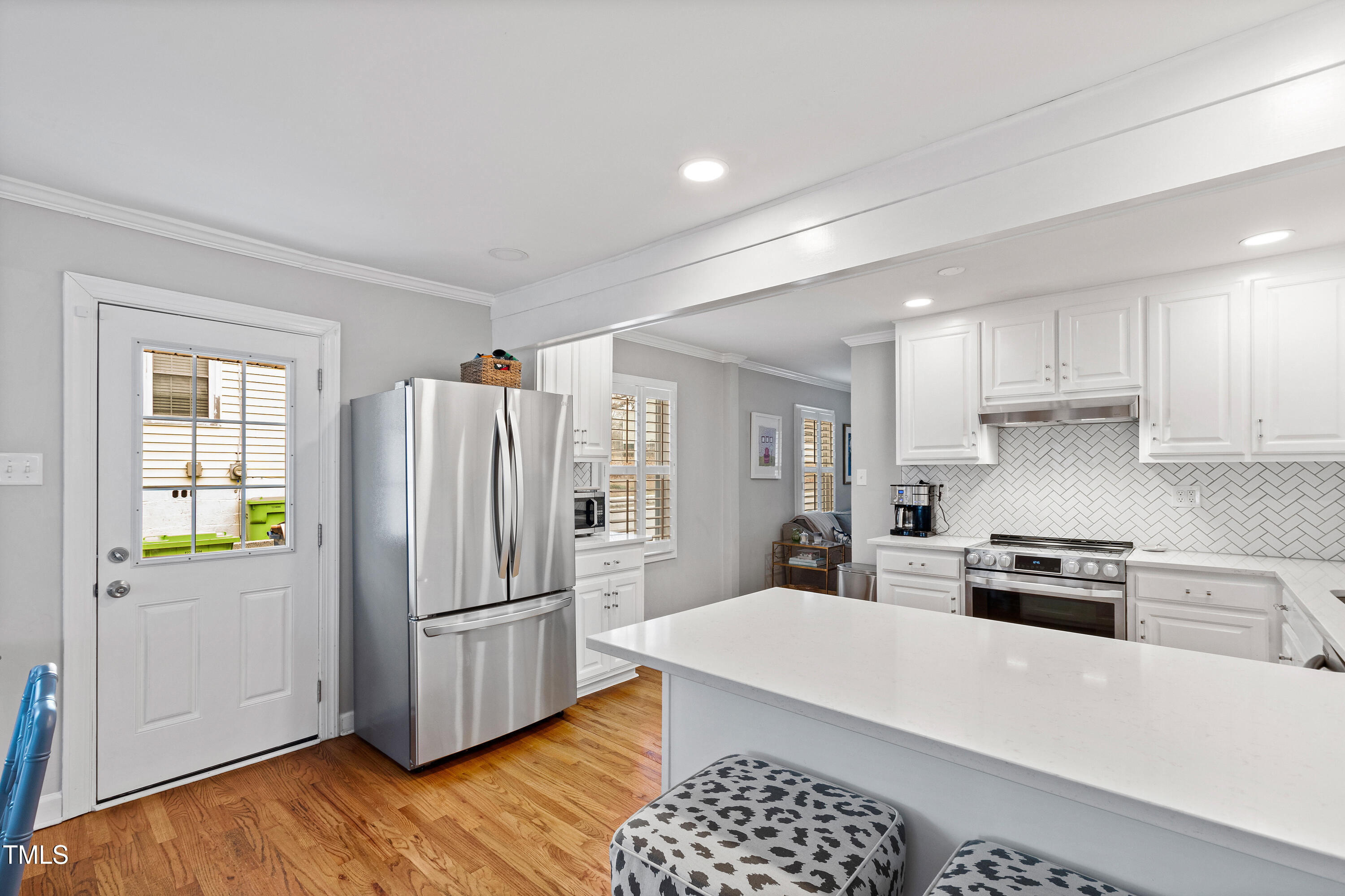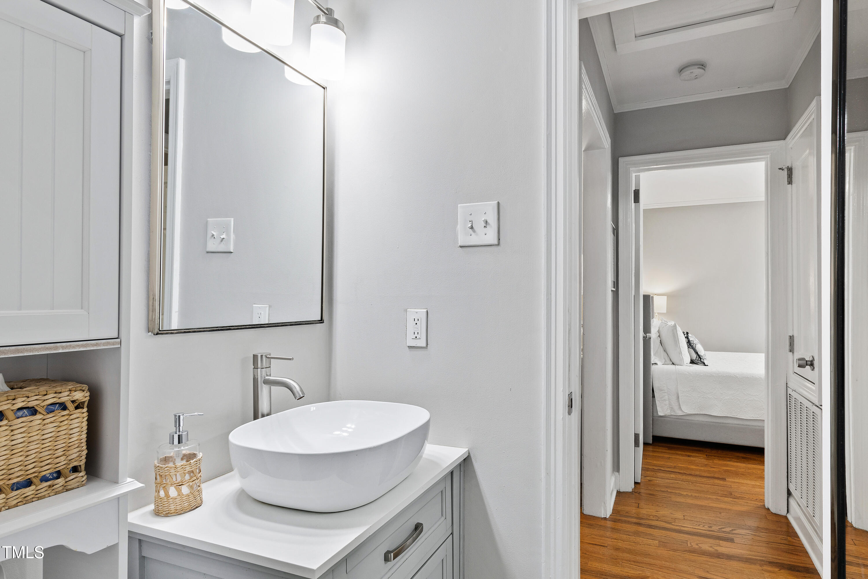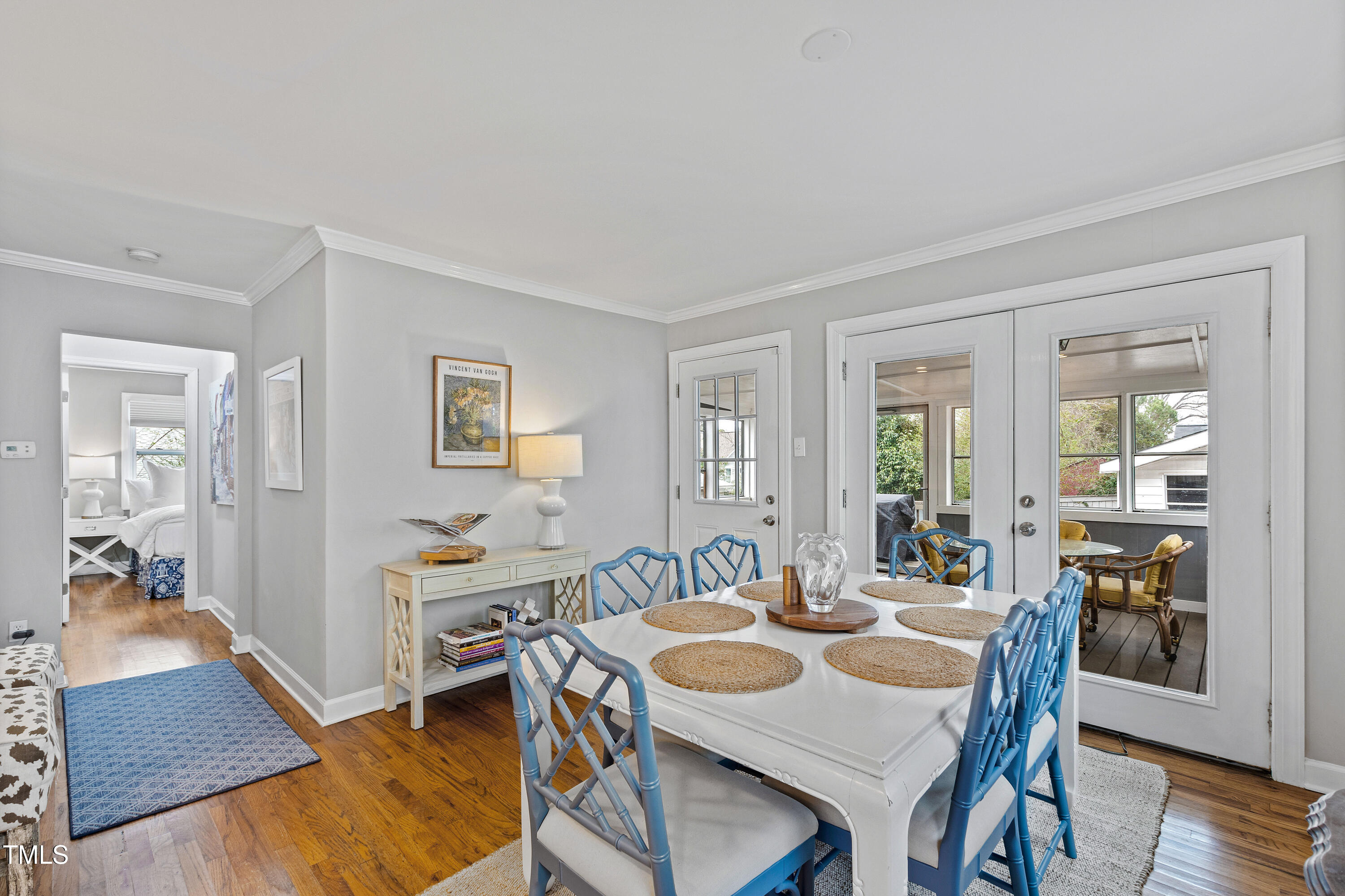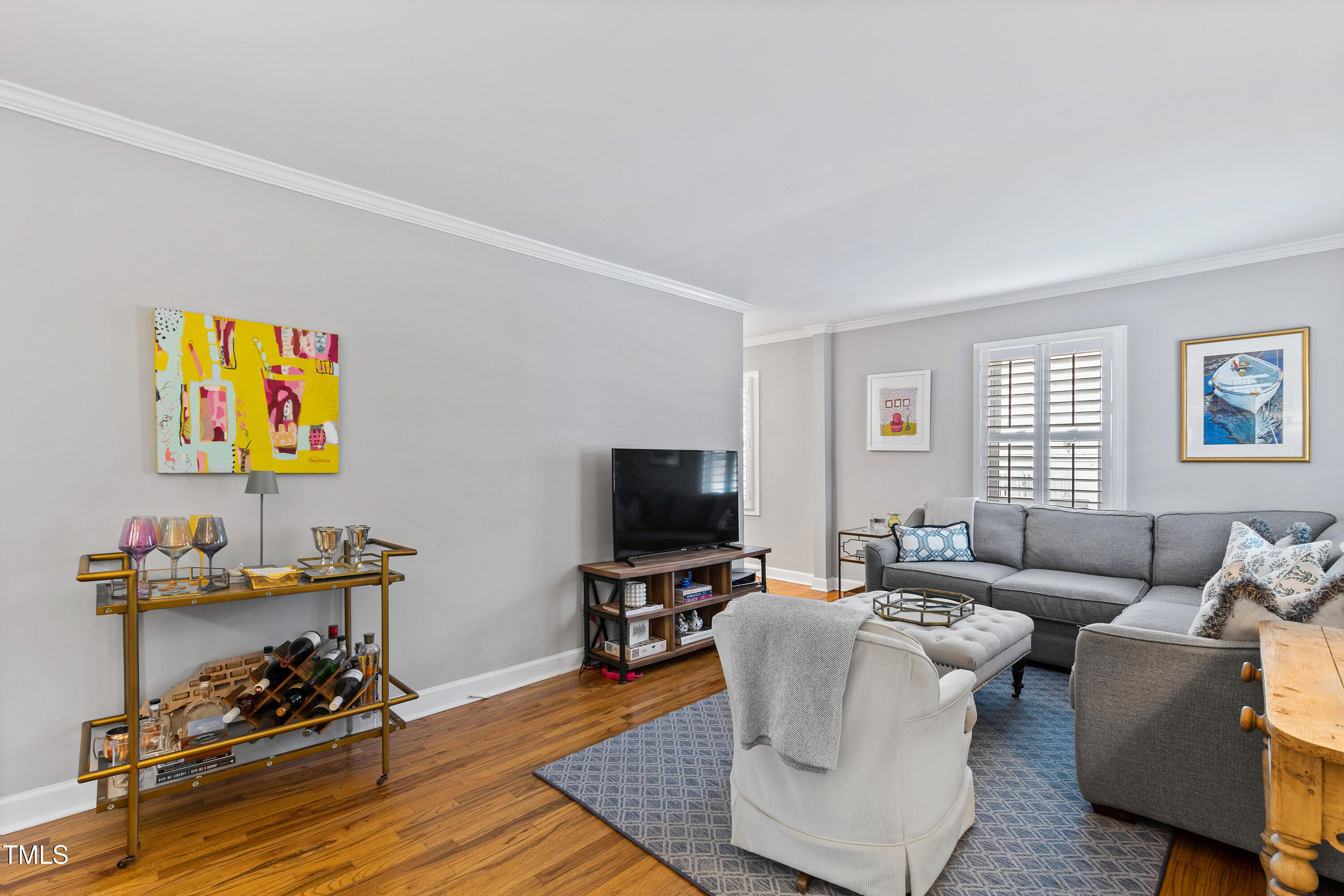 This quintessential Belvidere Park ranch has been thoughtfully updated to meet the needs and standards of today's buyer. Features include beautiful hardwood floors, crown moldings and plantation shutters. There are 2 bedrooms and a bathroom off of the family room in the front of the home, while the primary suite is privately located off the back of the home. The stunning, white kitchen features quartz countertops, a herringbone tile backsplash, stainless steel appliances, a breakfast bar, and opens into a charming dining area. The enclosed porch adds an extra space to relax or entertain. There is a deck with plenty of room for a grill, a fenced backyard and storage shed with electricity. Conveniently located to Lion's Park, the shops and restaurants in Mordecai, and downtown Raleigh.