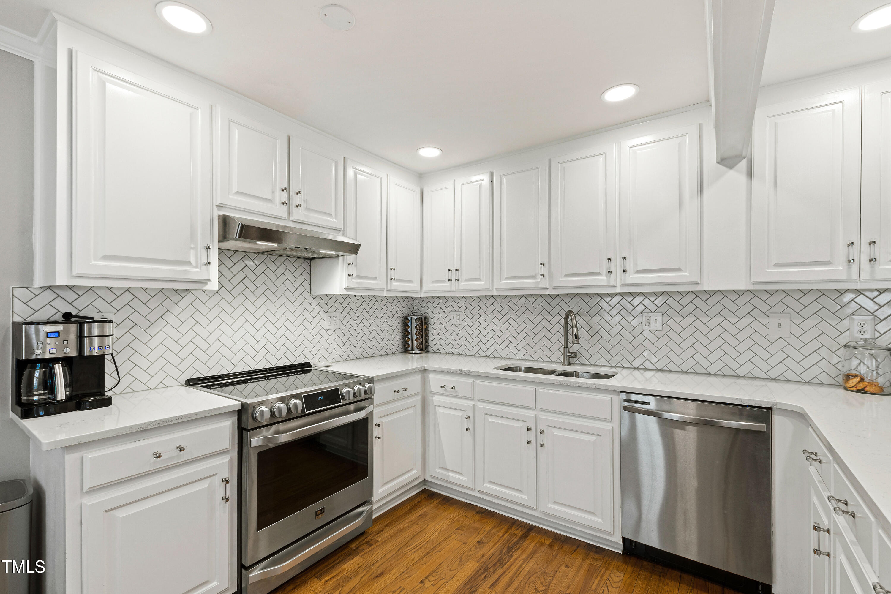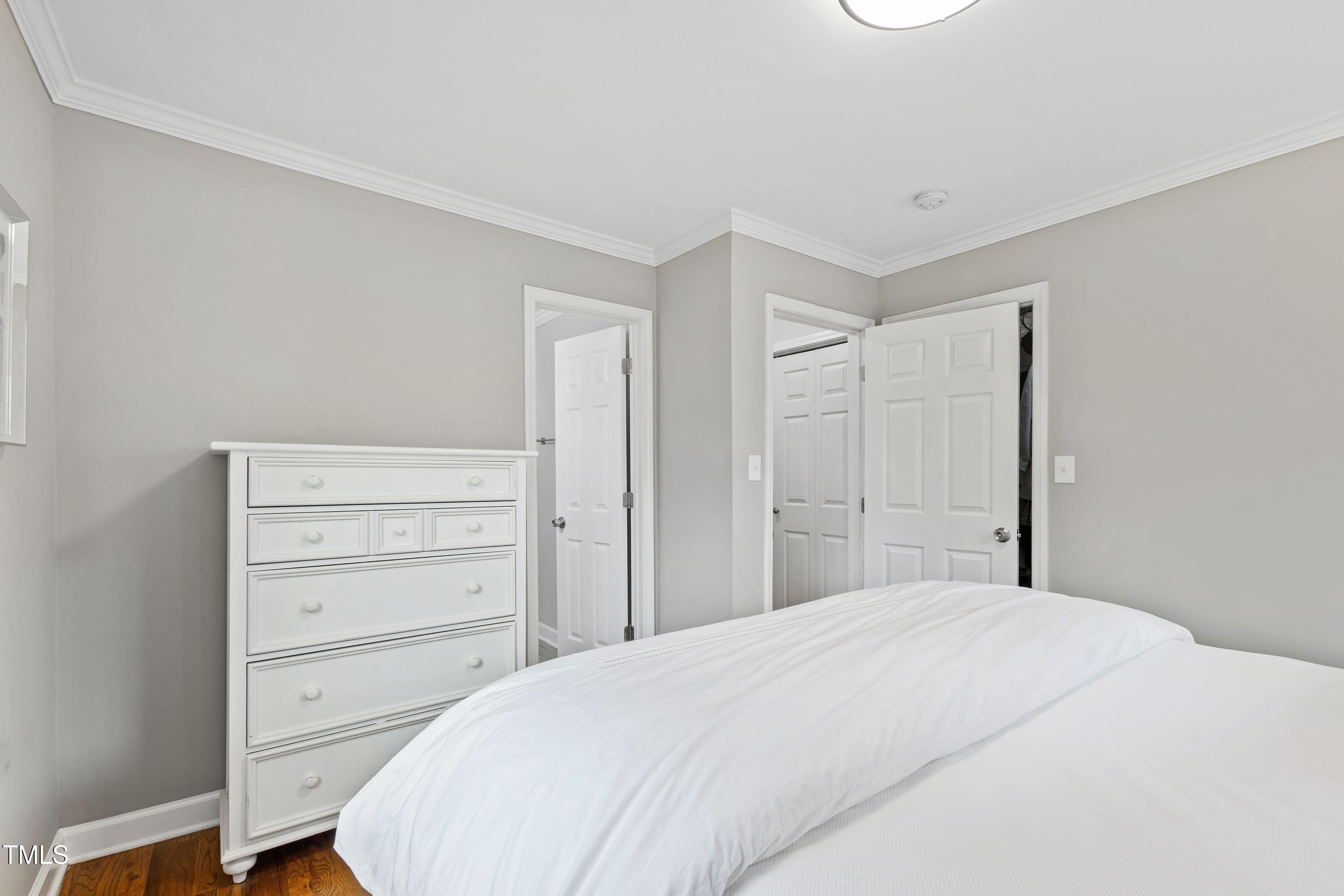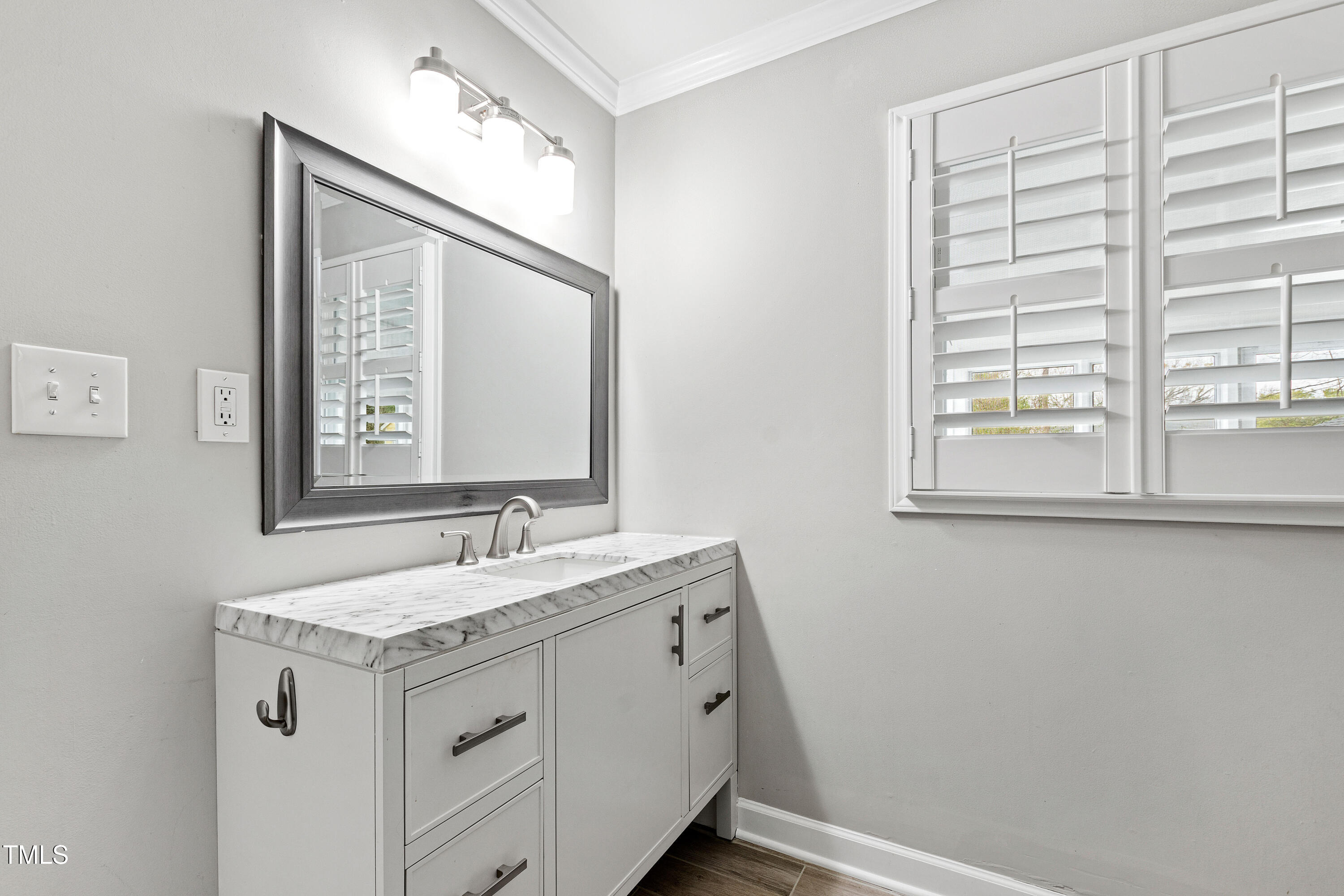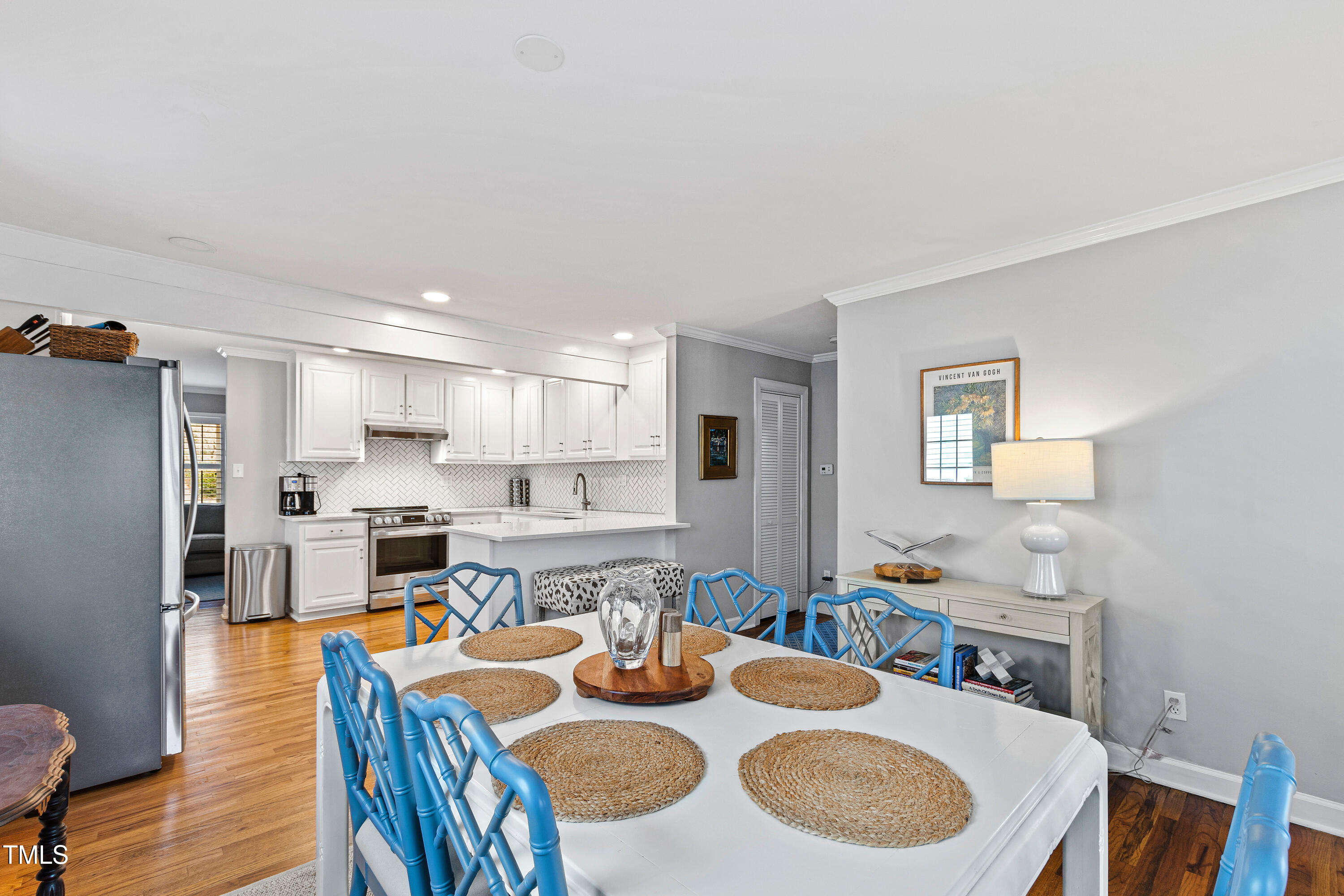 This quintessential Belvidere Park ranch has been thoughtfully updated to meet the needs and standards of today's buyer. Features include beautiful hardwood floors, crown moldings and plantation shutters. There are 2 bedrooms and a bathroom off of the family room in the front of the home, while the primary suite is privately located off the back of the home. The stunning, white kitchen features quartz countertops, a herringbone tile backsplash, stainless steel appliances, a breakfast bar, and opens into a charming dining area. The enclosed porch adds an extra space to relax or entertain. There is a deck with plenty of room for a grill, a fenced backyard and storage shed with electricity. Conveniently located to Lion's Park, the shops and restaurants in Mordecai, and downtown Raleigh.