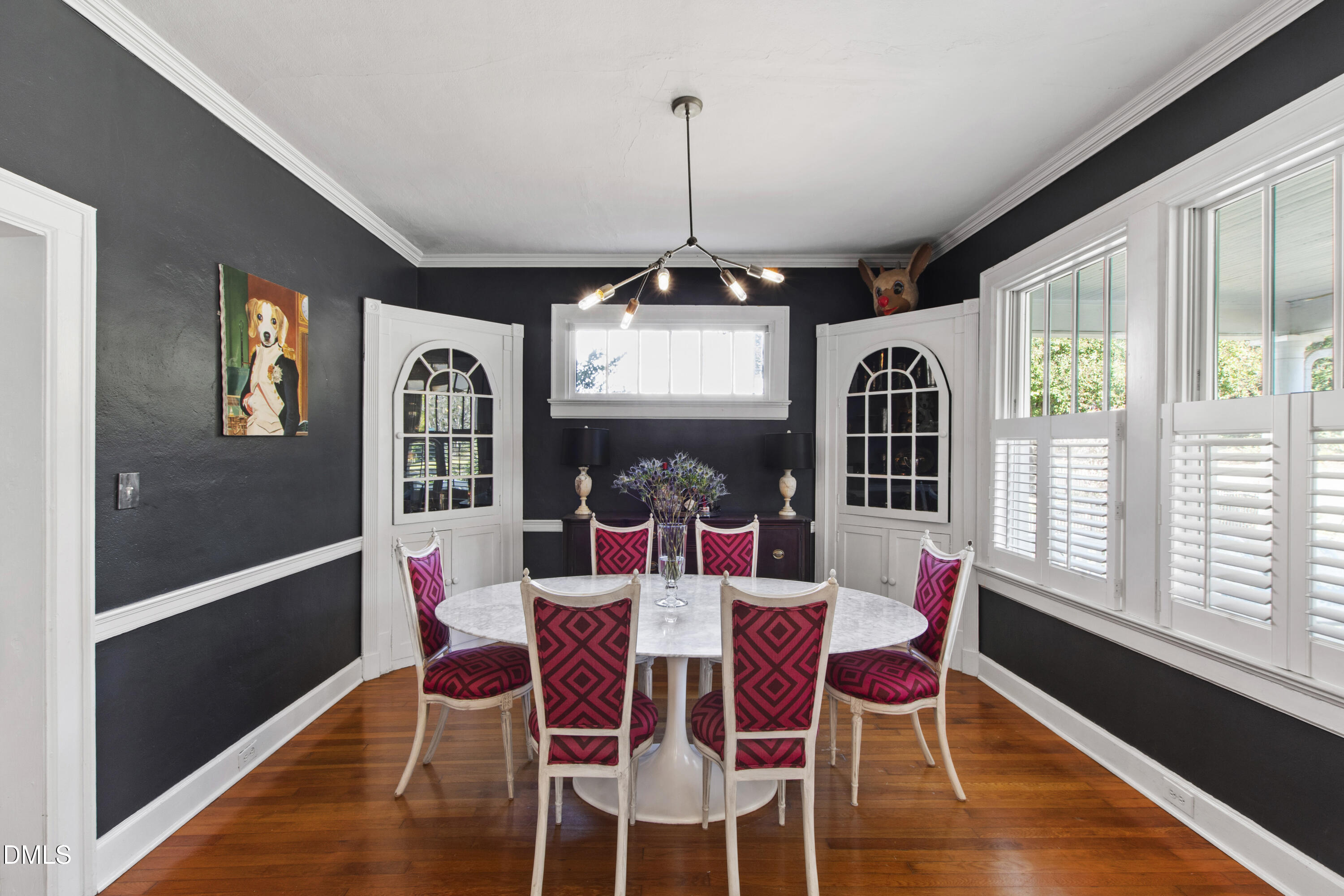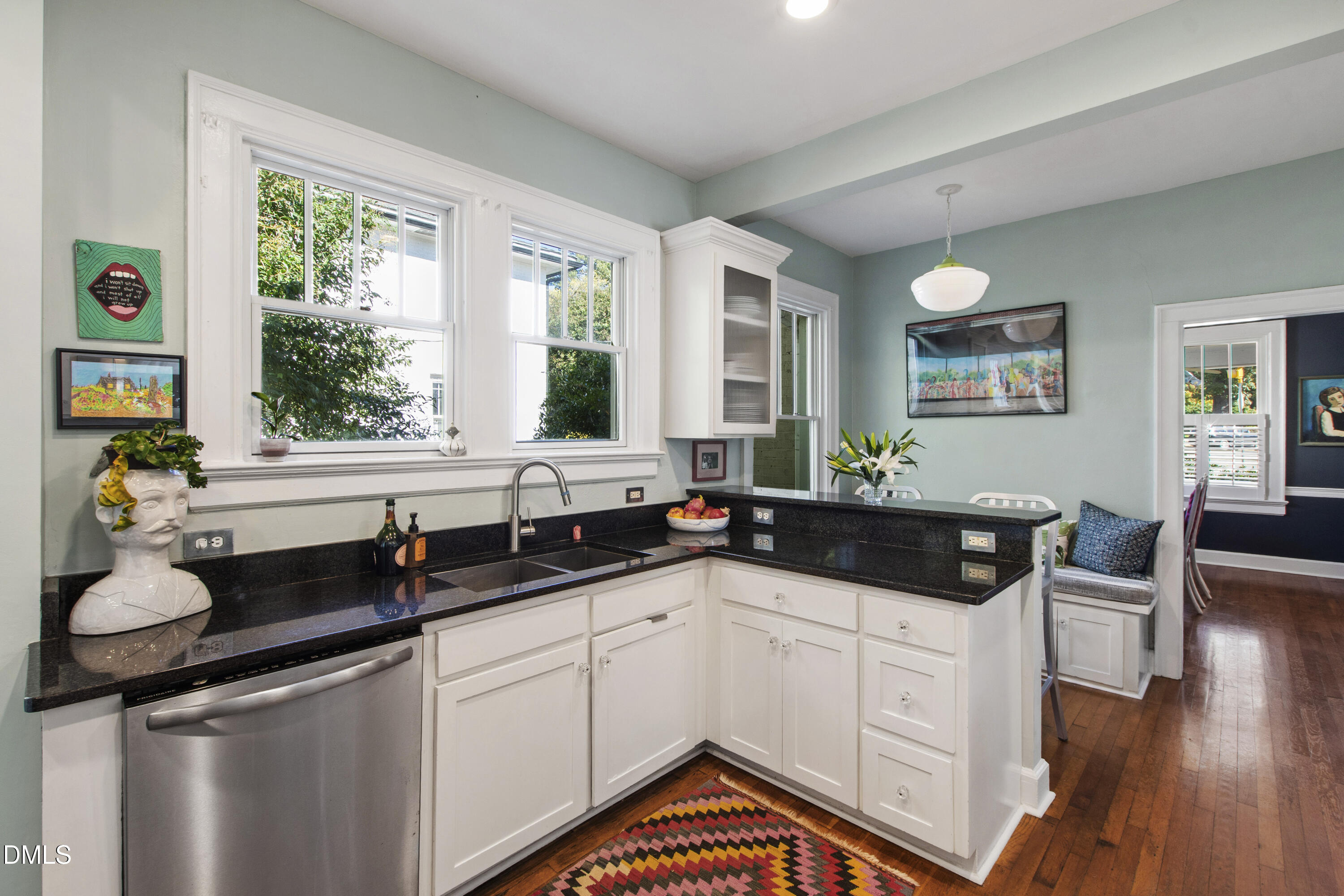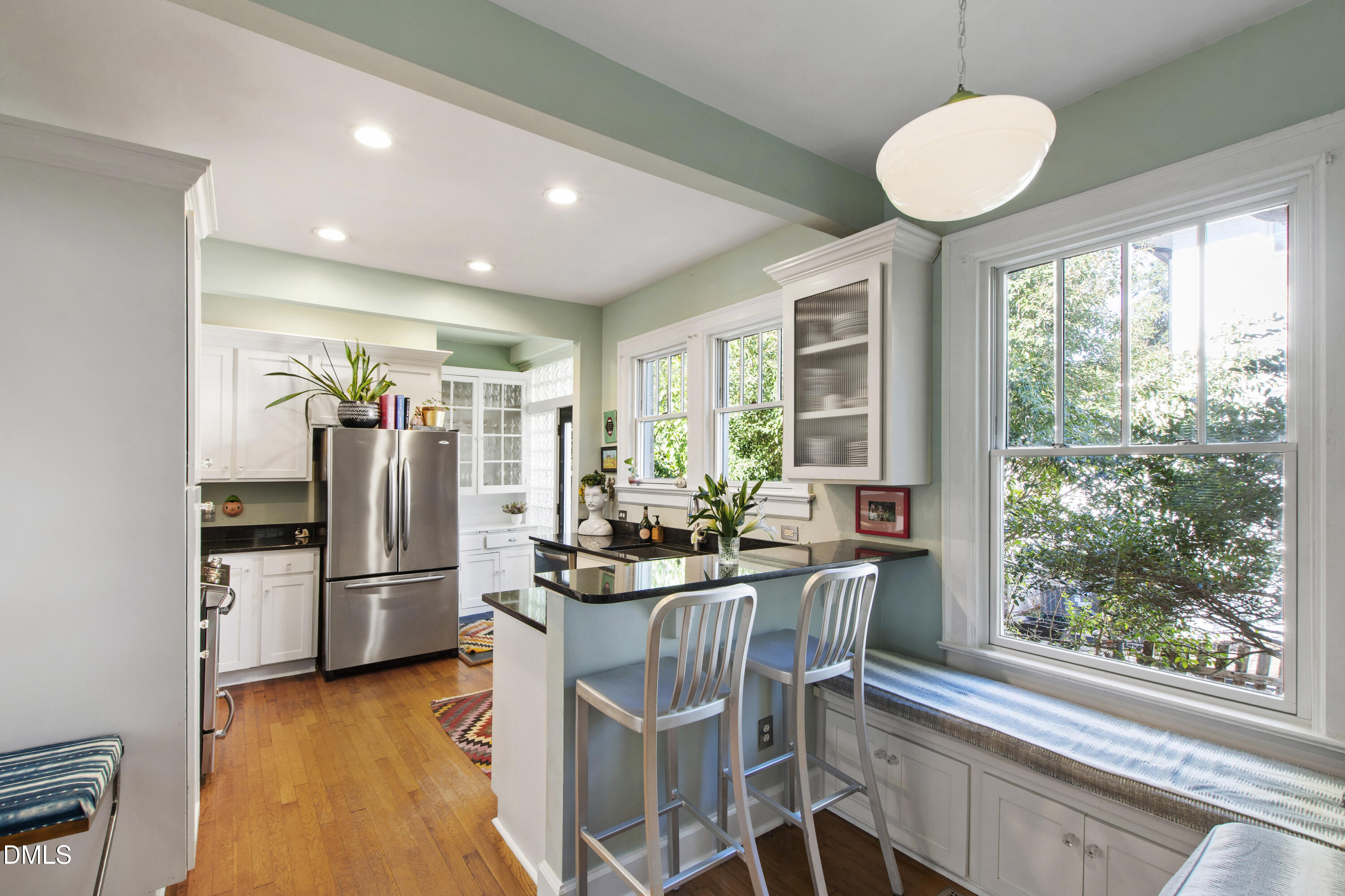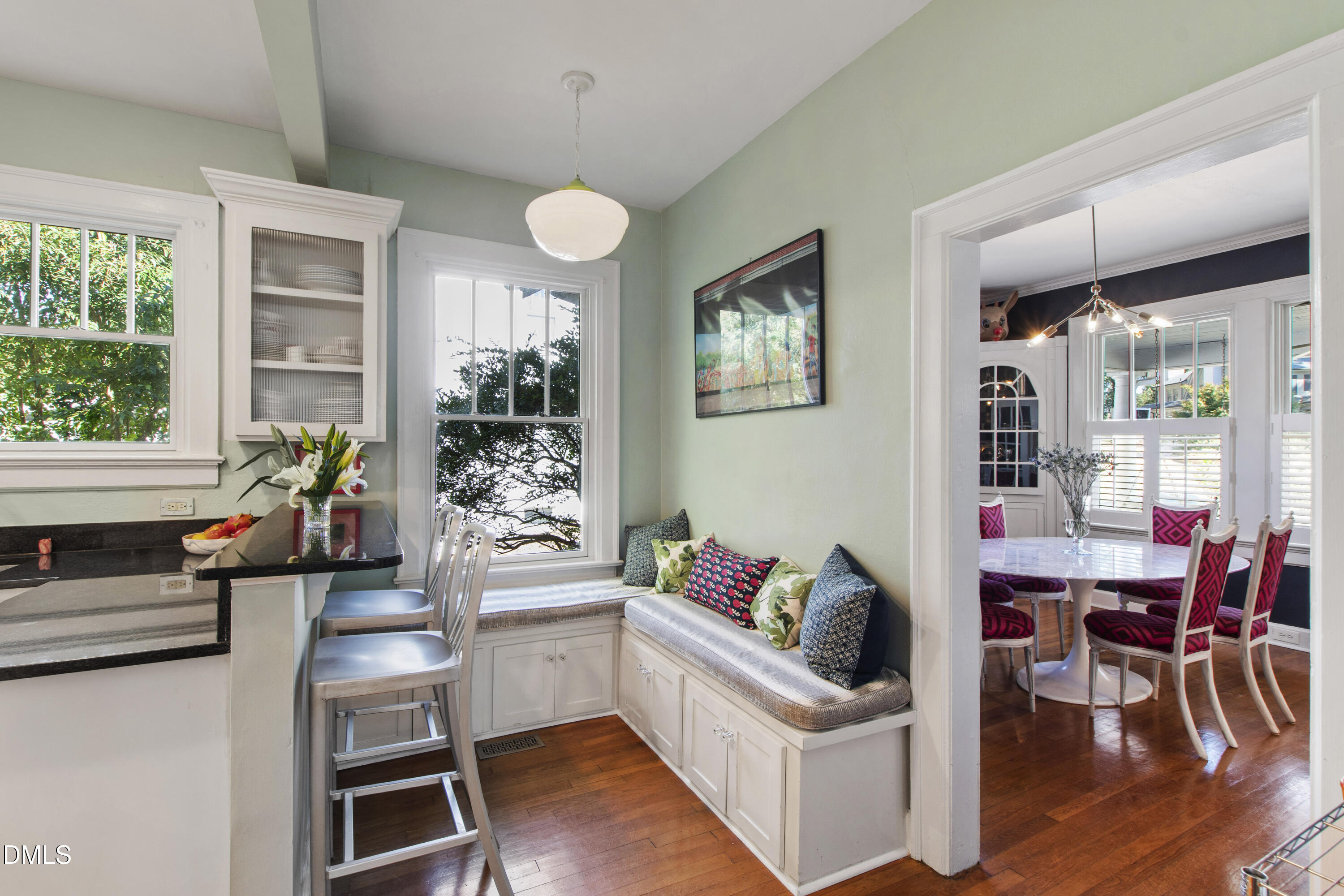 In the heart of Bloomsbury, this inviting home blends classic architecture with thoughtful updates; every room carries a sense of warmth and light. Hardwood floors anchor the main level; crown molding, built-ins, and a transom window add depth and character that speak to its era. The kitchen feels bright and personal; a glass-block wall filters soft daylight across the space, while a built-in banquette creates the perfect spot for casual meals. Crystal-style knobs and quality appliances add polish without losing charm. Bathrooms feature tile floors, medicine cabinets, and clever storage; window treatments and neighborhood-style shutters throughout the home provide both comfort and cohesion. Step outside to a fully fenced backyard where a powered tree house conveys; it's a playful, unexpected touch that makes the home feel alive. Also, downstairs are more unexpected surprises. A family room, den, playroom, laundry, bedroom, kitchenette, half bath, large closets, tool room and storage create endless options. Lower level is not counted in square footage since there is no HVAC. Although it stays very comfortable, sellers use space heaters if needed. Adding mini-splits would almost double the home's square footage. And talk about convenience! Leave the cars at home, a double wide driveway affords plenty of parking so you can walk to Five Points and all of its charm.