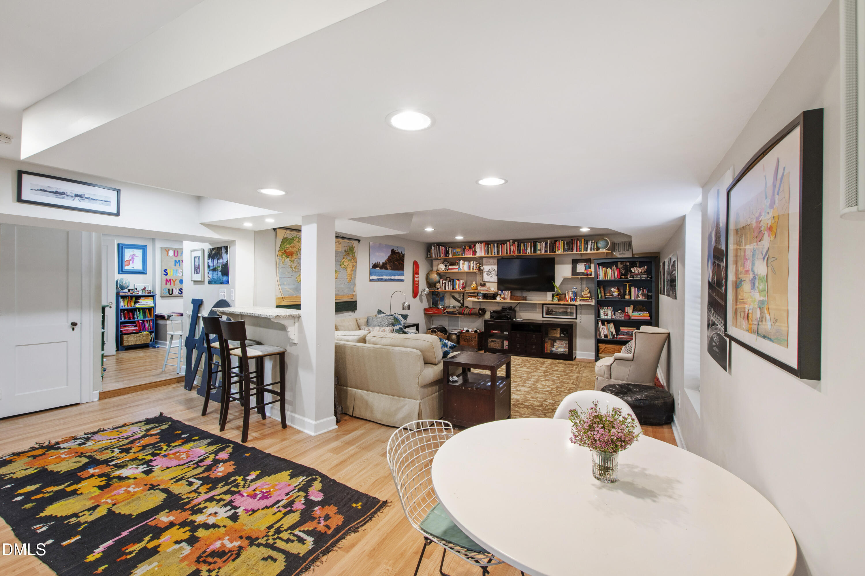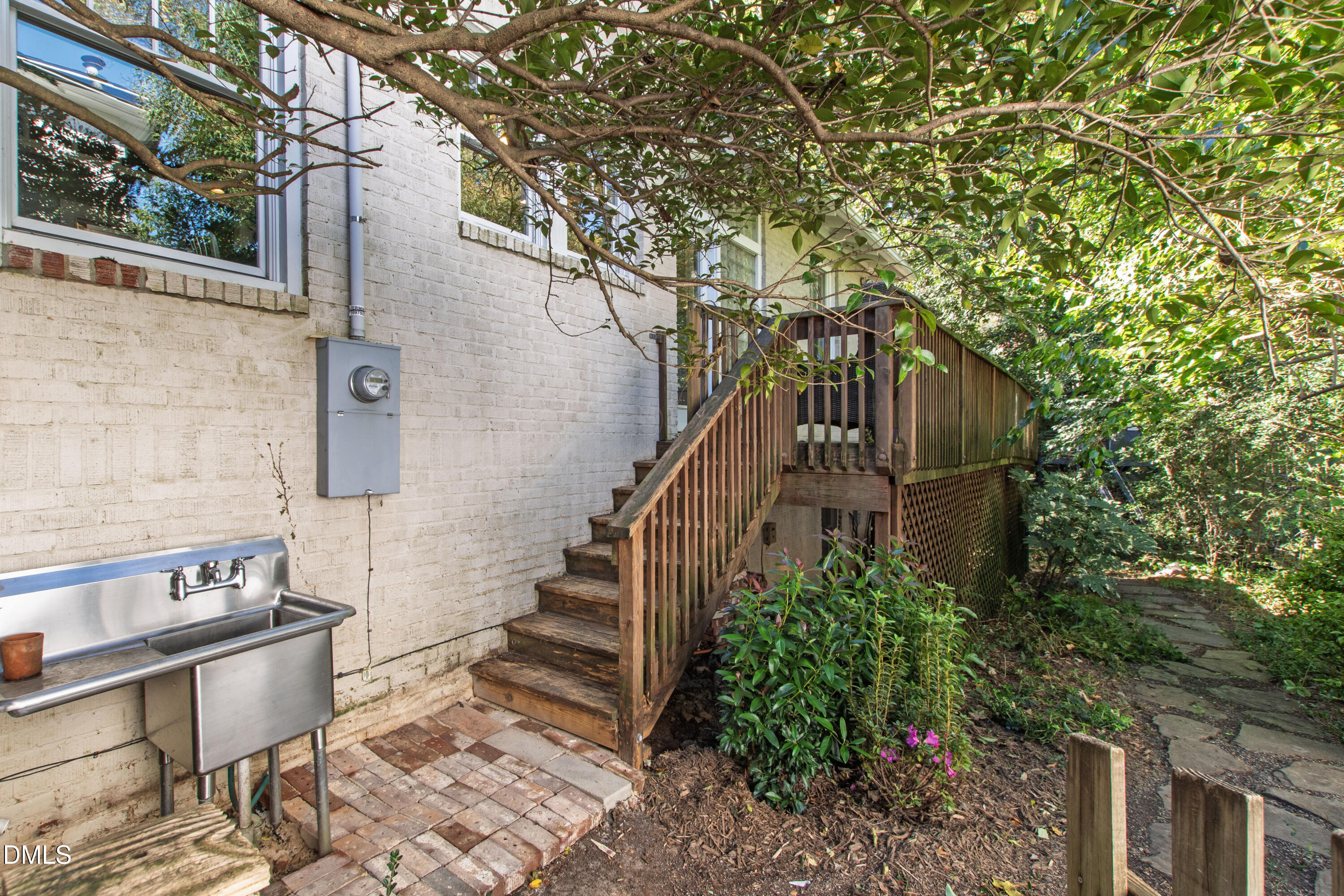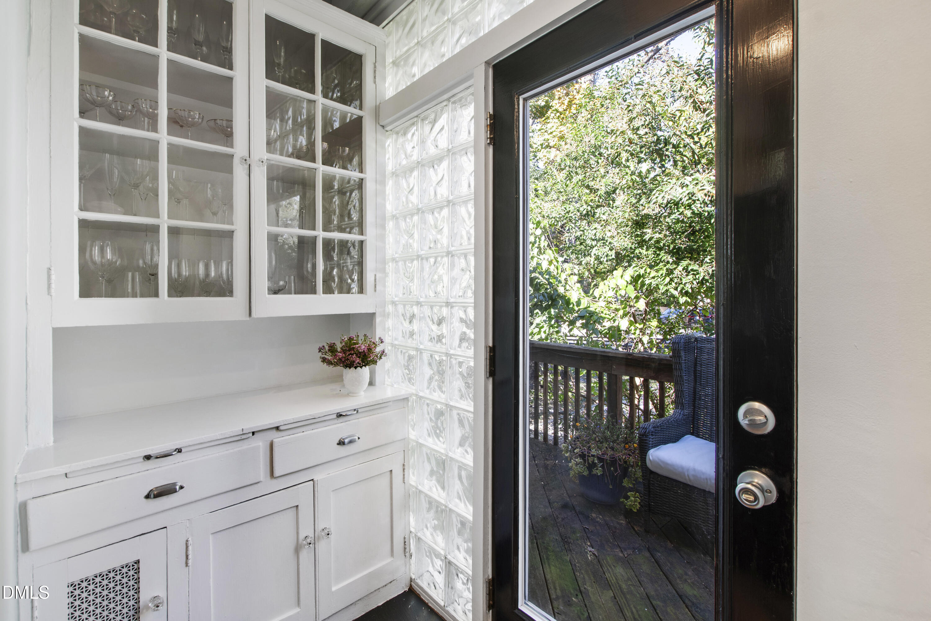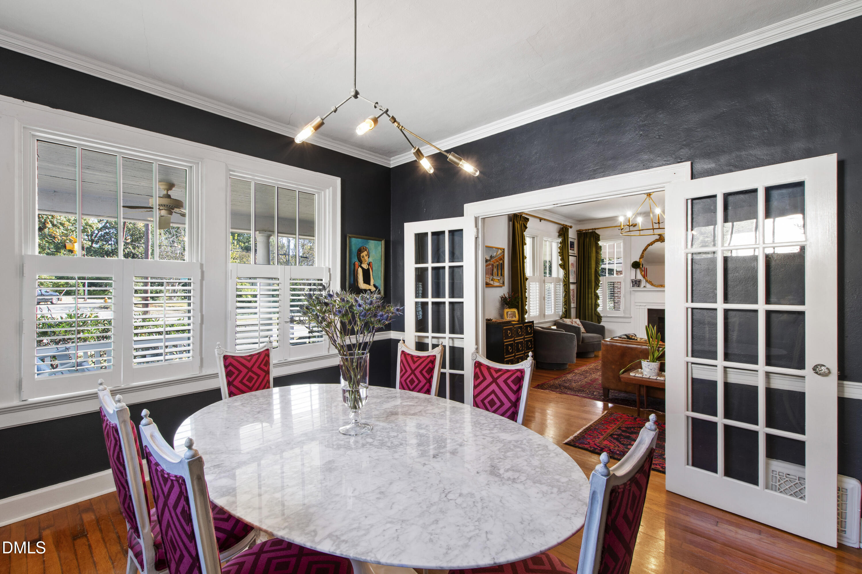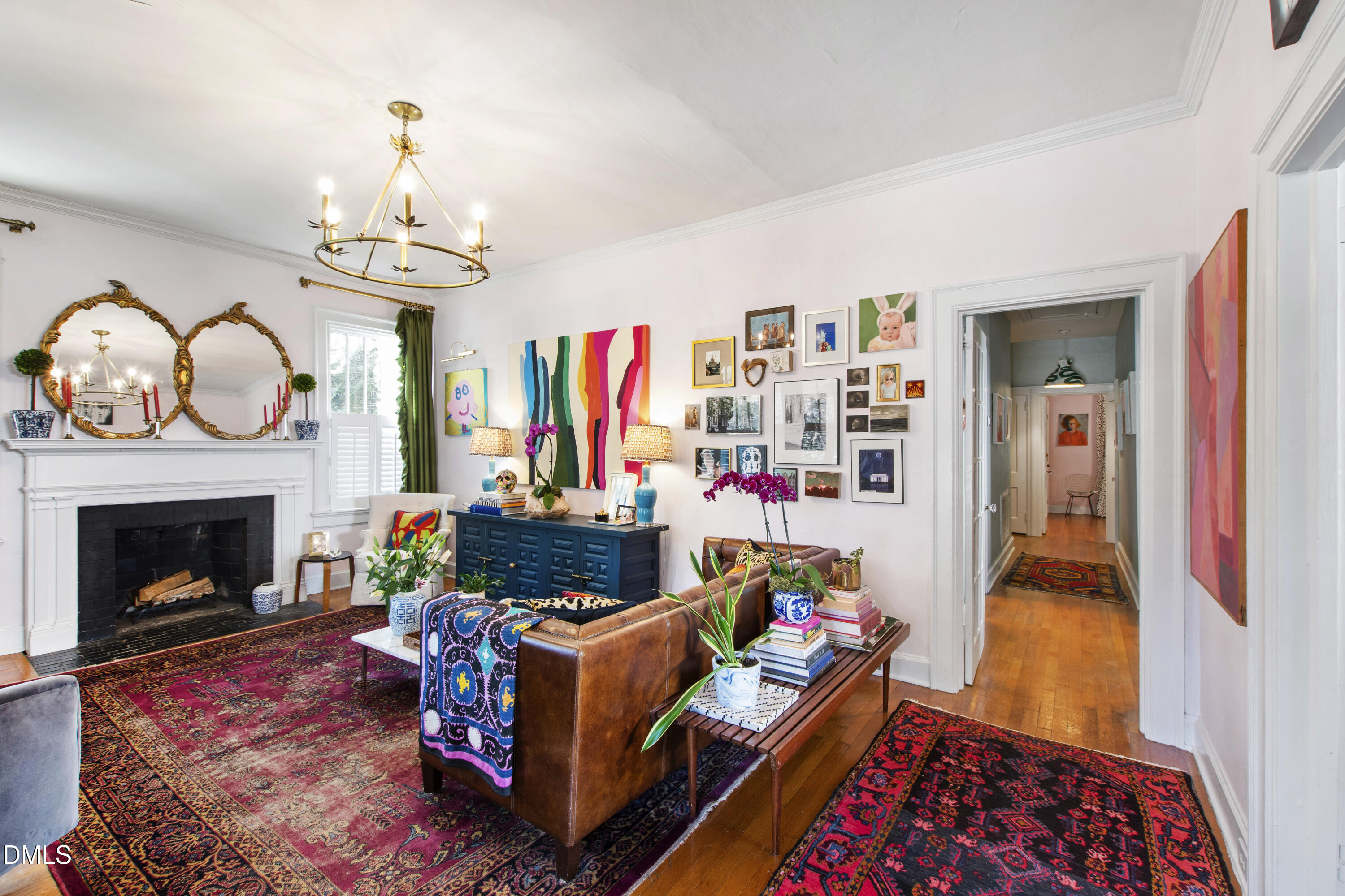 In the heart of Bloomsbury, this inviting home blends classic architecture with thoughtful updates; every room carries a sense of warmth and light. Hardwood floors anchor the main level; crown molding, built-ins, and a transom window add depth and character that speak to its era. The kitchen feels bright and personal; a glass-block wall filters soft daylight across the space, while a built-in banquette creates the perfect spot for casual meals. Crystal-style knobs and quality appliances add polish without losing charm. Bathrooms feature tile floors, medicine cabinets, and clever storage; window treatments and neighborhood-style shutters throughout the home provide both comfort and cohesion. Step outside to a fully fenced backyard where a powered tree house conveys; it's a playful, unexpected touch that makes the home feel alive. Also, downstairs are more unexpected surprises. A family room, den, playroom, laundry, bedroom, kitchenette, half bath, large closets, tool room and storage create endless options. Lower level is not counted in square footage since there is no HVAC. Although it stays very comfortable, sellers use space heaters if needed. Adding mini-splits would almost double the home's square footage. And talk about convenience! Leave the cars at home, a double wide driveway affords plenty of parking so you can walk to Five Points and all of its charm.