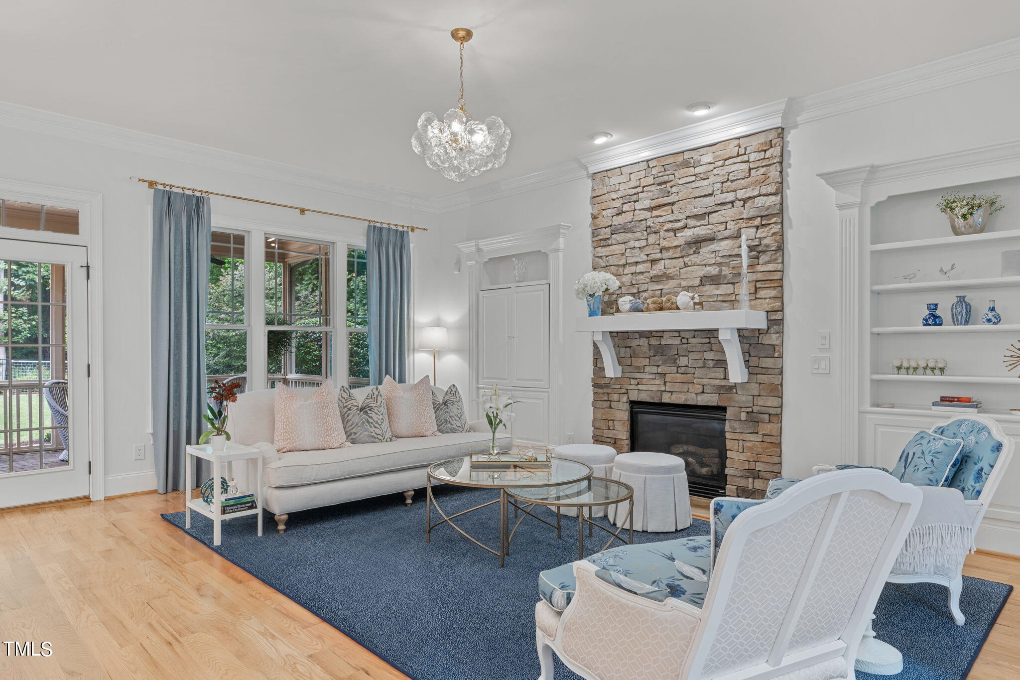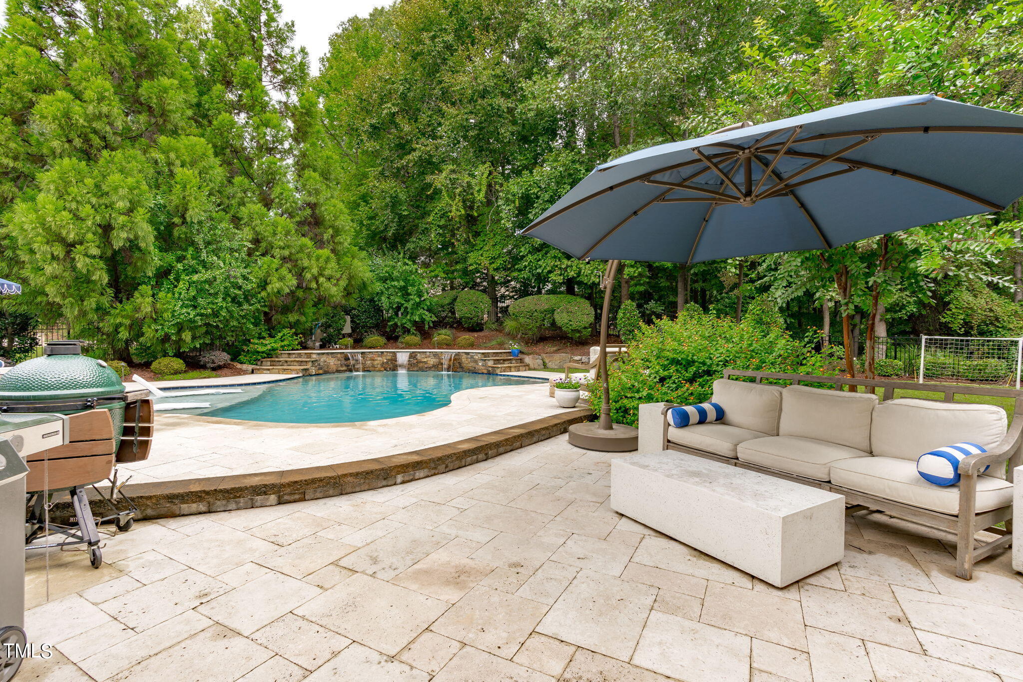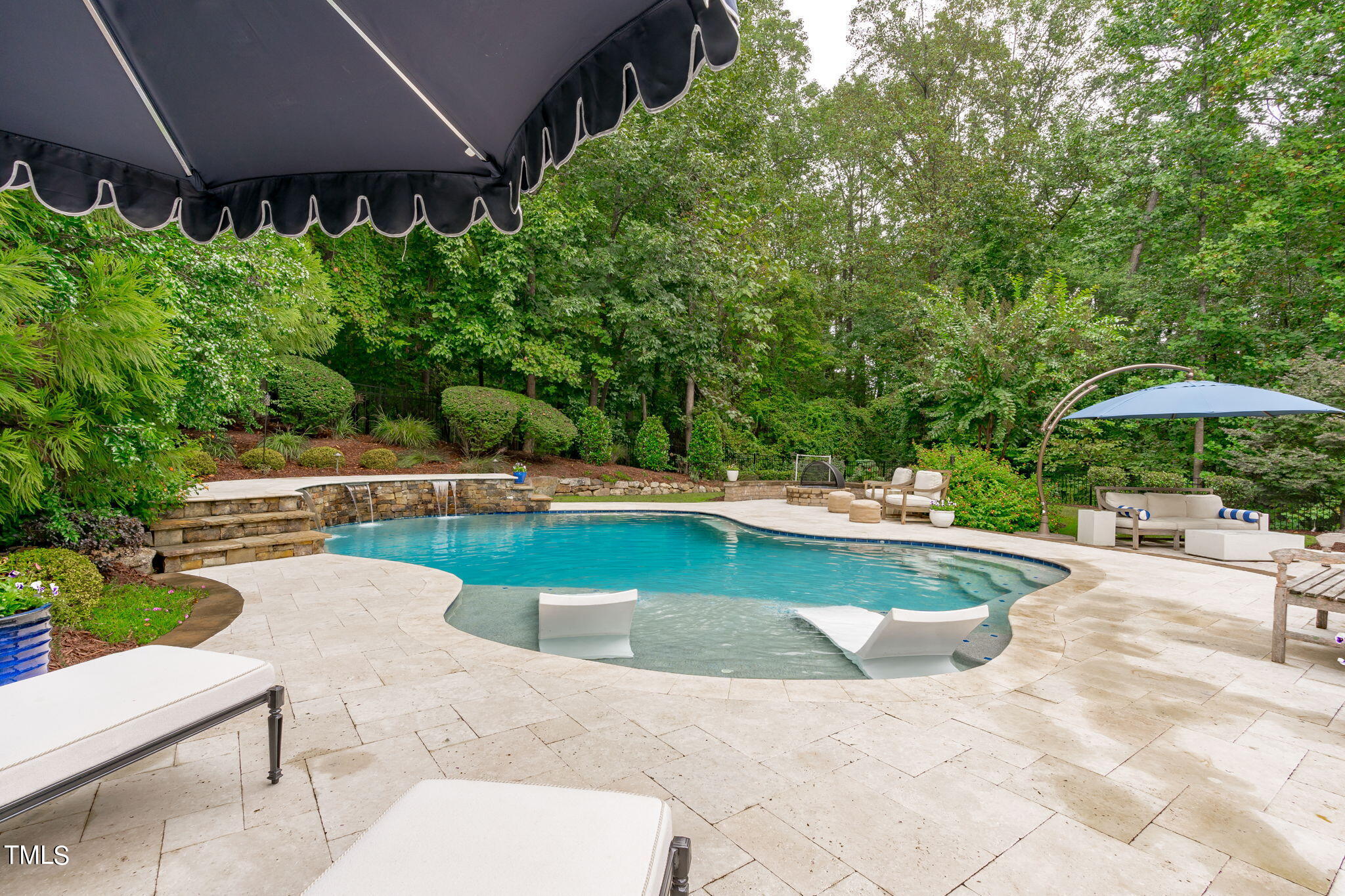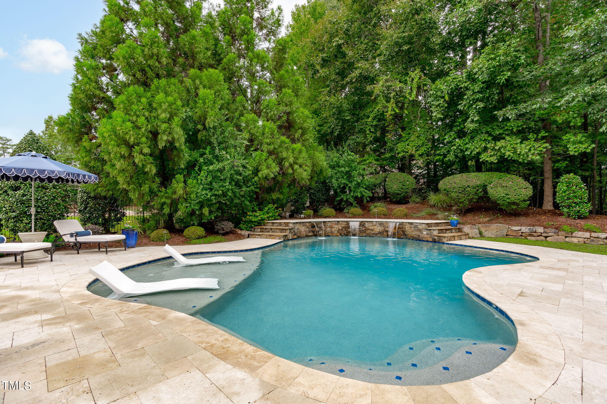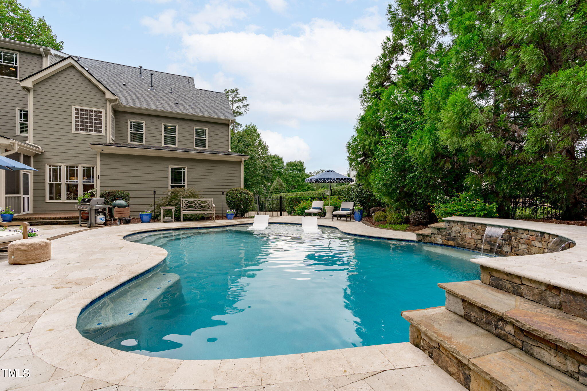 Experience luxury living in this stunning custom-built home in the sought-after Jamison Park community, just steps from Middle Creek School, park, and library! Meticulously maintained, this residence boasts an open-concept design with striking finishes, including a gourmet kitchen outfitted with a Viking gas cooktop and stove and newer KitchenAid appliances, quartz countertops, and an eye-catching herringbone subway tile backsplash. The kitchen flows seamlessly into the spacious family room, highlighted by a stone fireplace and custom built-in bookshelves. Prepare to be amazed by the sunlit dining room, adorned with coffered ceilings and elegant arched entryways. Gleaming hardwood floors span the main level, highlighted by designer lighting that adds a touch of sophistication. The second floor hosts a spacious primary suite, three additional bedrooms, and three full bathrooms. The fourth bedroom could easily serve as a bonus room. The expansive third floor offers a bonus/media room with its own full bathroom and a large unfinished storage area, ready to be tailored to your needs. Step outside to a meticulously maintained backyard that's sure to impress! Unwind on the screened-in porch overlooking a breathtaking saltwater pool with a tranquil waterfall feature, surrounded by lush landscaping for enhanced privacy. Enjoy peaceful, wooded views surrounding the property. Additional highlights include a three-car garage, newer roof, landscape lighting, and updated carpeting. This home is loaded with upgrades--see the attached features and upgrades sheet for the full list. Truly, photos don't do it justice--this is a must-see!