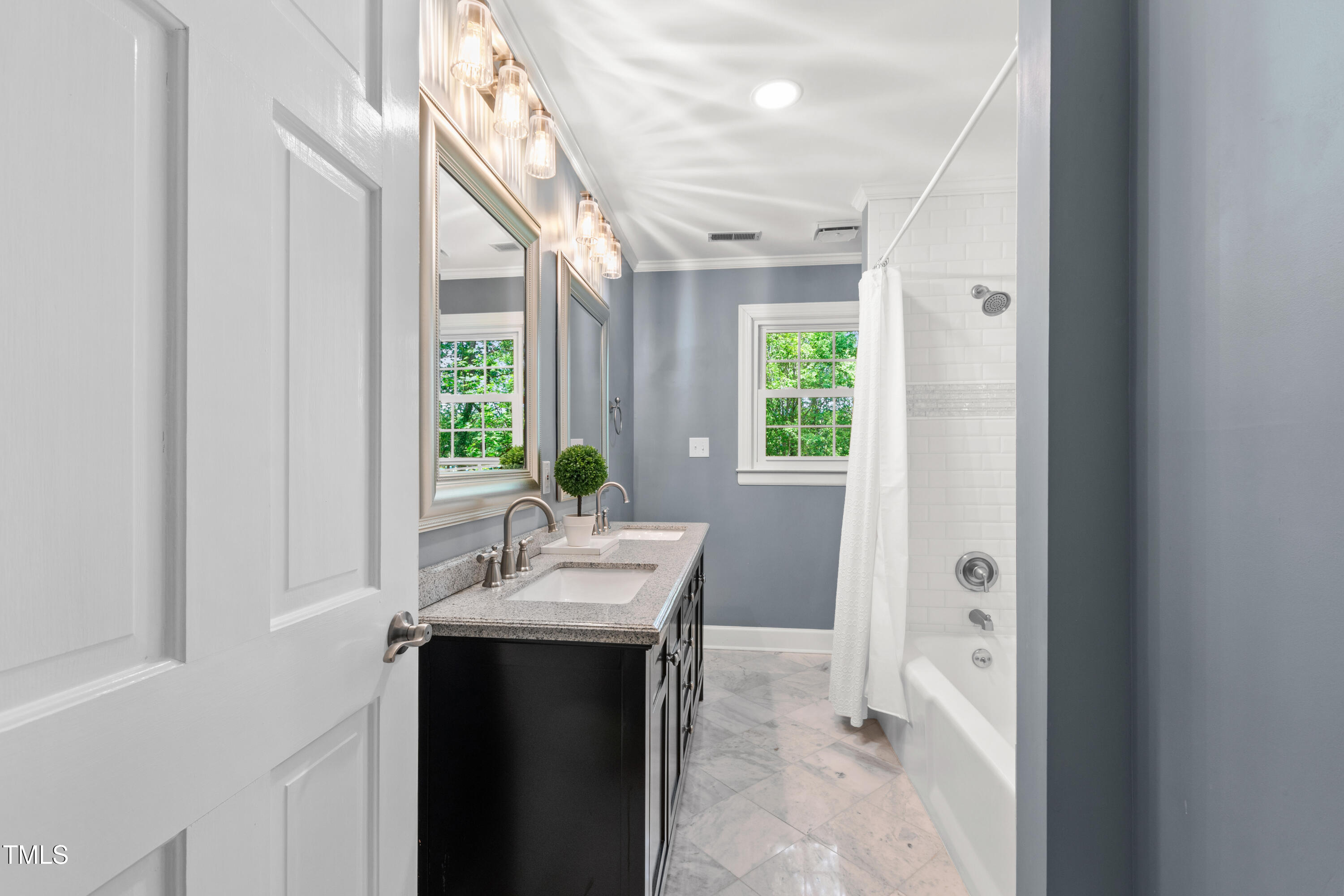 Upstairs, you'll find two well-appointed bedrooms, each with generous closets, front and rear-facing windows with custom shades, and access to unfinished attic storage. A full hall bath features a shower/tub combo, a custom vanity, and double sinks. An additional room upstairs offers flexibility as a home office, craft room, or den.