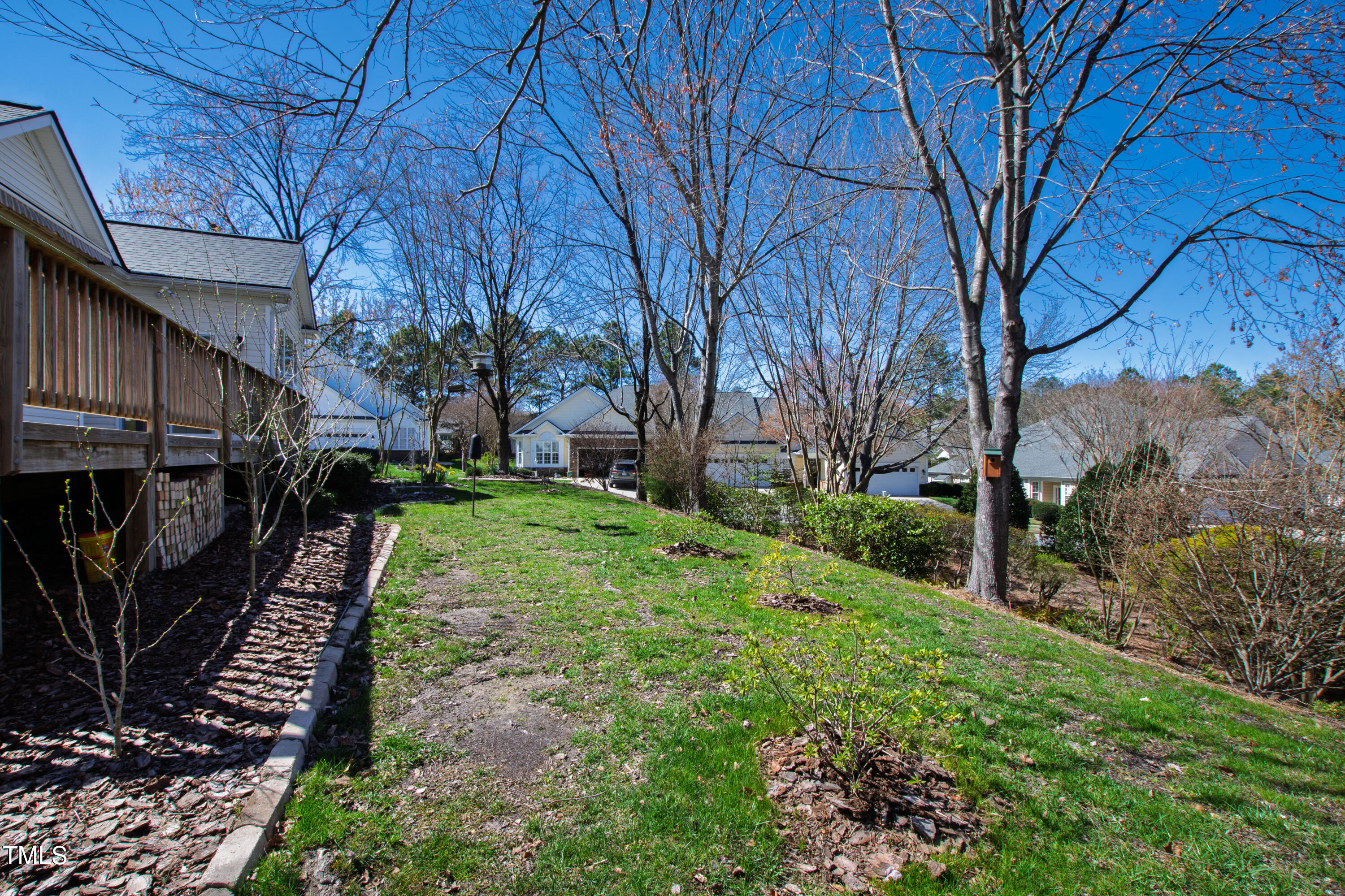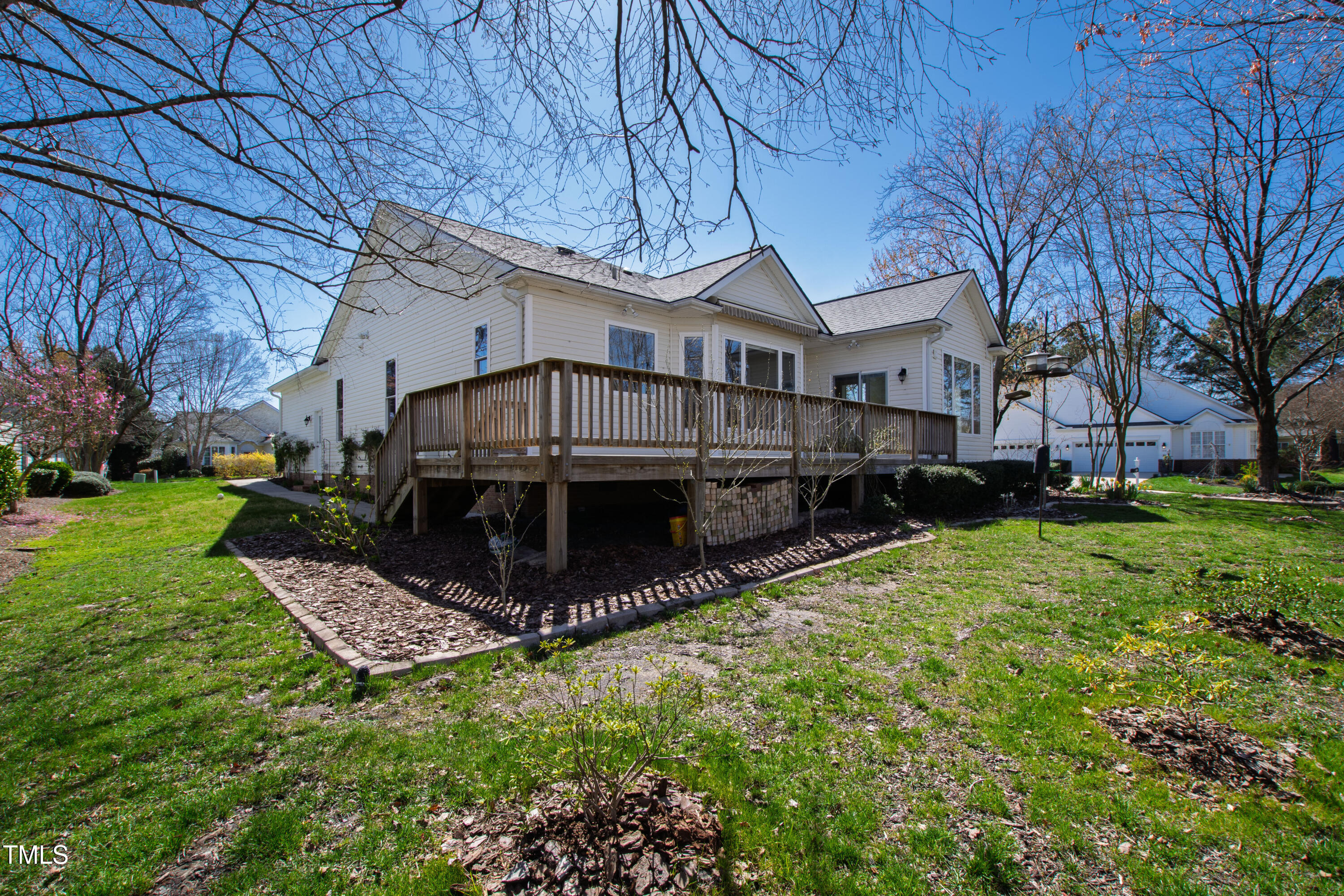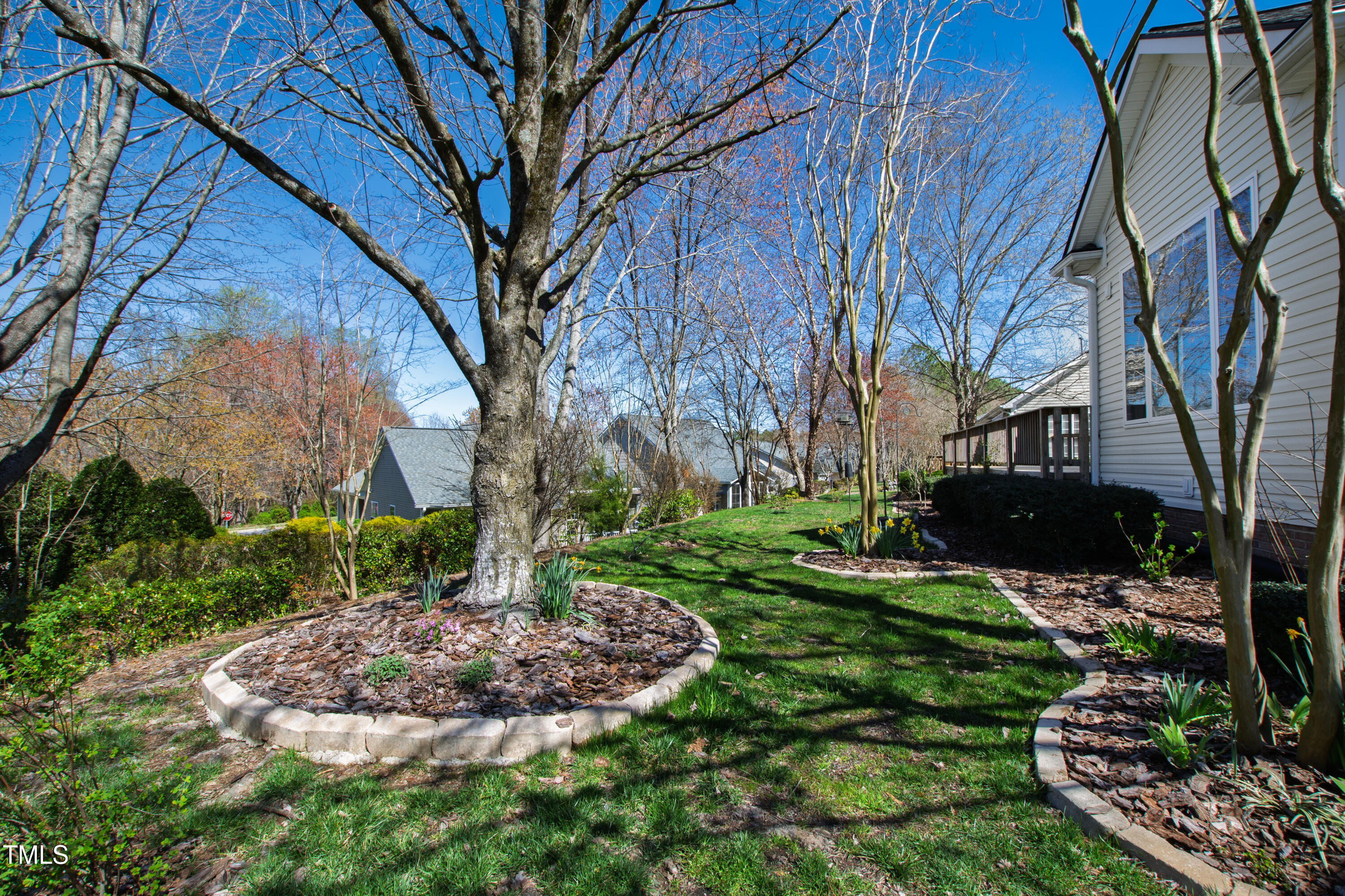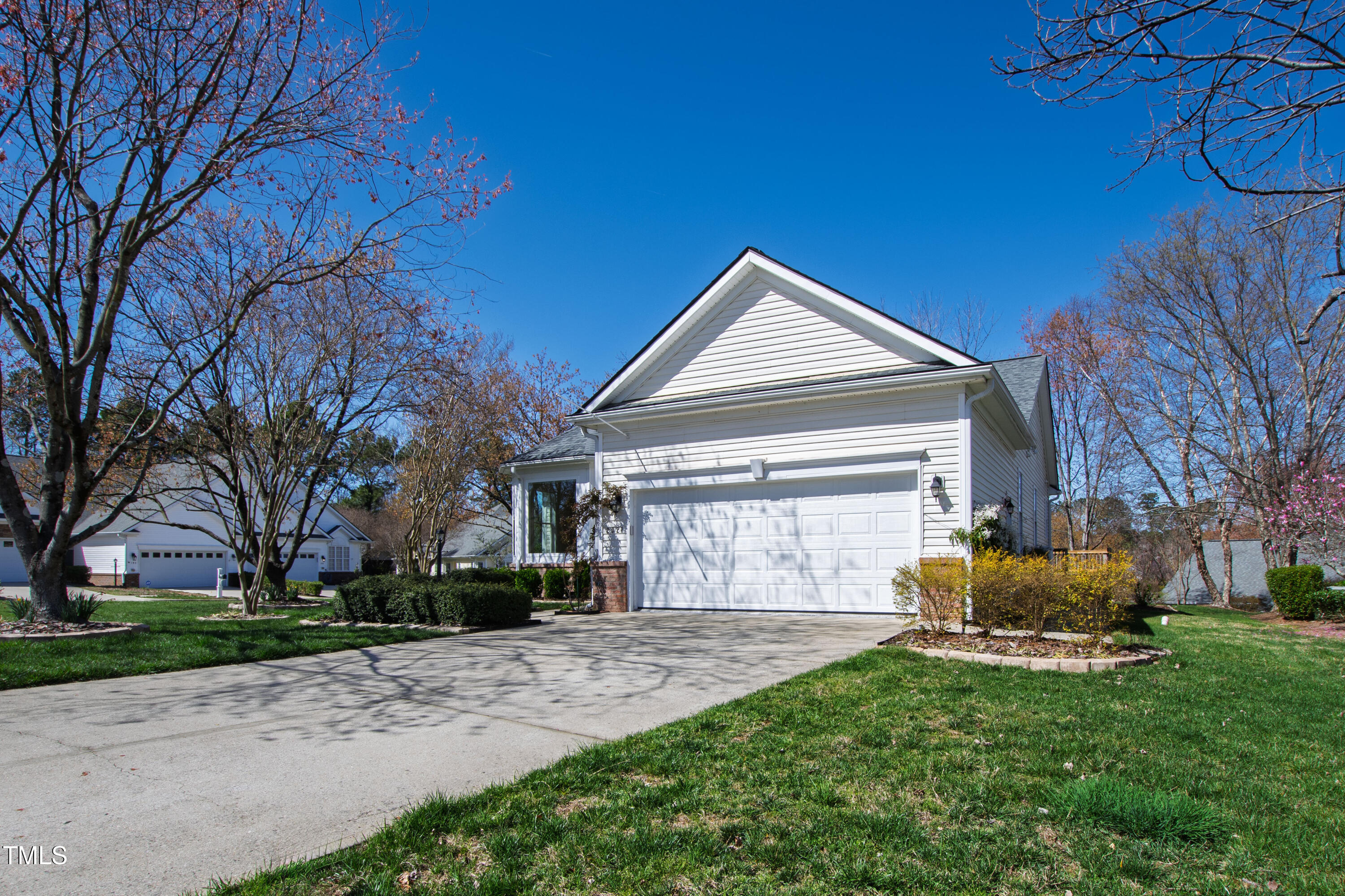 If you're looking for a home that exudes pride in ownership, high-end upgrades and unbeatable natural light in Cary's highly coveted Heritage Pines 55+ Active Adult Community, look no further than 2021 Heritage Pines Drive. Extraordinary curb appeal welcomes you to one of the largest lots in the neighborhood, brimmed with fragrant, blooming florals and an extra-large deck with electric awning all replaced in 2023. When you enter through the front door, you'll be pleased to find low maintenance, solid-stand bamboo flooring throughout. The welcoming, vaulted family room, anchored by functional fireplace with gas stub, beams with natural light due to custom, enlarged UV-filtering picture windows replaced throughout the home including in the sunroom, which is perfectly positioned for morning sunshine. An updated kitchen in 2020 is a chef's dream and features solid wood, soft-close cabinetry, granite countertops, upgraded Bosch appliances including a warming drawer, JennAir fridge, and small details that go a long way - motion sensor sink faucet, hidden kickplate storage, and counter-top waste chute for convenient meal prep. The spacious primary suite, located privately on the back of the home, is highlighted by his-and-her closets, raised built-in vanity and fully updated bathroom with zero-entry shower, dual vanity, custom cabinetry, skilled tilework, raised toilet and bidet. You'll notice how meticulously this home has been cared for from the updated electrical throughout, LED lighting added, 2023 HVAC, 2023 roof and gutter guards, termite bond, extended laundry room, and irrigation system. Garage features exceptional storage with 15 7/8 shelving added, entry ramp, dehumidifier, epoxy floors and new door/motor replaced in 2023. All of this in a friendly neighborhood, right around the corner from the active community clubhouse anchored by pool, fitness center, meeting space, pickleball, tennis, and bocce courts. The only thing left missing in this home, is you! For additional upgrades, please see features sheet attached to listing.