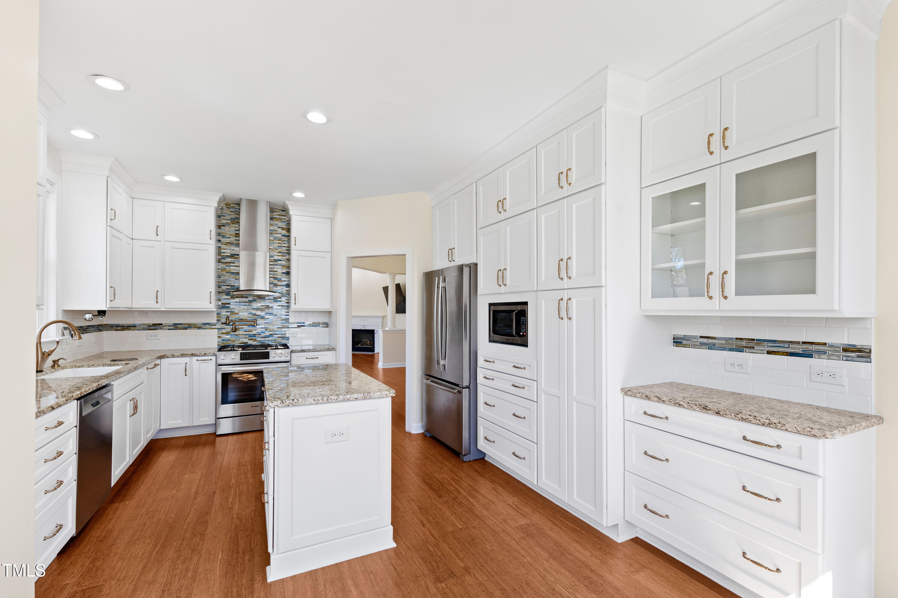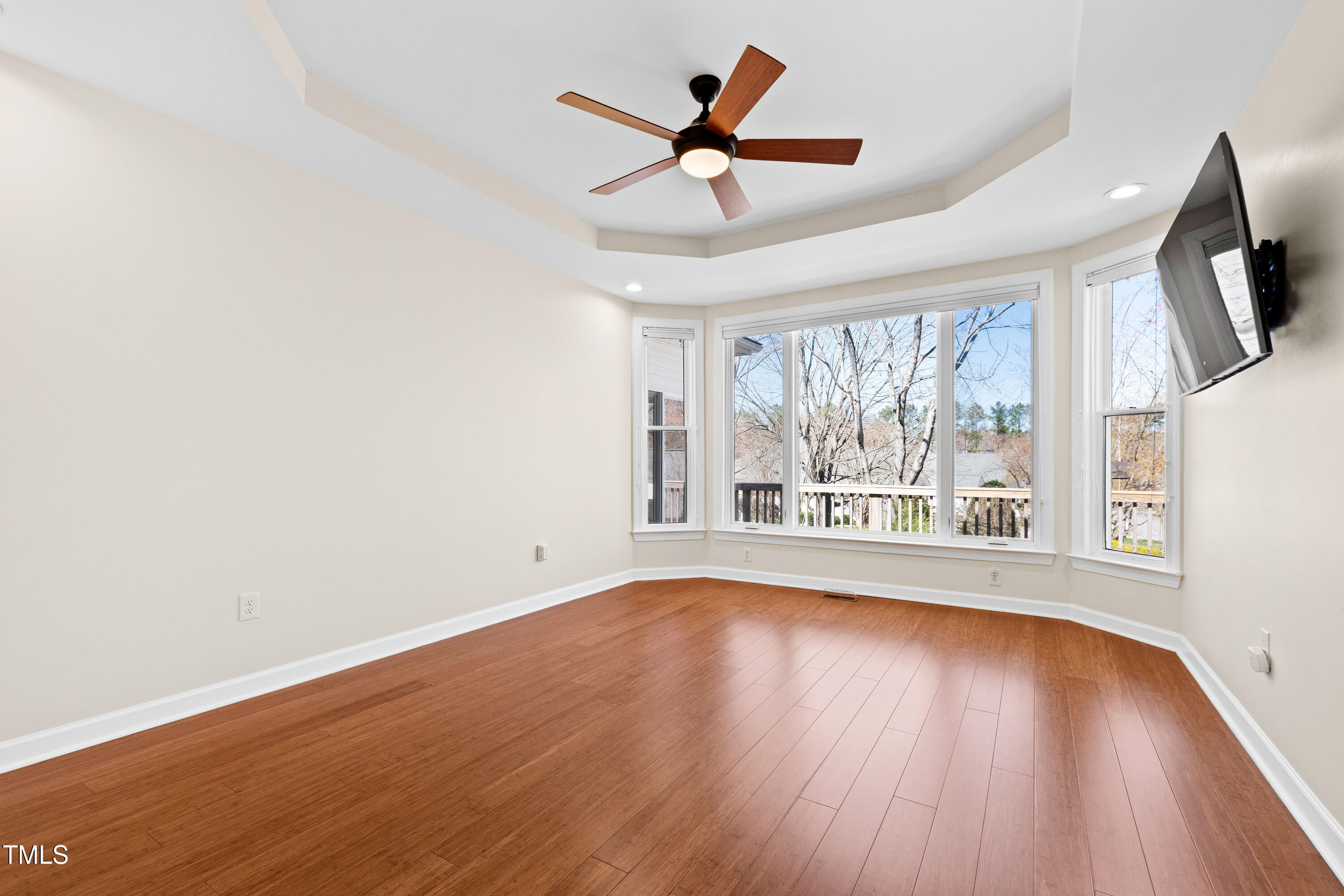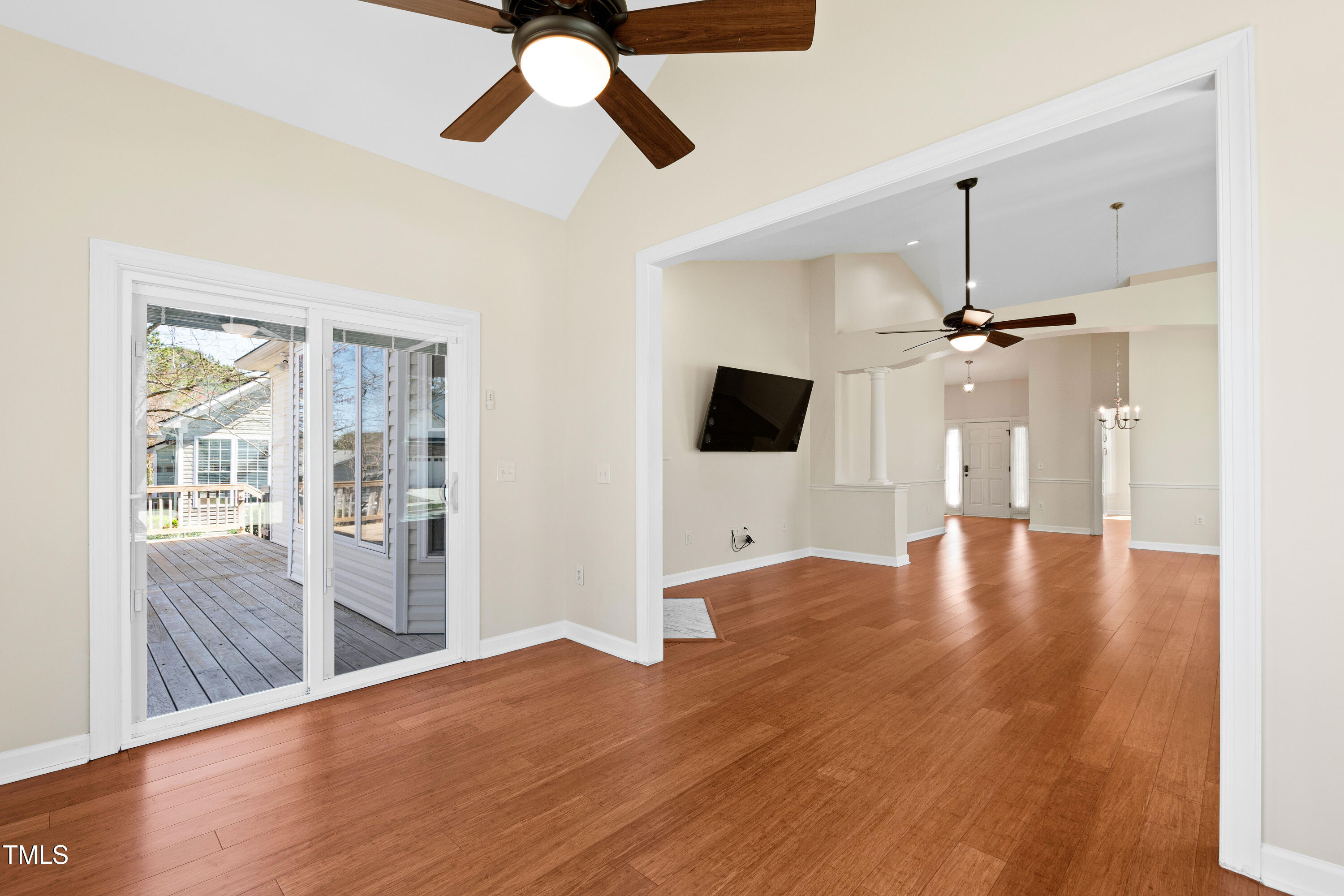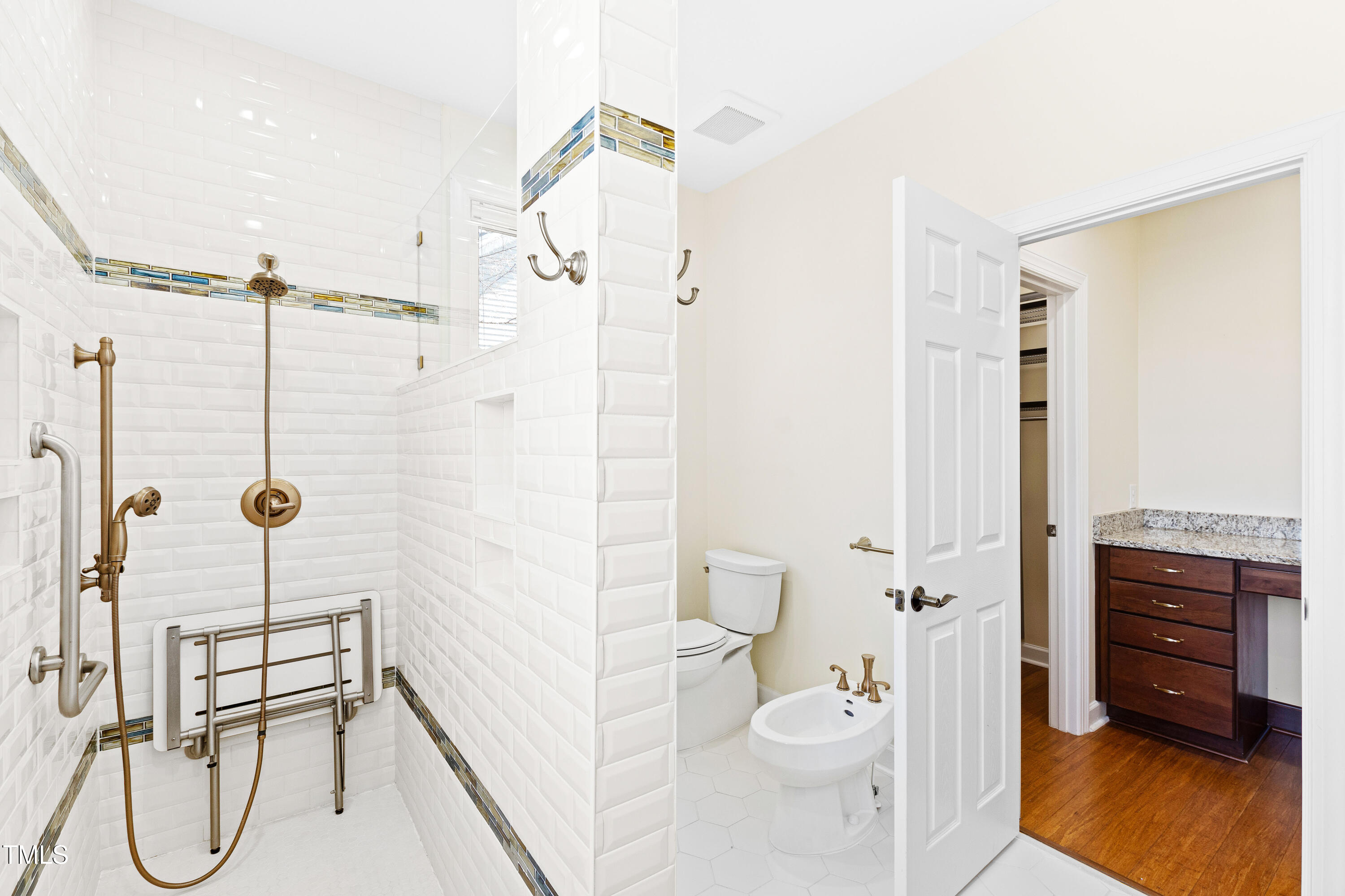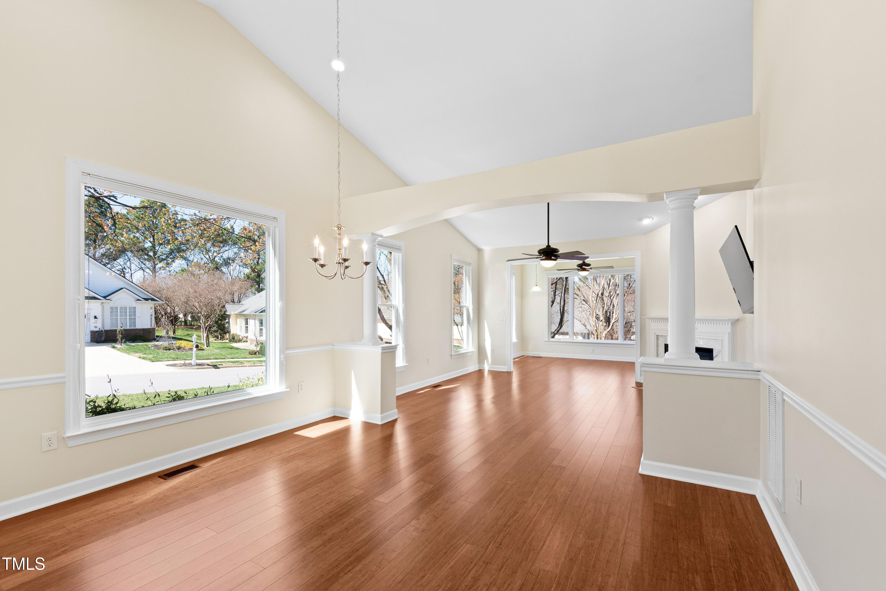 If you're looking for a home that exudes pride in ownership, high-end upgrades and unbeatable natural light in Cary's highly coveted Heritage Pines 55+ Active Adult Community, look no further than 2021 Heritage Pines Drive. Extraordinary curb appeal welcomes you to one of the largest lots in the neighborhood, brimmed with fragrant, blooming florals and an extra-large deck with electric awning all replaced in 2023. When you enter through the front door, you'll be pleased to find low maintenance, solid-stand bamboo flooring throughout. The welcoming, vaulted family room, anchored by functional fireplace with gas stub, beams with natural light due to custom, enlarged UV-filtering picture windows replaced throughout the home including in the sunroom, which is perfectly positioned for morning sunshine. An updated kitchen in 2020 is a chef's dream and features solid wood, soft-close cabinetry, granite countertops, upgraded Bosch appliances including a warming drawer, JennAir fridge, and small details that go a long way - motion sensor sink faucet, hidden kickplate storage, and counter-top waste chute for convenient meal prep. The spacious primary suite, located privately on the back of the home, is highlighted by his-and-her closets, raised built-in vanity and fully updated bathroom with zero-entry shower, dual vanity, custom cabinetry, skilled tilework, raised toilet and bidet. You'll notice how meticulously this home has been cared for from the updated electrical throughout, LED lighting added, 2023 HVAC, 2023 roof and gutter guards, termite bond, extended laundry room, and irrigation system. Garage features exceptional storage with 15 7/8 shelving added, entry ramp, dehumidifier, epoxy floors and new door/motor replaced in 2023. All of this in a friendly neighborhood, right around the corner from the active community clubhouse anchored by pool, fitness center, meeting space, pickleball, tennis, and bocce courts. The only thing left missing in this home, is you! For additional upgrades, please see features sheet attached to listing.