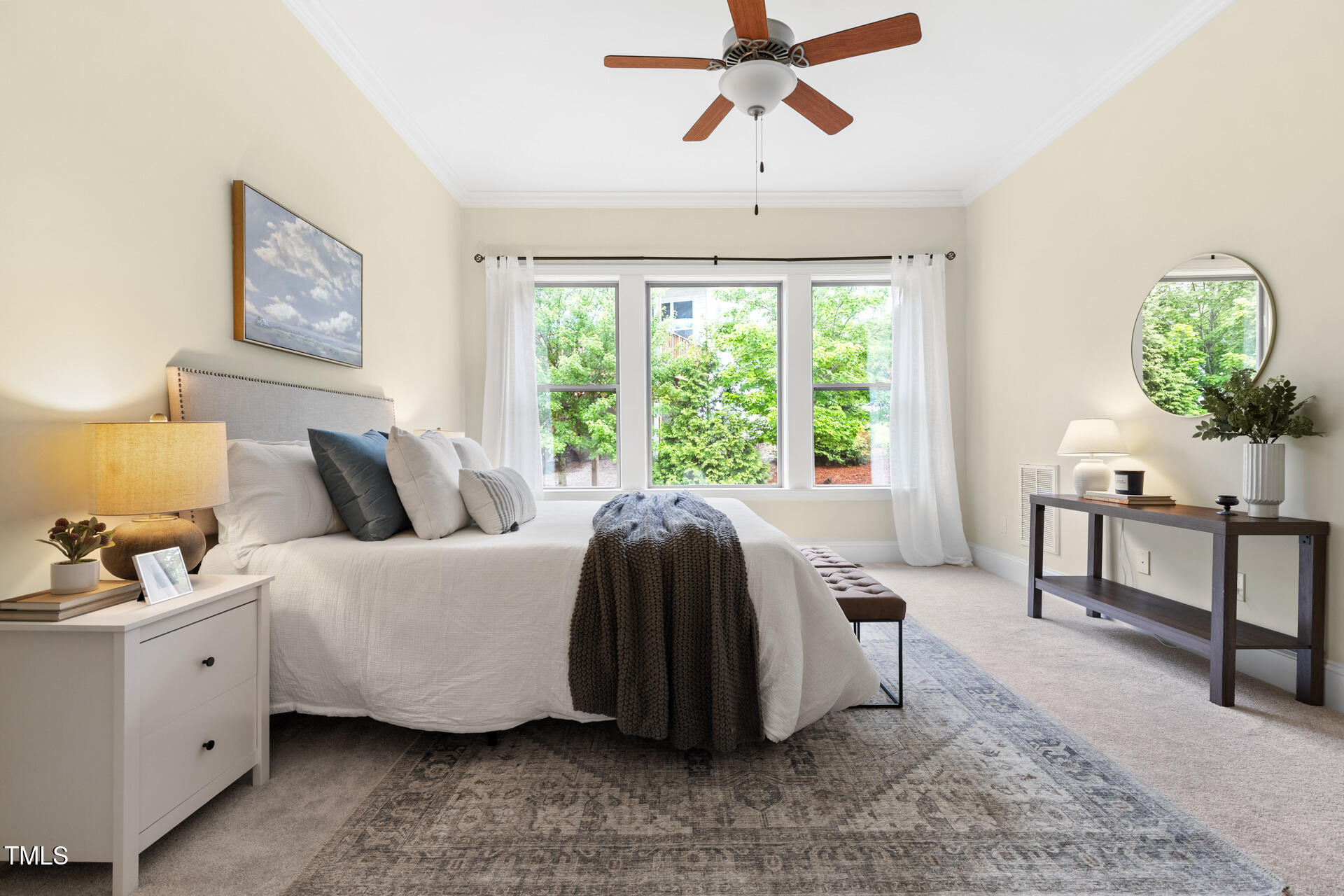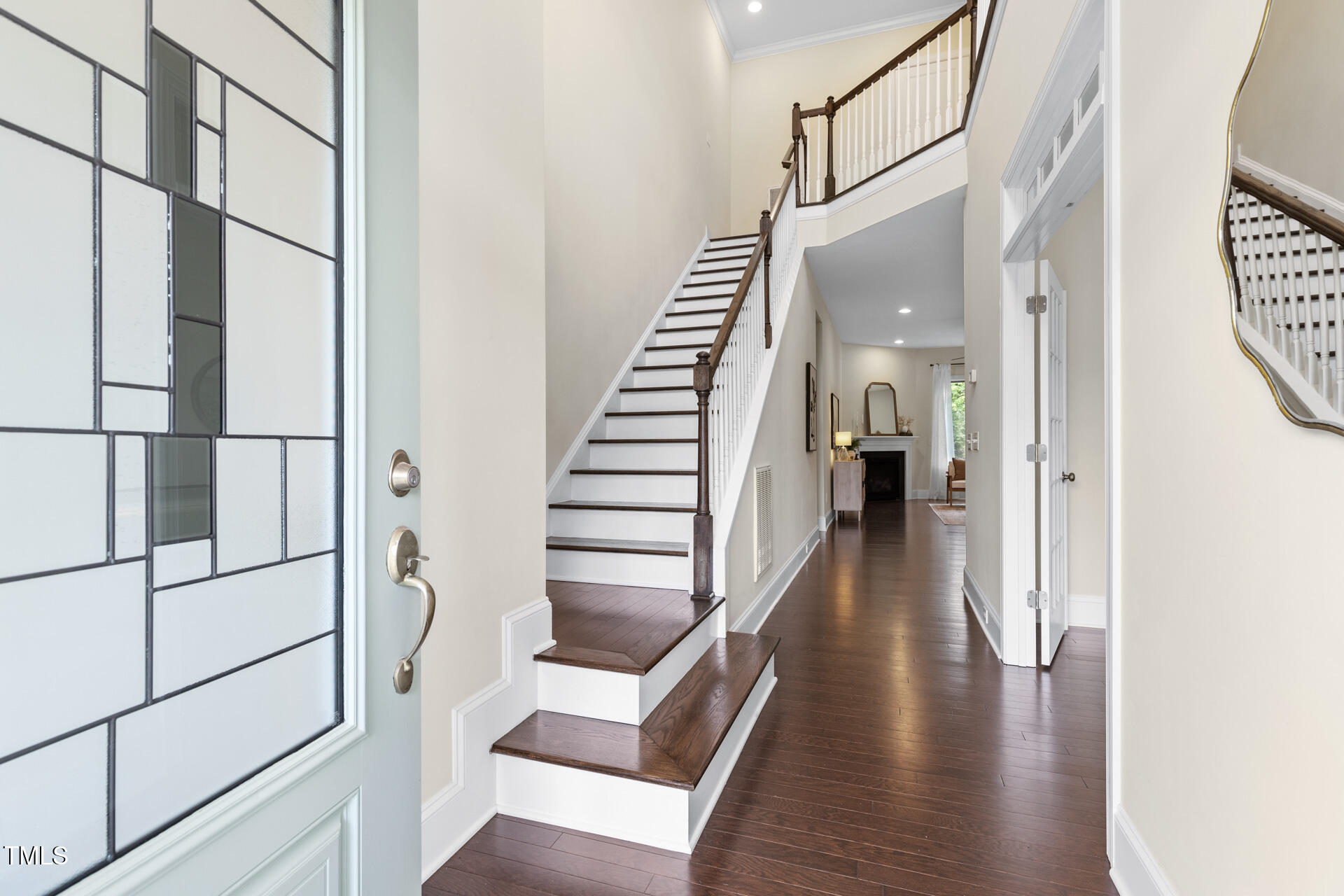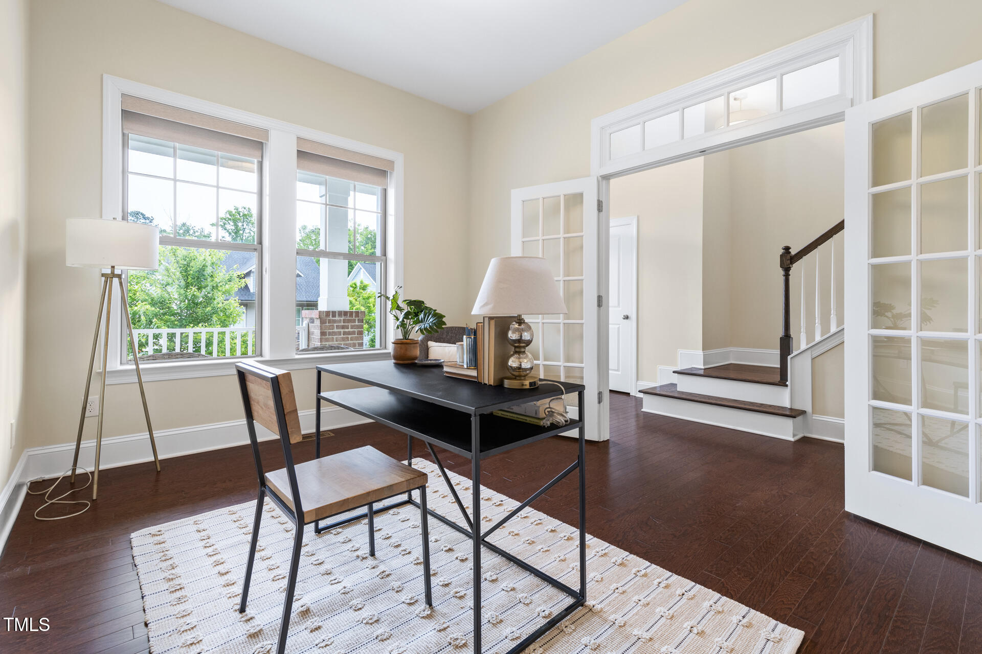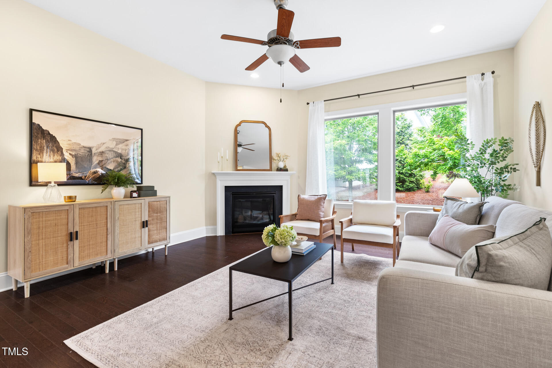 Perfection in popular Montclair! Built in 2018 with meticulous attention to detail, enjoy a gracious floor plan that features a main floor primary suite, main floor office and main floor laundry room...a winning and rare combo. The open-concept layout showcases an impressive family room with a cozy gas fireplace, perfect for gatherings. The gourmet kitchen features stainless-steel appliances and gas cooktop, large center island offering counter seating with ample storage, and a generously sized walk-in pantry. Adjacent is a bright dining area, surrounded by windows offering lush, green views of the private landscape. A lovely, covered porch extends the living space outdoors and ensures year-round enjoyment of the flat backyard. The main floor primary suite is a true retreat with tall ceilings and bountiful light, an expansive ensuite bath with double vanities, walk-in shower, and deluxe walk-in closet. This spectacular 3-bed home, delights with its flexible floor plan. Separate office adorned with glass-front French doors on the main floor. Upstairs, you'll find two well-appointed bedrooms, each with generous closets. Need a flex space? Generous second floor bonus space has endless functionality for evolving needs. Plus, comfortable access to the walk-in storage. And let's not forget the built-in drop zone that can actually accommodate all of the things. Attached 2-car garage. Sealed crawl space and Energy Star Qualified Home offers peace of mind. Easy living & low maintenance means you can spend your time enjoying life and exploring all the Triangle has to offer. Unparalleled convenience of Chapel Hill living (Durham Co taxes): located just minutes to UNC, I-40, Duke, shopping and entertainment.