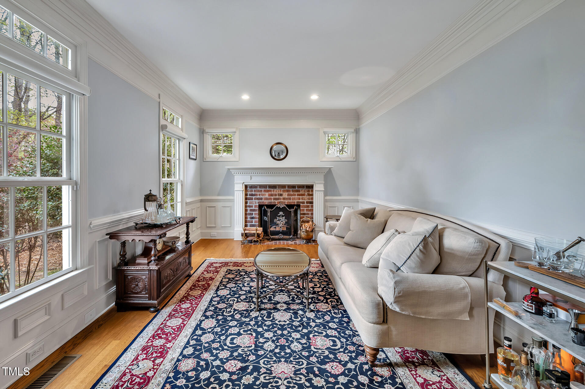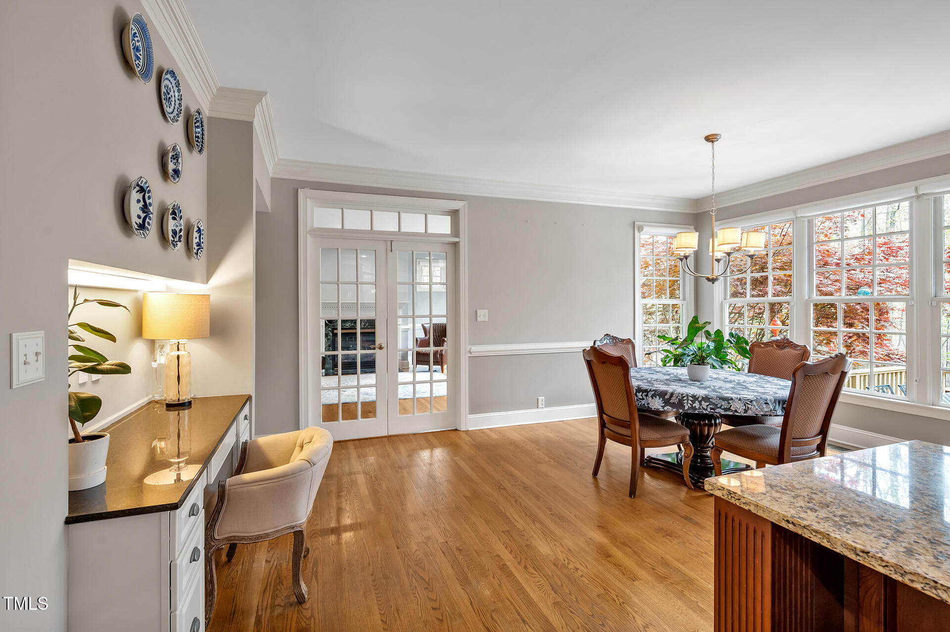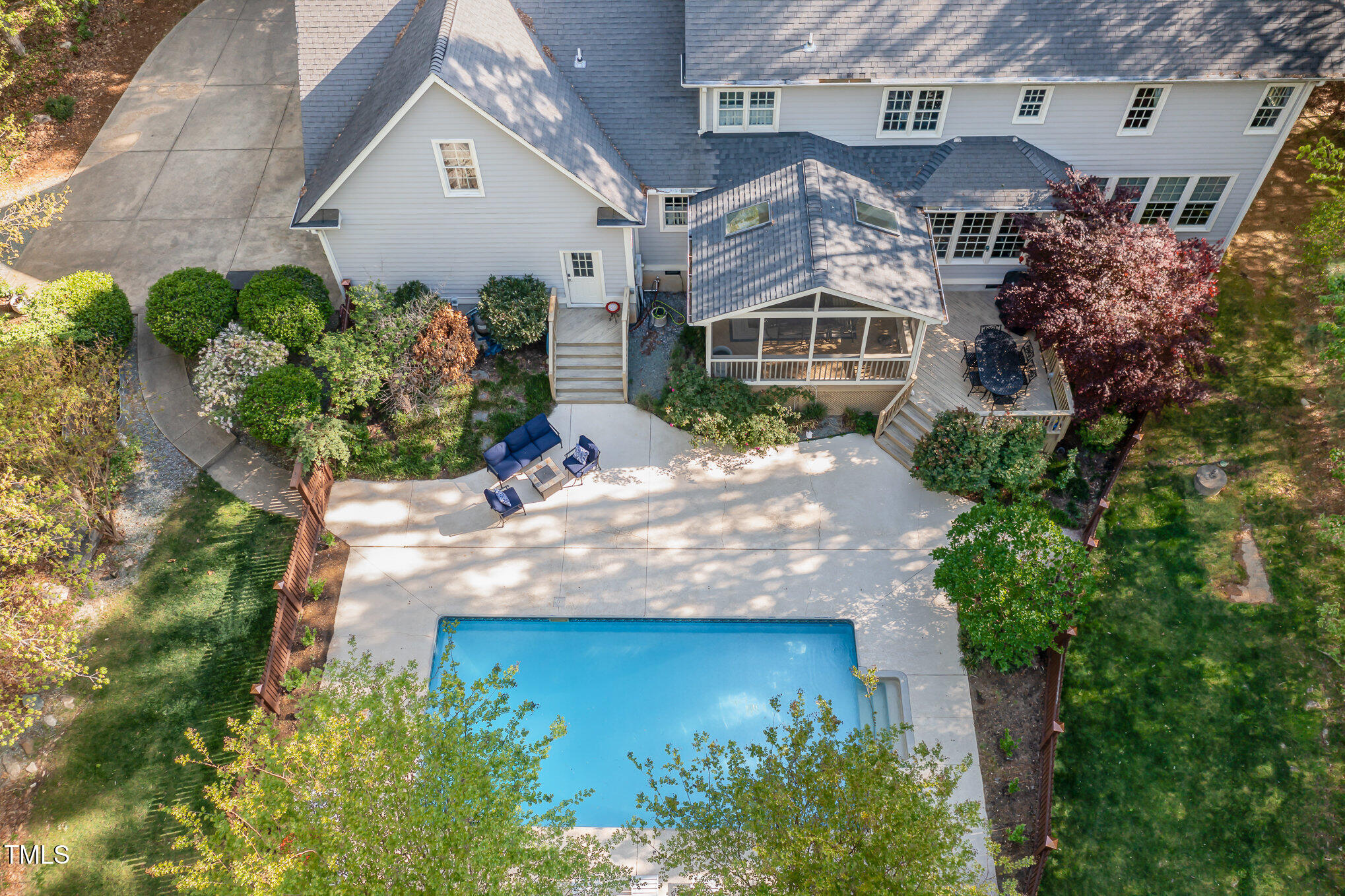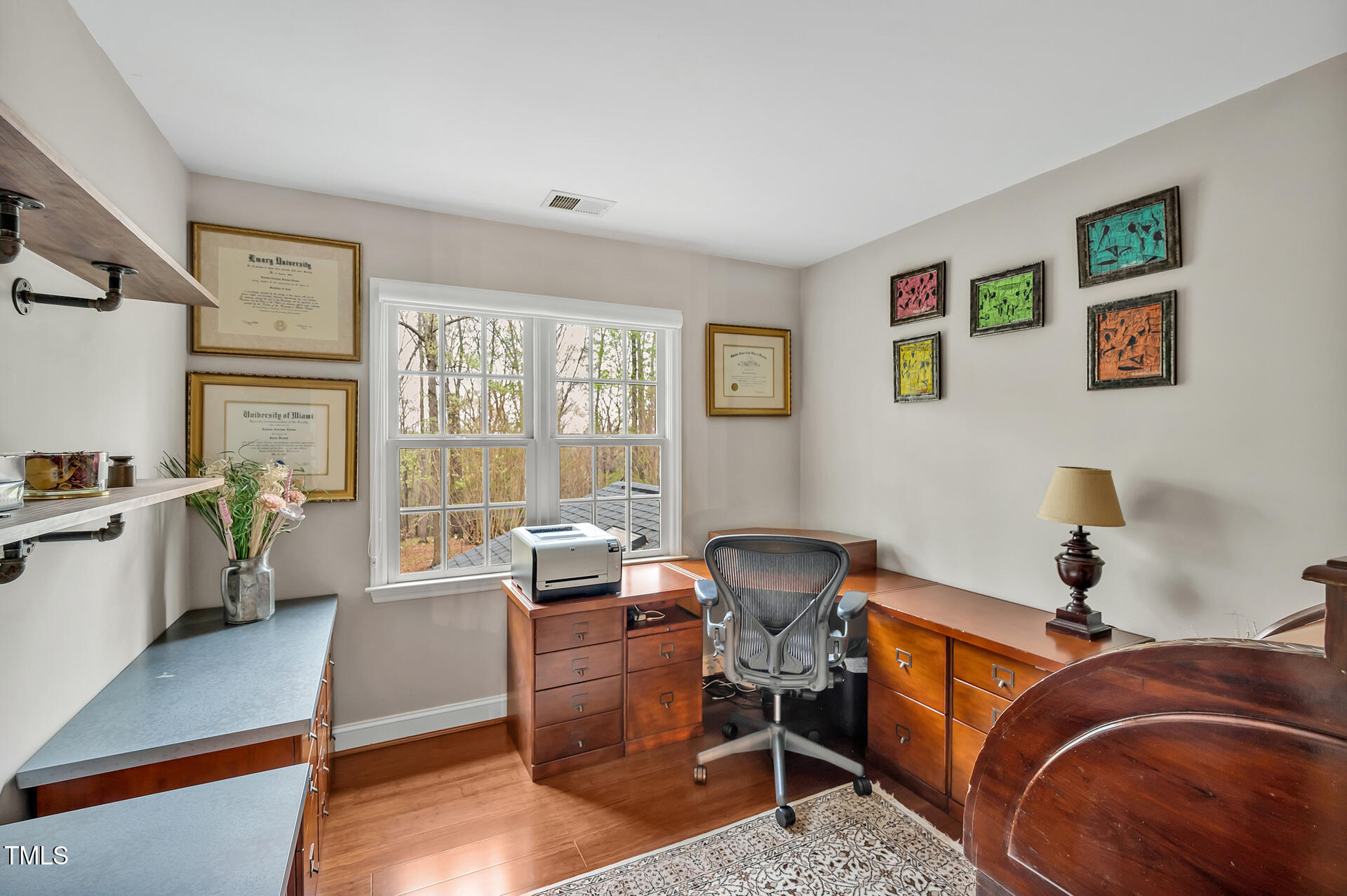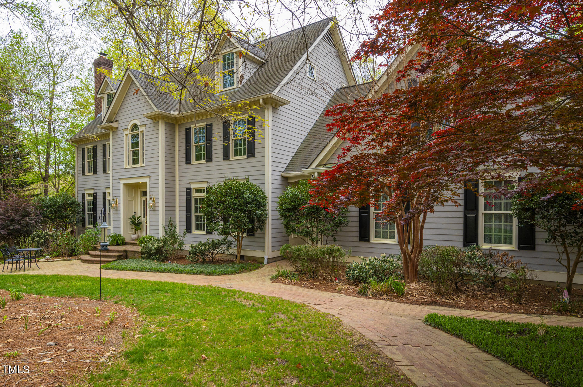 Welcome to this beautifully appointed home that offers both charm and functionality, two miles from the campus and hospital of UNC-Chapel Hill, in an award-winning school district. The main level features a spacious study with a cozy fireplace and French doors, perfect for working or relaxing. The large eat-in kitchen is a chef's dream, with ample storage, a central island for barstools, granite countertops, a gas range, and a convenient bill-paying desk. The inviting family room boasts a wall of windows that frame the picturesque backyard, also accessible through French doors.