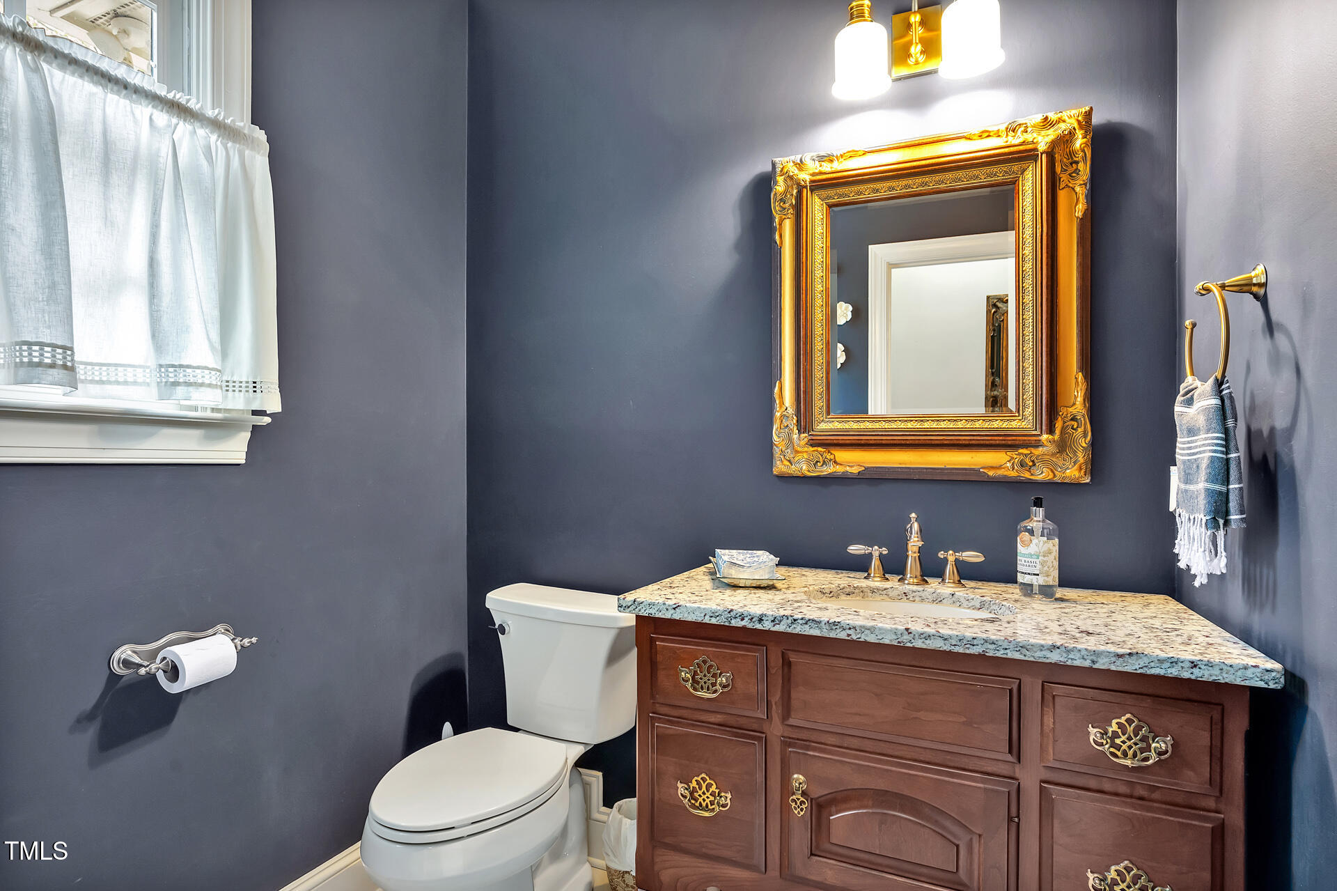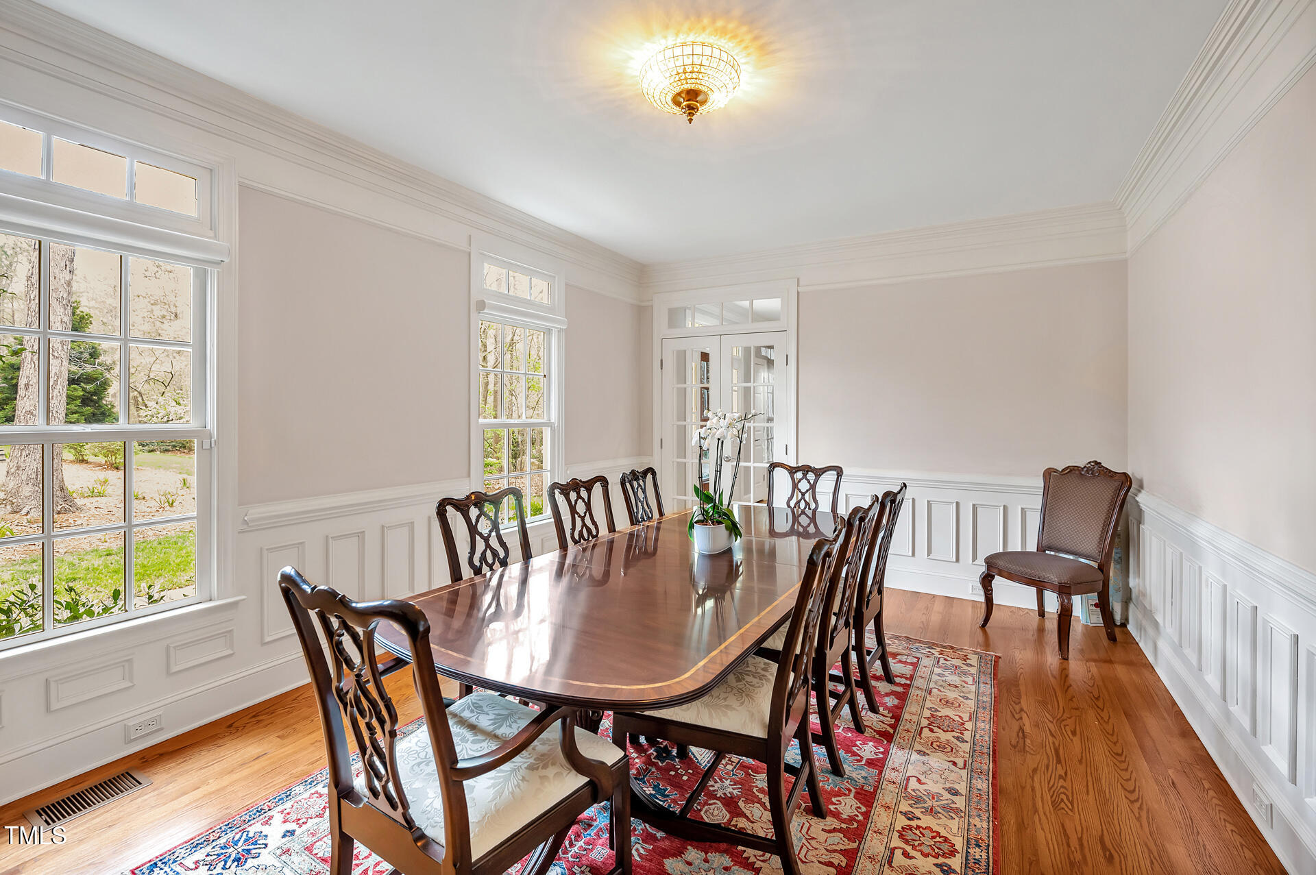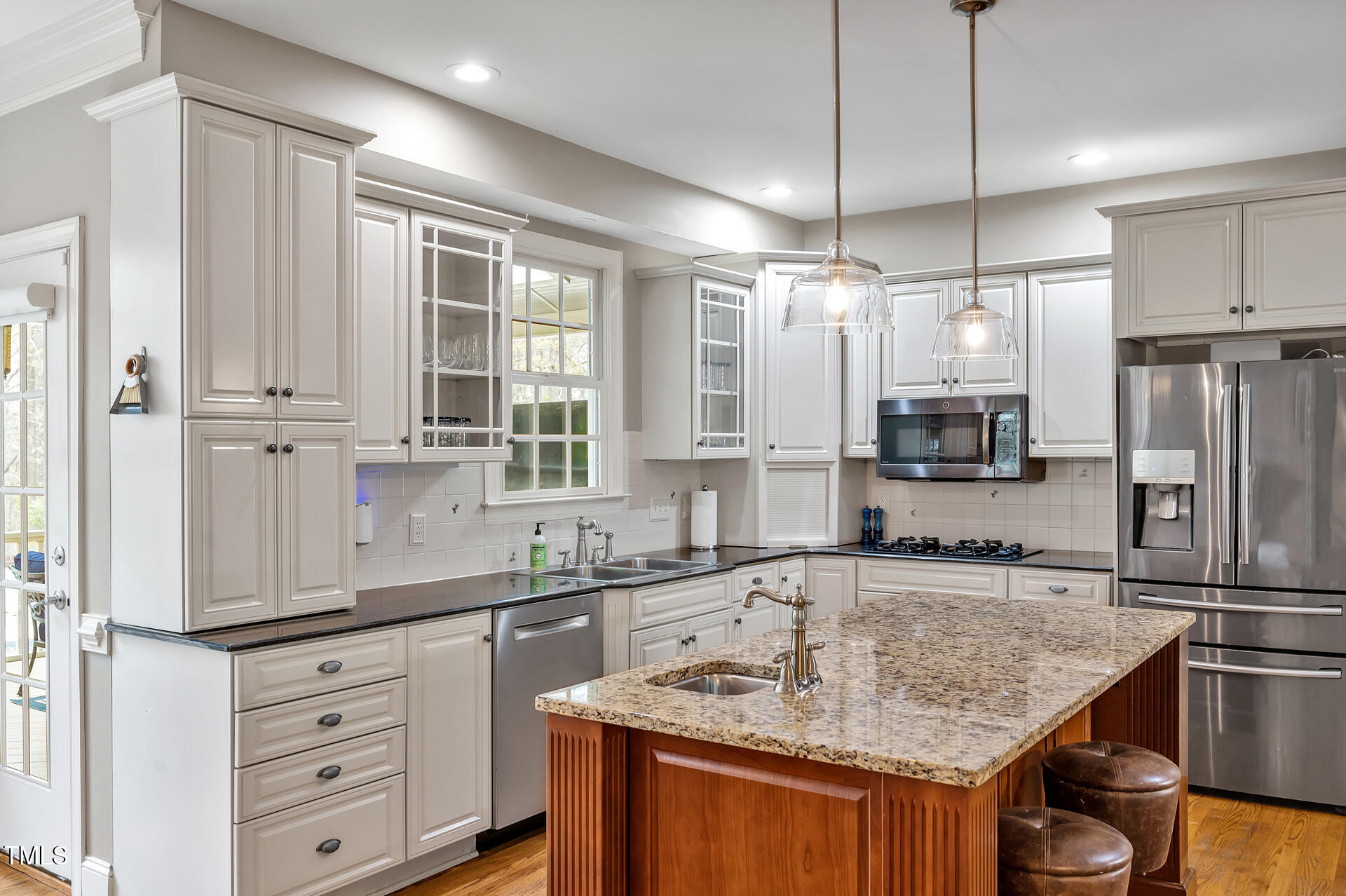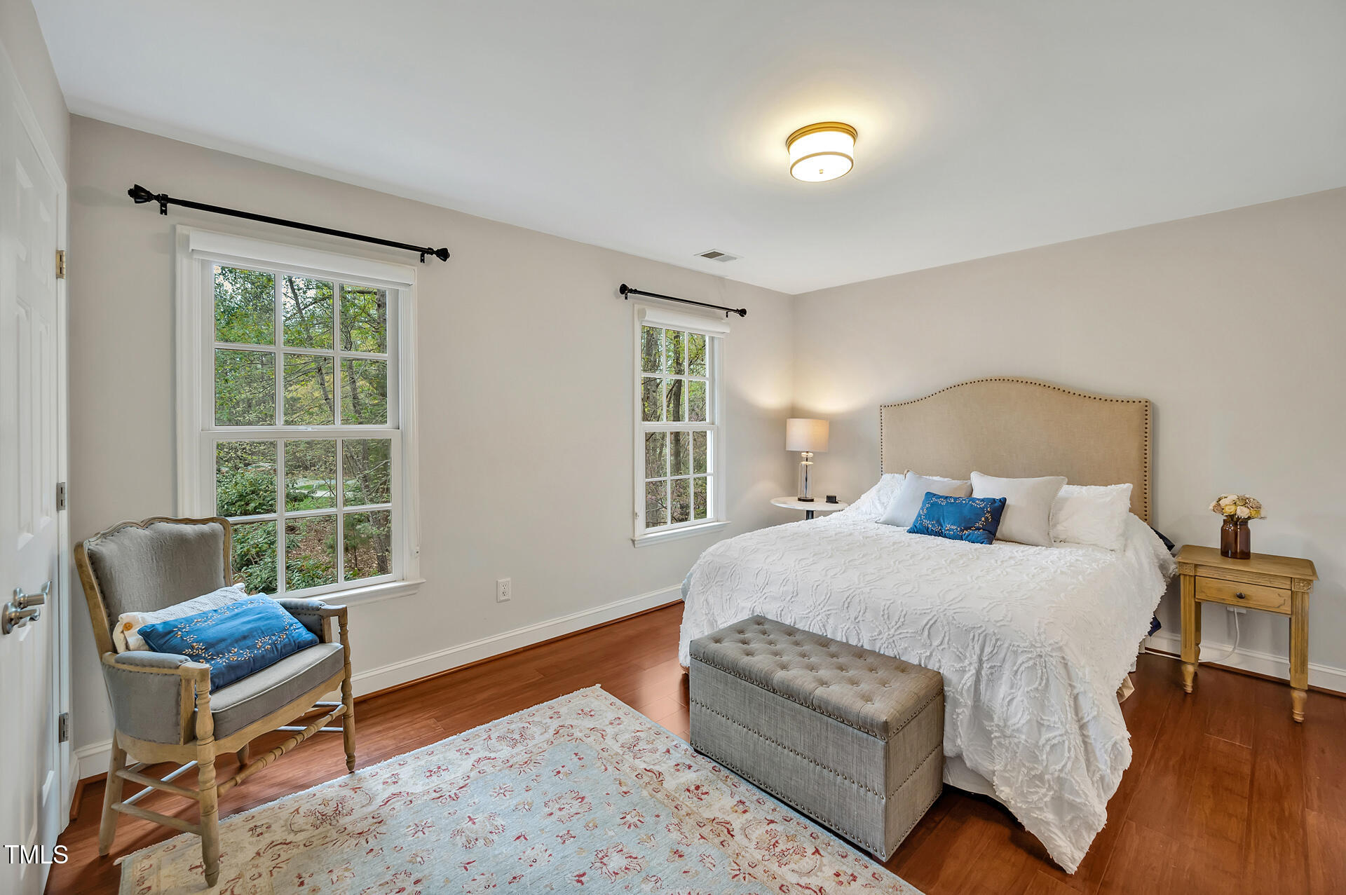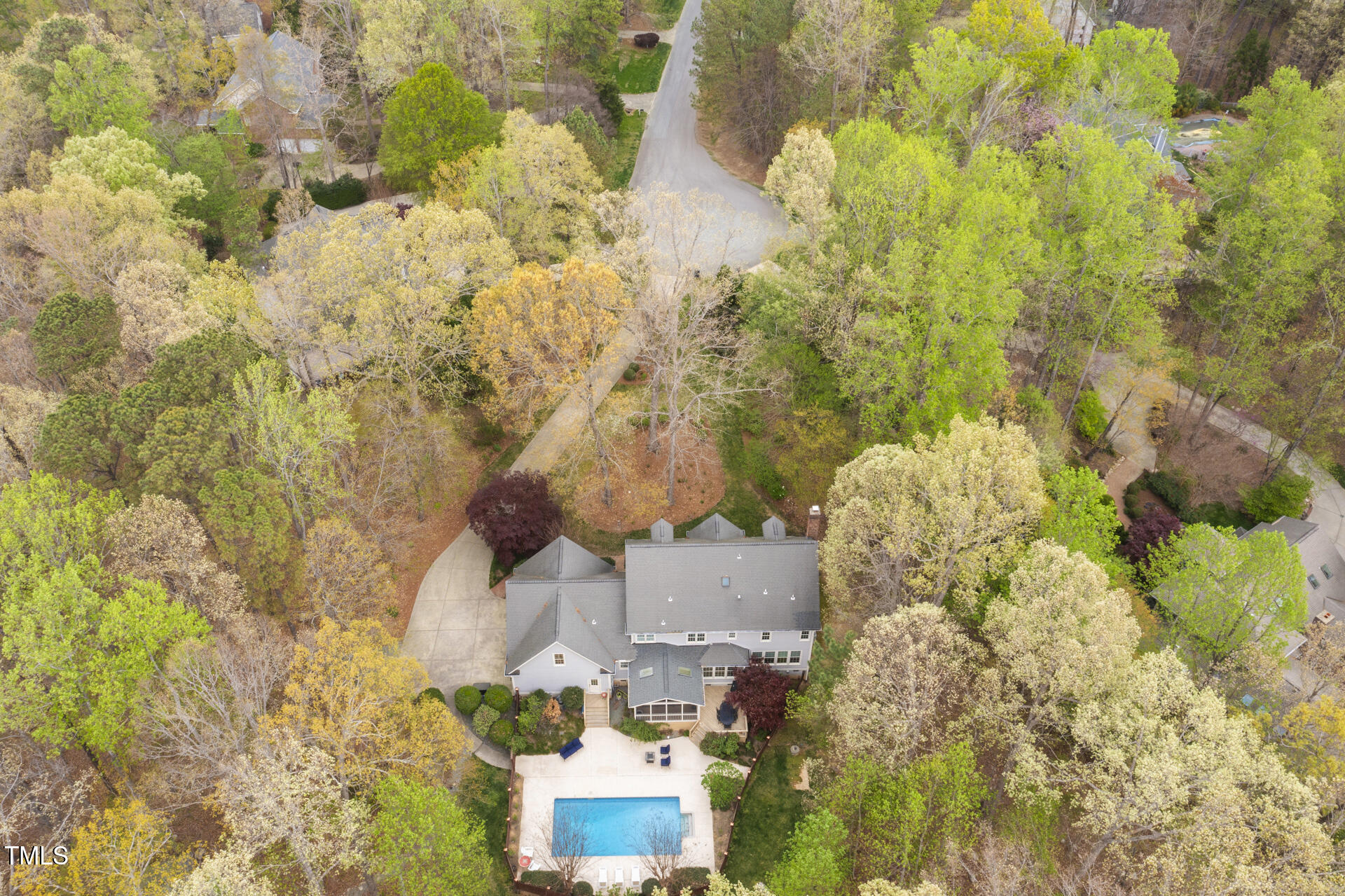 Welcome to this beautifully appointed home that offers both charm and functionality, two miles from the campus and hospital of UNC-Chapel Hill, in an award-winning school district. The main level features a spacious study with a cozy fireplace and French doors, perfect for working or relaxing. The large eat-in kitchen is a chef's dream, with ample storage, a central island for barstools, granite countertops, a gas range, and a convenient bill-paying desk. The inviting family room boasts a wall of windows that frame the picturesque backyard, also accessible through French doors.