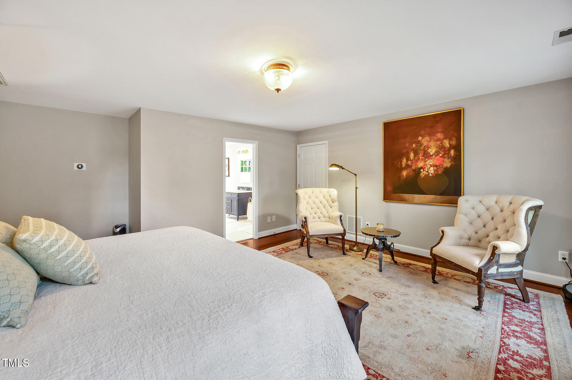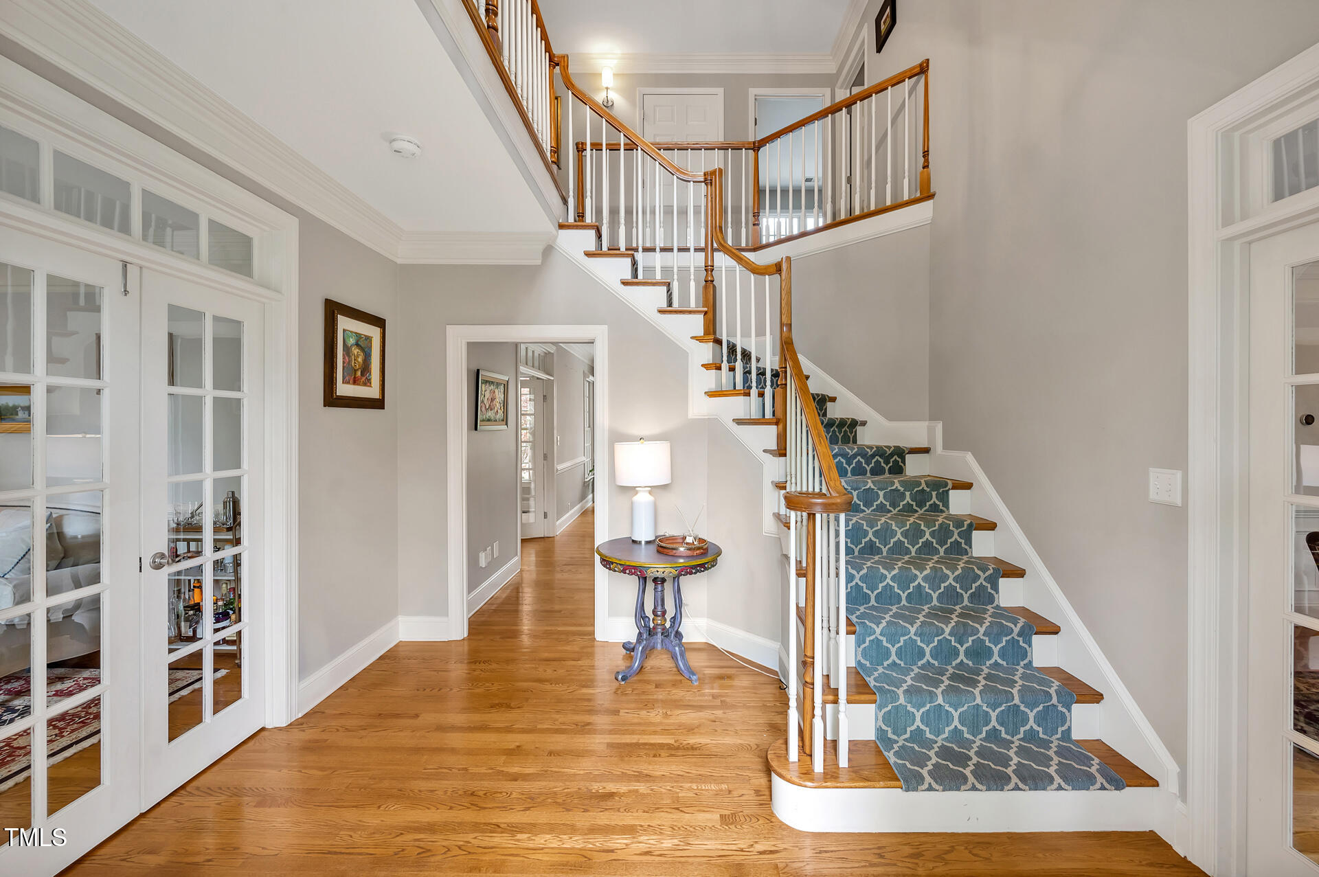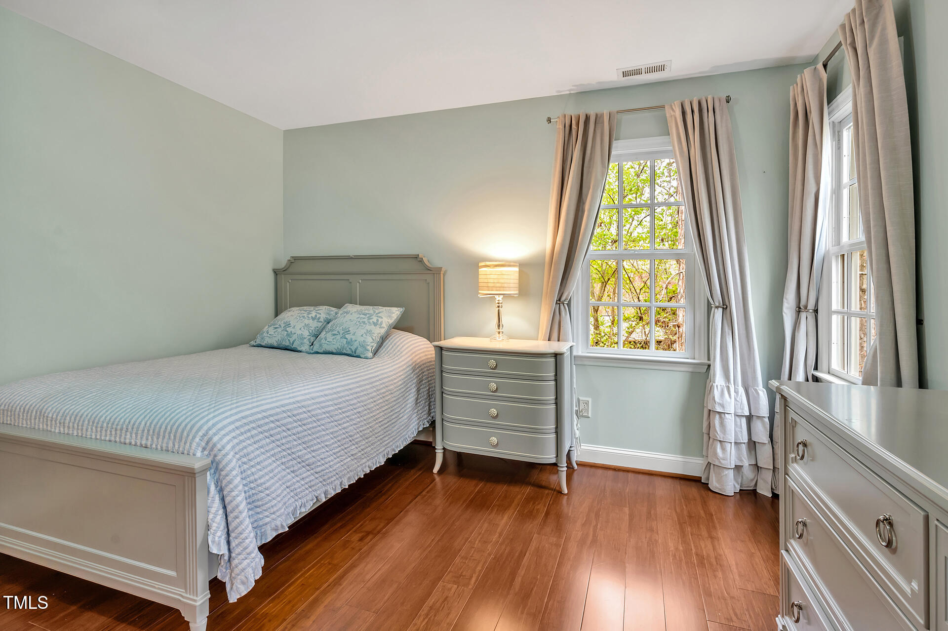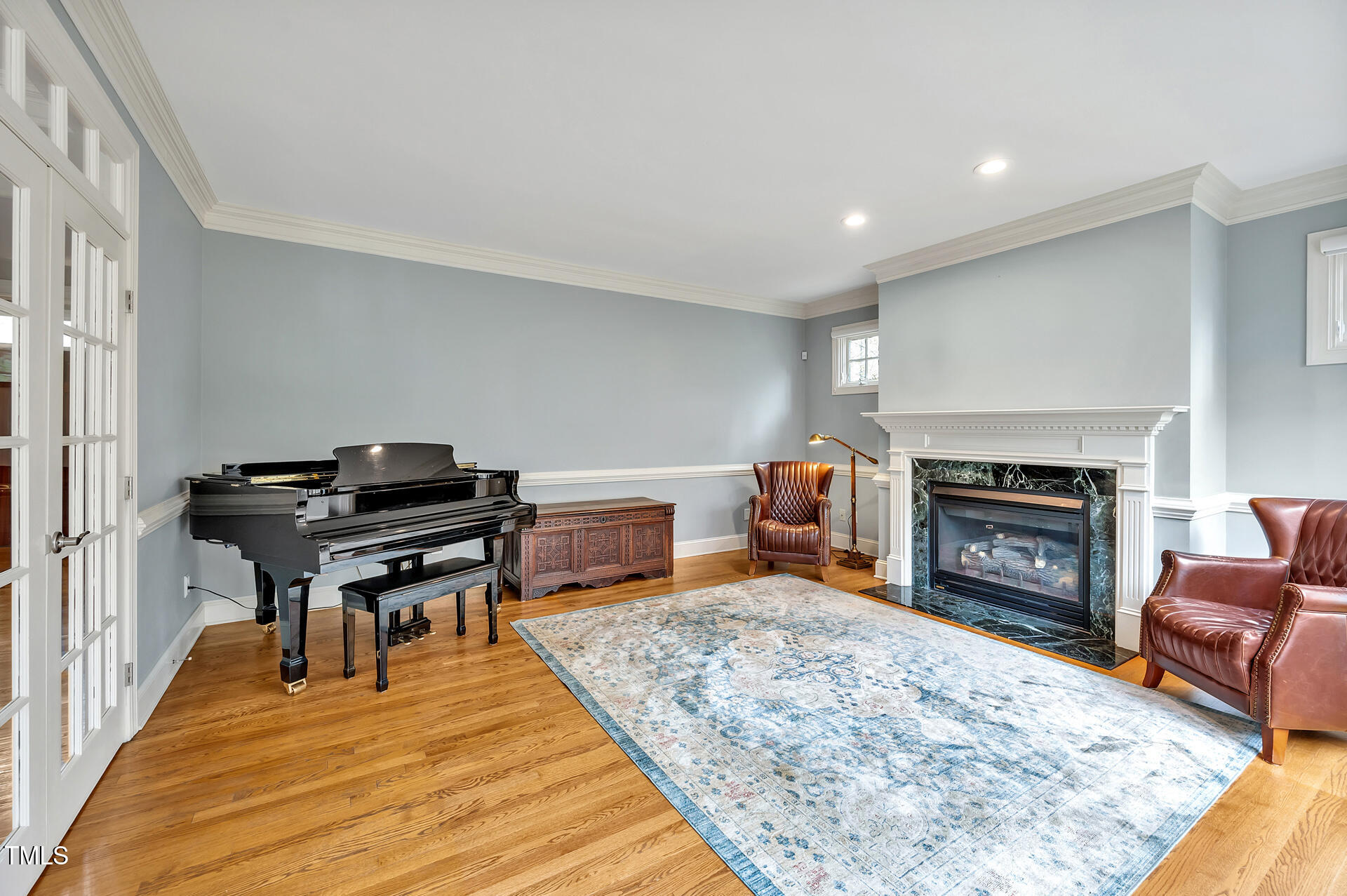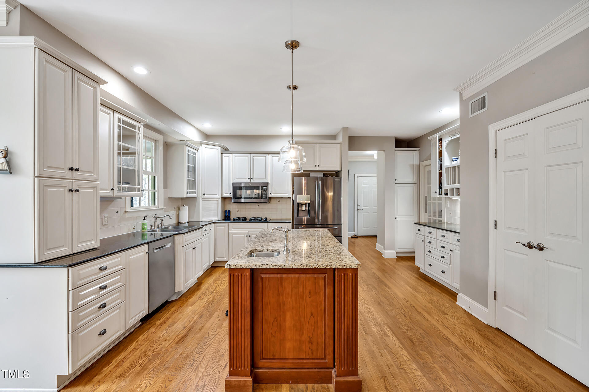 Welcome to this beautifully appointed home that offers both charm and functionality, two miles from the campus and hospital of UNC-Chapel Hill, in an award-winning school district. The main level features a spacious study with a cozy fireplace and French doors, perfect for working or relaxing. The large eat-in kitchen is a chef's dream, with ample storage, a central island for barstools, granite countertops, a gas range, and a convenient bill-paying desk. The inviting family room boasts a wall of windows that frame the picturesque backyard, also accessible through French doors.
