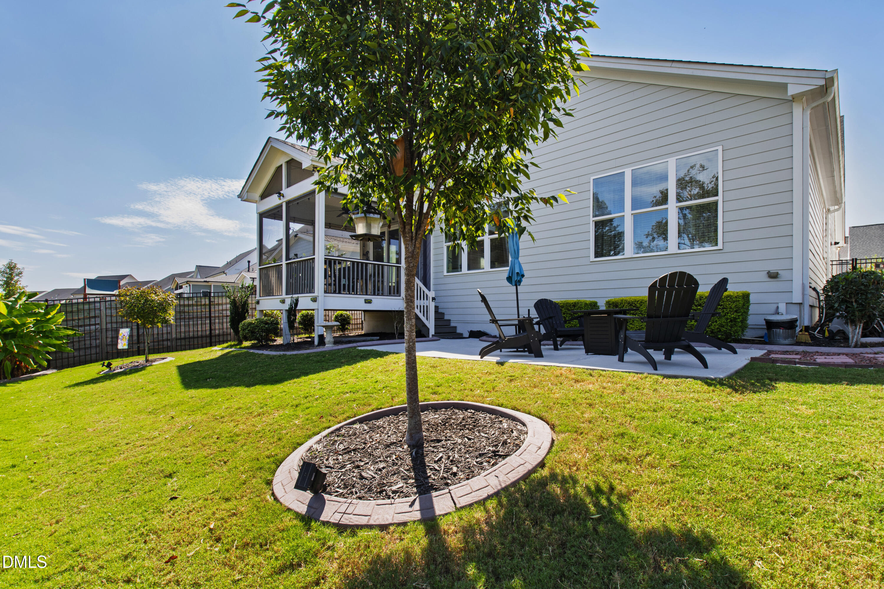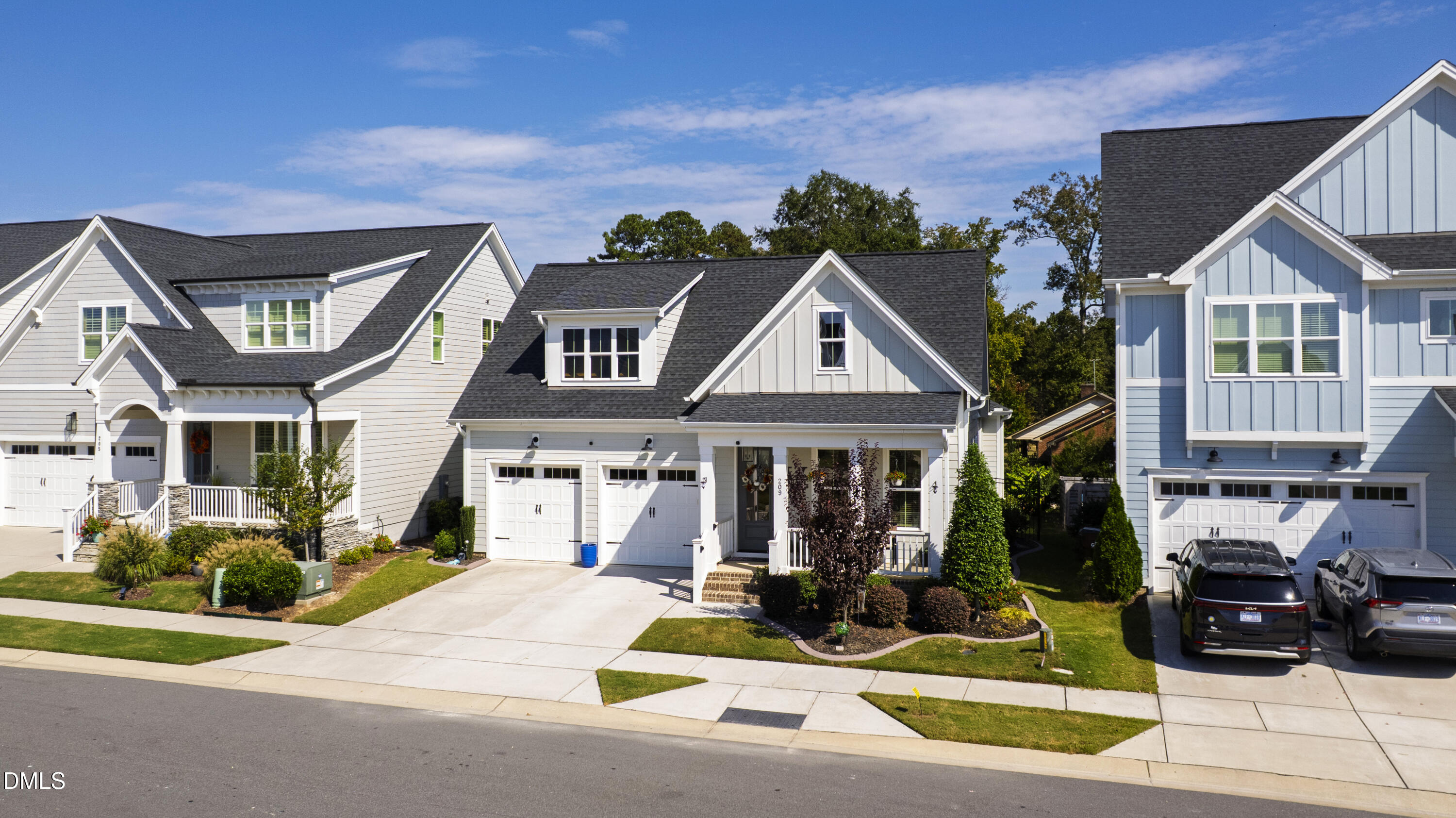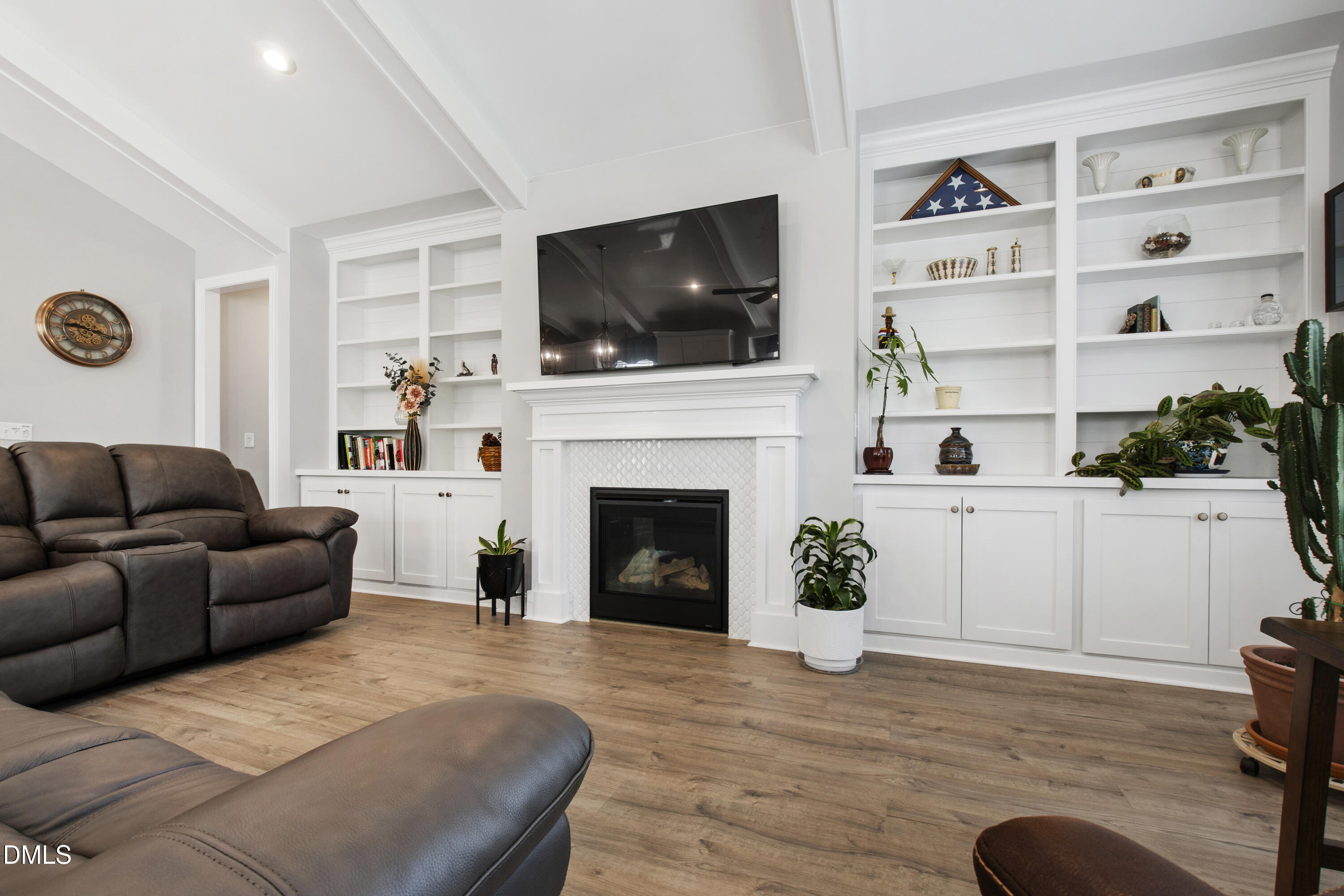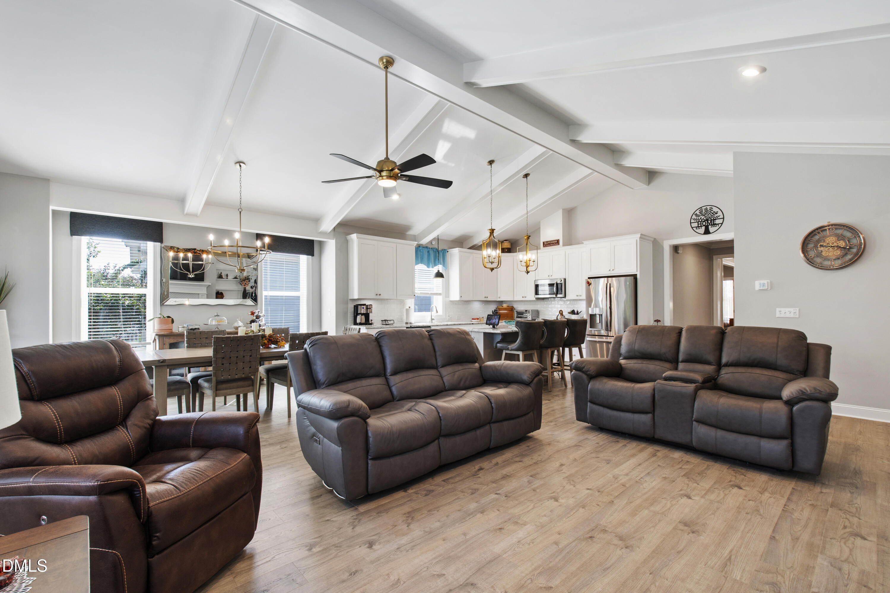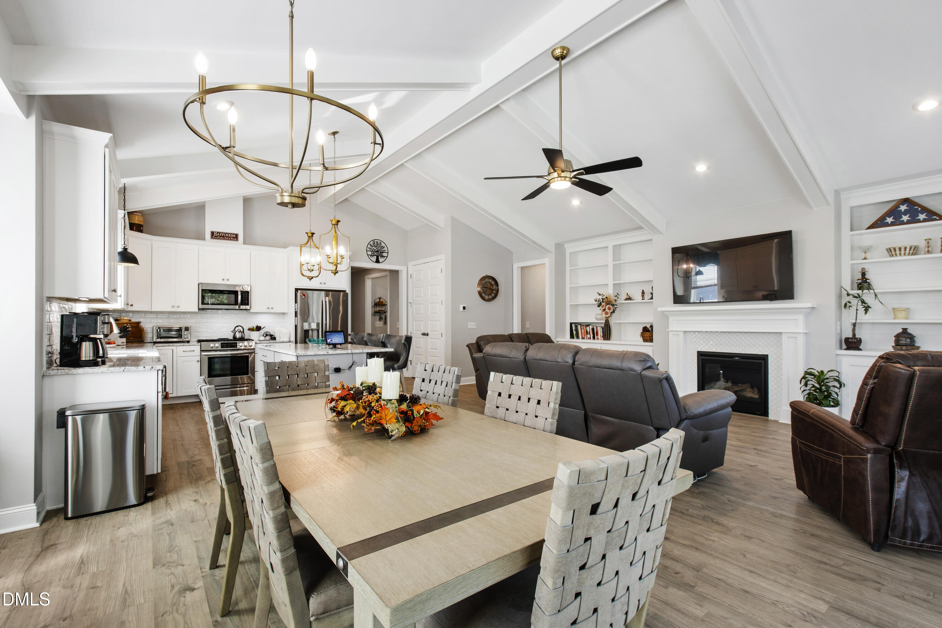 Welcome to a stunningly-crafted, farmhouse inspired rarity in the highly sought-after Wendell Falls community - 209 Tumbling River Drive. Brought to life by the esteemed Homes by Dickerson group and designed with the discerning buyer in mind, this one-level living home, in the form of the desirable Cooper floor plan, is the perfect choice for those seeking comfort, style, and practicality all in one. As you step inside, you'll be greeted by an open and thoughtfully designed layout, where vaulted ceilings with custom trim and beams create an immediate sense of warmth and architectural beauty. The spacious family room encapsulates the heart of the home - anchored in a cozy gas-log fireplace flanked by built-in bookshelves and accentuated by immaculate hardwood floors throughout. The gourmet kitchen is every chef's dream, boasting an abundance of cabinet space with soft-close doors, sleek stainless steel appliances, and a large, delicatus white granite island perfect for gatherings and meal prep. Whether hosting friends at a dinner party or enjoying your very own relaxing evening, the whole space seamlessly blends ease with elevated living, making every meal a delight. Nine-foot ceilings extend throughout the entirety of the home, including the luxurious primary suite and two other generously sized bedrooms, which feature brand-new luxury vinyl plank flooring for a fresh and modern touch. Stepping outside, the exterior is just as impressive as the interior. The property is nestled on a landscaped, tranquil, fenced lot, offering the perfect scene for those looking to soak in the breathtaking North Carolina sunrises and sunsets. Whether you choose to do so from the idyllic screened porch, or from the inviting patio at grass level, either allow the perfect backdrop for outdoor entertaining or quiet reflection. Through its youthful age, this home offers peace of mind with modern features that ensure energy efficiency and low-maintenance living. Other wins include a tankless water heater, an architectural shingle roof, and a sealed conditioned crawlspace, all playing their part in maintaining a comfortable environment year-round. Located just moments from a variety of amenities, this home provides convenient access to fantastic local restaurants, the community pool, scenic trails, and everyday essentials like Publix and Starbucks. With exciting developments on the horizon, Wendell Falls continues to grow as a vibrant, welcoming community. Experience the perfect blend of elegance, functionality, and location with 209 Tumbling River Drive.