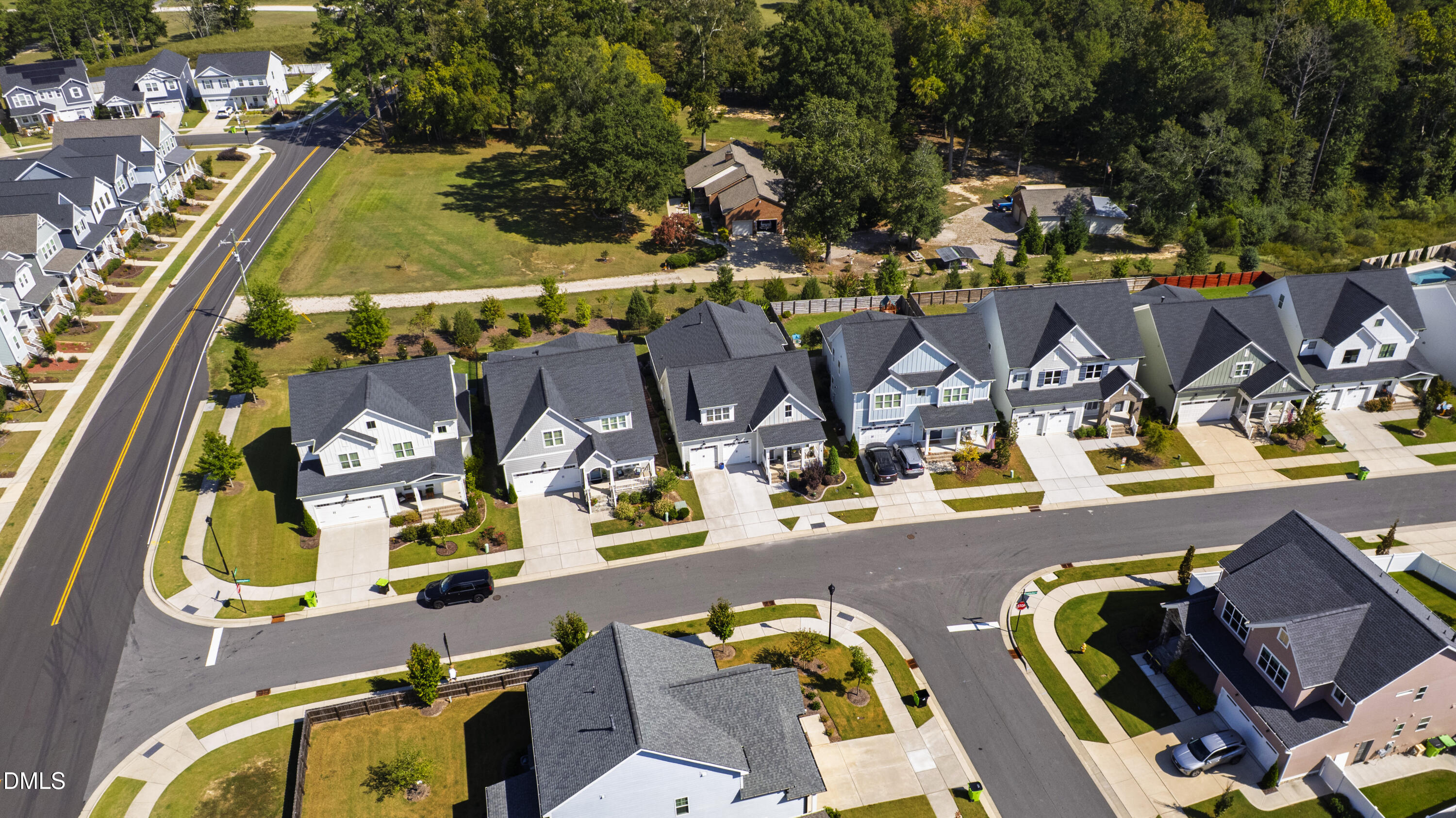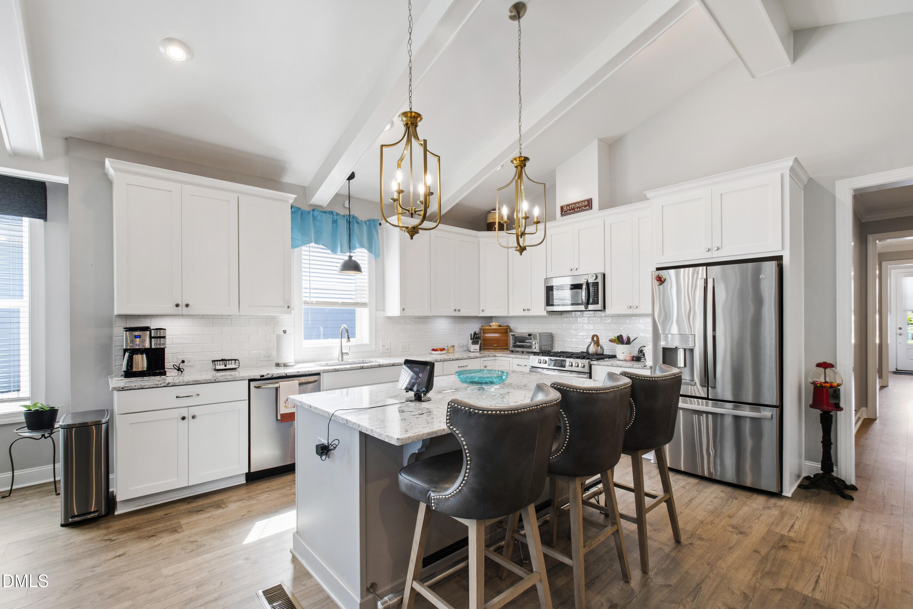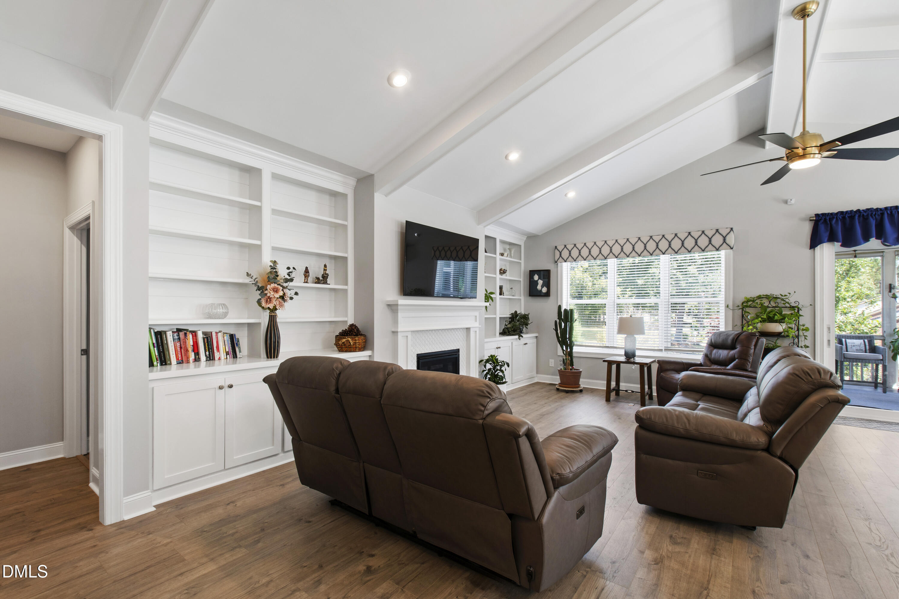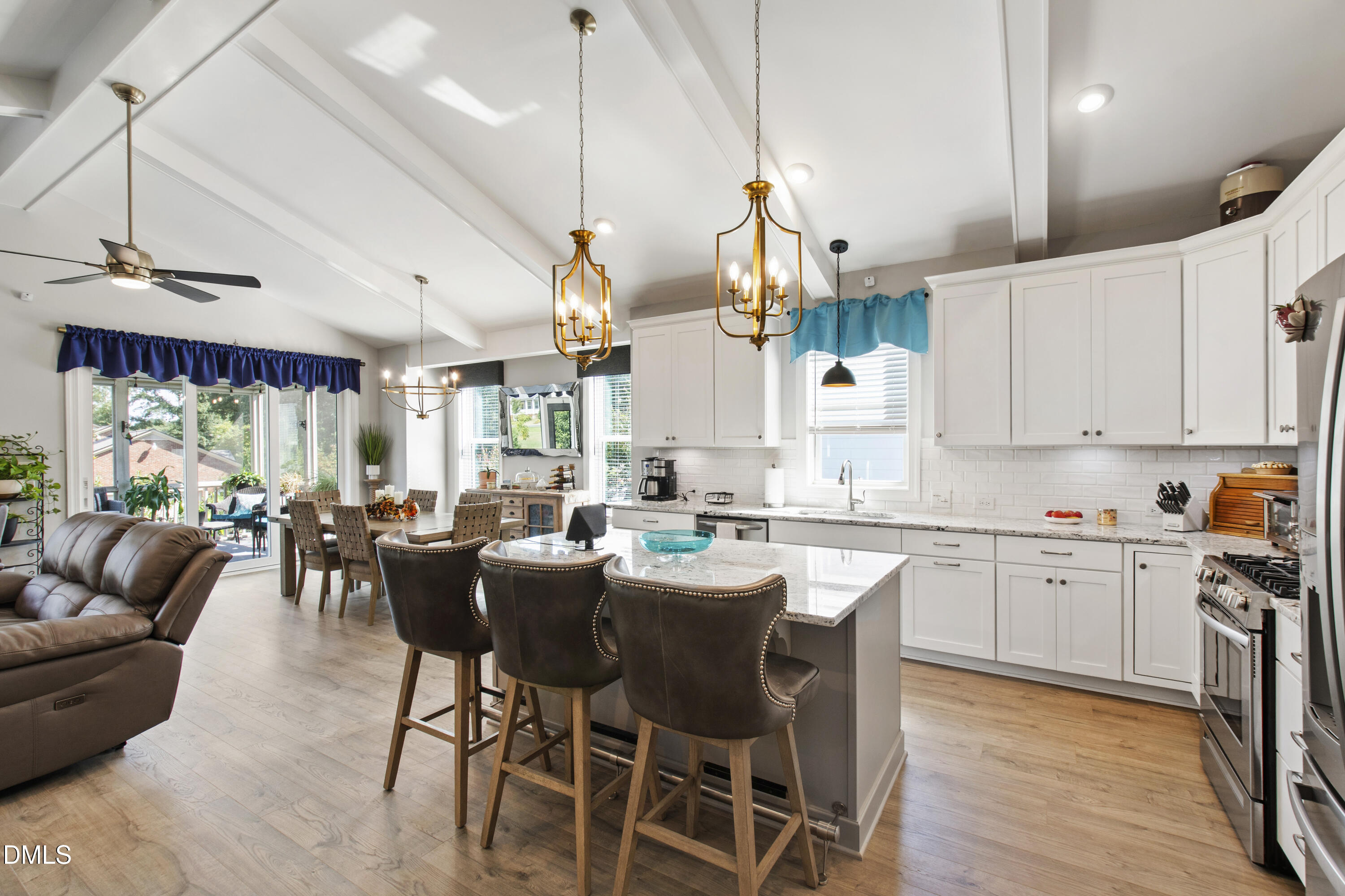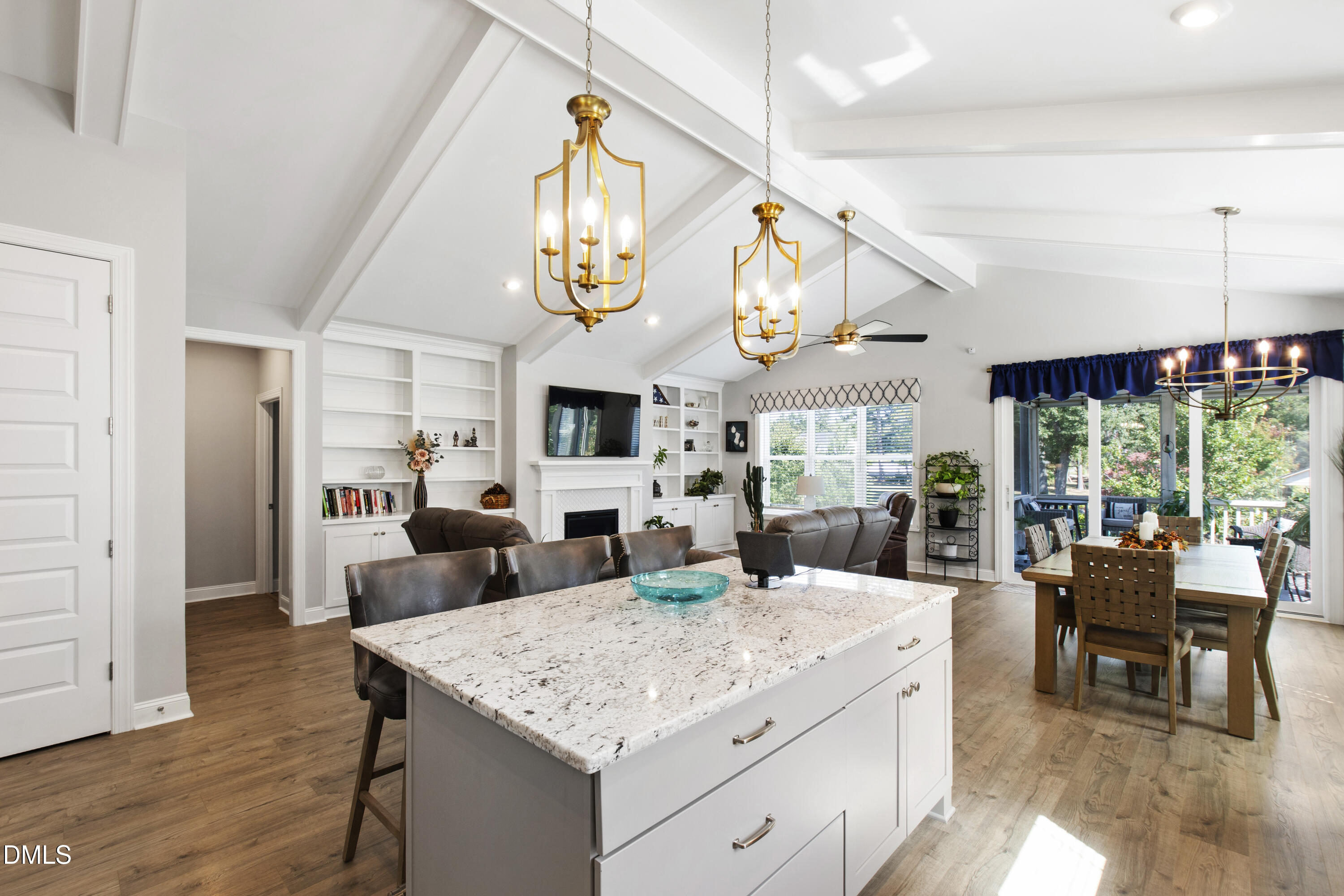 Welcome to a stunningly-crafted, farmhouse inspired rarity in the highly sought-after Wendell Falls community - 209 Tumbling River Drive. Brought to life by the esteemed Homes by Dickerson group and designed with the discerning buyer in mind, this one-level living home, in the form of the desirable Cooper floor plan, is the perfect choice for those seeking comfort, style, and practicality all in one. As you step inside, you'll be greeted by an open and thoughtfully designed layout, where vaulted ceilings with custom trim and beams create an immediate sense of warmth and architectural beauty. The spacious family room encapsulates the heart of the home - anchored in a cozy gas-log fireplace flanked by built-in bookshelves and accentuated by immaculate hardwood floors throughout. The gourmet kitchen is every chef's dream, boasting an abundance of cabinet space with soft-close doors, sleek stainless steel appliances, and a large, delicatus white granite island perfect for gatherings and meal prep. Whether hosting friends at a dinner party or enjoying your very own relaxing evening, the whole space seamlessly blends ease with elevated living, making every meal a delight. Nine-foot ceilings extend throughout the entirety of the home, including the luxurious primary suite and two other generously sized bedrooms, which feature brand-new luxury vinyl plank flooring for a fresh and modern touch. Stepping outside, the exterior is just as impressive as the interior. The property is nestled on a landscaped, tranquil, fenced lot, offering the perfect scene for those looking to soak in the breathtaking North Carolina sunrises and sunsets. Whether you choose to do so from the idyllic screened porch, or from the inviting patio at grass level, either allow the perfect backdrop for outdoor entertaining or quiet reflection. Through its youthful age, this home offers peace of mind with modern features that ensure energy efficiency and low-maintenance living. Other wins include a tankless water heater, an architectural shingle roof, and a sealed conditioned crawlspace, all playing their part in maintaining a comfortable environment year-round. Located just moments from a variety of amenities, this home provides convenient access to fantastic local restaurants, the community pool, scenic trails, and everyday essentials like Publix and Starbucks. With exciting developments on the horizon, Wendell Falls continues to grow as a vibrant, welcoming community. Experience the perfect blend of elegance, functionality, and location with 209 Tumbling River Drive.