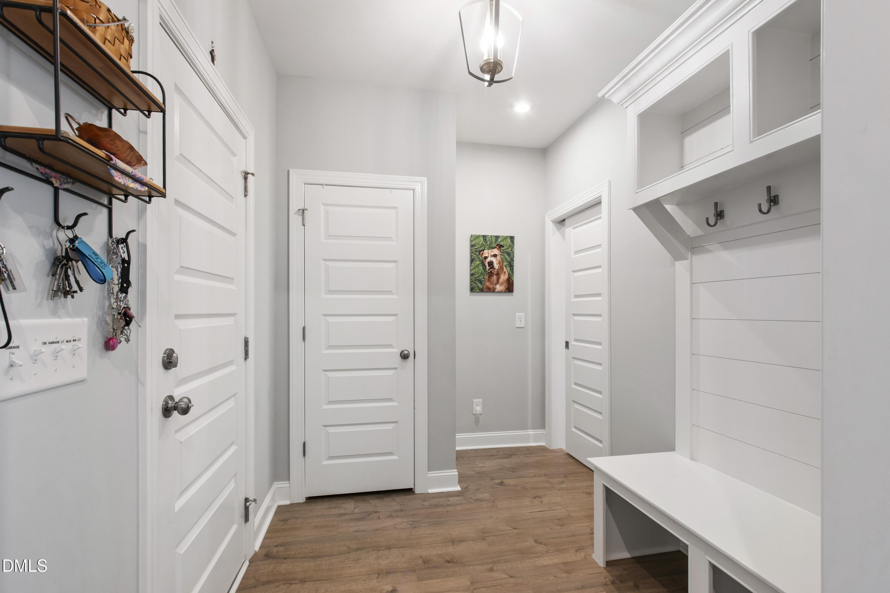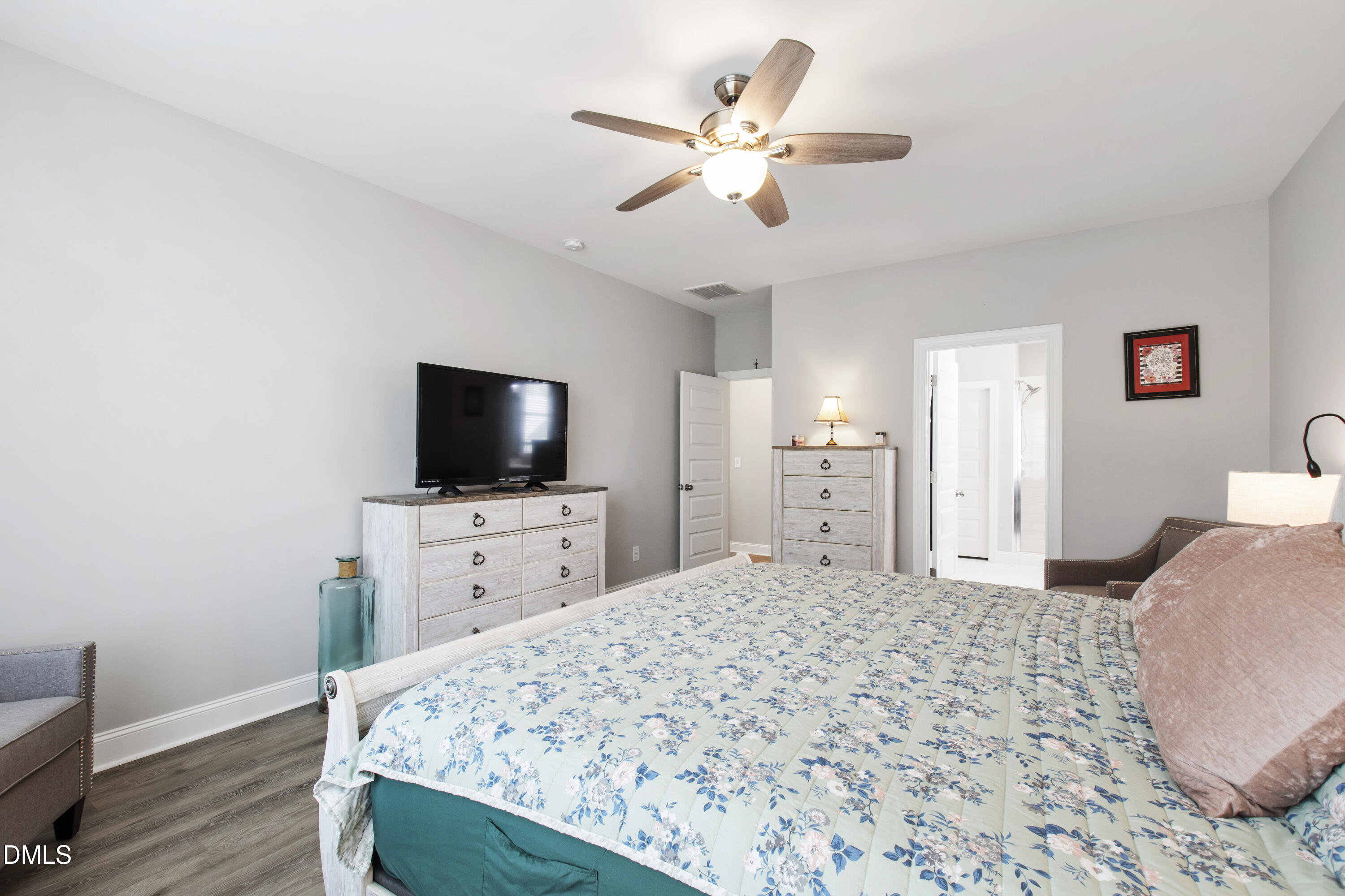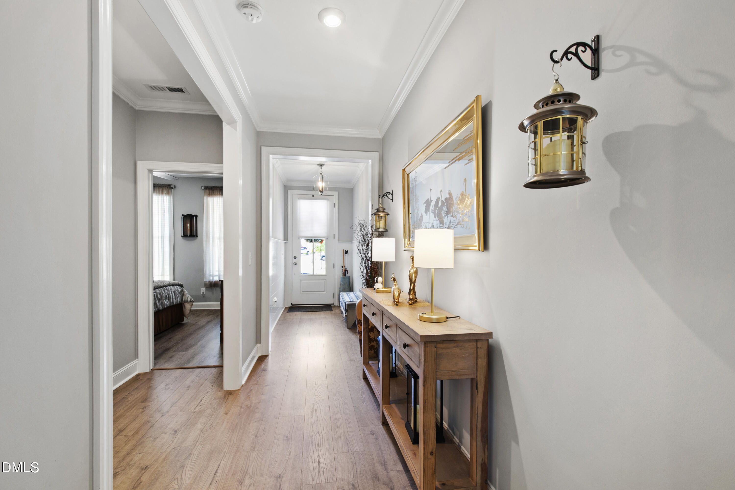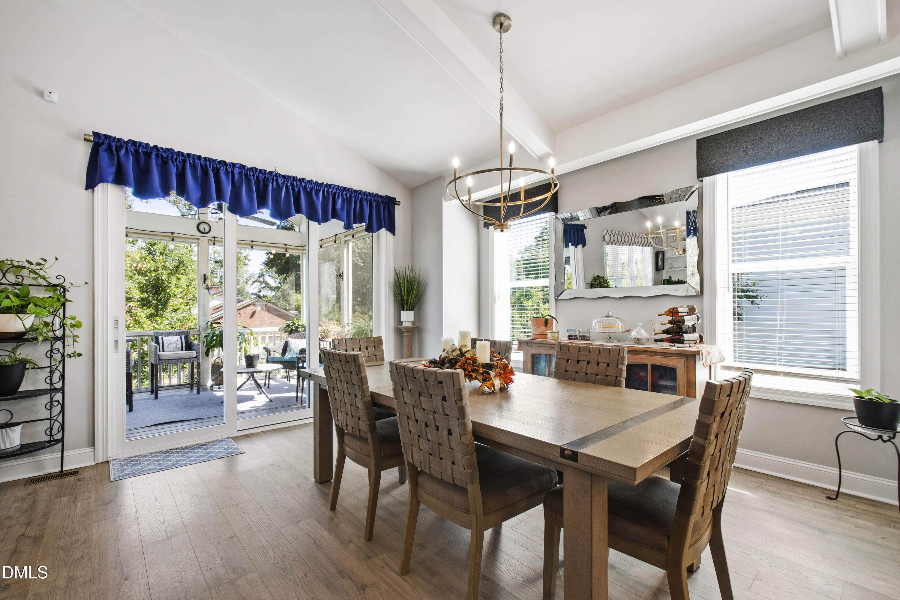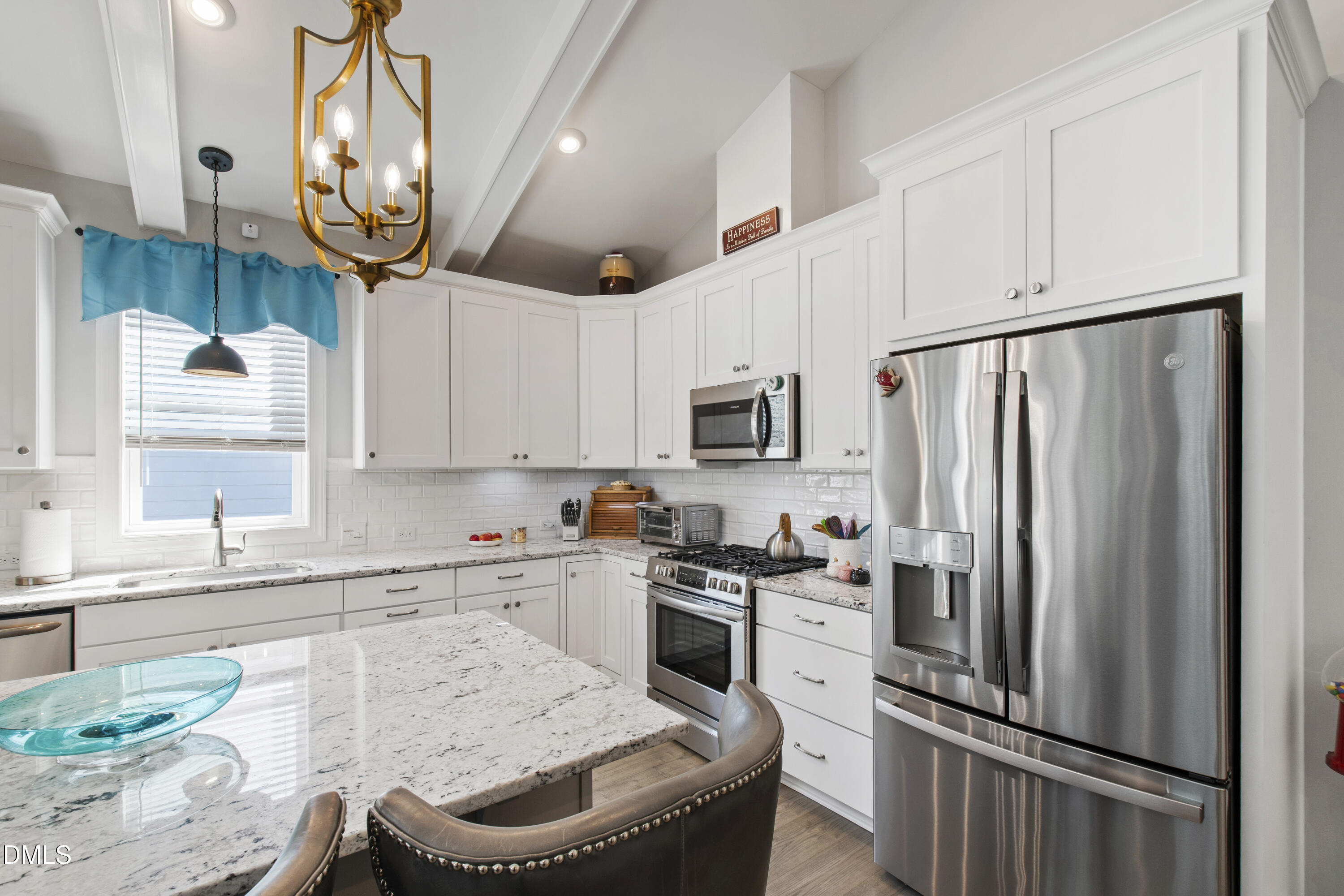 Welcome to a stunningly-crafted, farmhouse inspired rarity in the highly sought-after Wendell Falls community - 209 Tumbling River Drive. Brought to life by the esteemed Homes by Dickerson group and designed with the discerning buyer in mind, this one-level living home, in the form of the desirable Cooper floor plan, is the perfect choice for those seeking comfort, style, and practicality all in one. As you step inside, you'll be greeted by an open and thoughtfully designed layout, where vaulted ceilings with custom trim and beams create an immediate sense of warmth and architectural beauty. The spacious family room encapsulates the heart of the home - anchored in a cozy gas-log fireplace flanked by built-in bookshelves and accentuated by immaculate hardwood floors throughout. The gourmet kitchen is every chef's dream, boasting an abundance of cabinet space with soft-close doors, sleek stainless steel appliances, and a large, delicatus white granite island perfect for gatherings and meal prep. Whether hosting friends at a dinner party or enjoying your very own relaxing evening, the whole space seamlessly blends ease with elevated living, making every meal a delight. Nine-foot ceilings extend throughout the entirety of the home, including the luxurious primary suite and two other generously sized bedrooms, which feature brand-new luxury vinyl plank flooring for a fresh and modern touch. Stepping outside, the exterior is just as impressive as the interior. The property is nestled on a landscaped, tranquil, fenced lot, offering the perfect scene for those looking to soak in the breathtaking North Carolina sunrises and sunsets. Whether you choose to do so from the idyllic screened porch, or from the inviting patio at grass level, either allow the perfect backdrop for outdoor entertaining or quiet reflection. Through its youthful age, this home offers peace of mind with modern features that ensure energy efficiency and low-maintenance living. Other wins include a tankless water heater, an architectural shingle roof, and a sealed conditioned crawlspace, all playing their part in maintaining a comfortable environment year-round. Located just moments from a variety of amenities, this home provides convenient access to fantastic local restaurants, the community pool, scenic trails, and everyday essentials like Publix and Starbucks. With exciting developments on the horizon, Wendell Falls continues to grow as a vibrant, welcoming community. Experience the perfect blend of elegance, functionality, and location with 209 Tumbling River Drive.