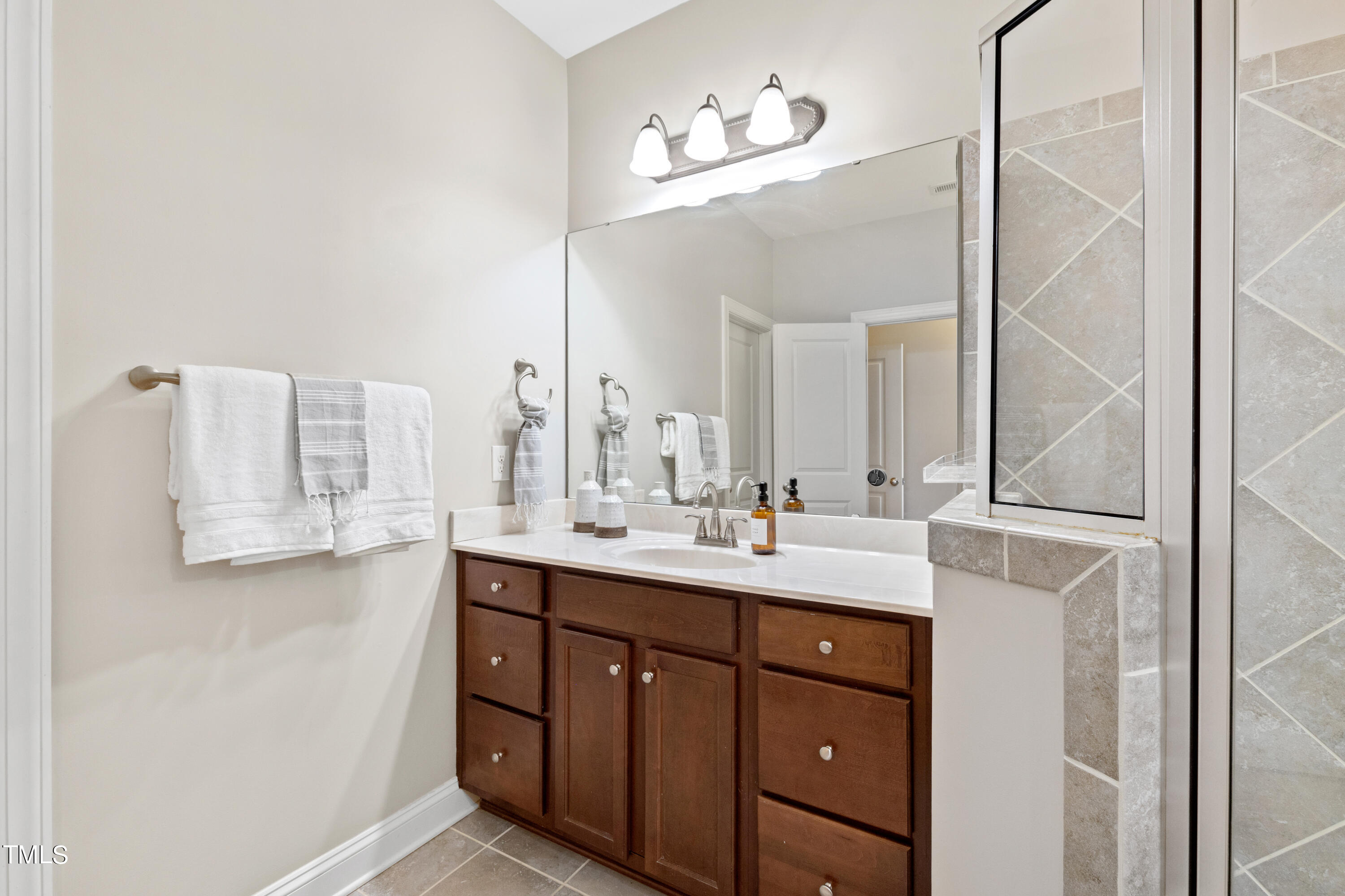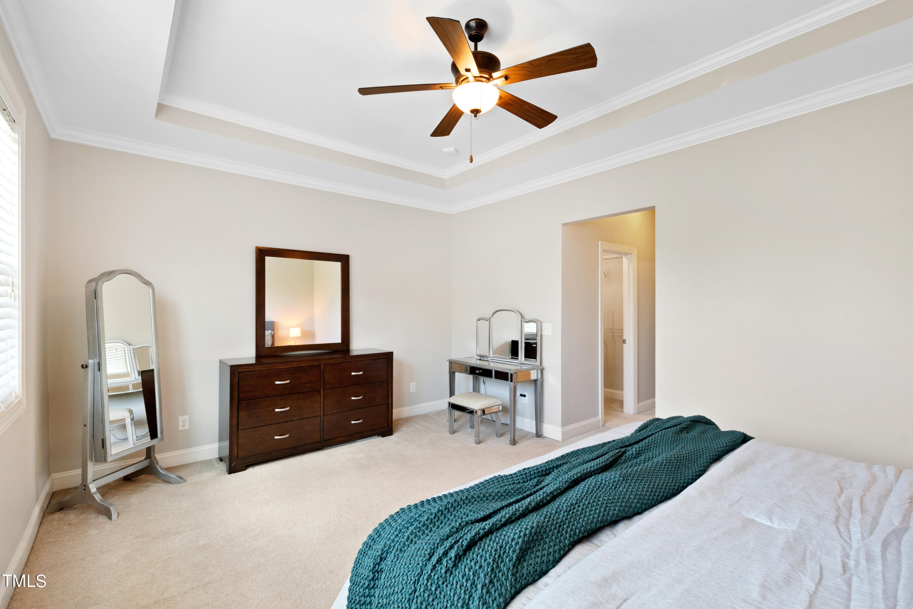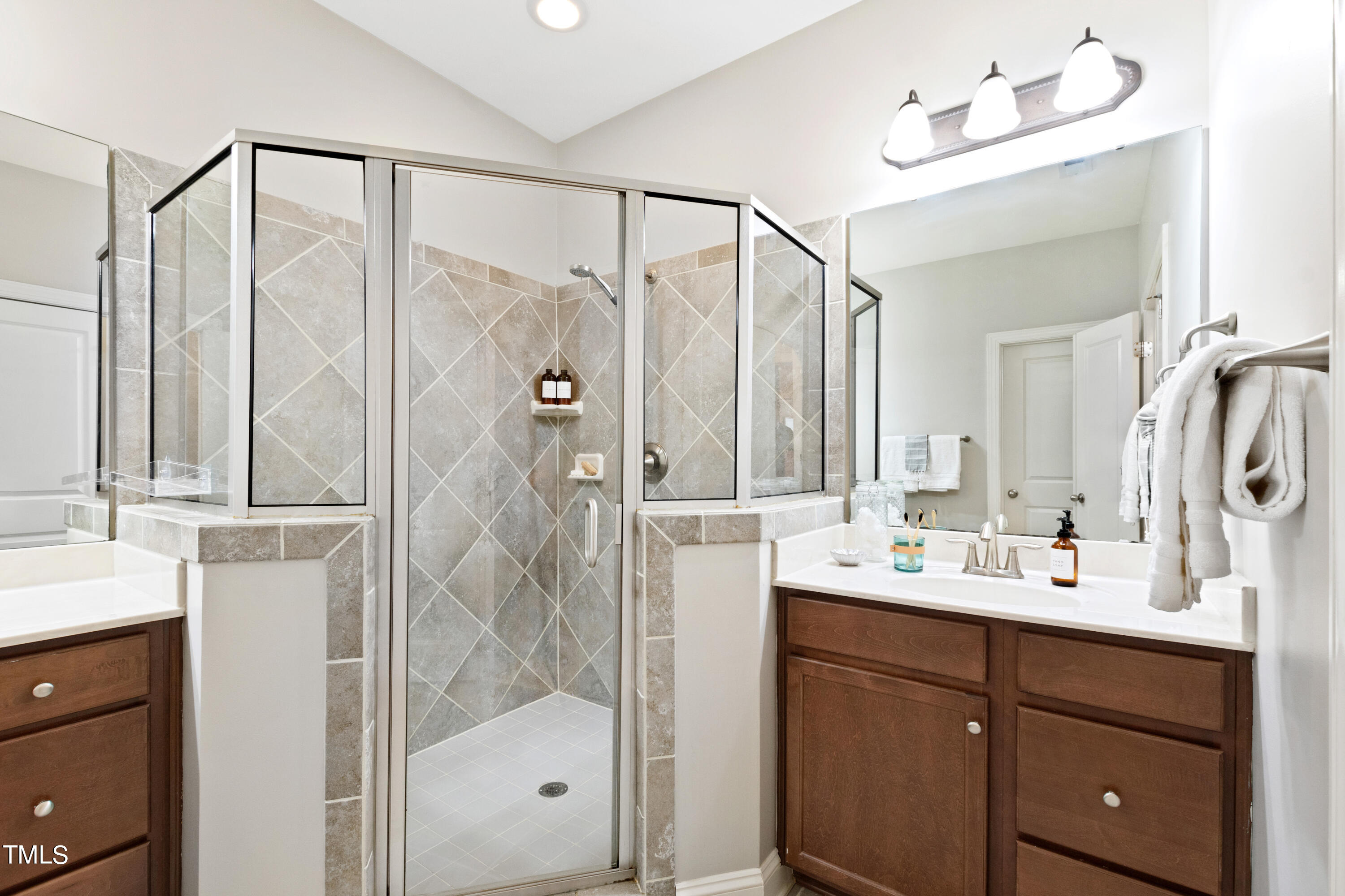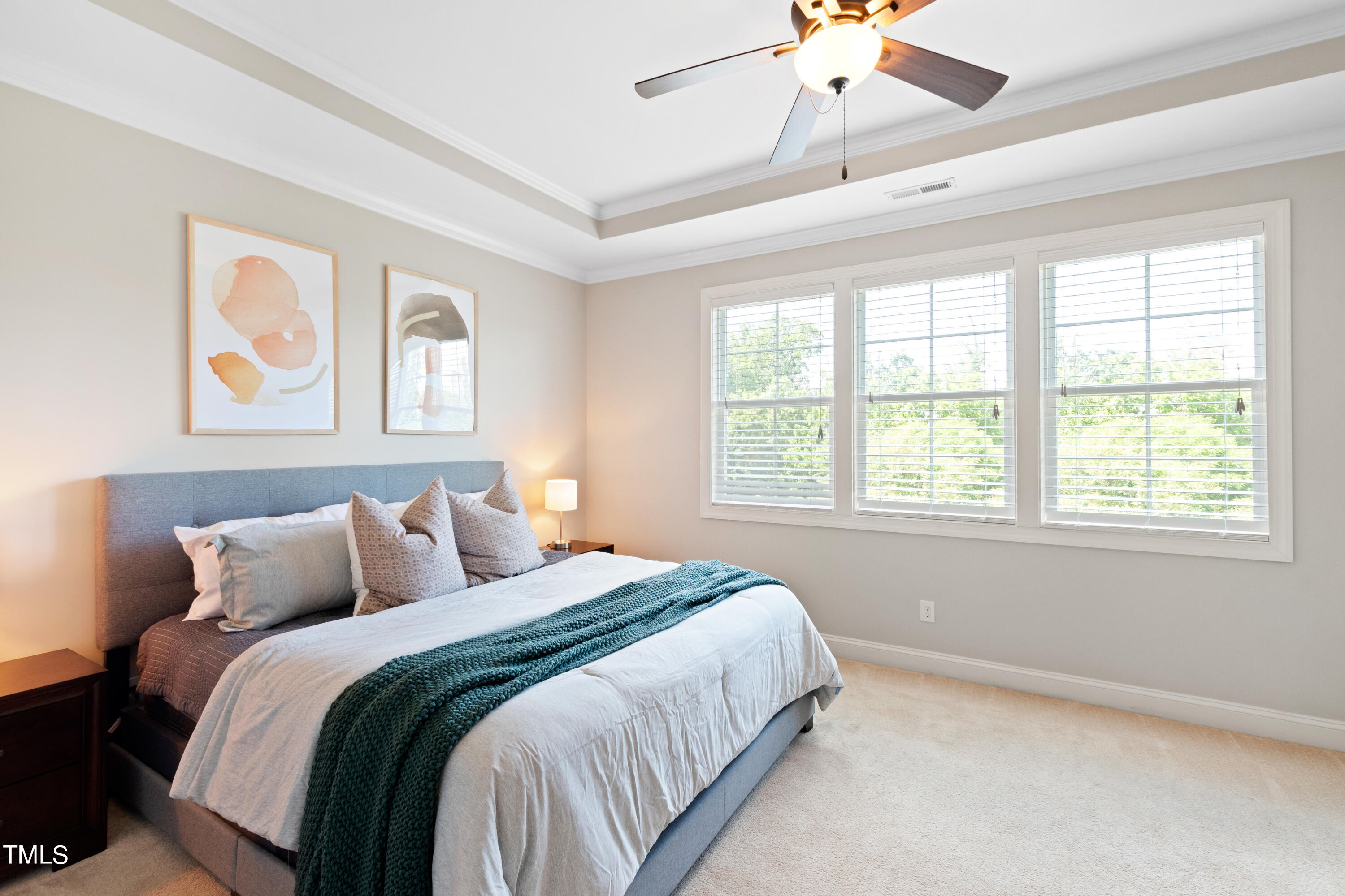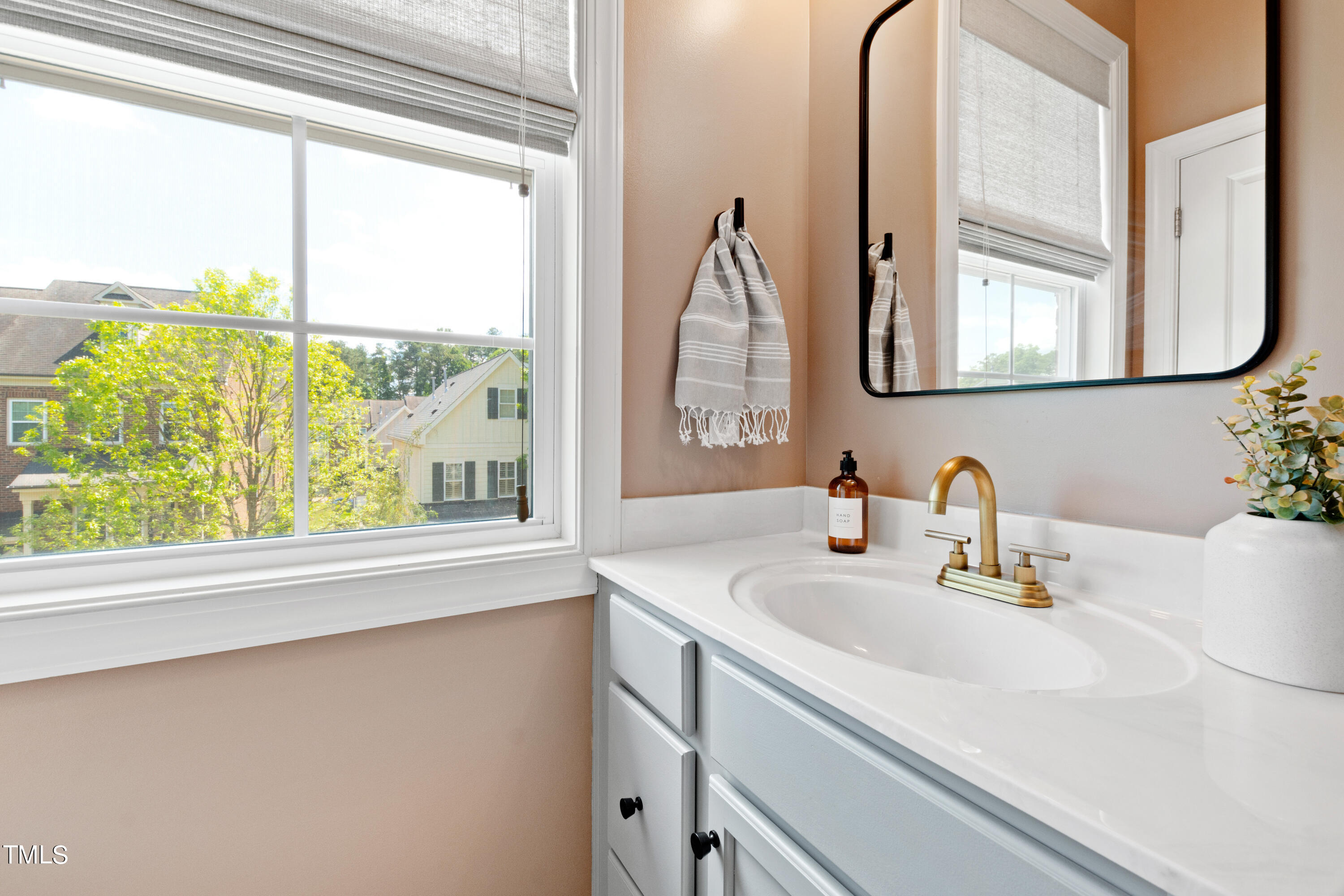 Upstairs, you'll find two tranquil bedrooms and a laundry room. The primary bedroom offers a tray ceiling and a wall of windows that flood the room with natural light and provide stunning views of the North Hills skyline. The primary bathroom includes a walk-in shower and dual sinks with ample counter space. The second bedroom across the hall features a full ensuite and a walk-in closet.