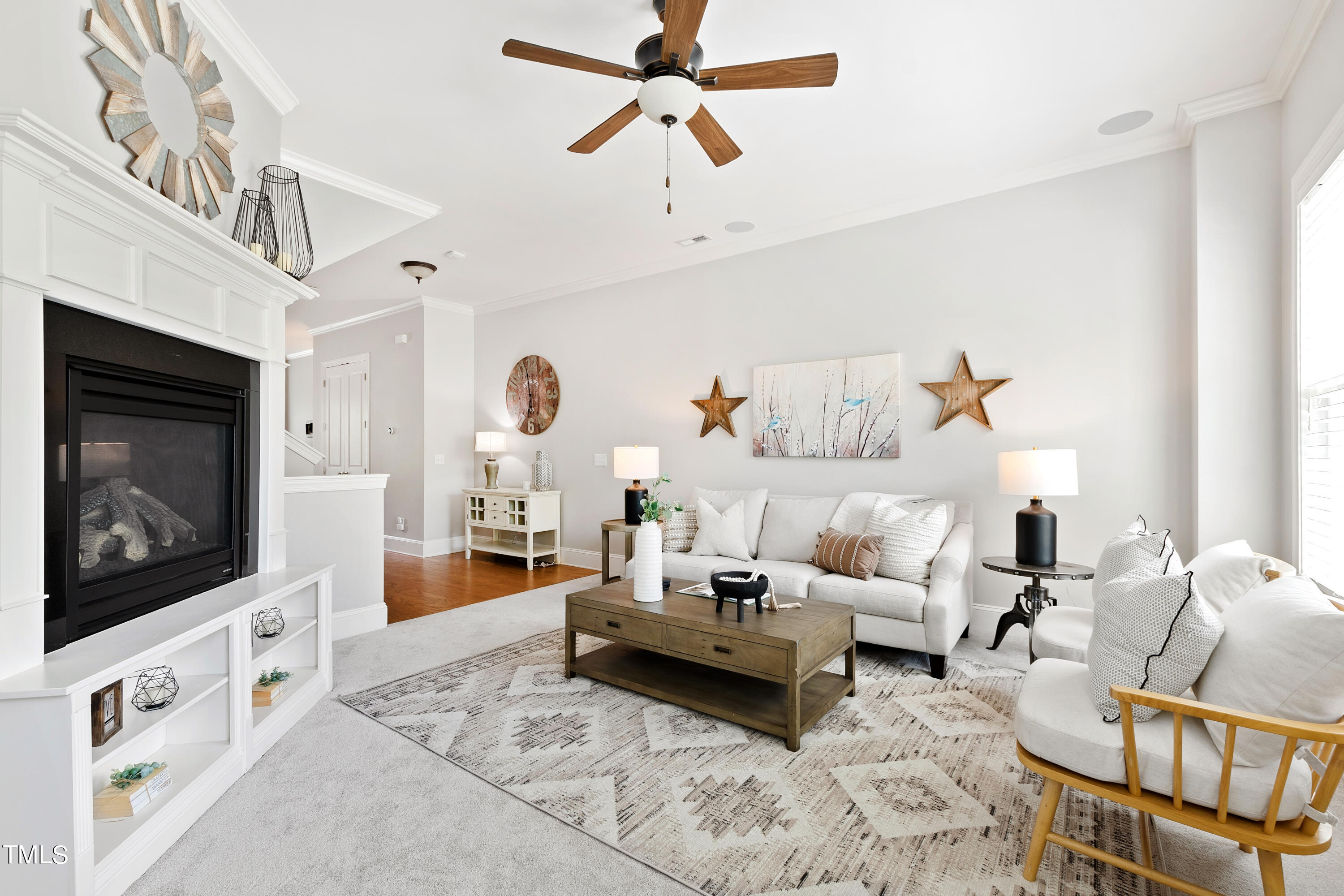 The main floor boasts an open layout with a spacious living room, complete with a gas fireplace and built-in speakers. The gourmet kitchen features custom wood cabinets, a large island, and plenty of counter space, along with an adjoining dining nook and a covered patio for additional entertaining space.