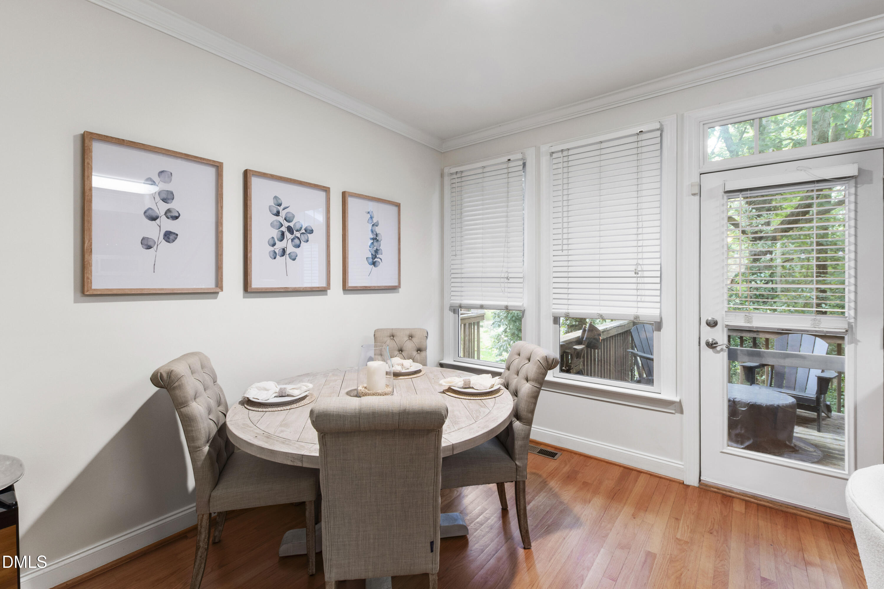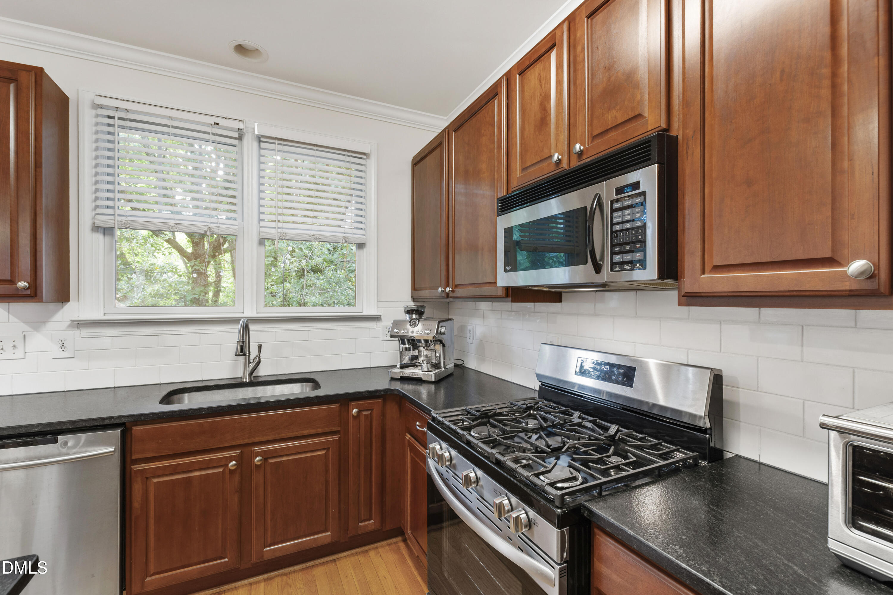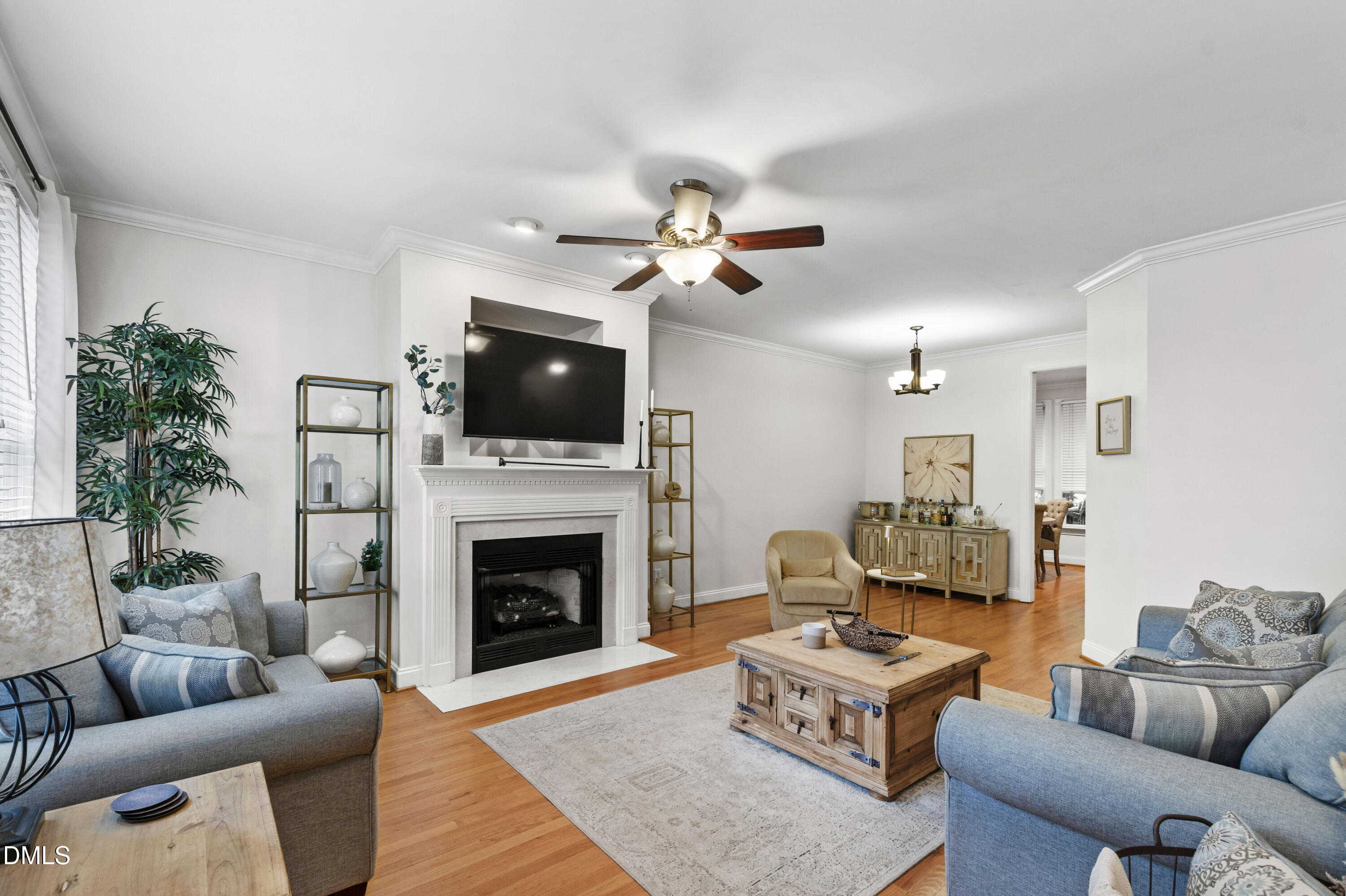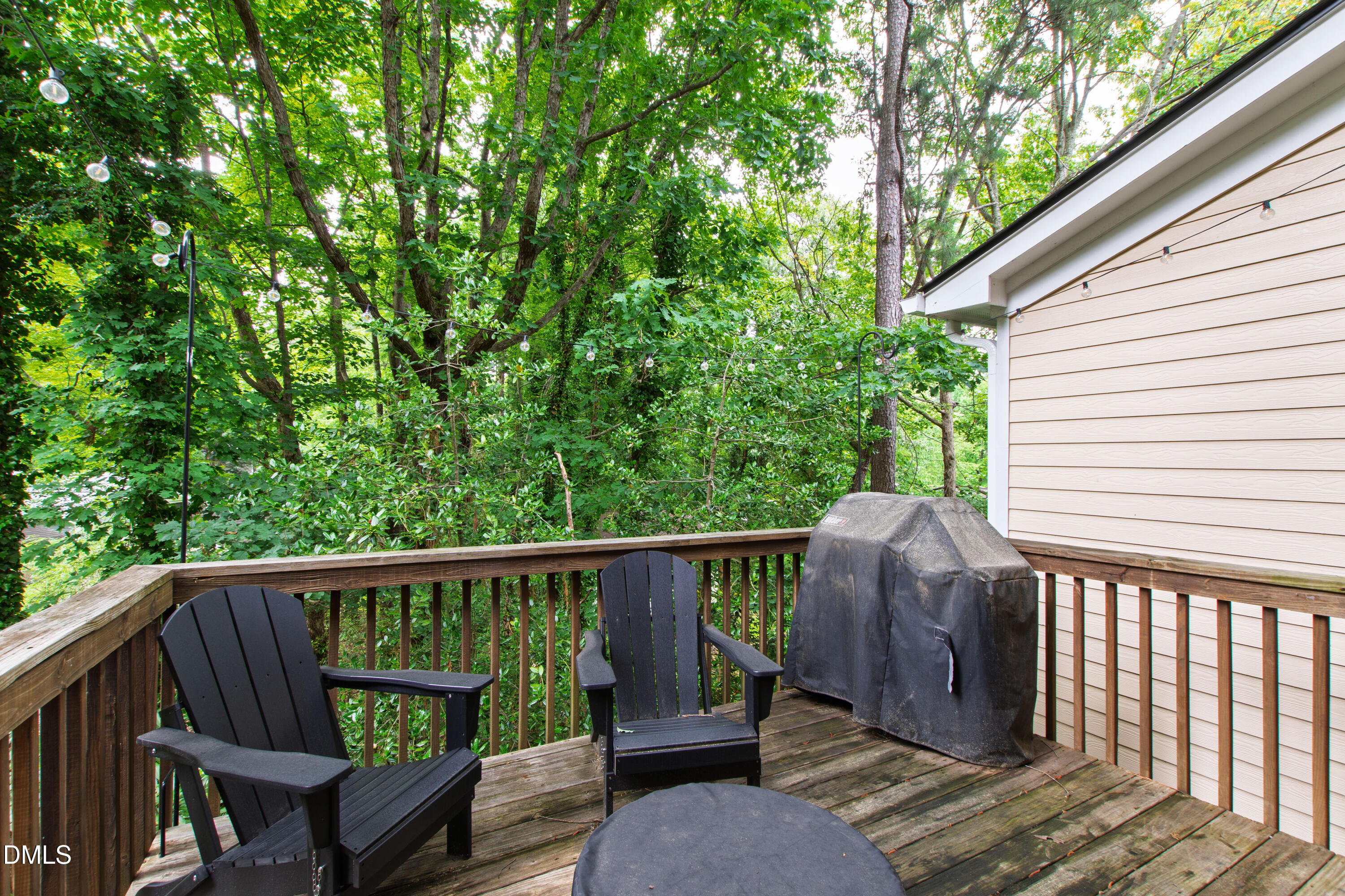 This immaculate townhome offers low-maintenance living just minutes from the shops, dining, and entertainment of North Hills and Midtown. Sunlight fills the main level, where hardwood floors run throughout the open-concept living and dining area, complete with a cozy gas fireplace.The updated eat-in kitchen features granite countertops, modern appliances, and opens to a private deck overlooking a wooded setting. Upstairs, you'll find two spacious ensuite bedrooms with walk-in closets, while the finished basement offers a versatile third bedroom, bonus room, or flex space with its own full bath and access to a covered patio. Contact agent, Abbey Williams, for a showing or questions 919.920.0847. Two marked parking spaces plus guest parking available. Pets negotiable. Kitchen table and chairs and couches in living room can stay if desired.