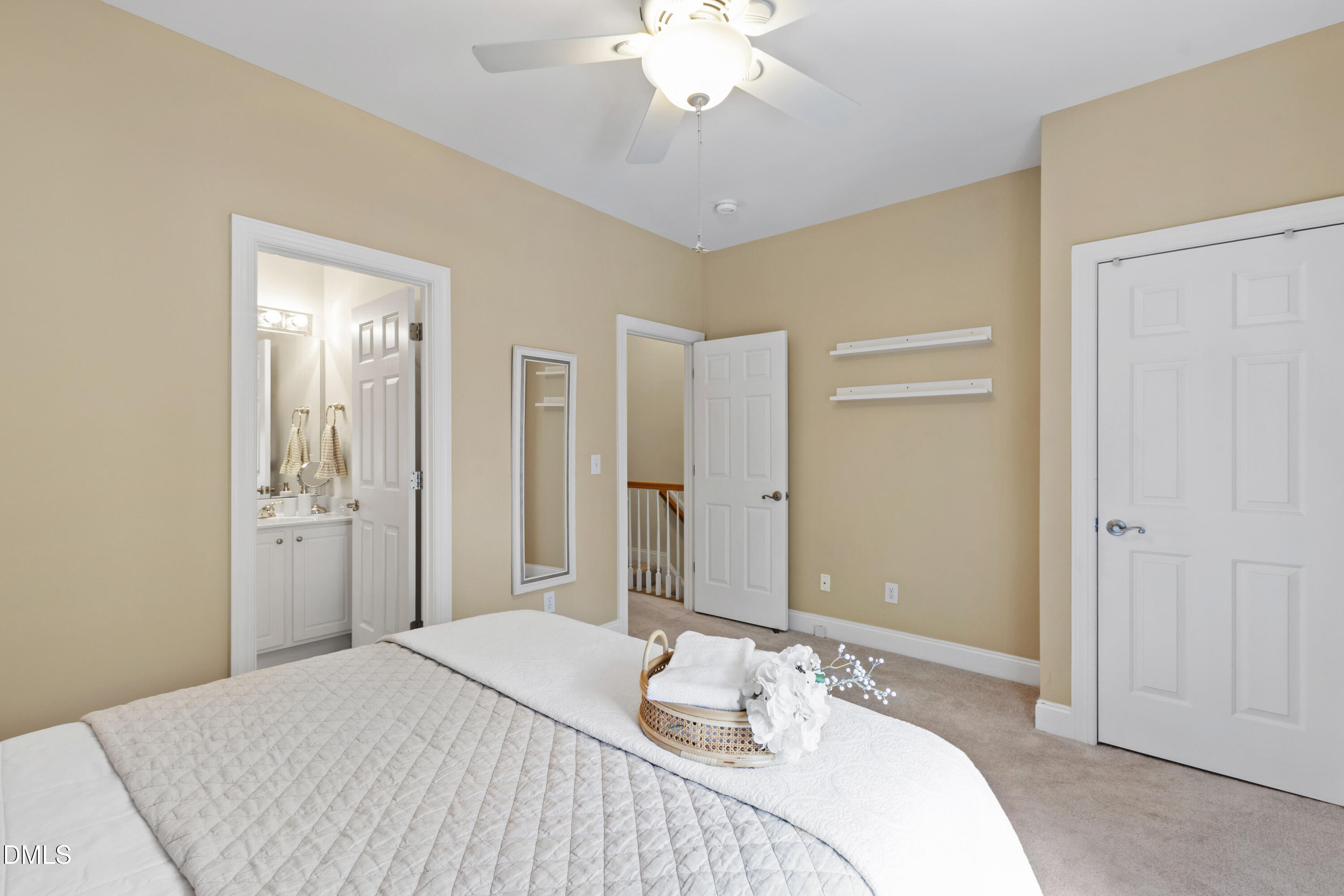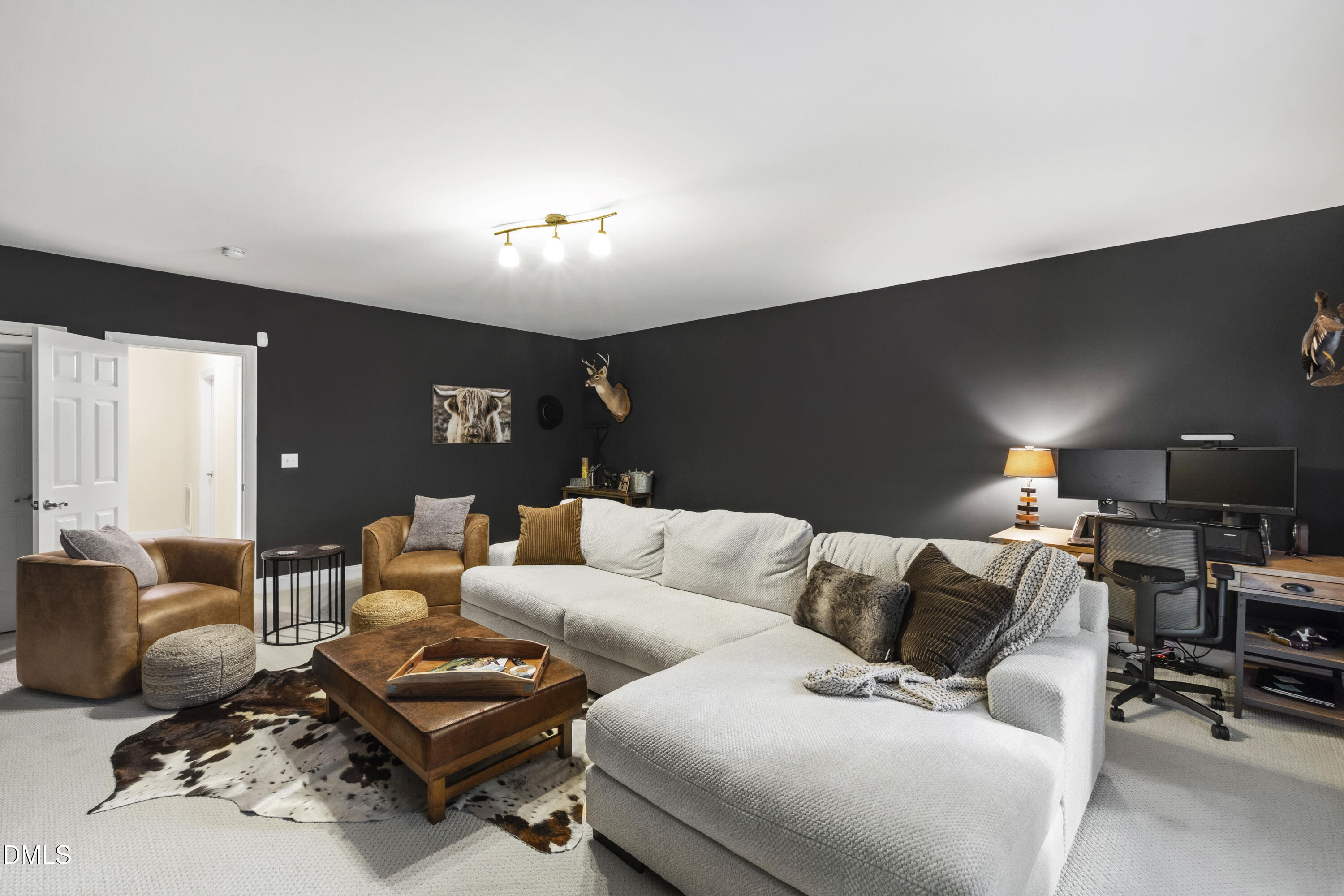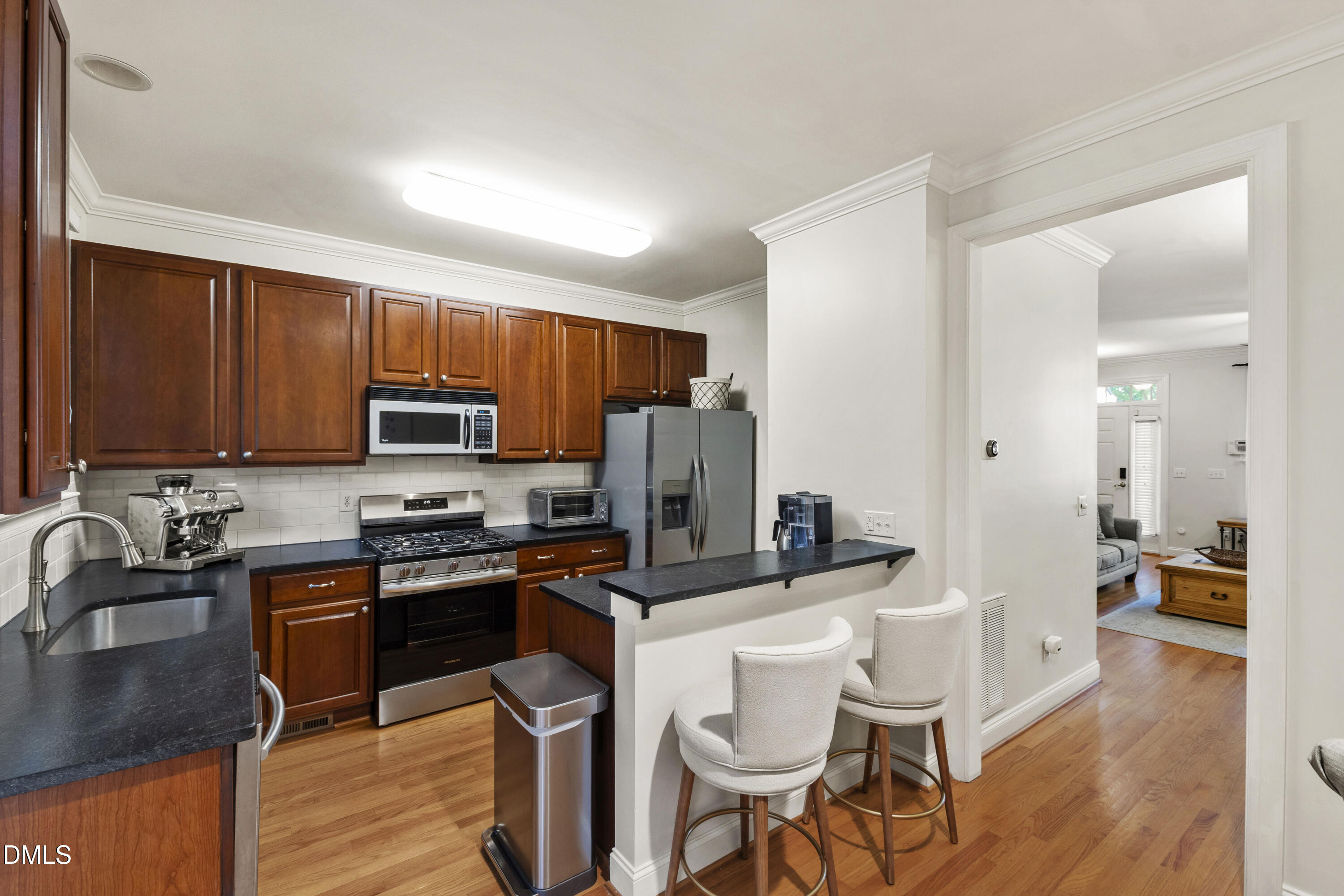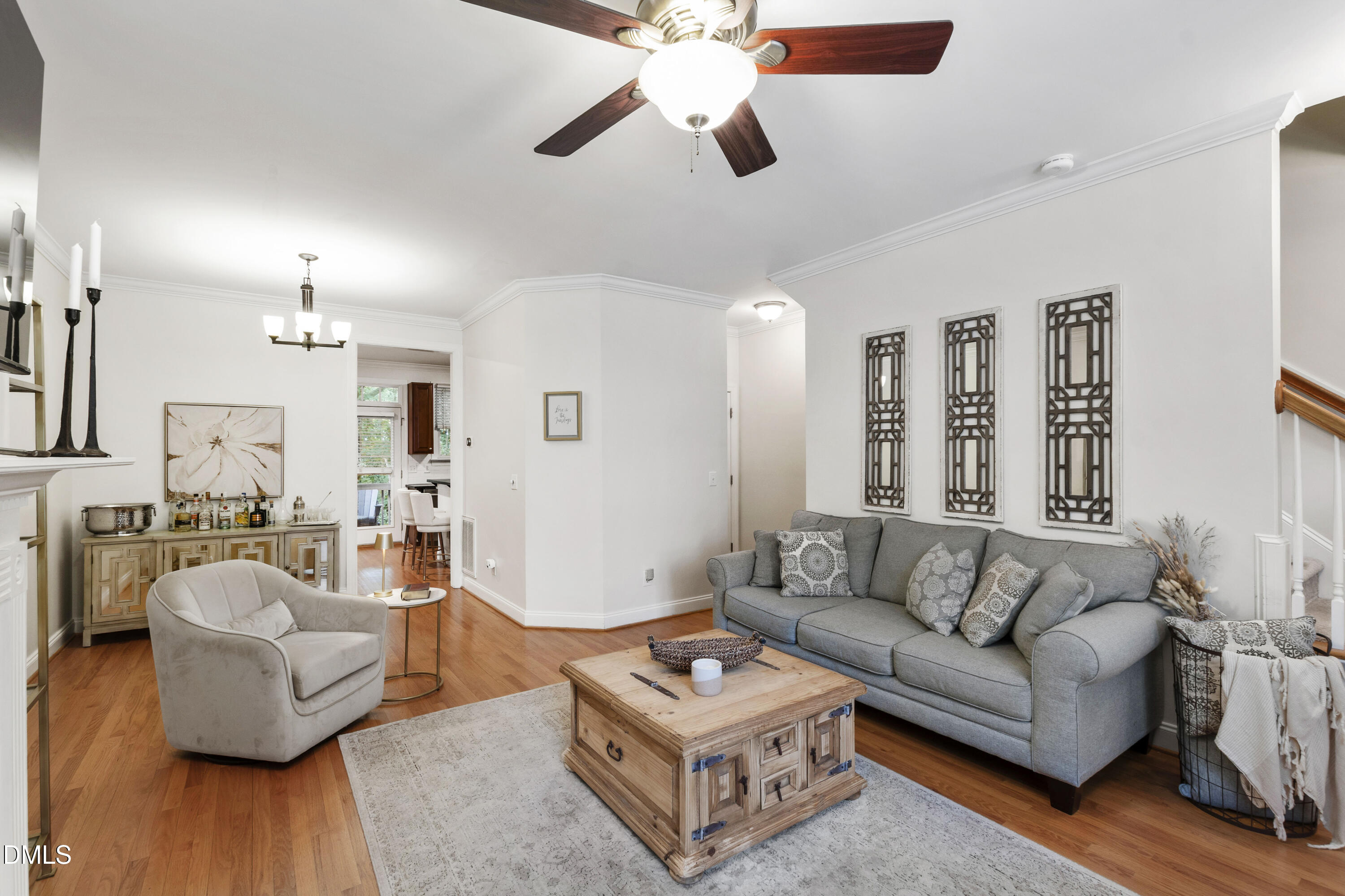 This immaculate townhome offers low-maintenance living just minutes from the shops, dining, and entertainment of North Hills and Midtown. Sunlight fills the main level, where hardwood floors run throughout the open-concept living and dining area, complete with a cozy gas fireplace.The updated eat-in kitchen features granite countertops, modern appliances, and opens to a private deck overlooking a wooded setting. Upstairs, you'll find two spacious ensuite bedrooms with walk-in closets, while the finished basement offers a versatile third bedroom, bonus room, or flex space with its own full bath and access to a covered patio. Contact agent, Abbey Williams, for a showing or questions 919.920.0847. Two marked parking spaces plus guest parking available. Pets negotiable. Kitchen table and chairs and couches in living room can stay if desired.