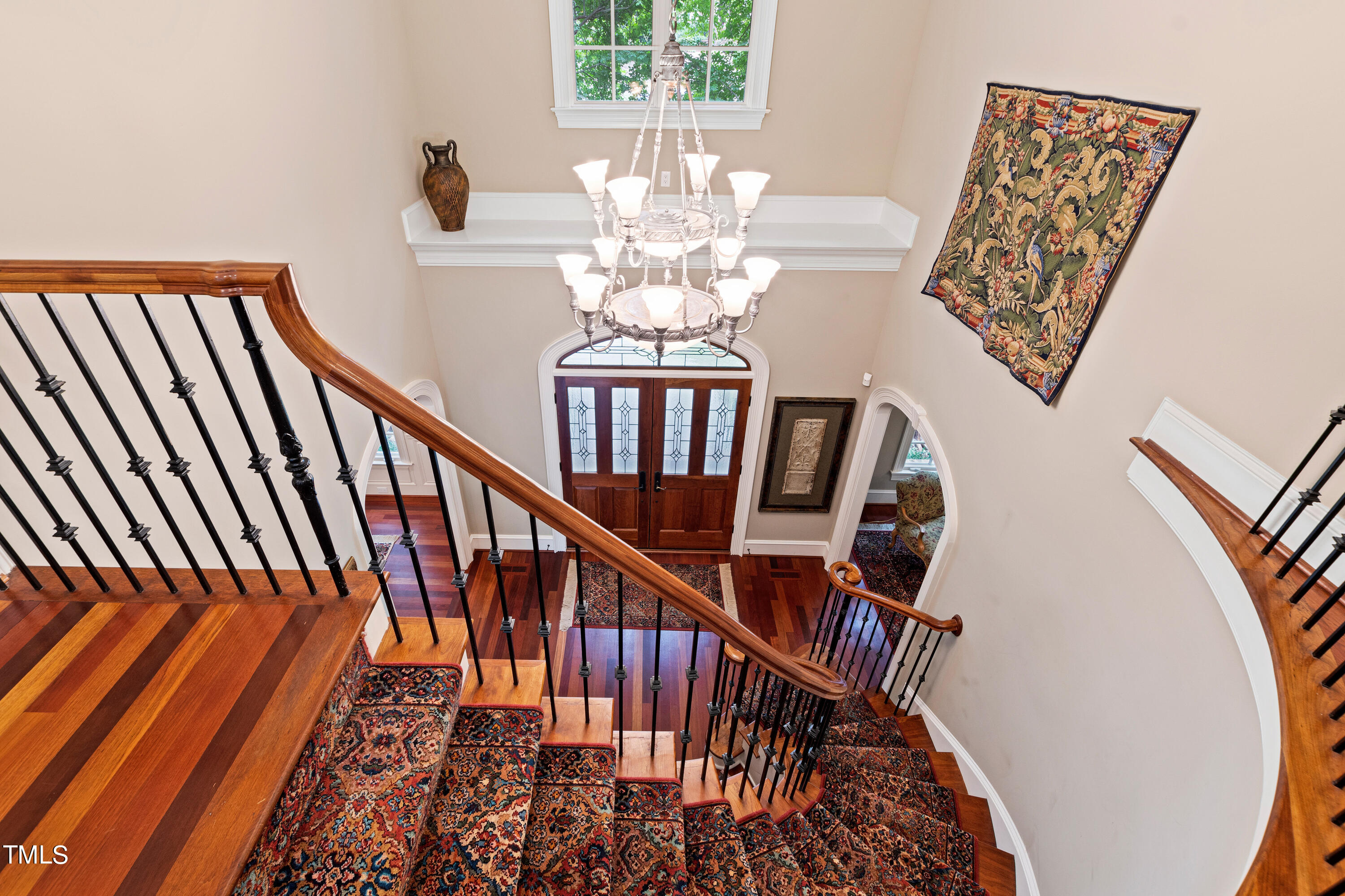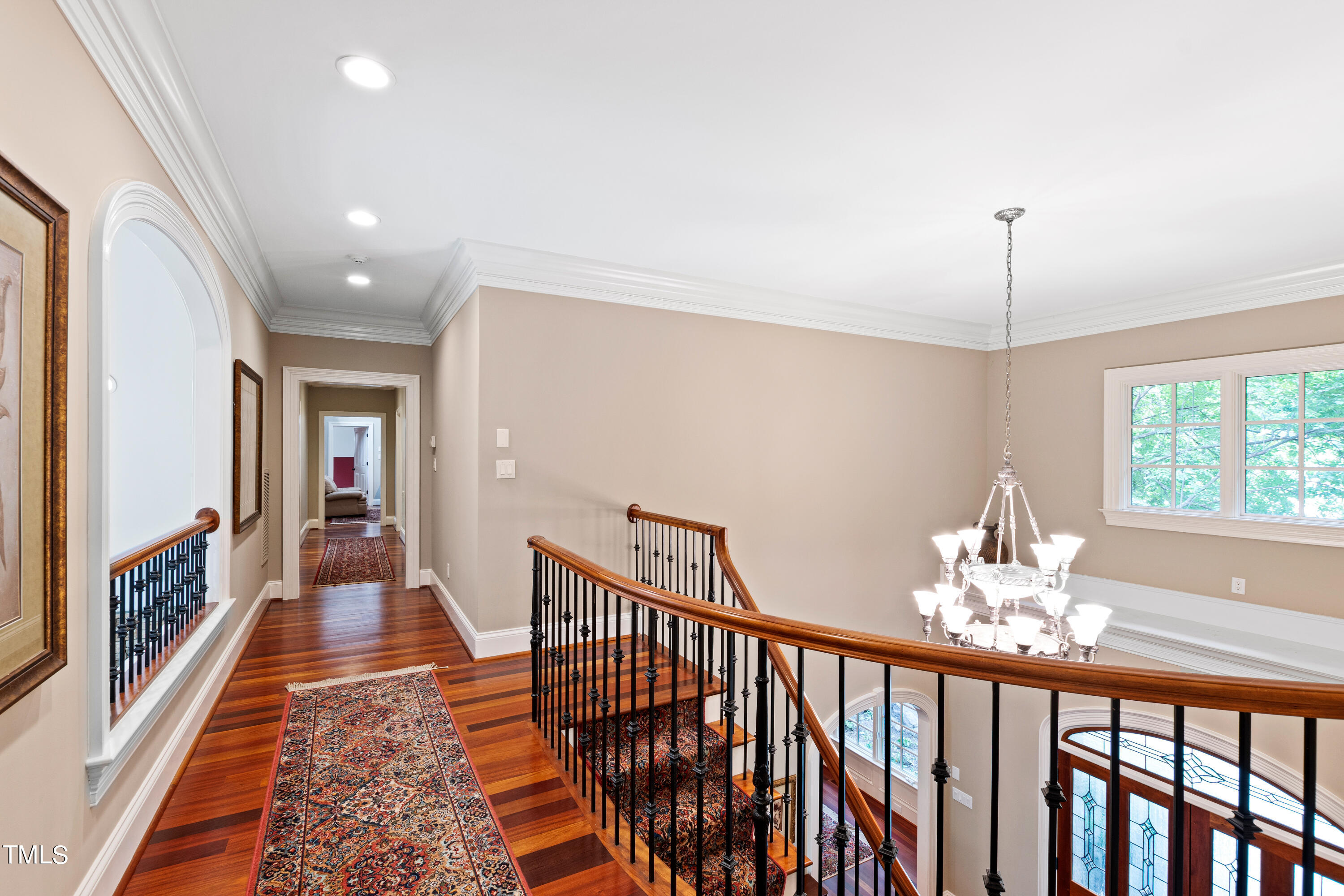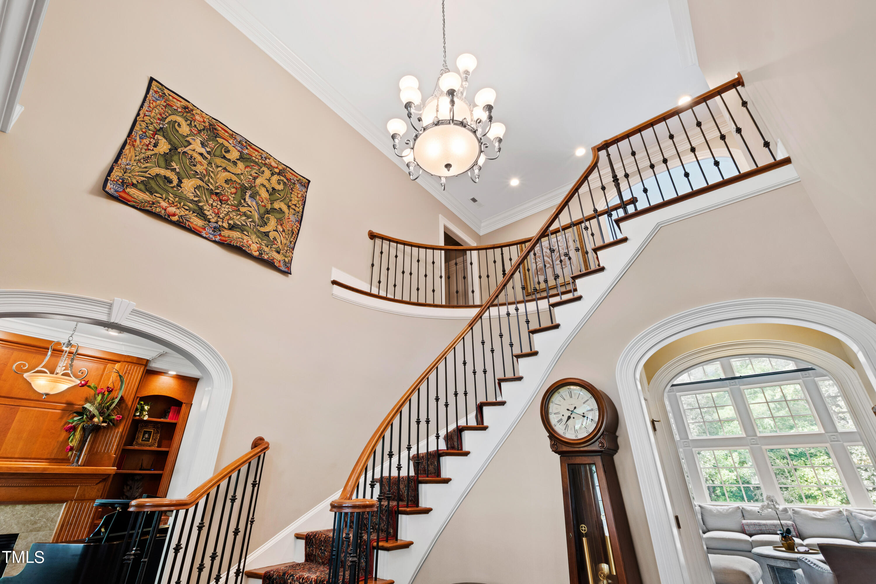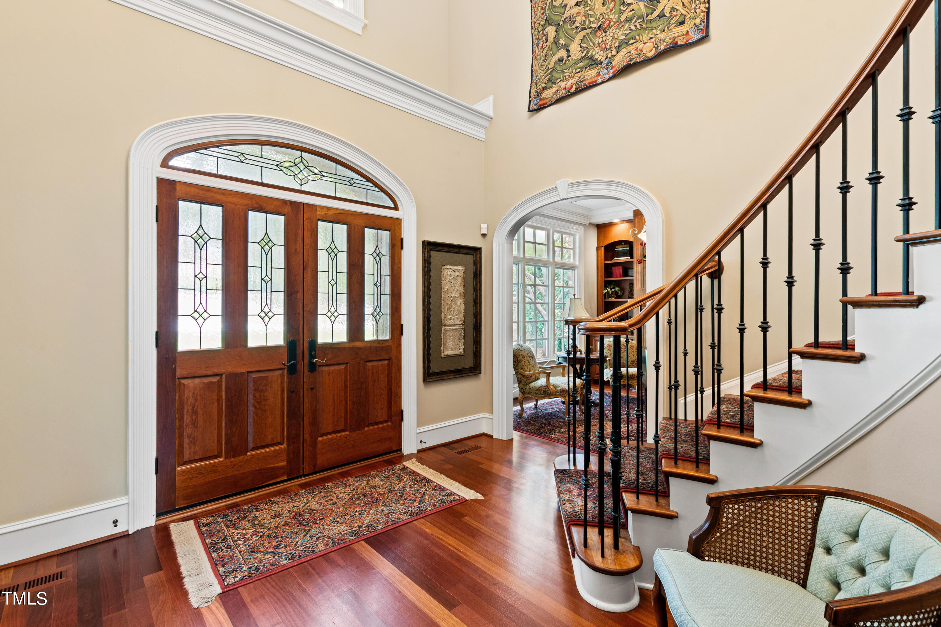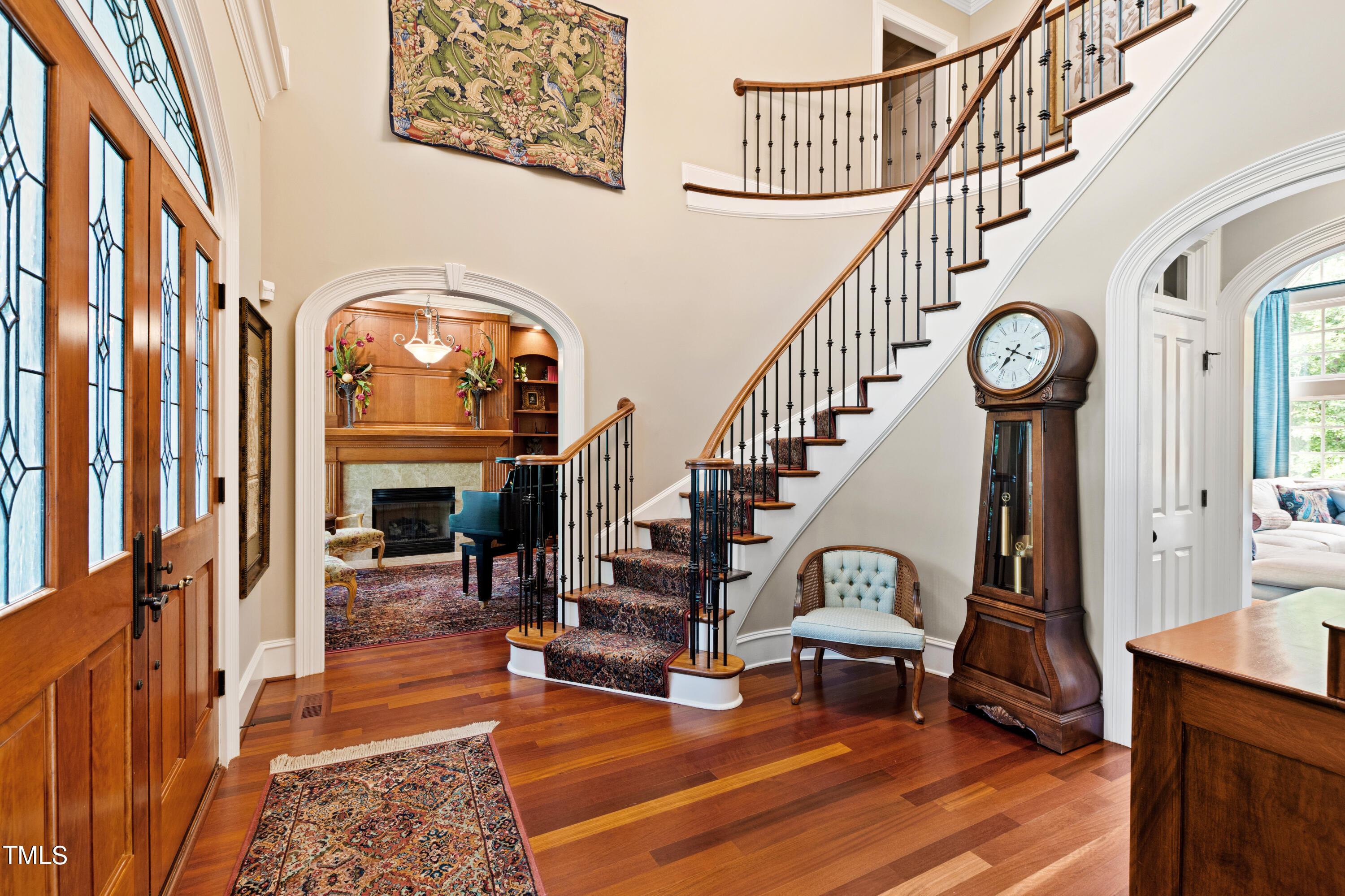 Nestled in mature trees and verdant landscaping in one of Cary's most prestigious neighborhoods, this beautiful nearly 10,000 sq-ft, Georgian- and Federal-inspired home offers six bedroom suites, five garage bays and a seemingly endless number of amenities. Its classic design, tasteful incorporation of both traditional and contemporary features, and highest quality materials and workmanship make it a standout among Regency Parkway area residences. At the end of a quiet cul-de-sac, the home's stately facade and majestic trees imply strength and security while a gently babbling water feature near the entry evokes a sense of calm abiding. Within, an air of relaxed luxury begins in the spacious foyer with its richly stained wood floor and soaring ceiling. A delicately curving staircase of polished wood and wrought iron rises to a second-level overlook.