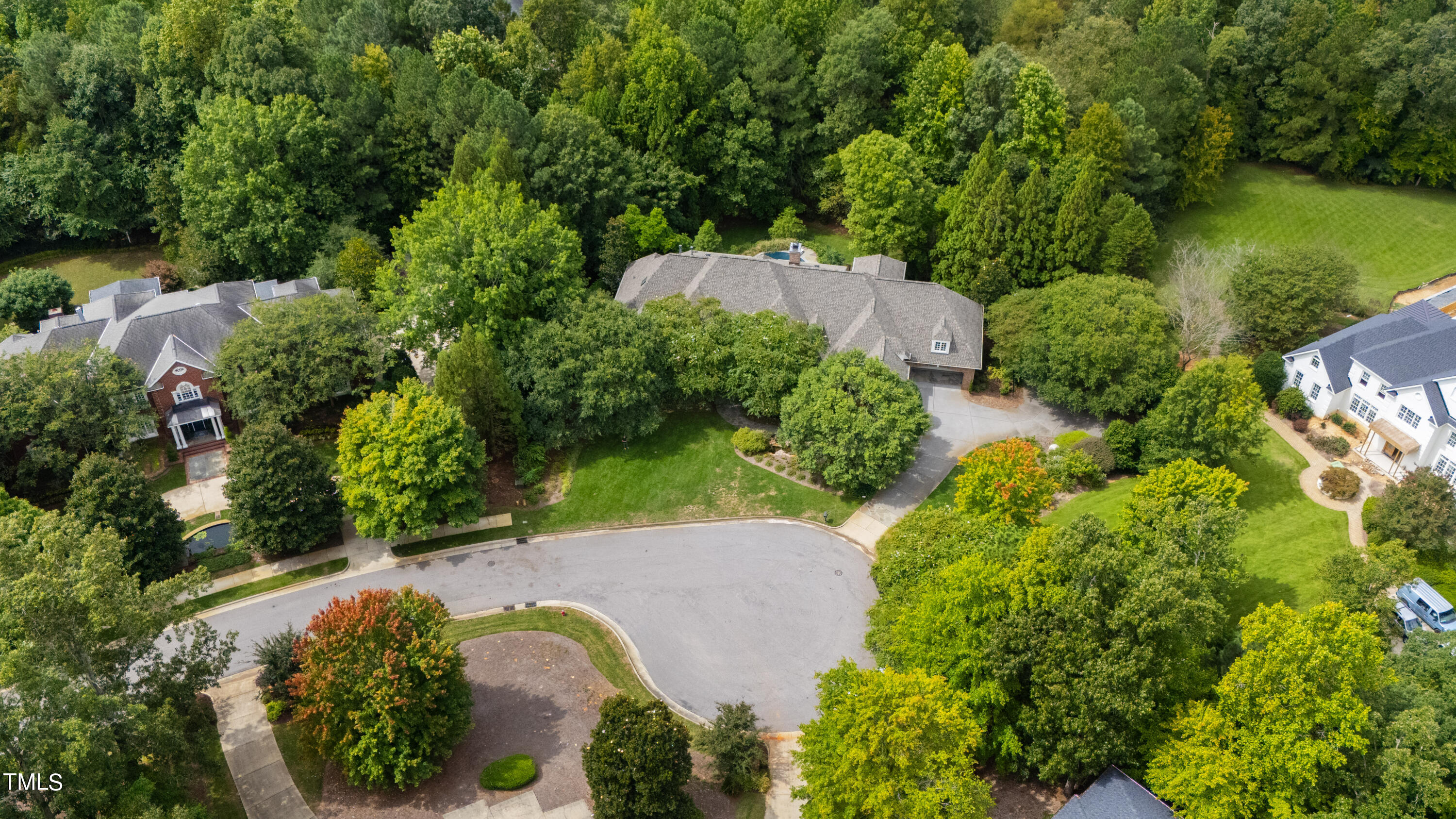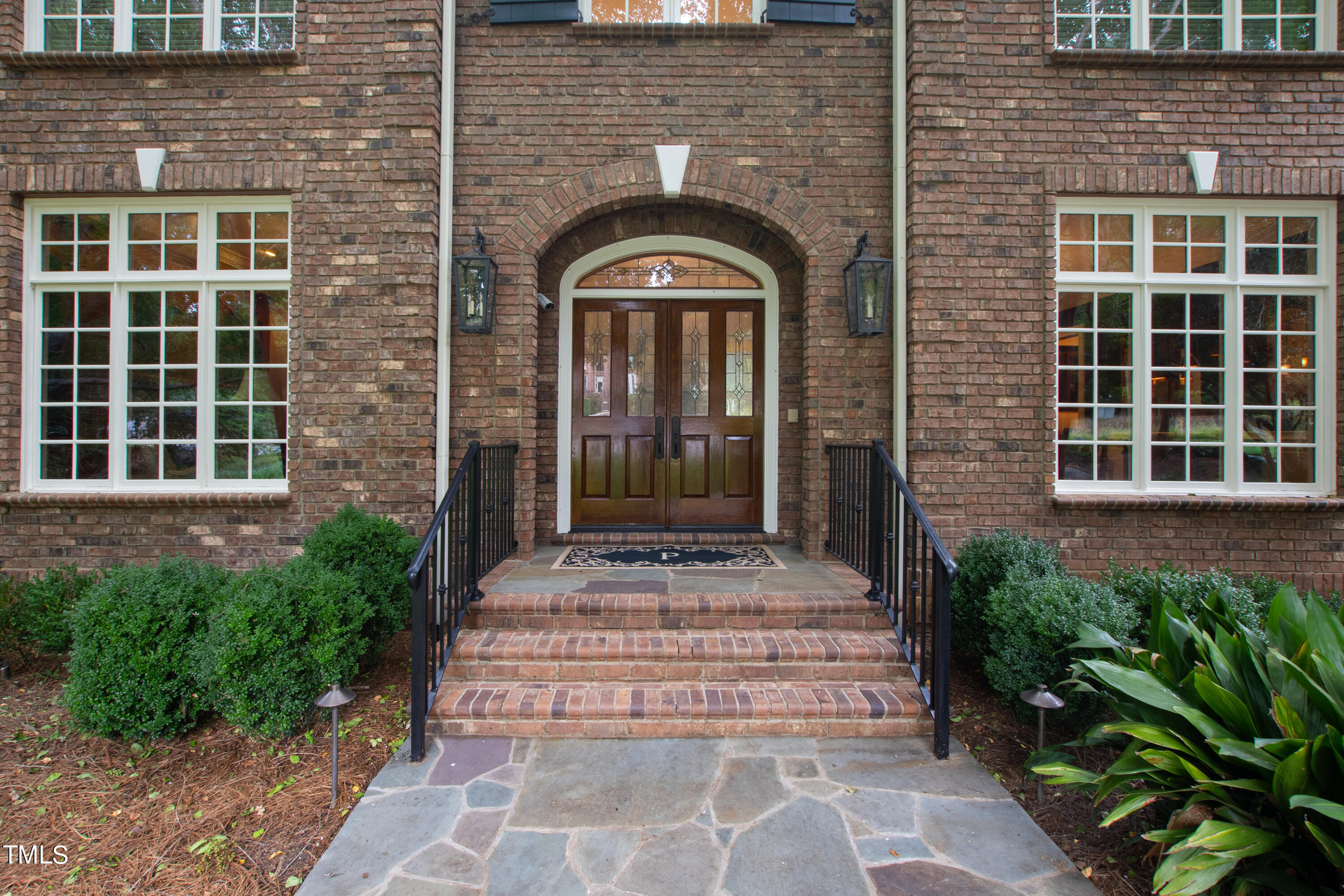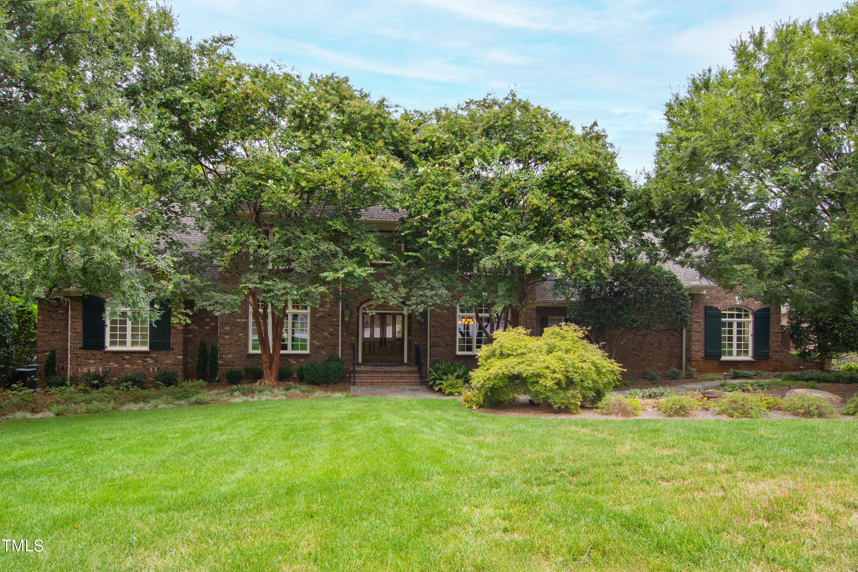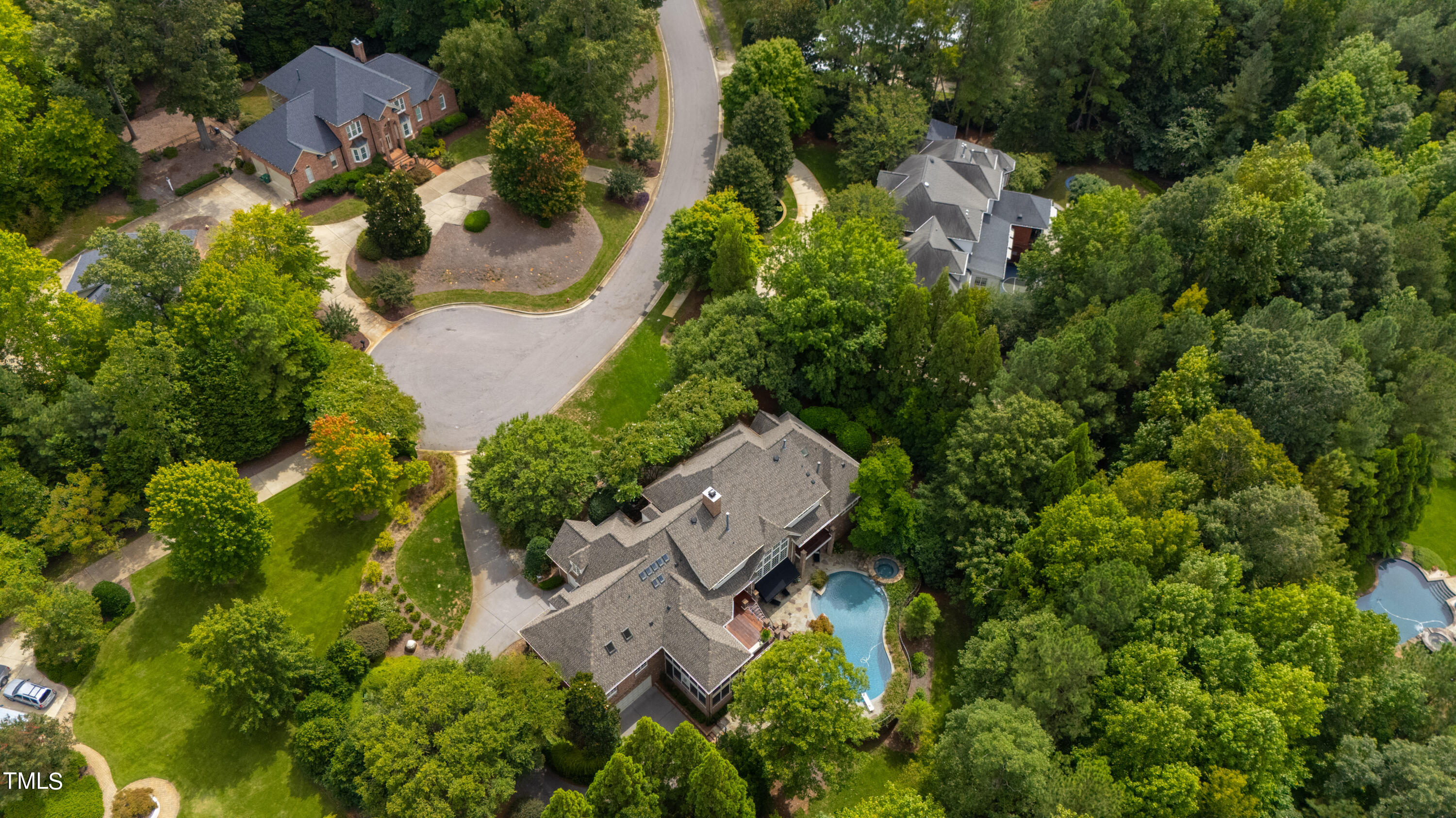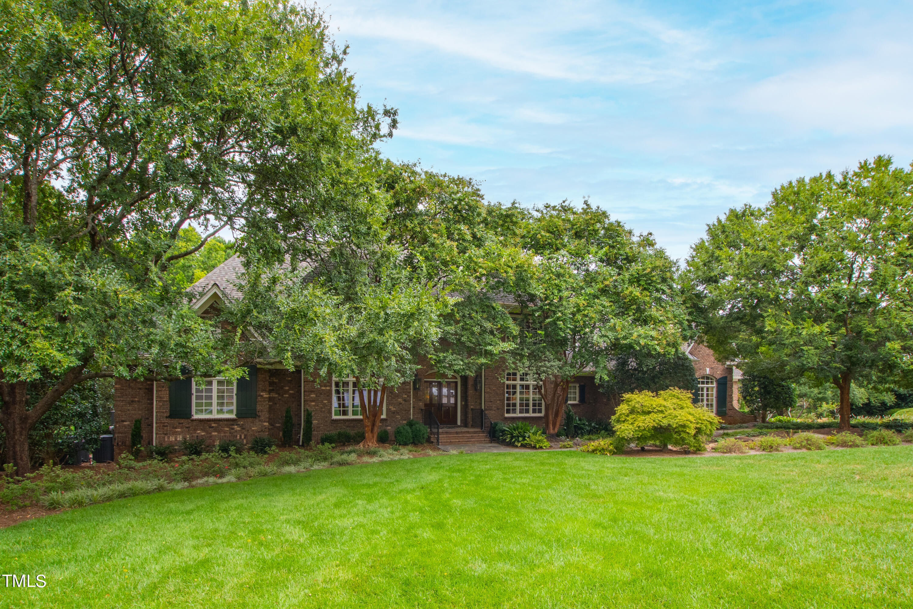 Nestled in mature trees and verdant landscaping in one of Cary's most prestigious neighborhoods, this beautiful nearly 10,000 sq-ft, Georgian- and Federal-inspired home offers six bedroom suites, five garage bays and a seemingly endless number of amenities. Its classic design, tasteful incorporation of both traditional and contemporary features, and highest quality materials and workmanship make it a standout among Regency Parkway area residences. At the end of a quiet cul-de-sac, the home's stately facade and majestic trees imply strength and security while a gently babbling water feature near the entry evokes a sense of calm abiding. Within, an air of relaxed luxury begins in the spacious foyer with its richly stained wood floor and soaring ceiling. A delicately curving staircase of polished wood and wrought iron rises to a second-level overlook.
