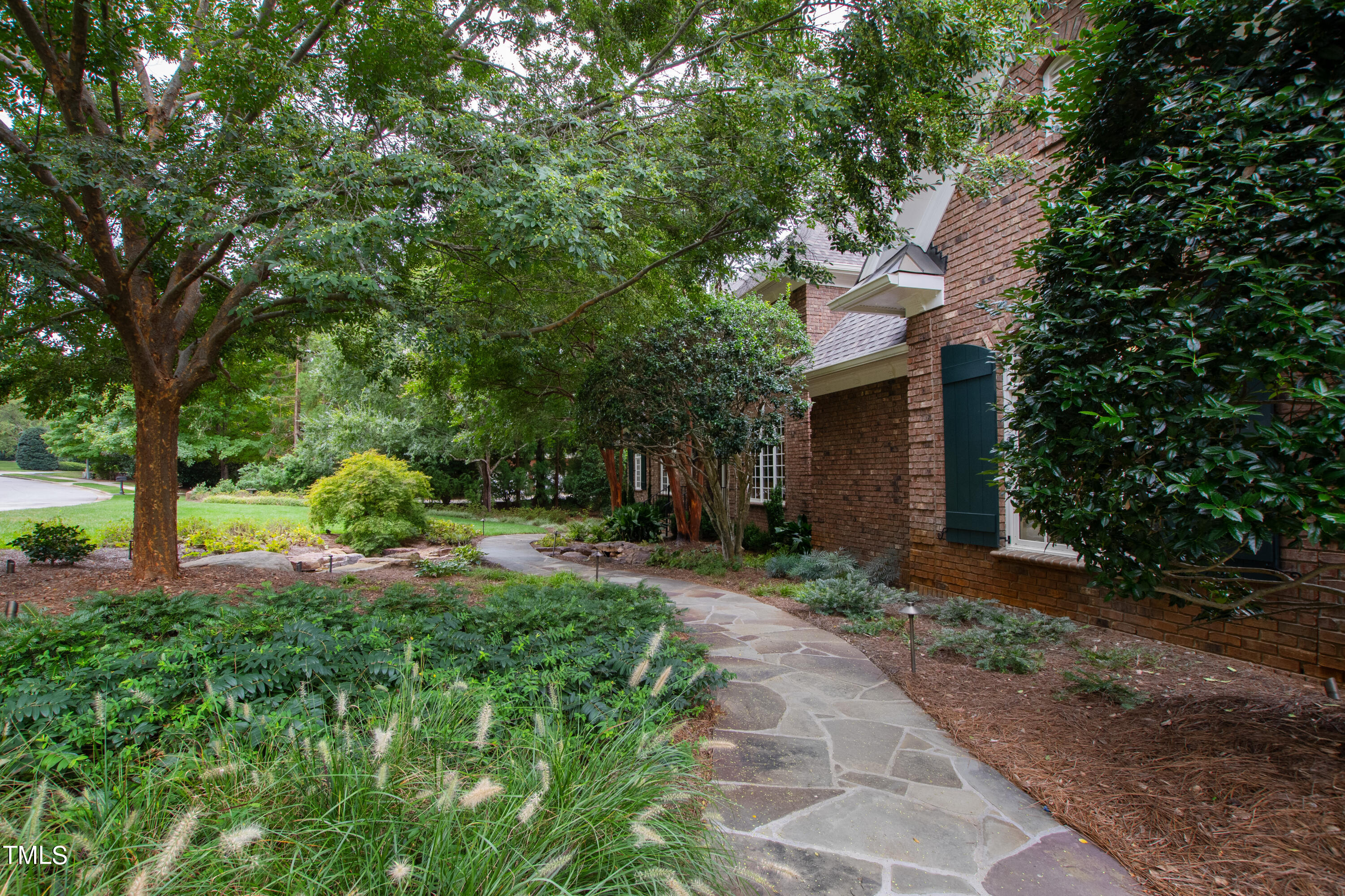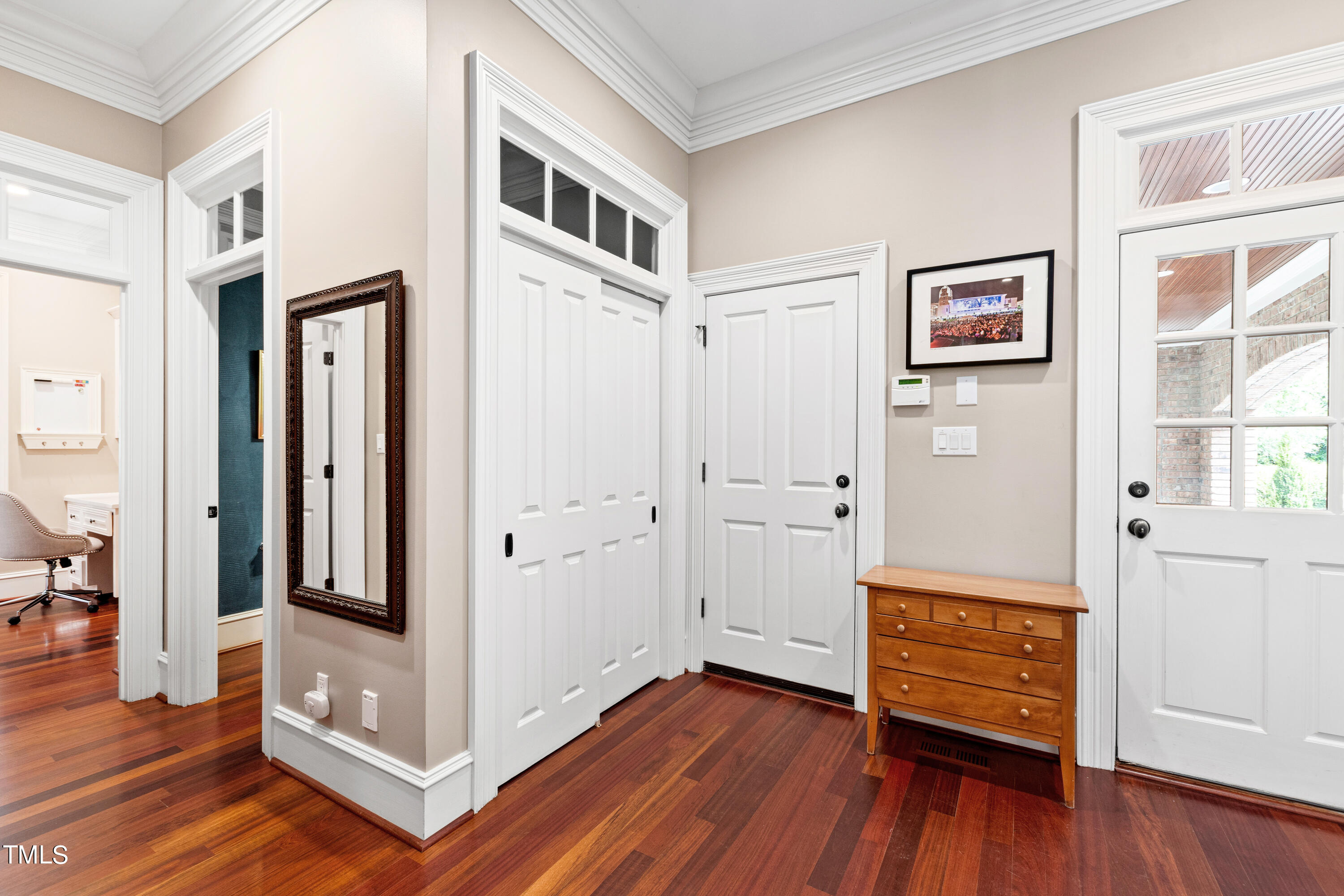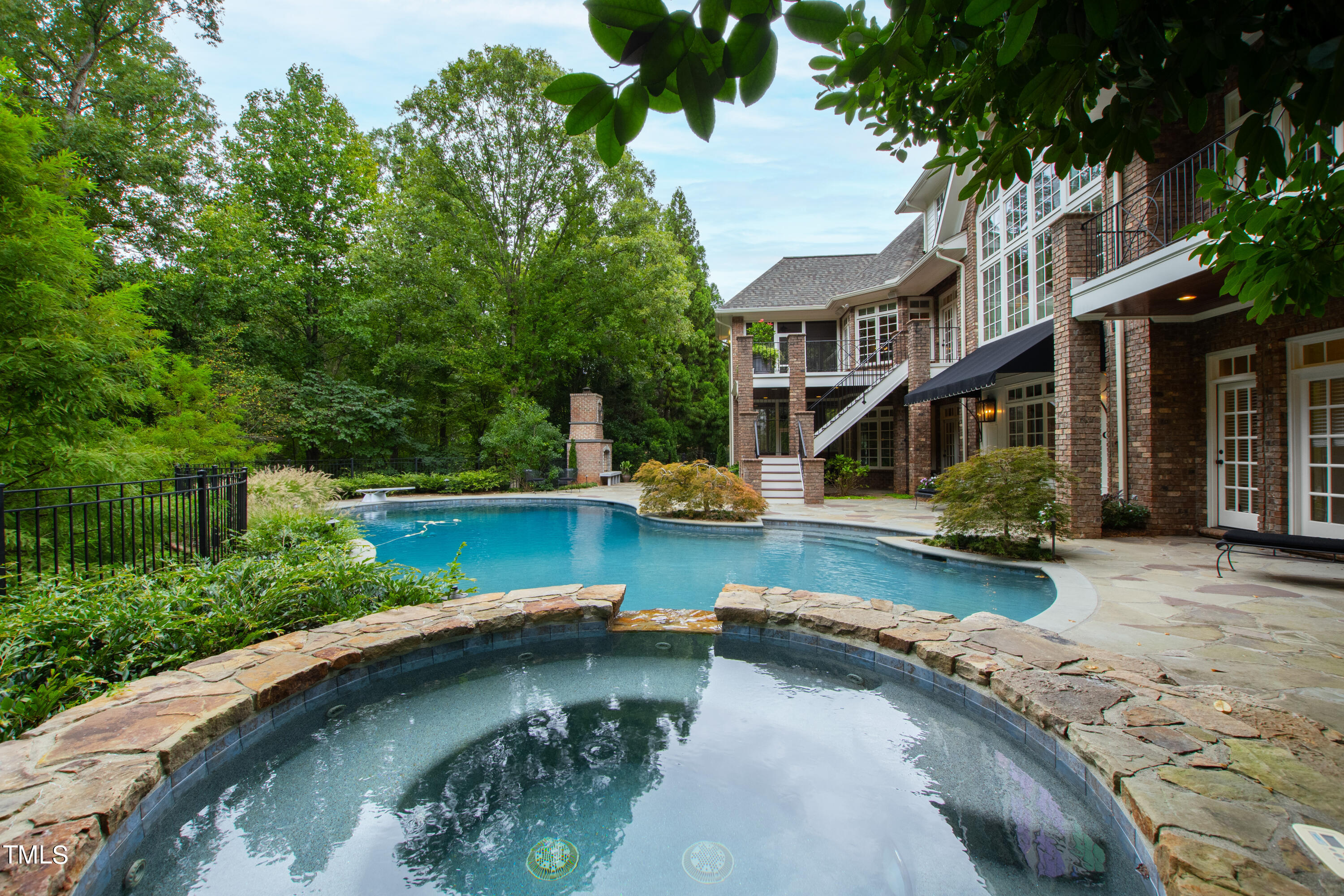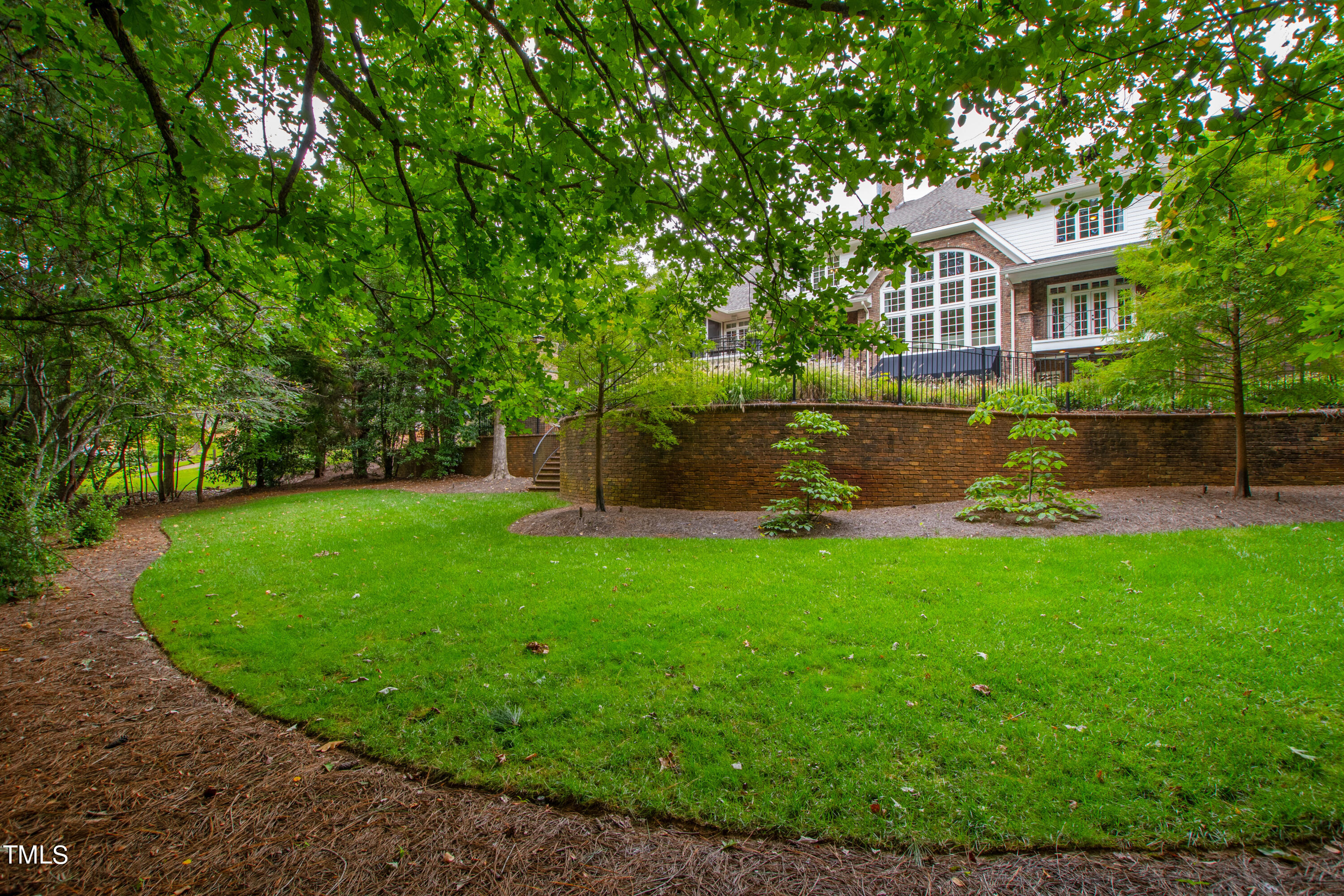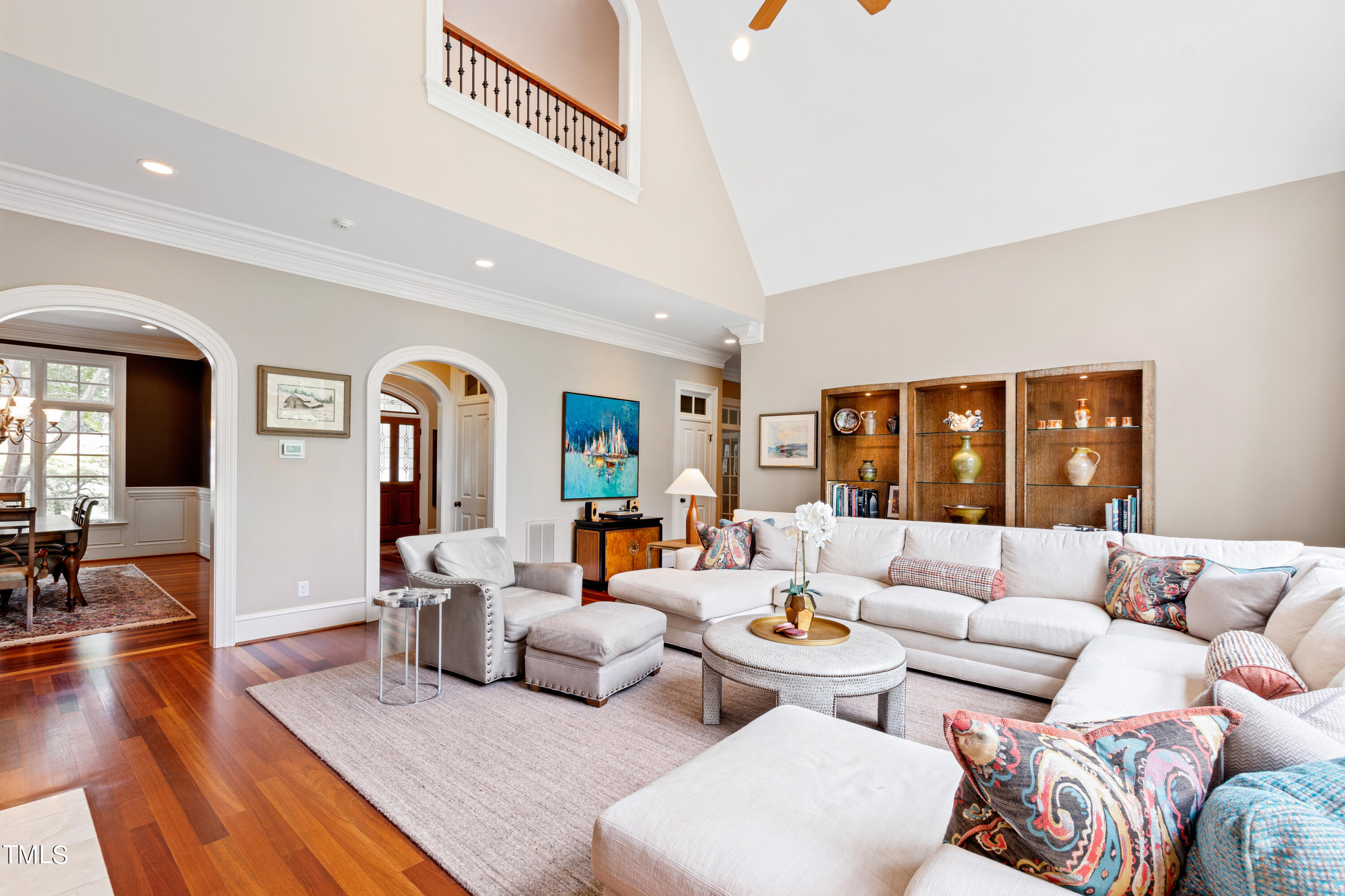 Nestled in mature trees and verdant landscaping in one of Cary's most prestigious neighborhoods, this beautiful nearly 10,000 sq-ft, Georgian- and Federal-inspired home offers six bedroom suites, five garage bays and a seemingly endless number of amenities. Its classic design, tasteful incorporation of both traditional and contemporary features, and highest quality materials and workmanship make it a standout among Regency Parkway area residences. At the end of a quiet cul-de-sac, the home's stately facade and majestic trees imply strength and security while a gently babbling water feature near the entry evokes a sense of calm abiding. Within, an air of relaxed luxury begins in the spacious foyer with its richly stained wood floor and soaring ceiling. A delicately curving staircase of polished wood and wrought iron rises to a second-level overlook.