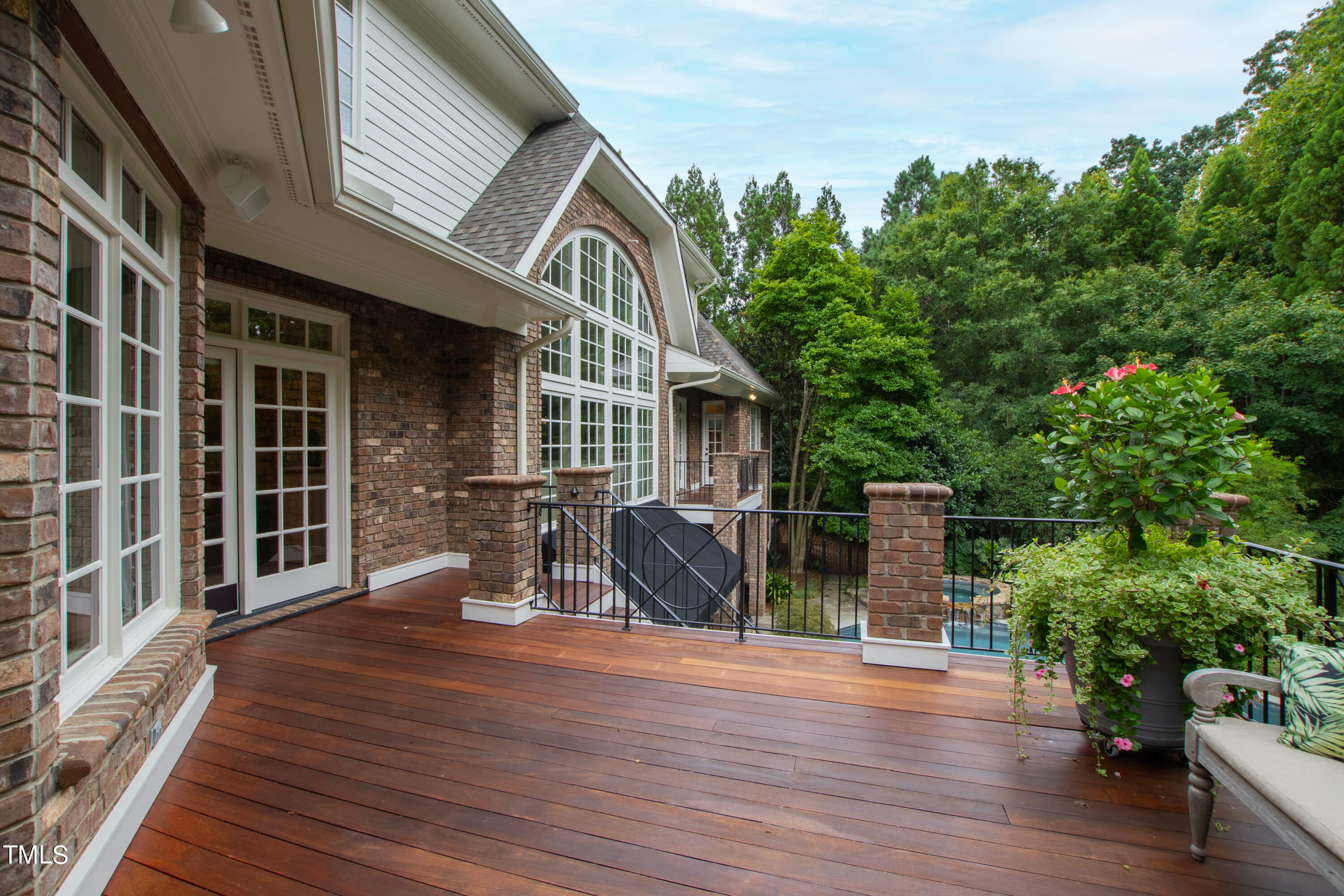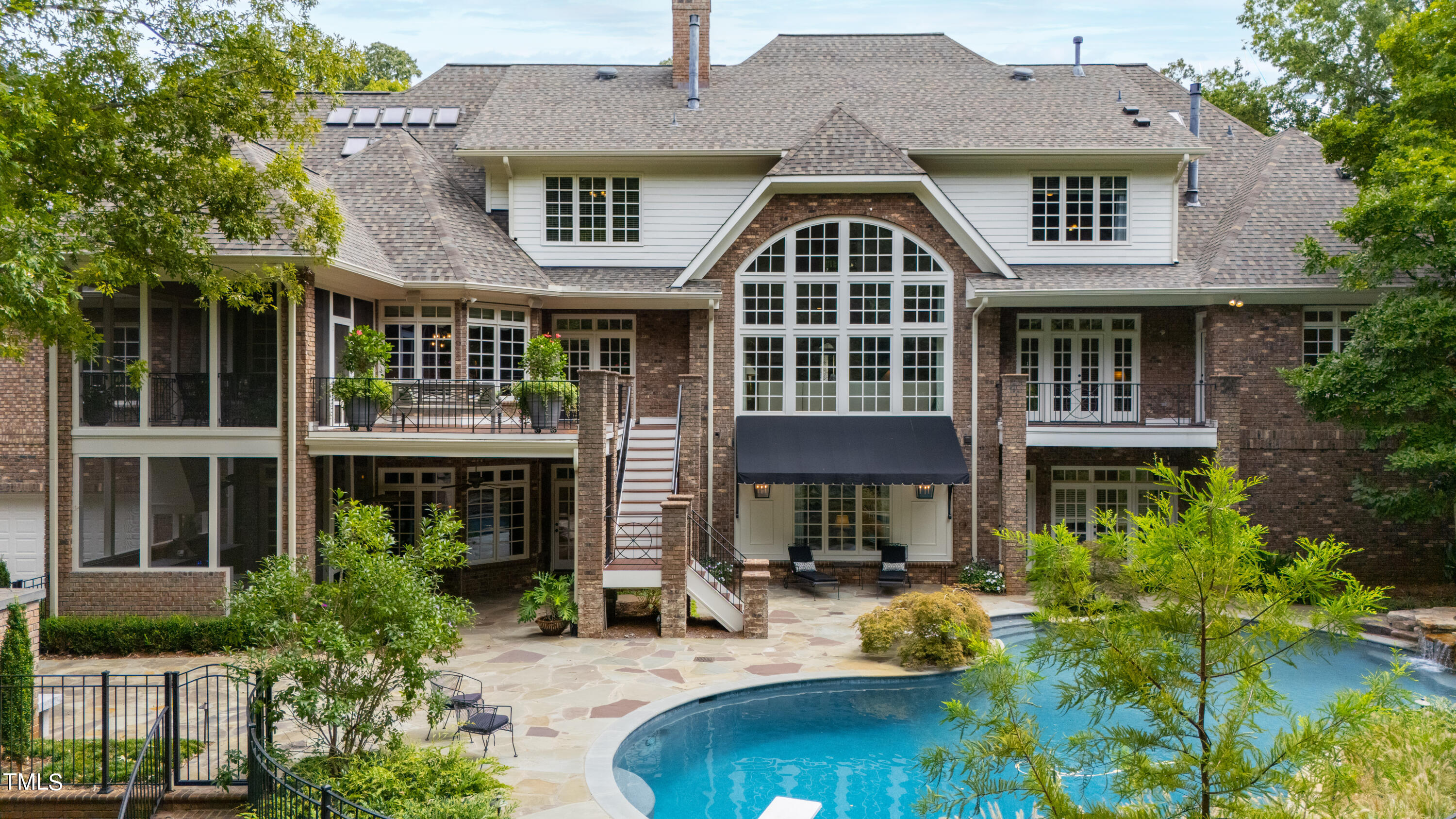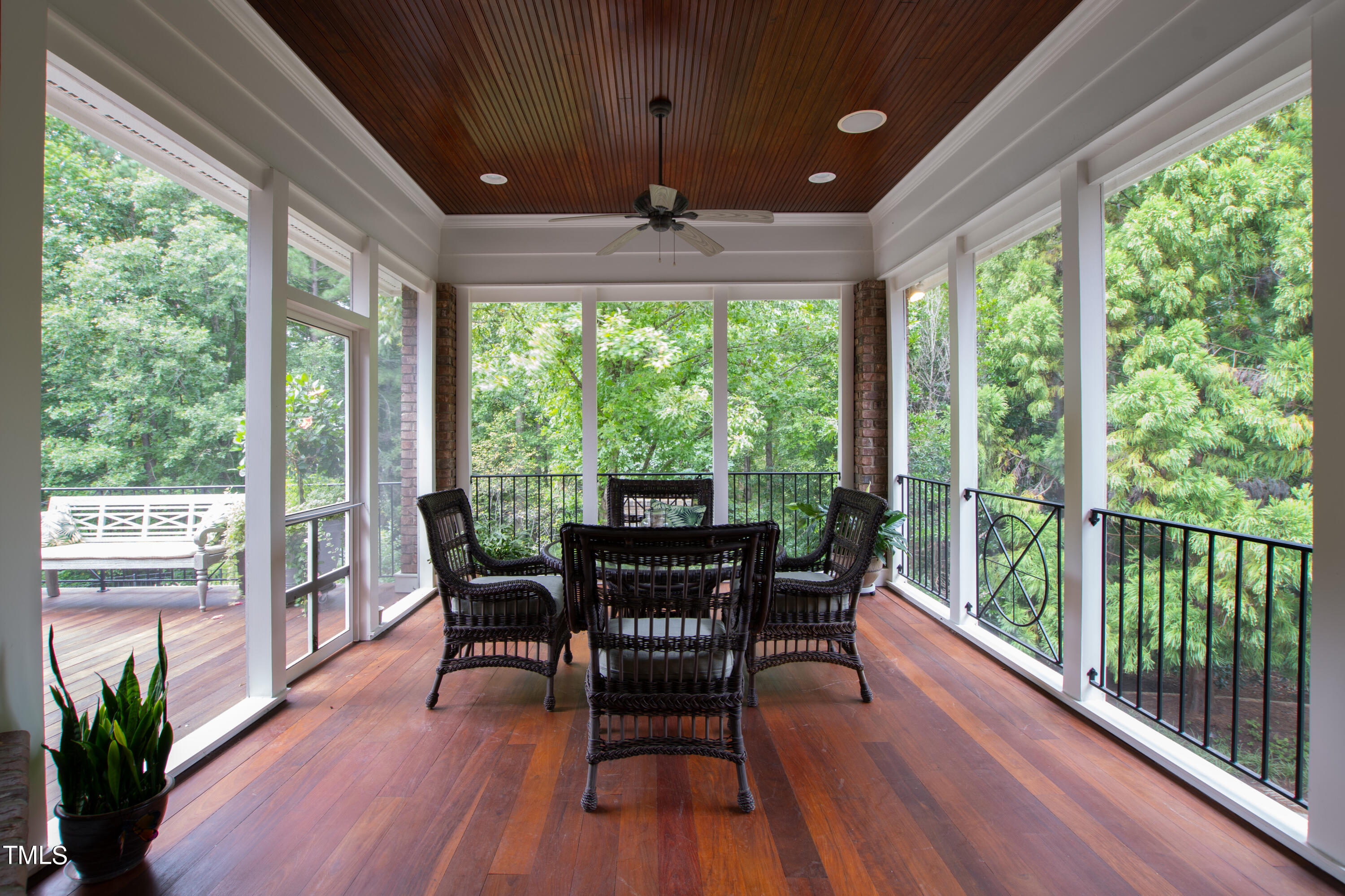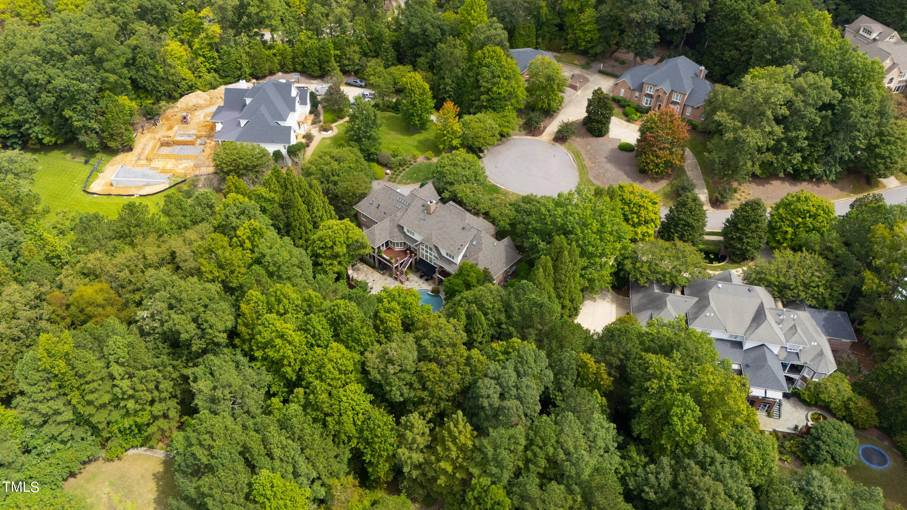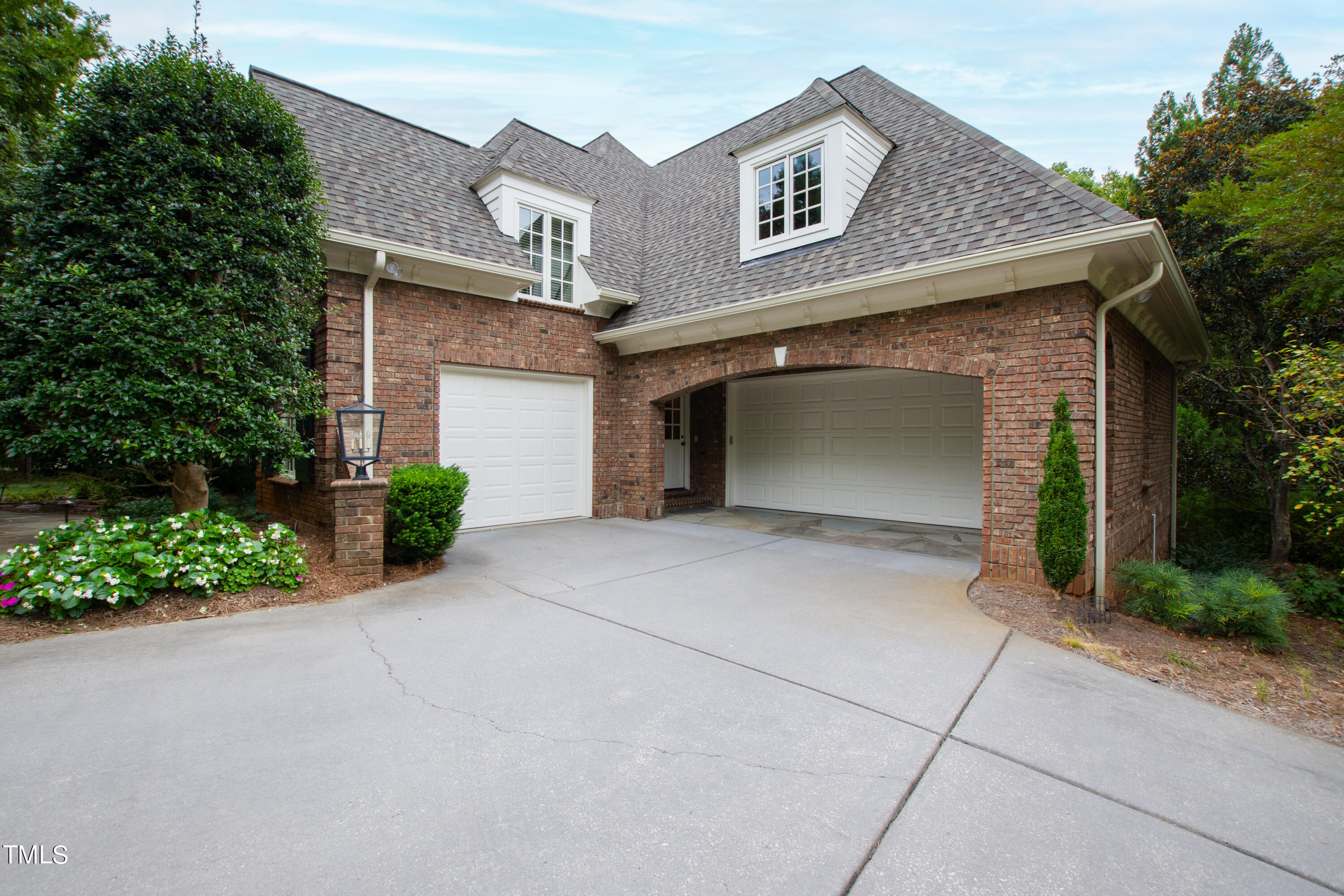 Nestled in mature trees and verdant landscaping in one of Cary's most prestigious neighborhoods, this beautiful nearly 10,000 sq-ft, Georgian- and Federal-inspired home offers six bedroom suites, five garage bays and a seemingly endless number of amenities. Its classic design, tasteful incorporation of both traditional and contemporary features, and highest quality materials and workmanship make it a standout among Regency Parkway area residences. At the end of a quiet cul-de-sac, the home's stately facade and majestic trees imply strength and security while a gently babbling water feature near the entry evokes a sense of calm abiding. Within, an air of relaxed luxury begins in the spacious foyer with its richly stained wood floor and soaring ceiling. A delicately curving staircase of polished wood and wrought iron rises to a second-level overlook.