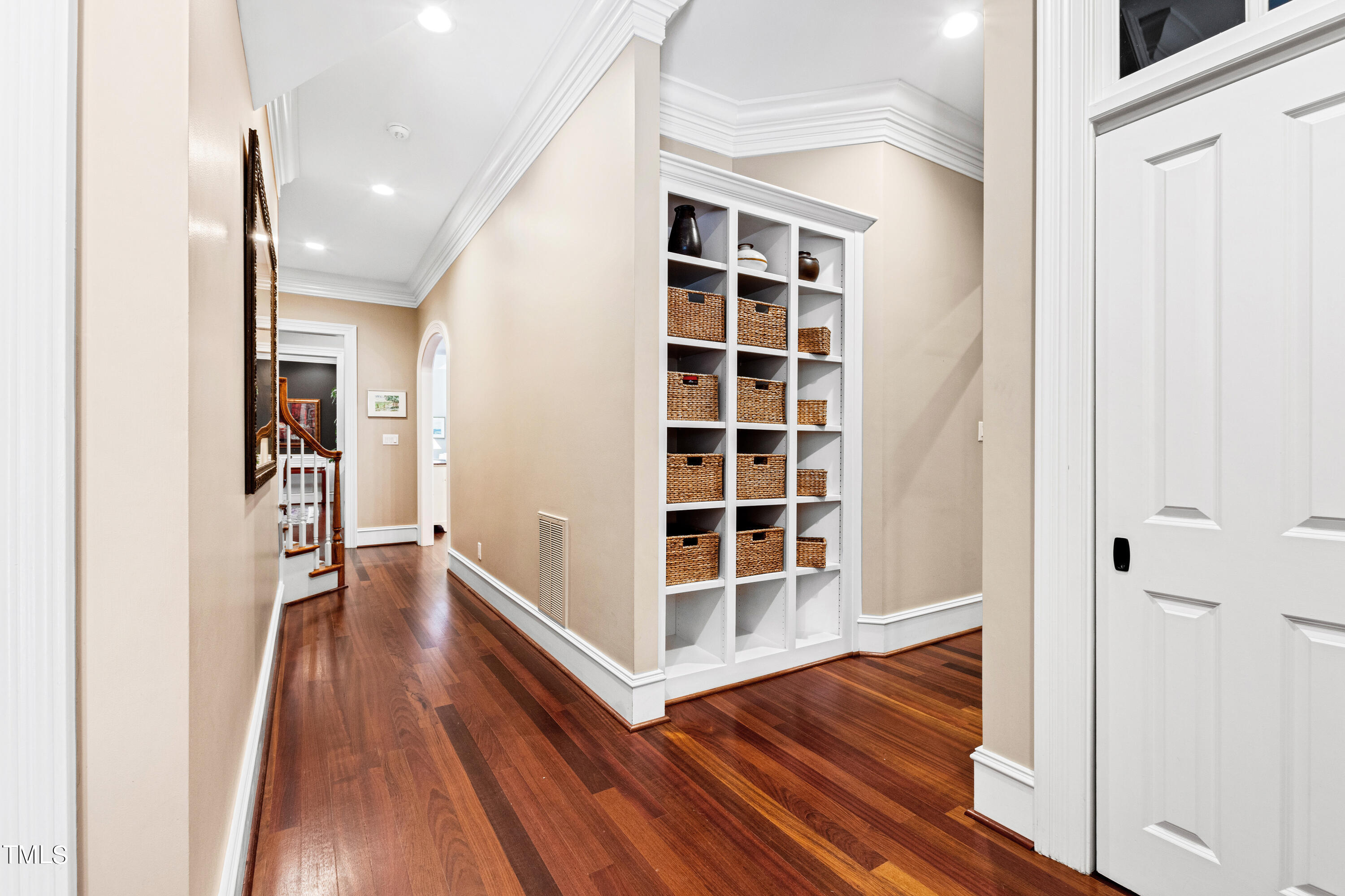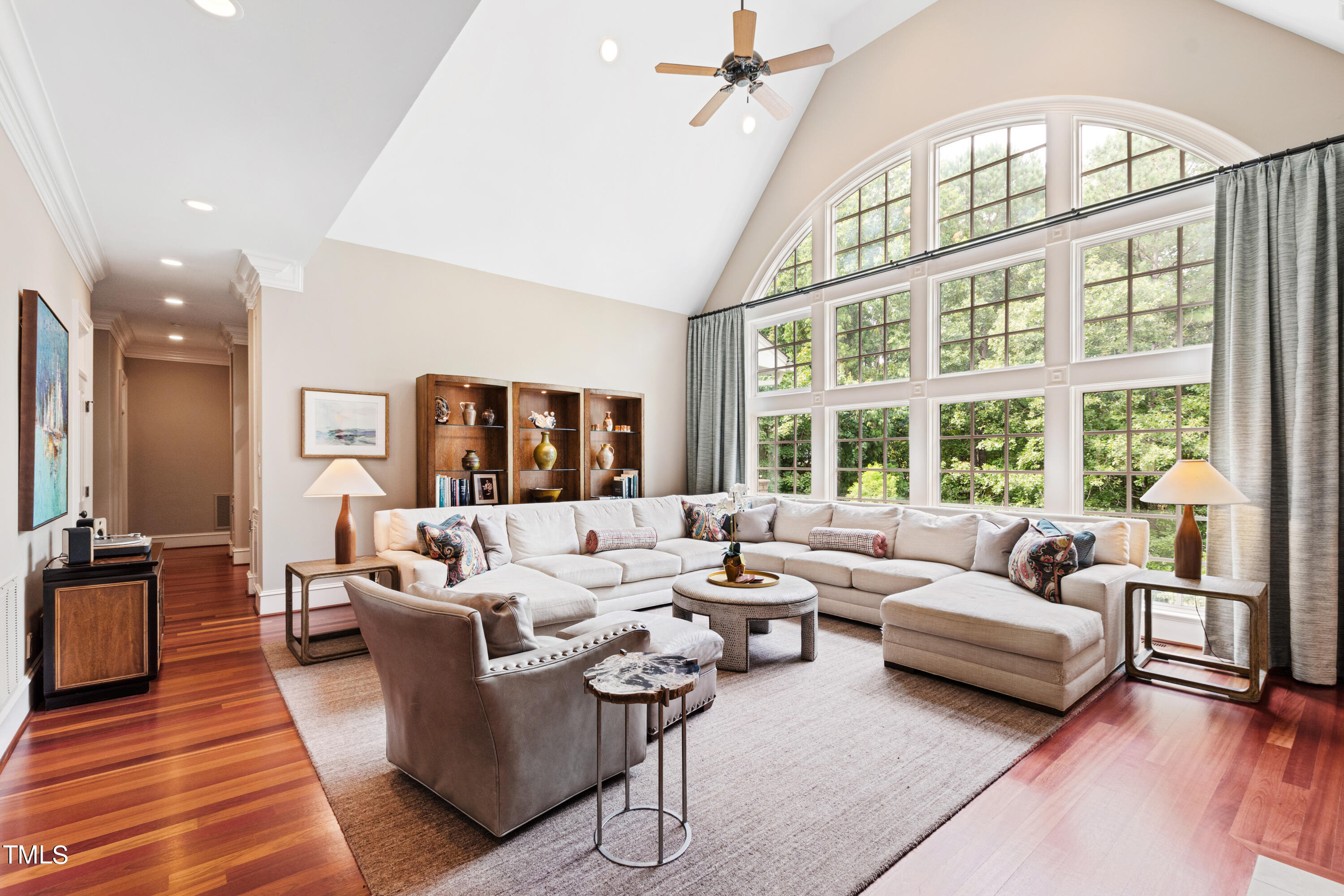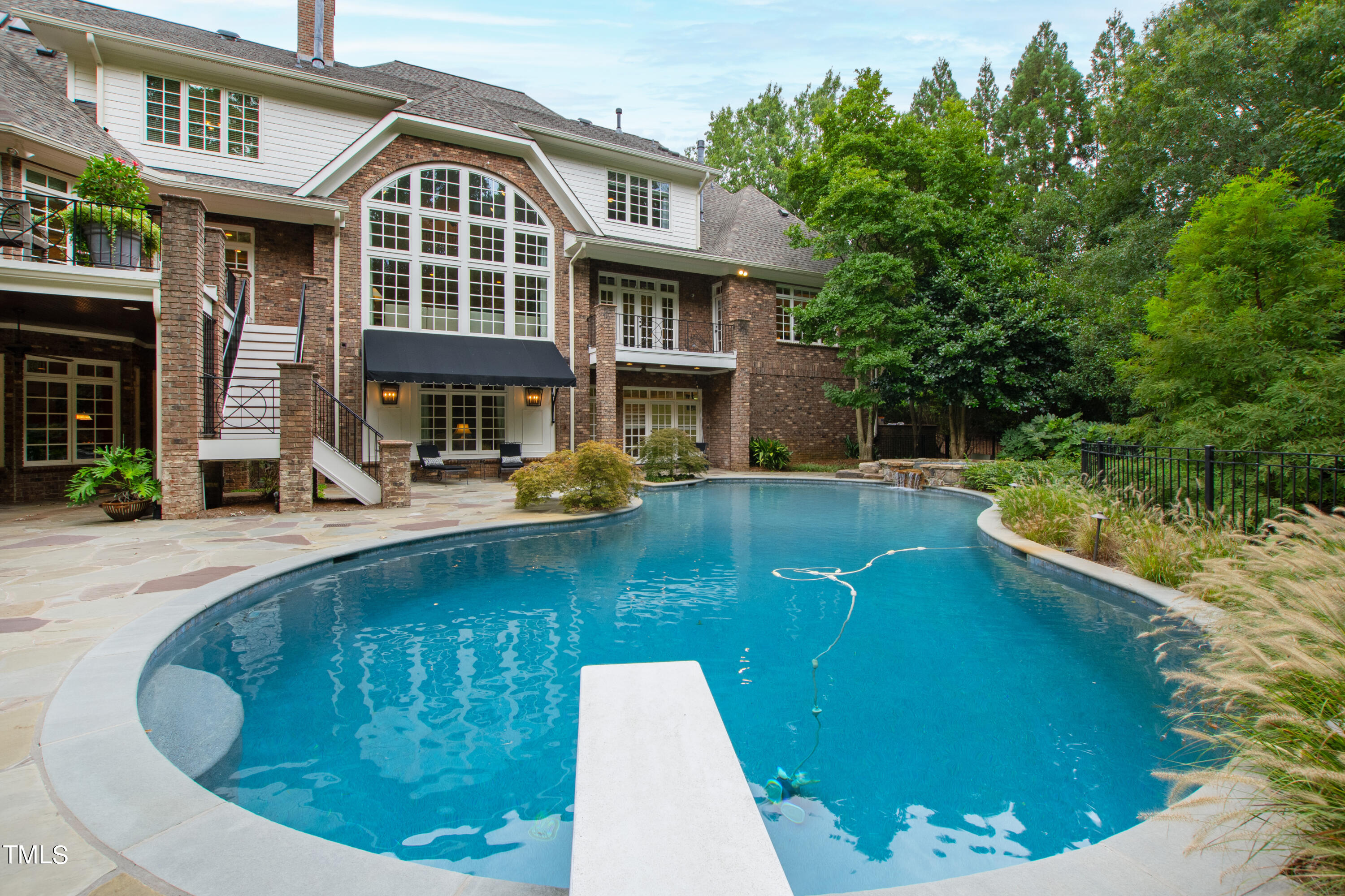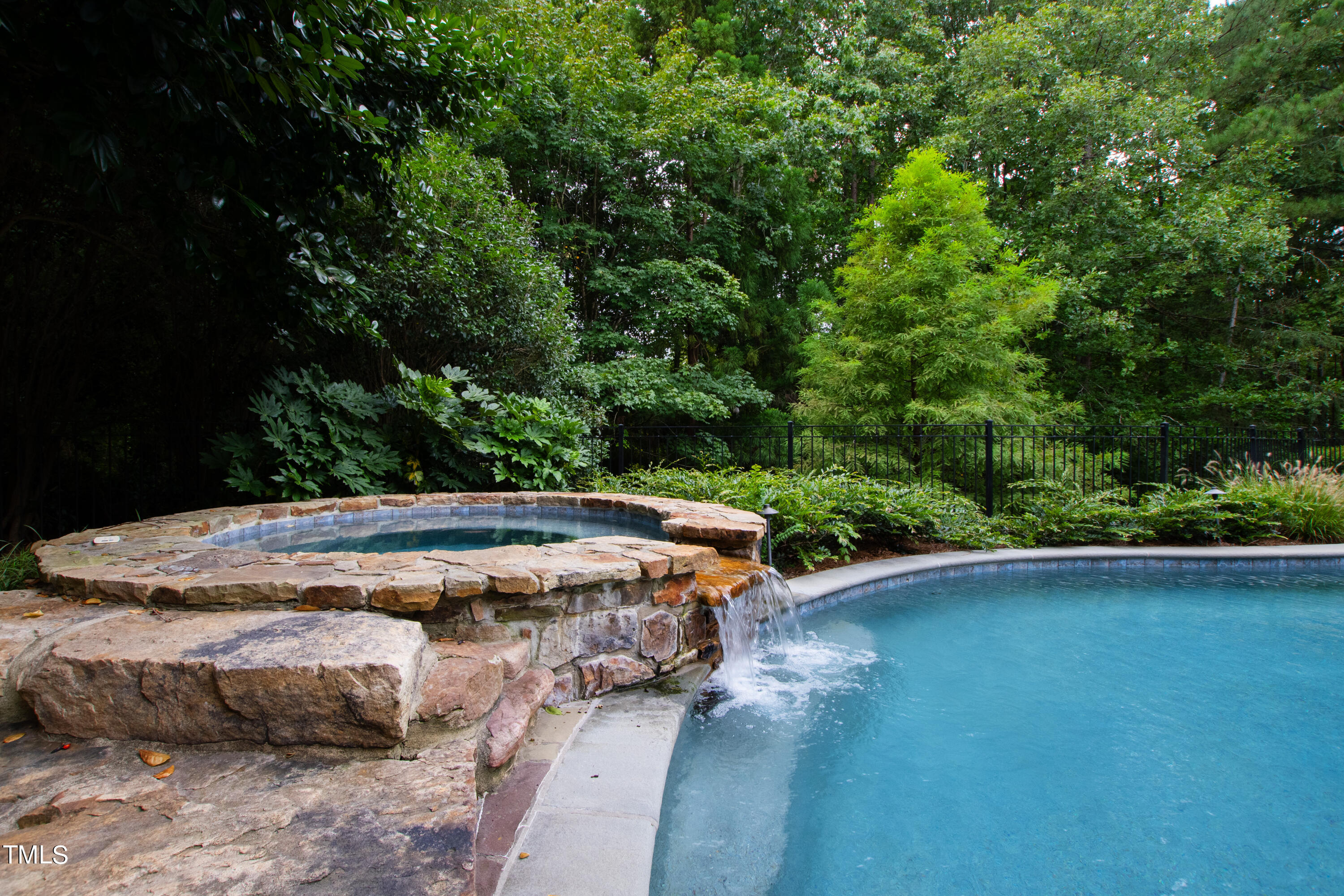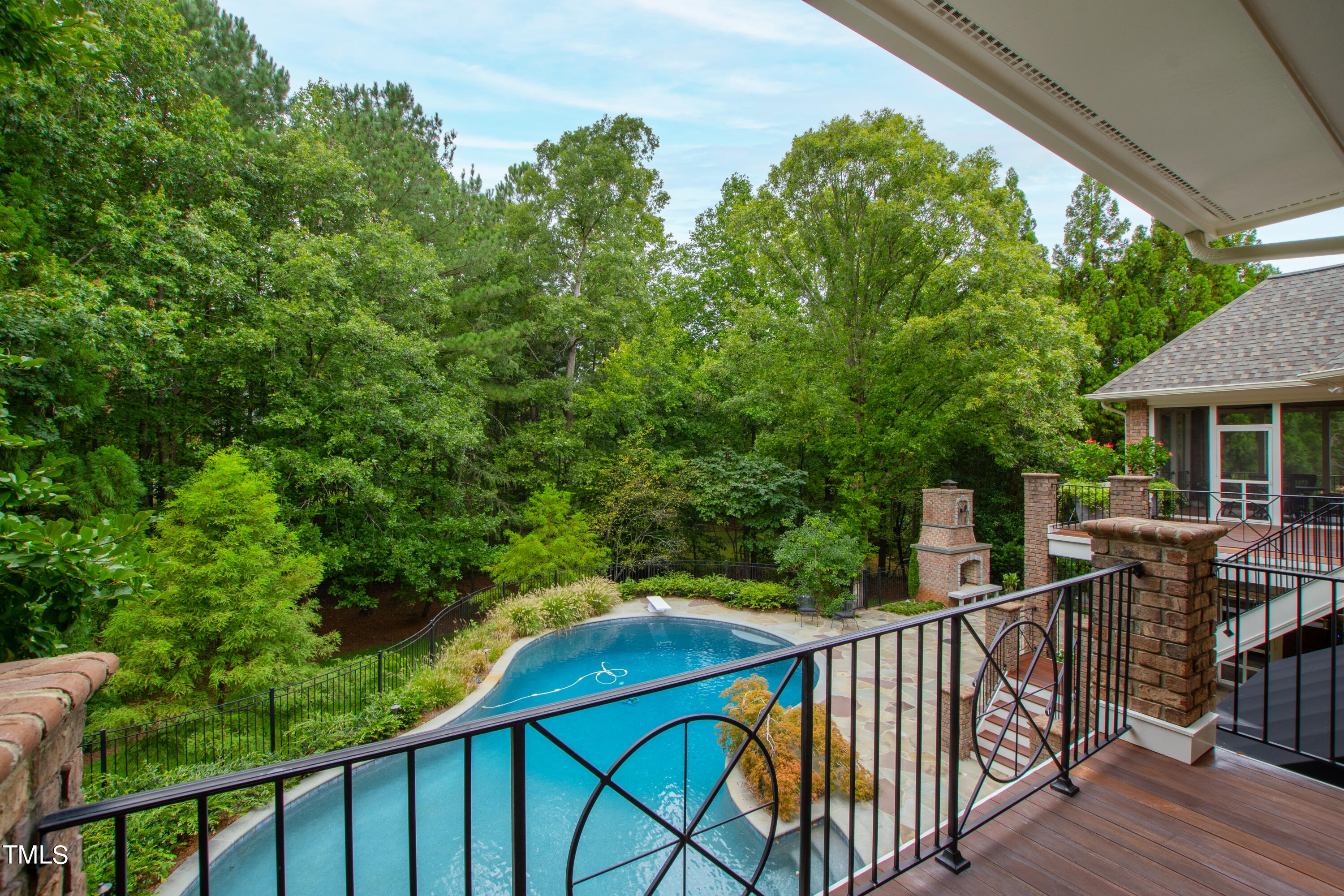 Nestled in mature trees and verdant landscaping in one of Cary's most prestigious neighborhoods, this beautiful nearly 10,000 sq-ft, Georgian- and Federal-inspired home offers six bedroom suites, five garage bays and a seemingly endless number of amenities. Its classic design, tasteful incorporation of both traditional and contemporary features, and highest quality materials and workmanship make it a standout among Regency Parkway area residences. At the end of a quiet cul-de-sac, the home's stately facade and majestic trees imply strength and security while a gently babbling water feature near the entry evokes a sense of calm abiding. Within, an air of relaxed luxury begins in the spacious foyer with its richly stained wood floor and soaring ceiling. A delicately curving staircase of polished wood and wrought iron rises to a second-level overlook.