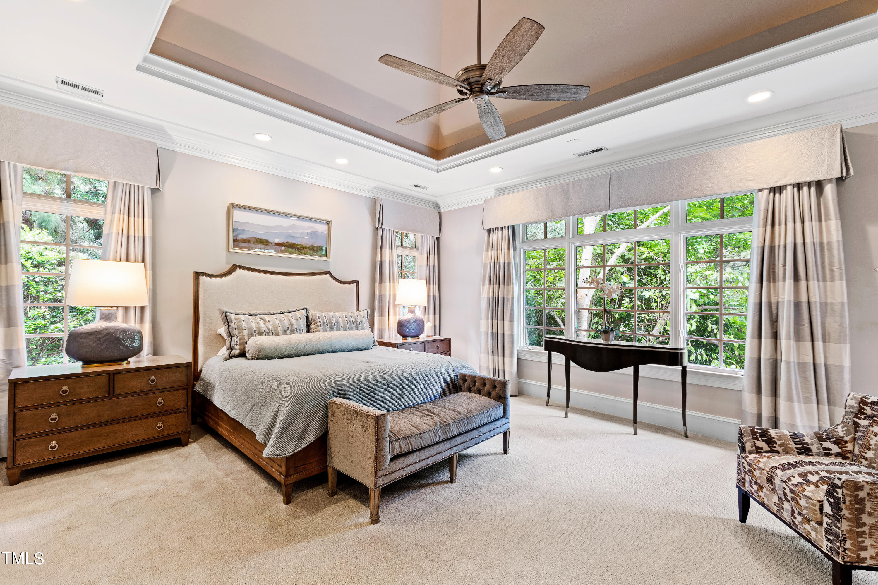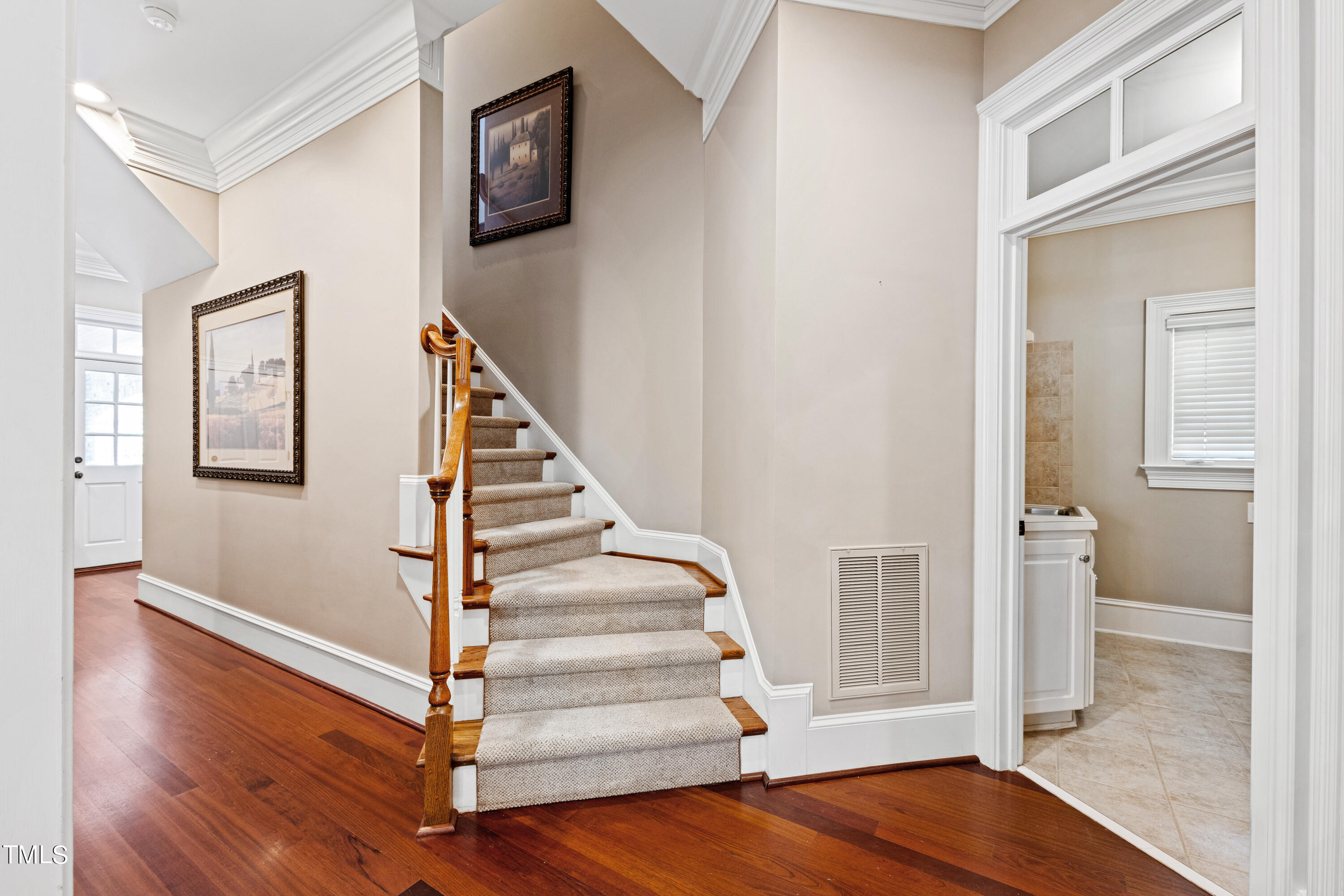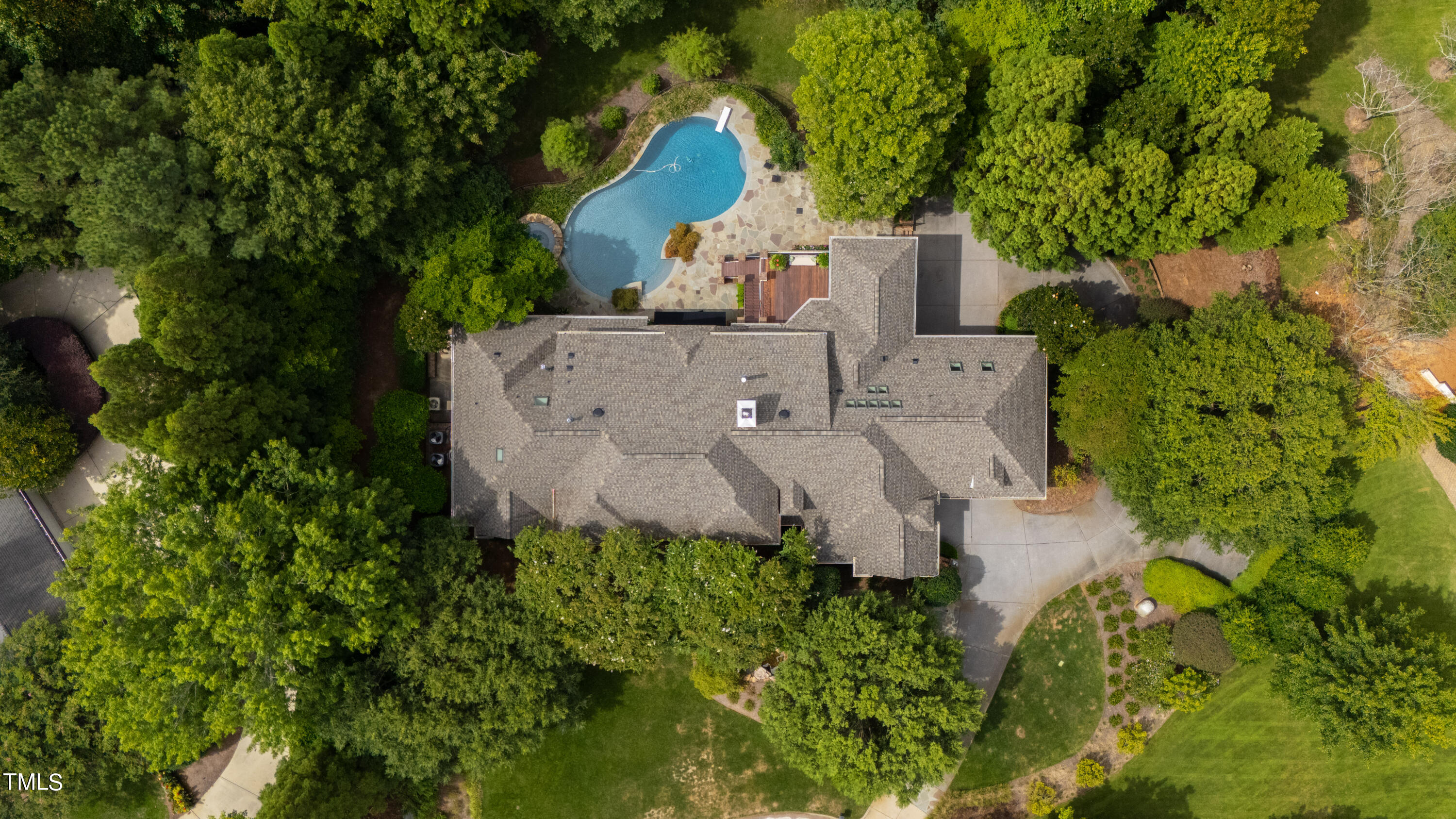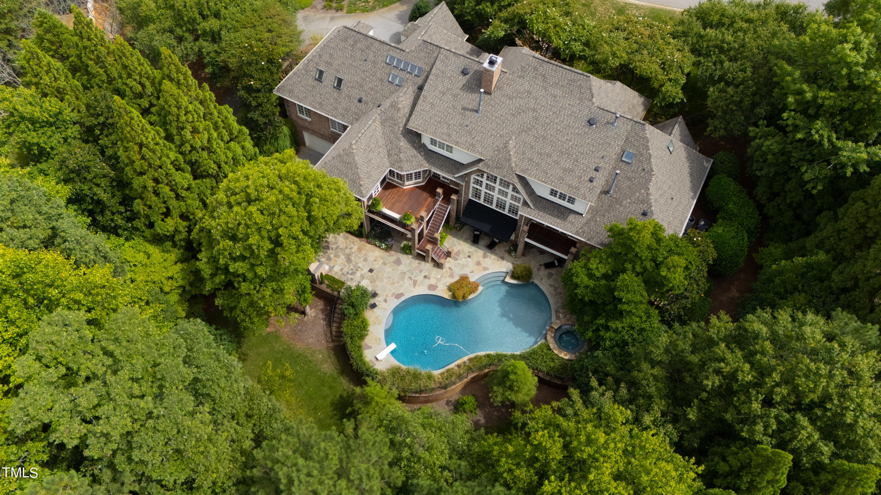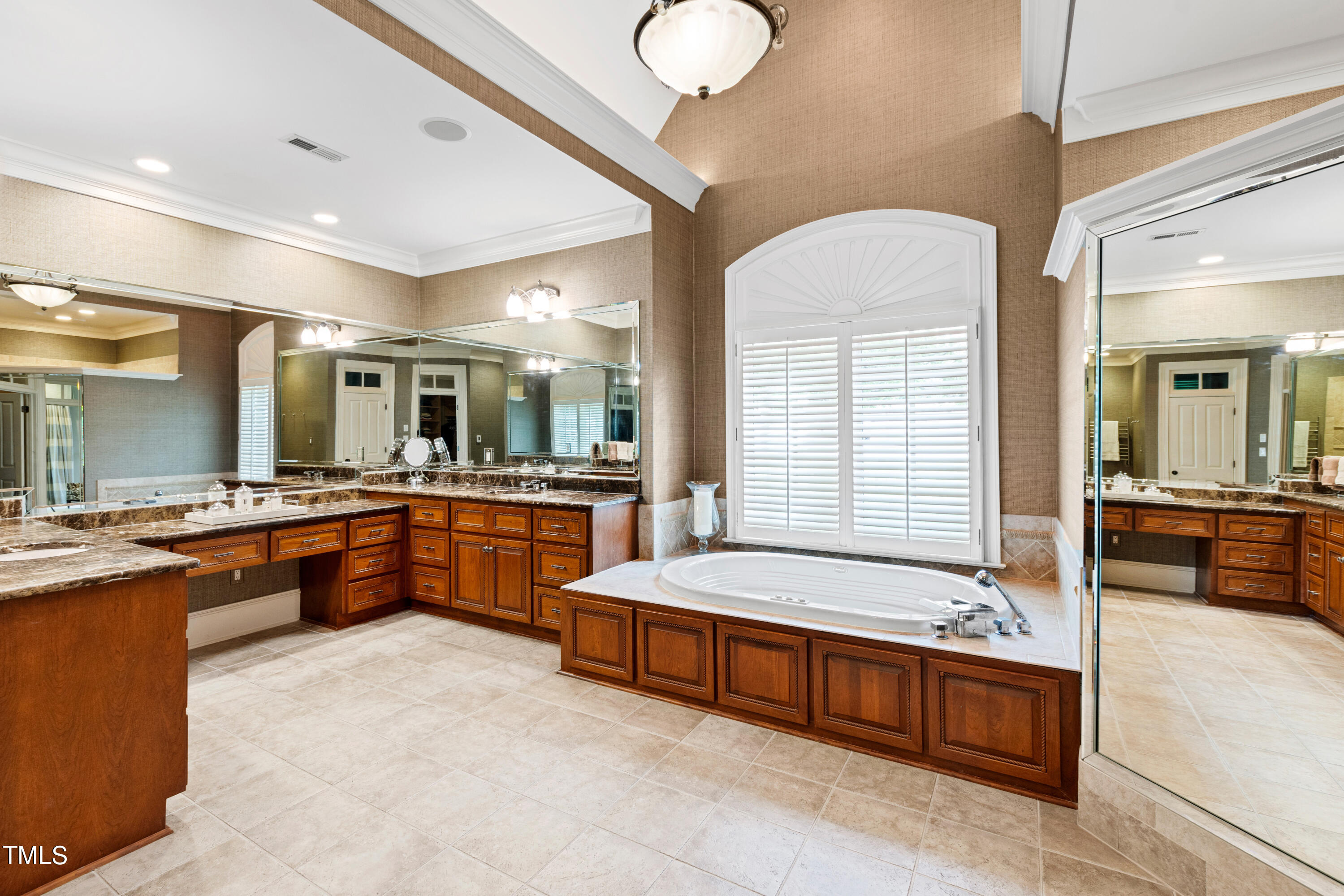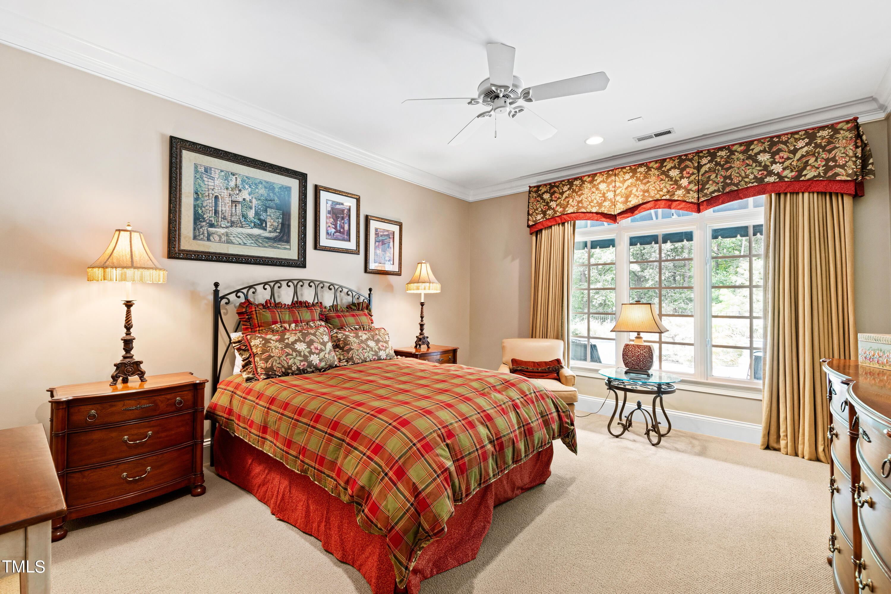 Nestled in mature trees and verdant landscaping in one of Cary's most prestigious neighborhoods, this beautiful nearly 10,000 sq-ft, Georgian- and Federal-inspired home offers six bedroom suites, five garage bays and a seemingly endless number of amenities. Its classic design, tasteful incorporation of both traditional and contemporary features, and highest quality materials and workmanship make it a standout among Regency Parkway area residences. At the end of a quiet cul-de-sac, the home's stately facade and majestic trees imply strength and security while a gently babbling water feature near the entry evokes a sense of calm abiding. Within, an air of relaxed luxury begins in the spacious foyer with its richly stained wood floor and soaring ceiling. A delicately curving staircase of polished wood and wrought iron rises to a second-level overlook.