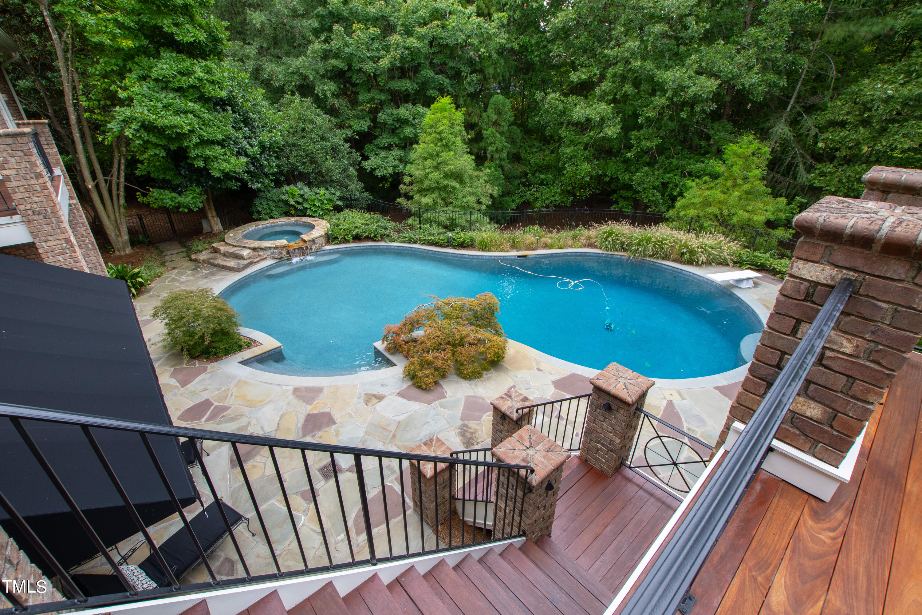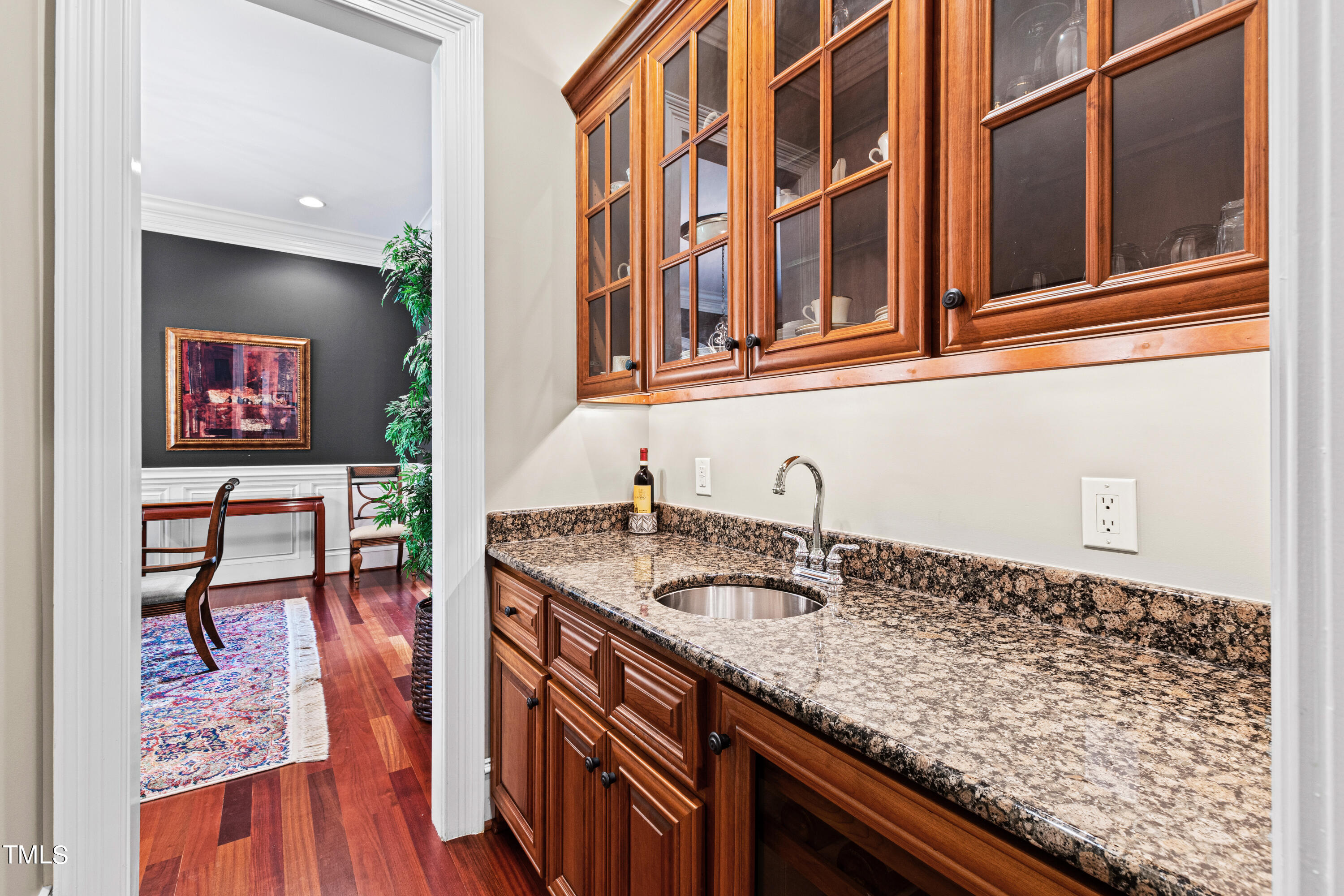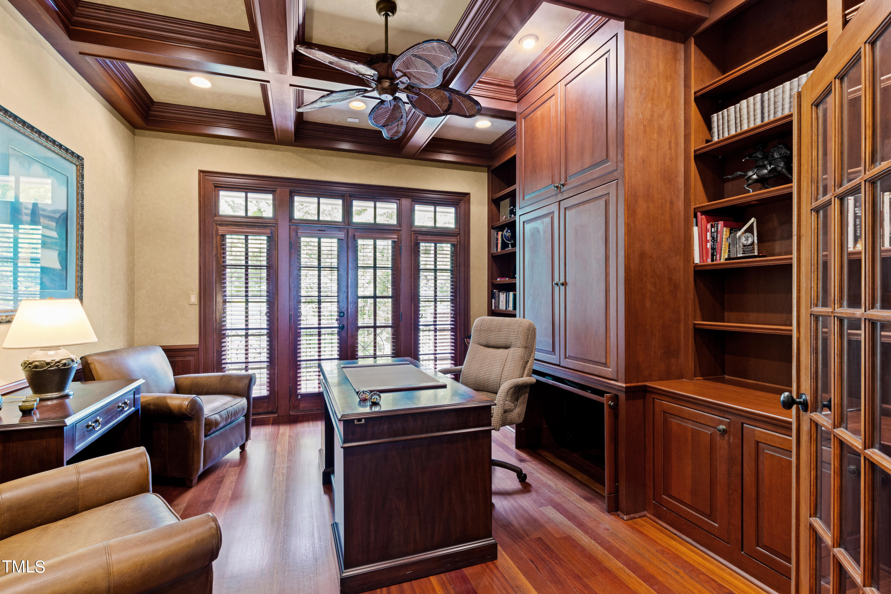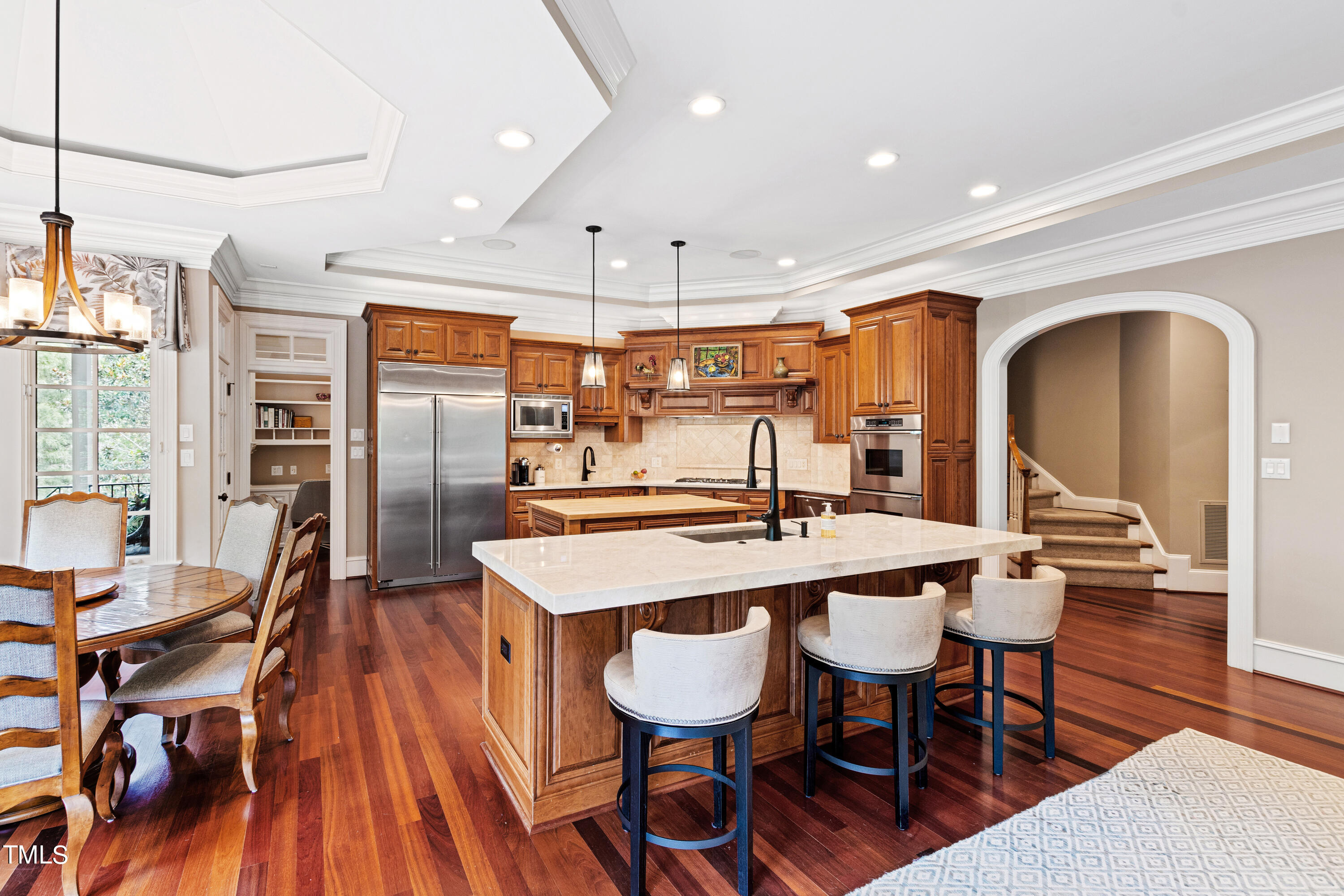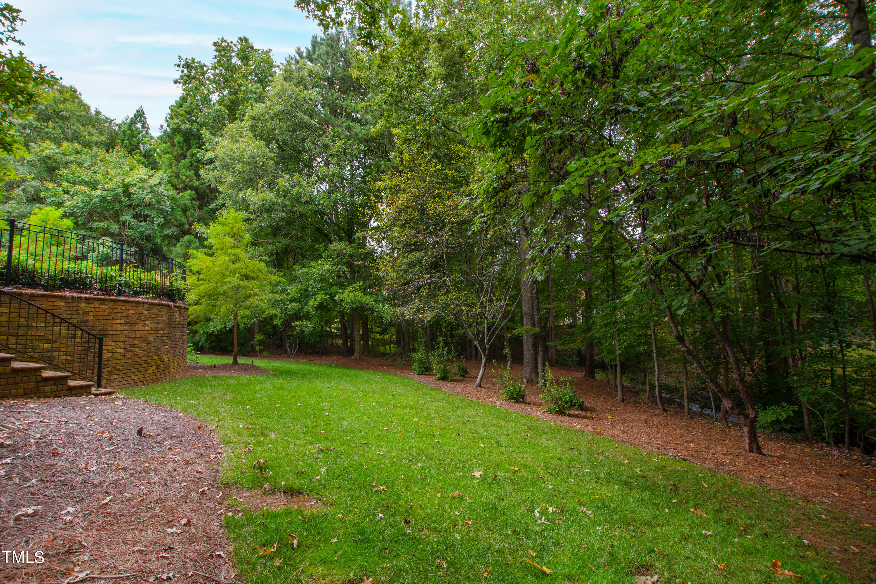 Nestled in mature trees and verdant landscaping in one of Cary's most prestigious neighborhoods, this beautiful nearly 10,000 sq-ft, Georgian- and Federal-inspired home offers six bedroom suites, five garage bays and a seemingly endless number of amenities. Its classic design, tasteful incorporation of both traditional and contemporary features, and highest quality materials and workmanship make it a standout among Regency Parkway area residences. At the end of a quiet cul-de-sac, the home's stately facade and majestic trees imply strength and security while a gently babbling water feature near the entry evokes a sense of calm abiding. Within, an air of relaxed luxury begins in the spacious foyer with its richly stained wood floor and soaring ceiling. A delicately curving staircase of polished wood and wrought iron rises to a second-level overlook.