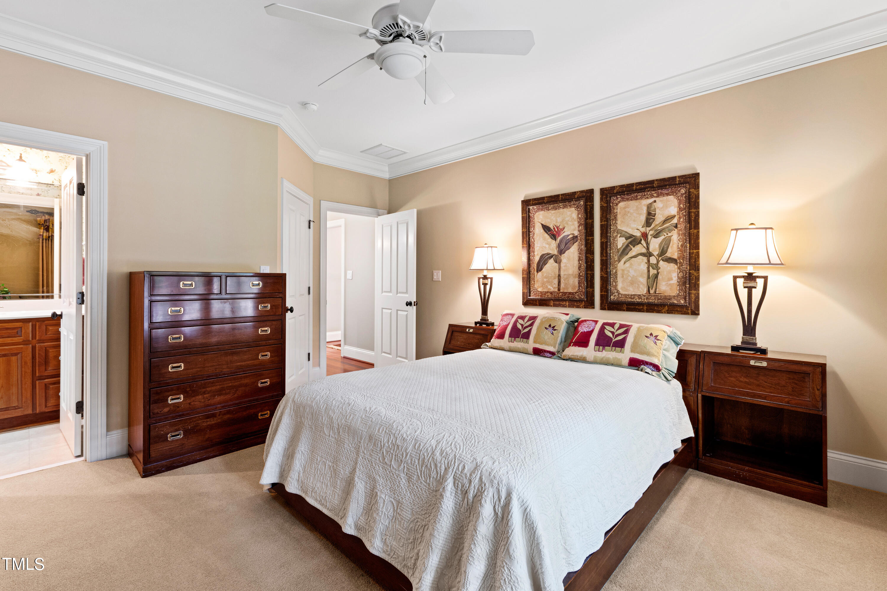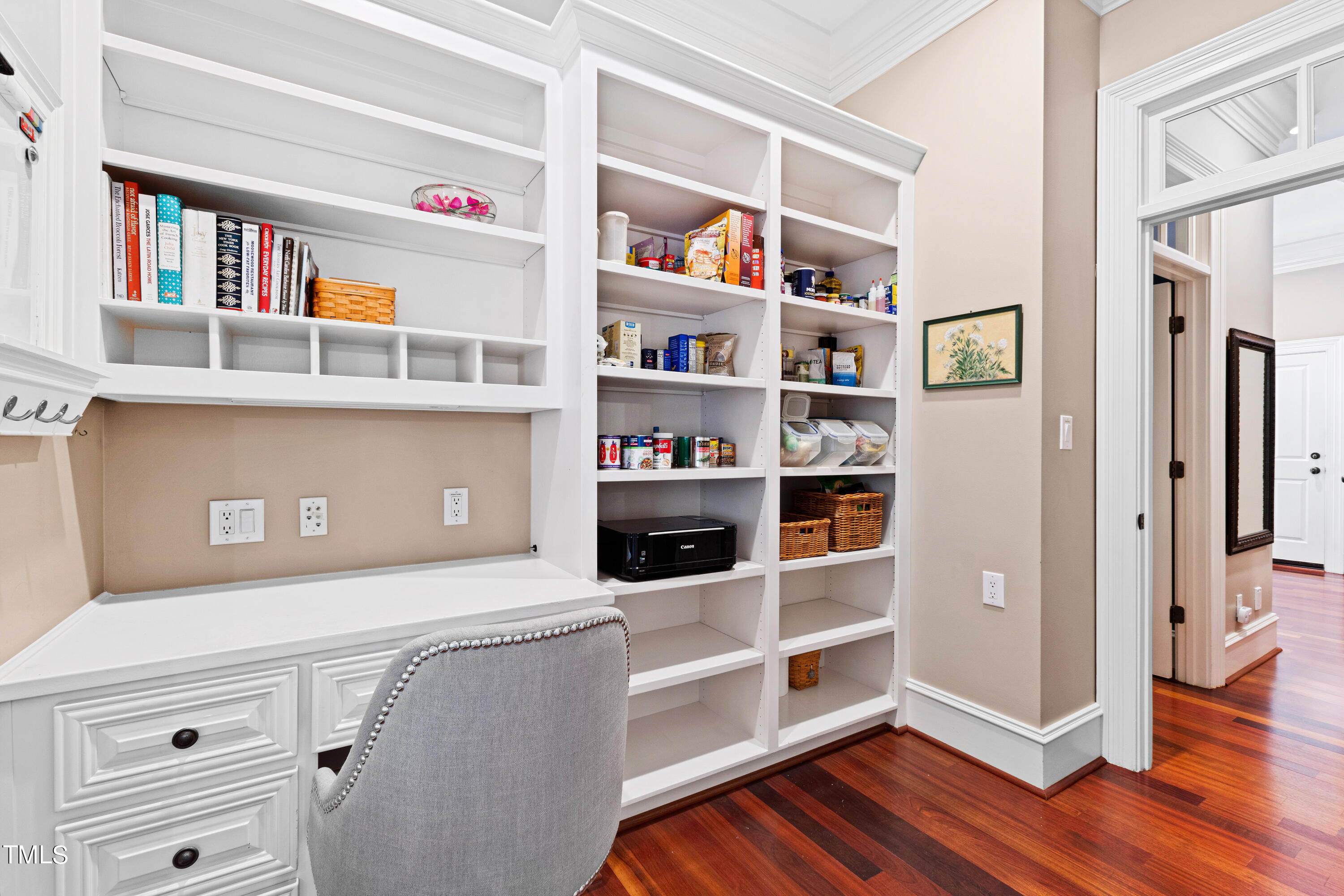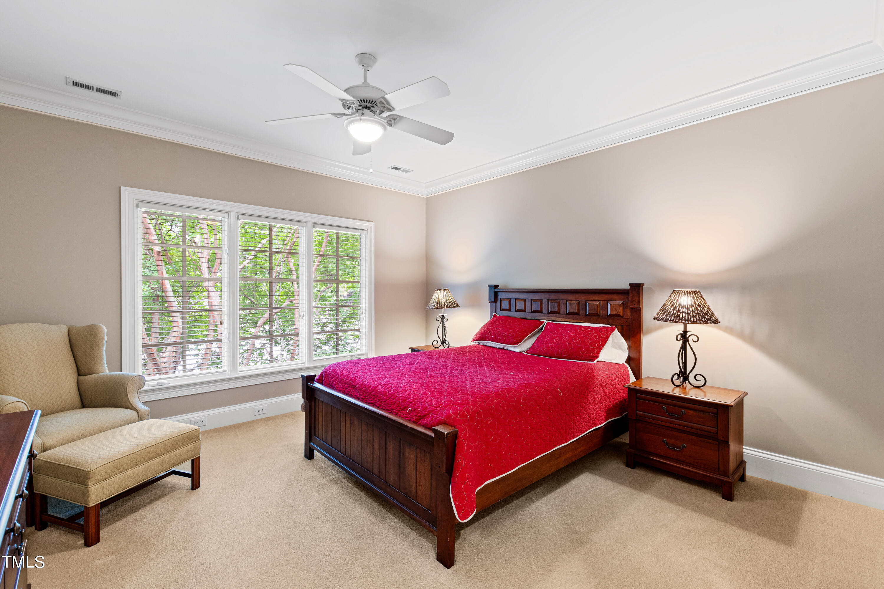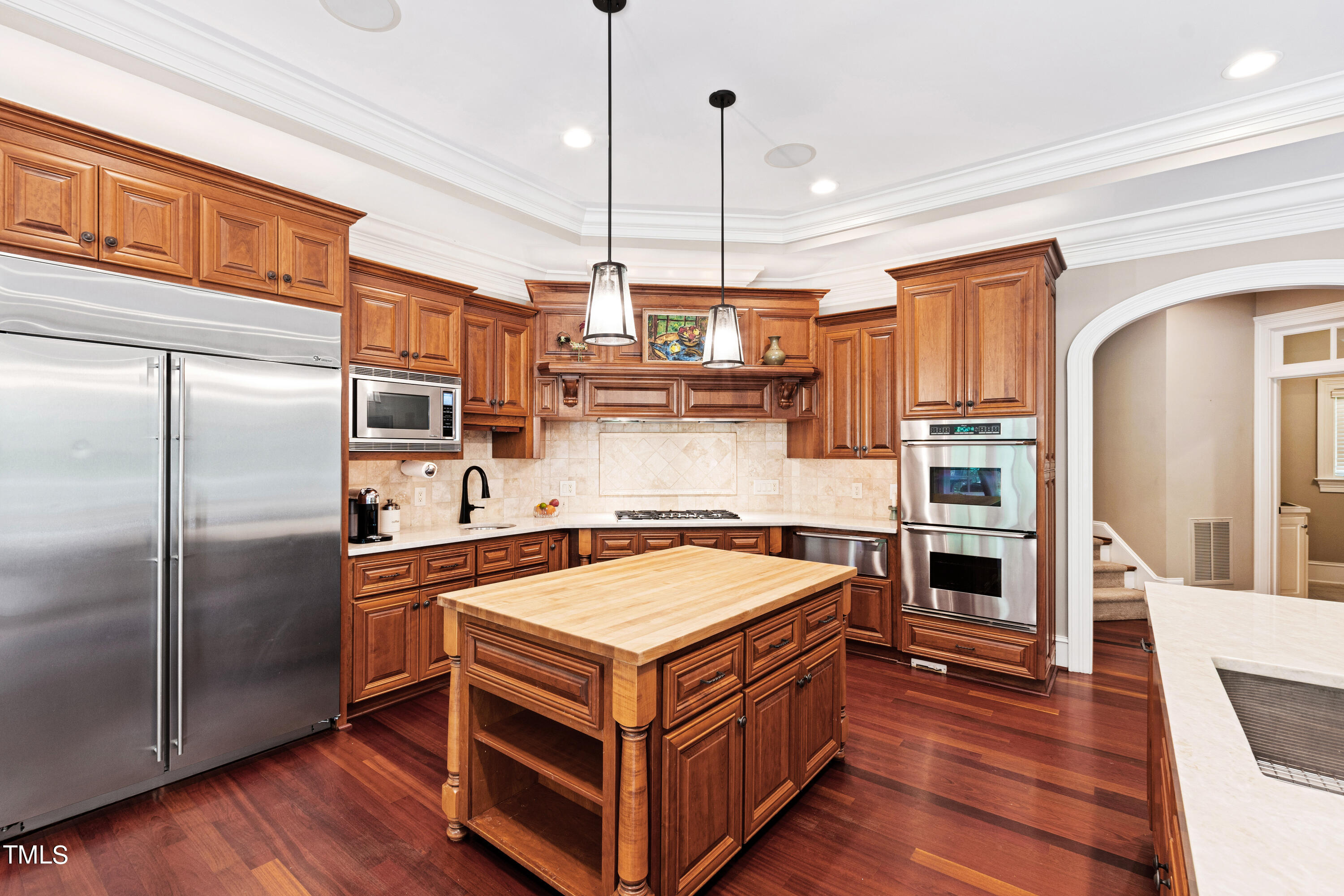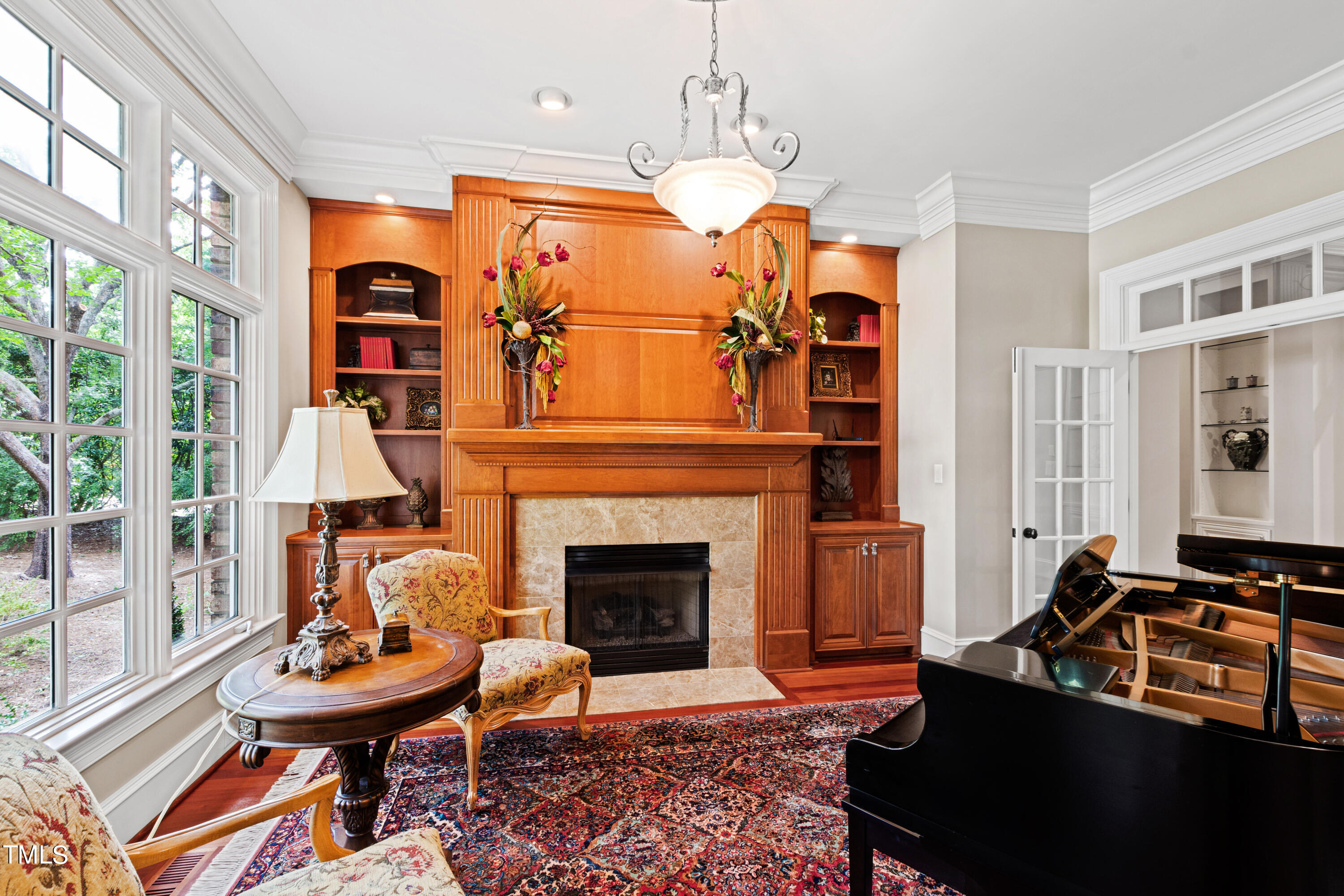 Nestled in mature trees and verdant landscaping in one of Cary's most prestigious neighborhoods, this beautiful nearly 10,000 sq-ft, Georgian- and Federal-inspired home offers six bedroom suites, five garage bays and a seemingly endless number of amenities. Its classic design, tasteful incorporation of both traditional and contemporary features, and highest quality materials and workmanship make it a standout among Regency Parkway area residences. At the end of a quiet cul-de-sac, the home's stately facade and majestic trees imply strength and security while a gently babbling water feature near the entry evokes a sense of calm abiding. Within, an air of relaxed luxury begins in the spacious foyer with its richly stained wood floor and soaring ceiling. A delicately curving staircase of polished wood and wrought iron rises to a second-level overlook.