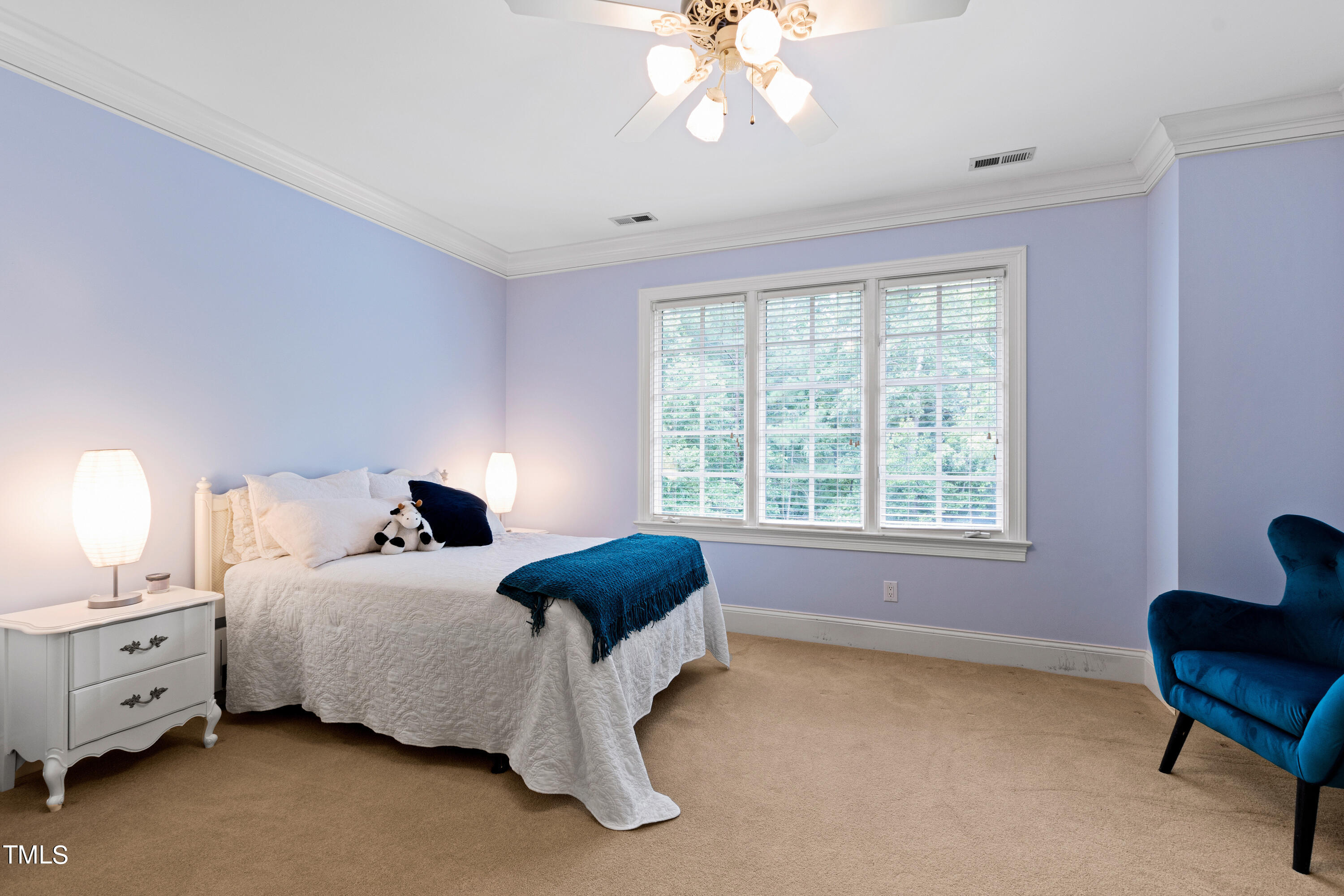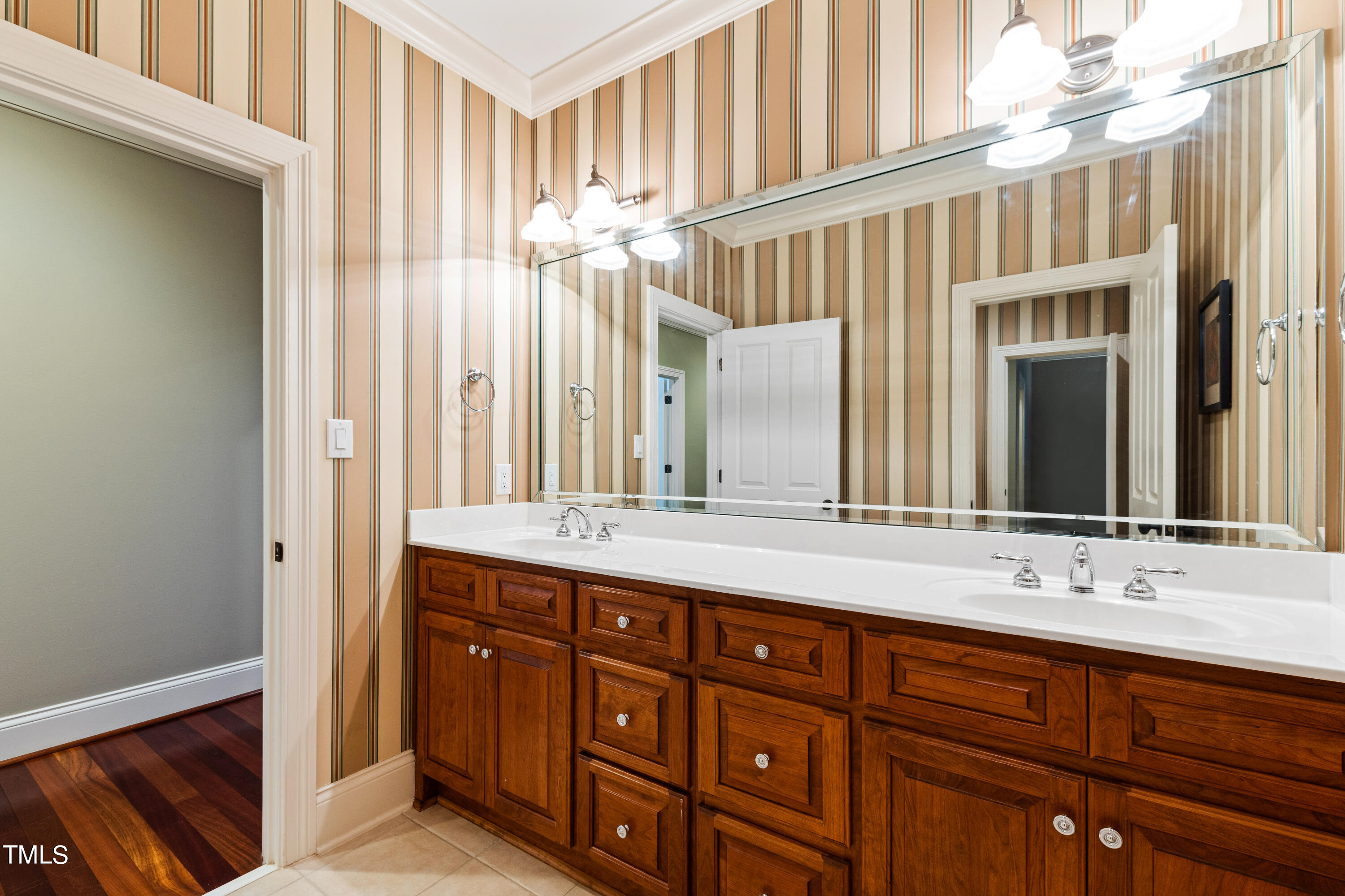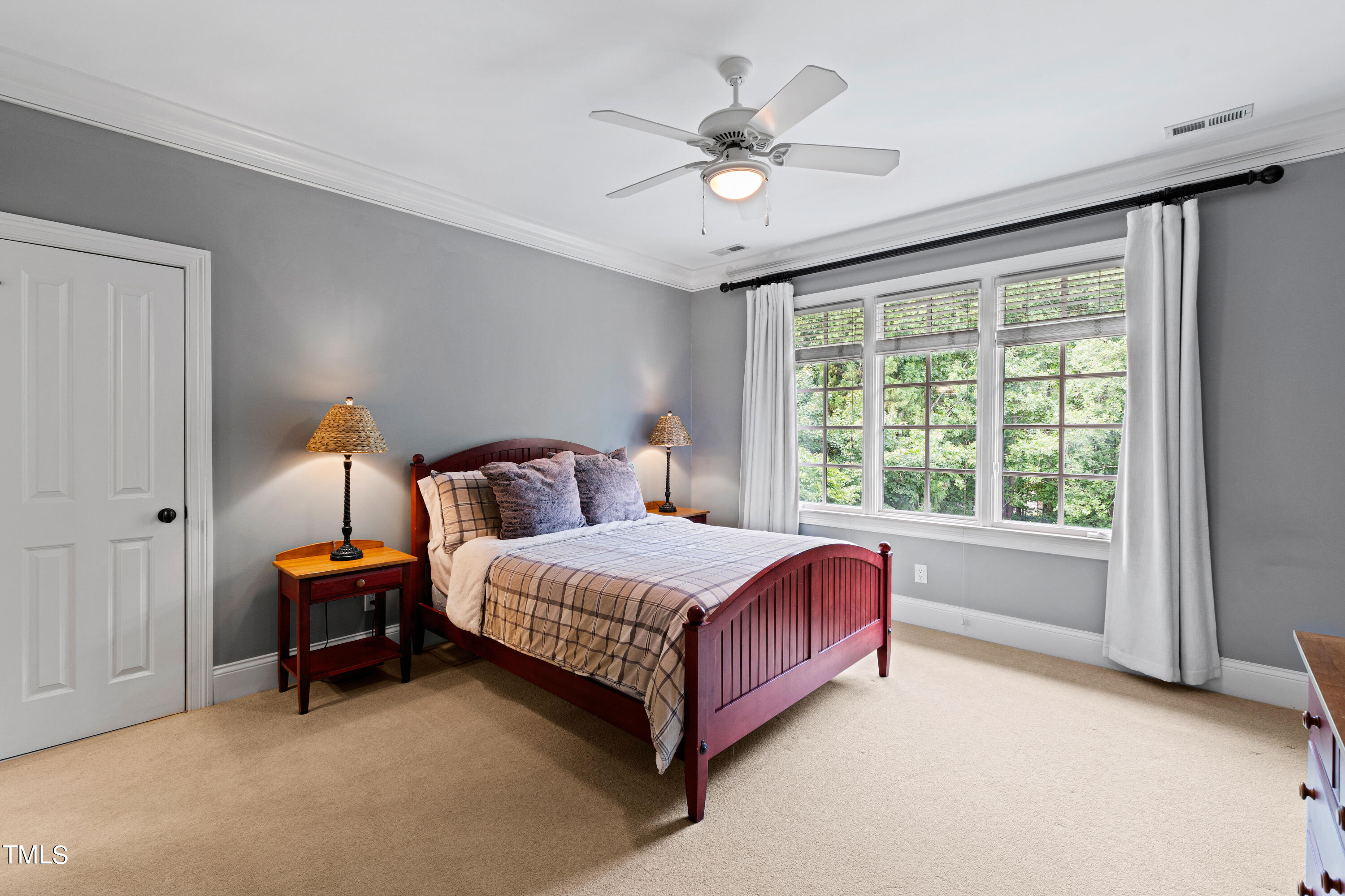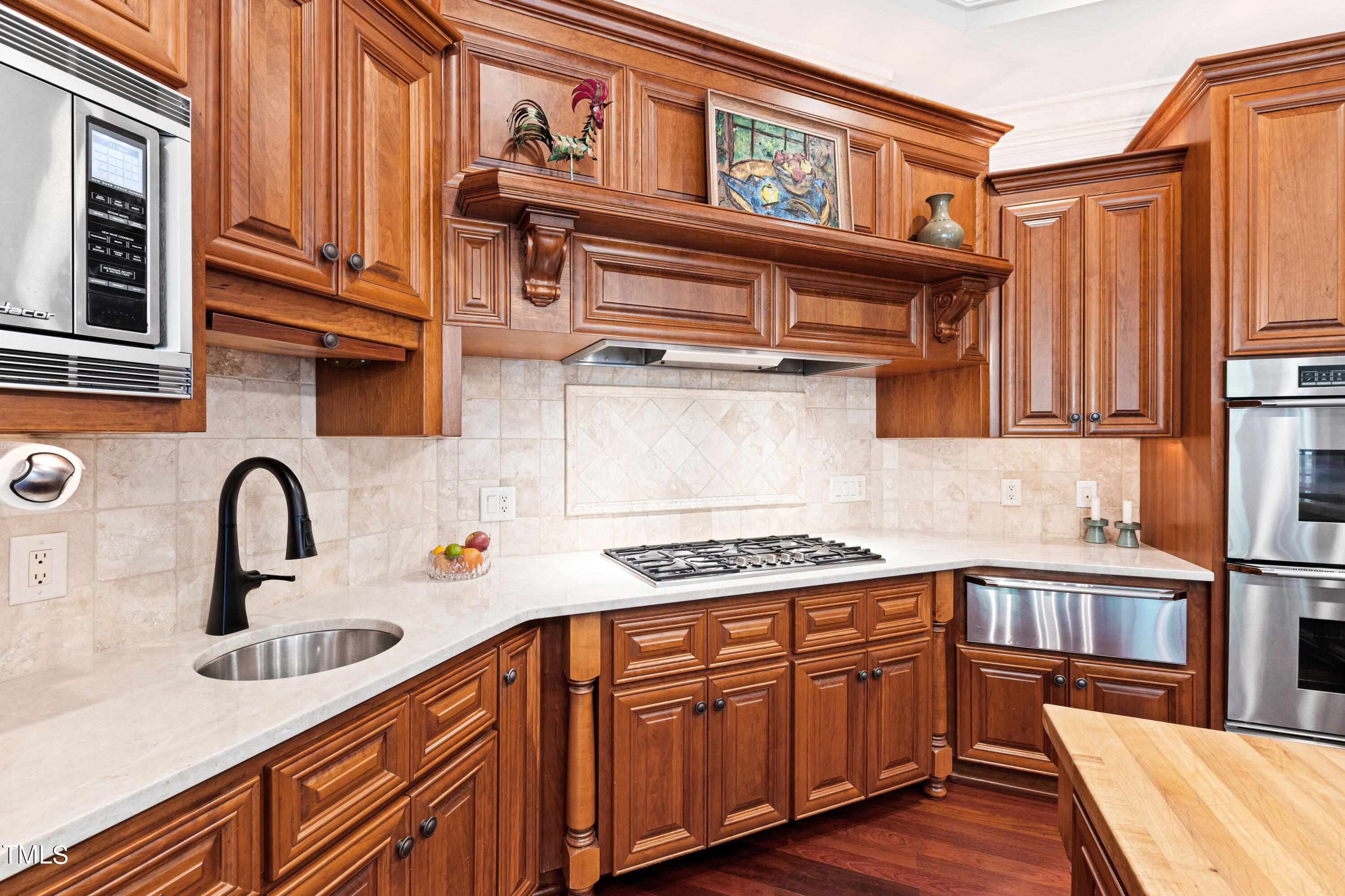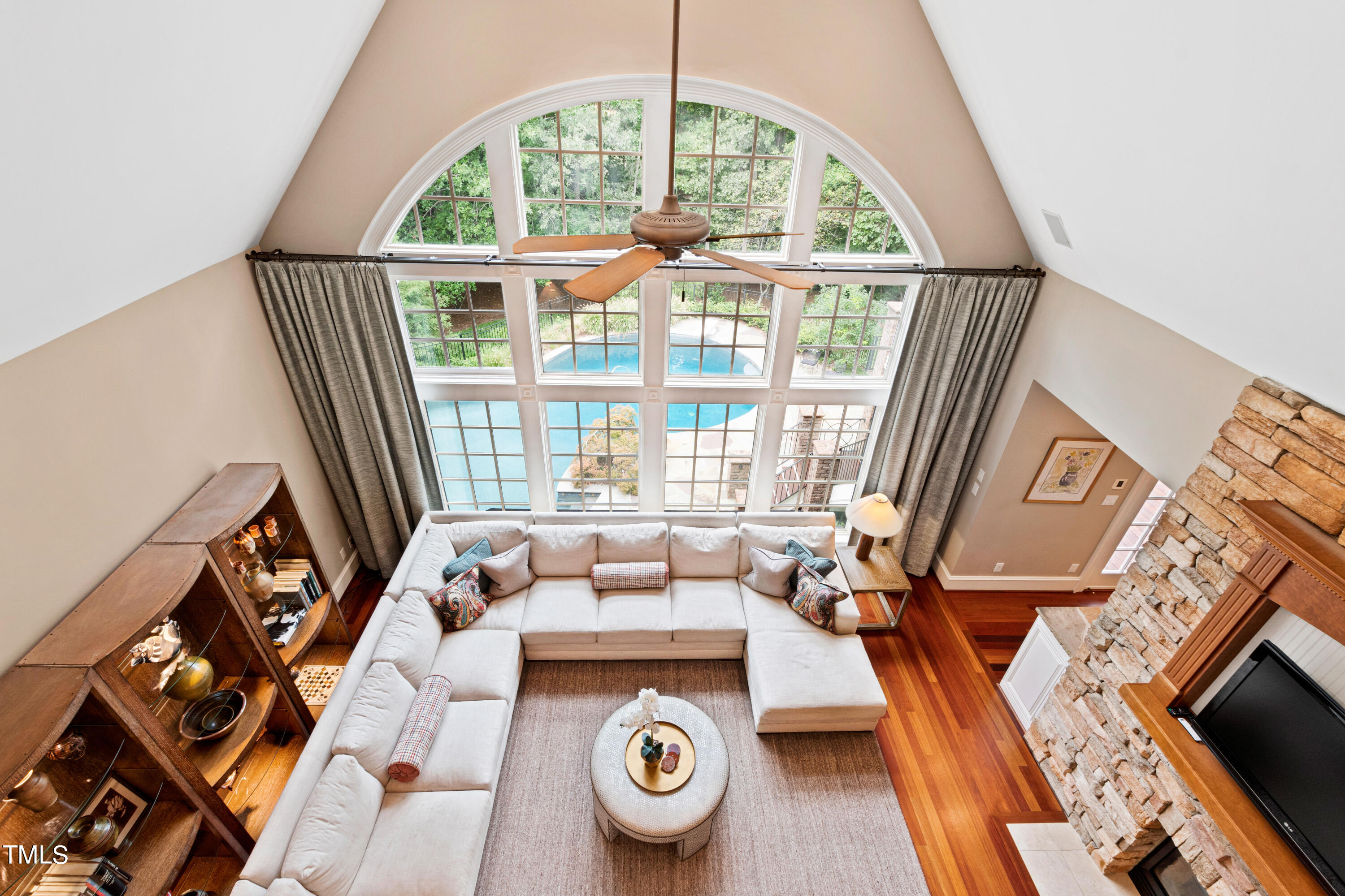 Nestled in mature trees and verdant landscaping in one of Cary's most prestigious neighborhoods, this beautiful nearly 10,000 sq-ft, Georgian- and Federal-inspired home offers six bedroom suites, five garage bays and a seemingly endless number of amenities. Its classic design, tasteful incorporation of both traditional and contemporary features, and highest quality materials and workmanship make it a standout among Regency Parkway area residences. At the end of a quiet cul-de-sac, the home's stately facade and majestic trees imply strength and security while a gently babbling water feature near the entry evokes a sense of calm abiding. Within, an air of relaxed luxury begins in the spacious foyer with its richly stained wood floor and soaring ceiling. A delicately curving staircase of polished wood and wrought iron rises to a second-level overlook.