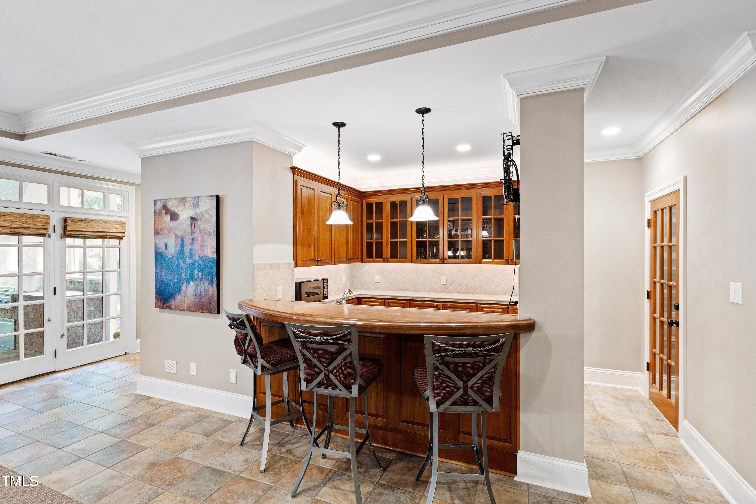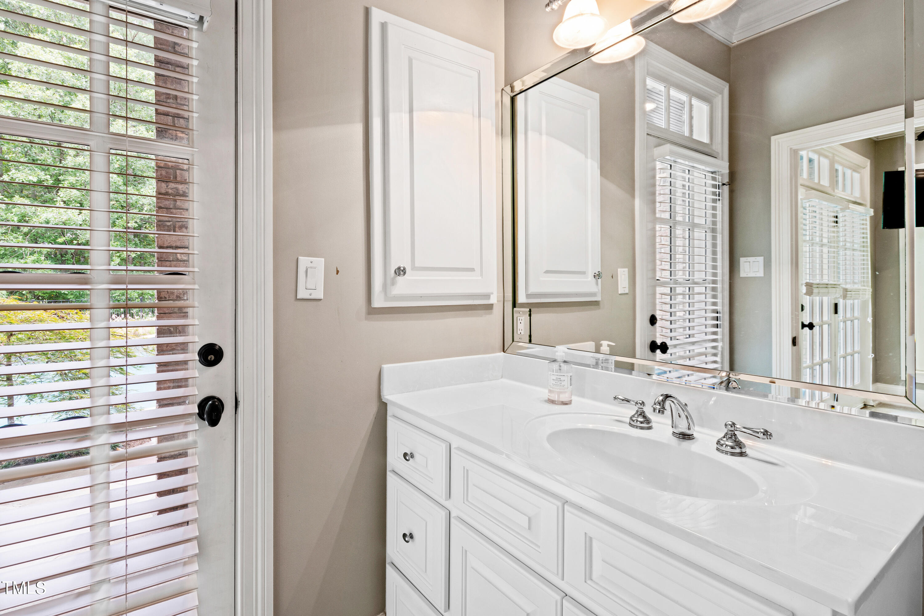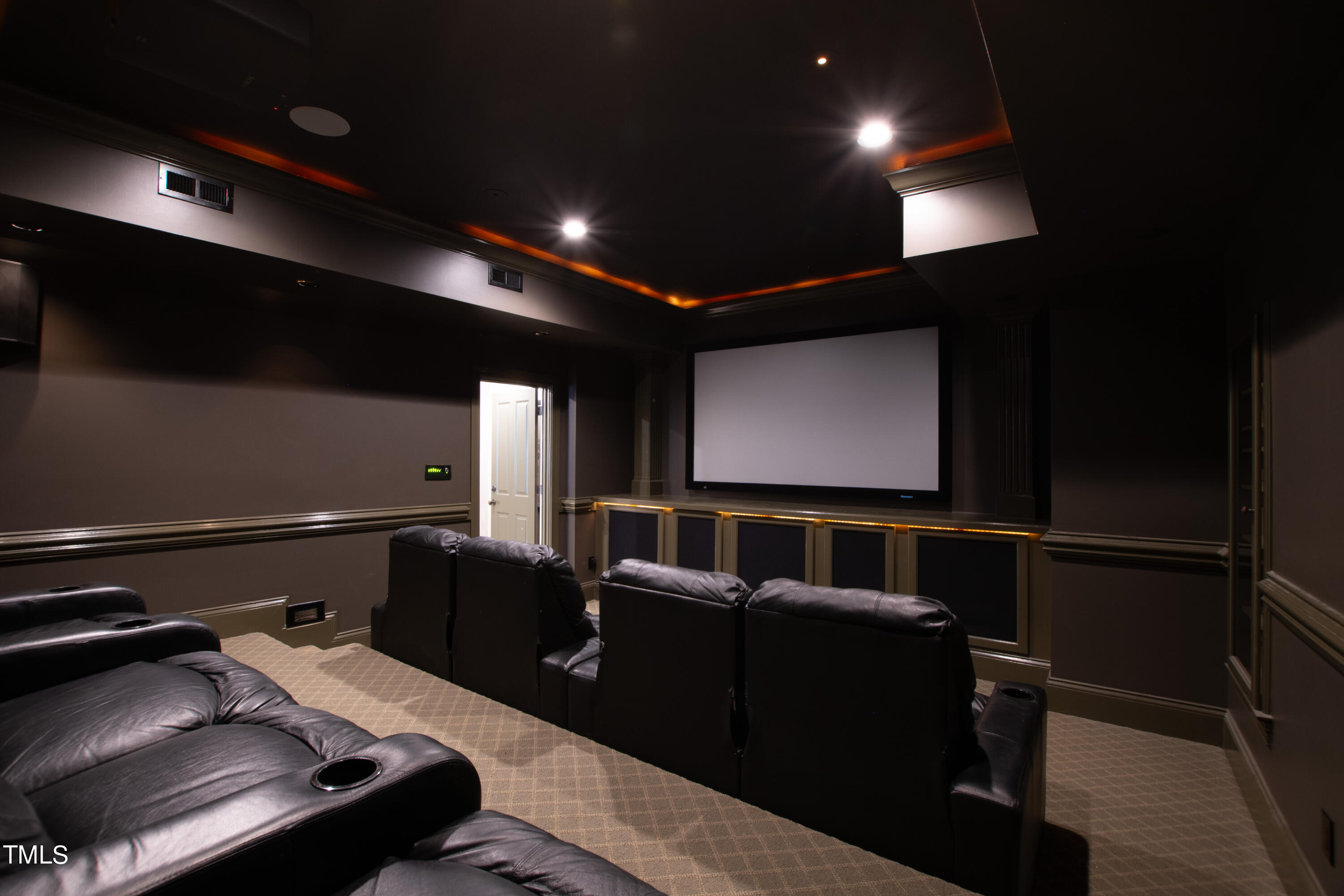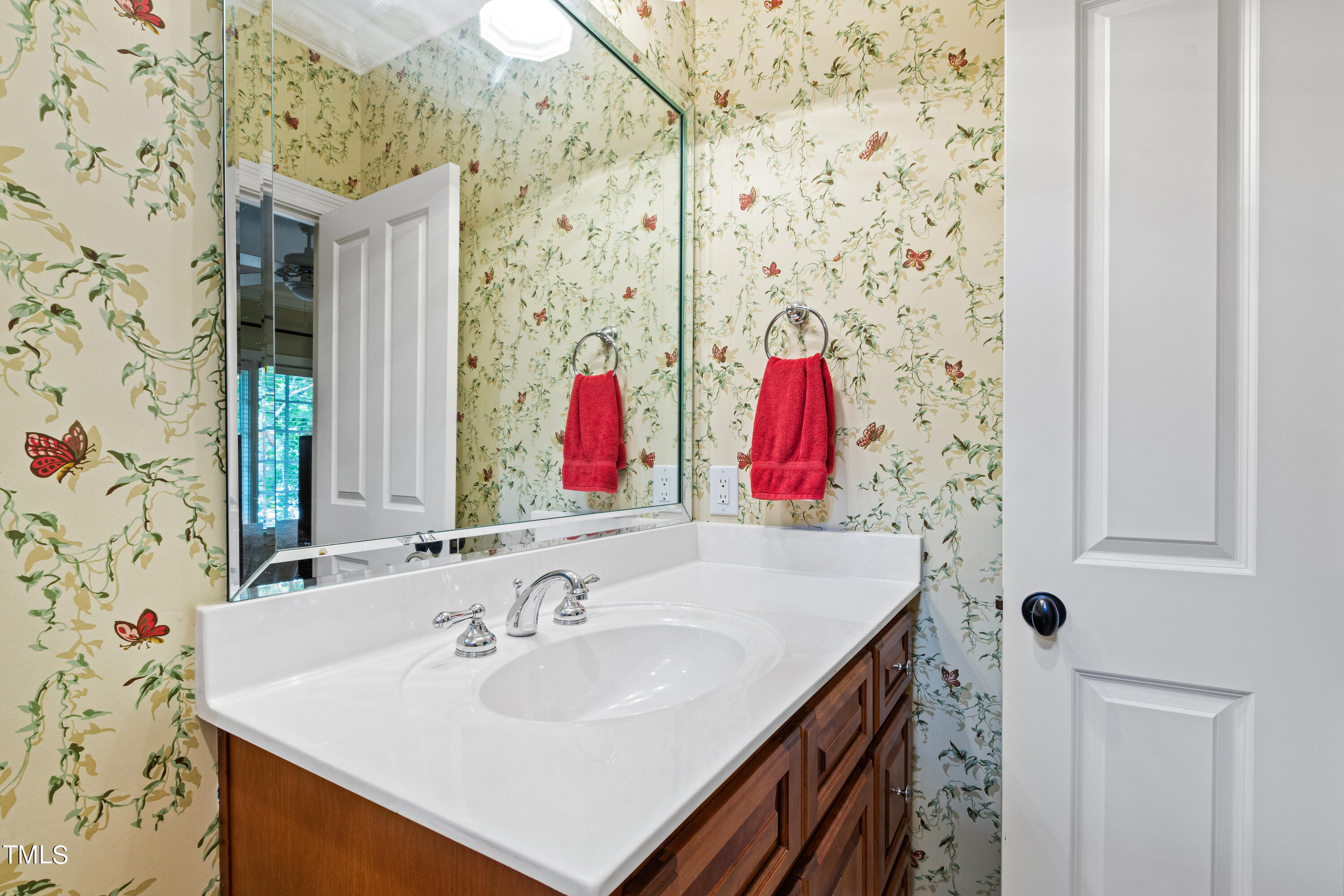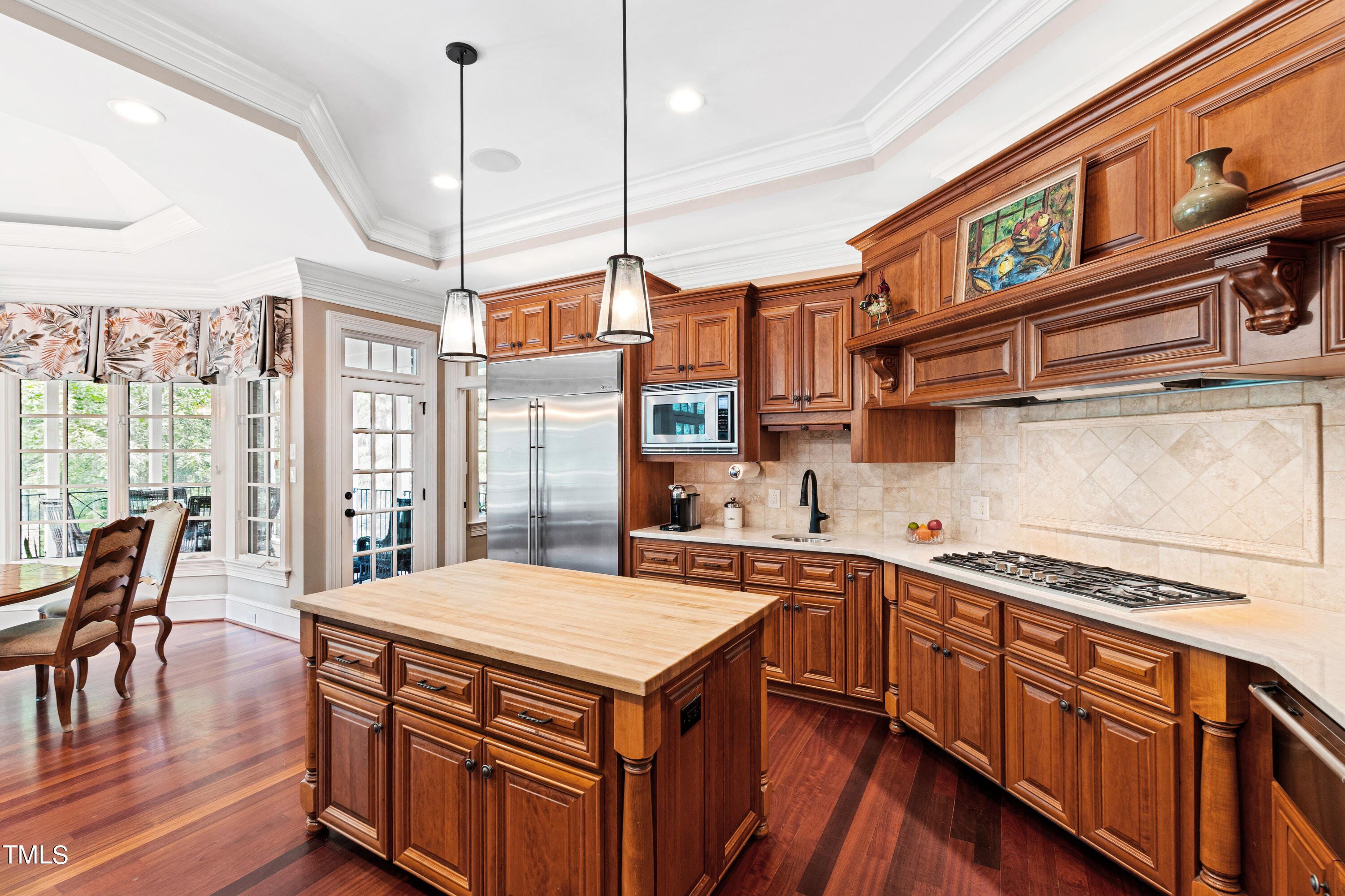Nestled in mature trees and verdant landscaping in one of Cary's most prestigious neighborhoods, this beautiful nearly 10,000 sq-ft, Georgian- and Federal-inspired home offers six bedroom suites, five garage bays and a seemingly endless number of amenities. Its classic design, tasteful incorporation of both traditional and contemporary features, and highest quality materials and workmanship make it a standout among Regency Parkway area residences. At the end of a quiet cul-de-sac, the home's stately facade and majestic trees imply strength and security while a gently babbling water feature near the entry evokes a sense of calm abiding. Within, an air of relaxed luxury begins in the spacious foyer with its richly stained wood floor and soaring ceiling. A delicately curving staircase of polished wood and wrought iron rises to a second-level overlook.