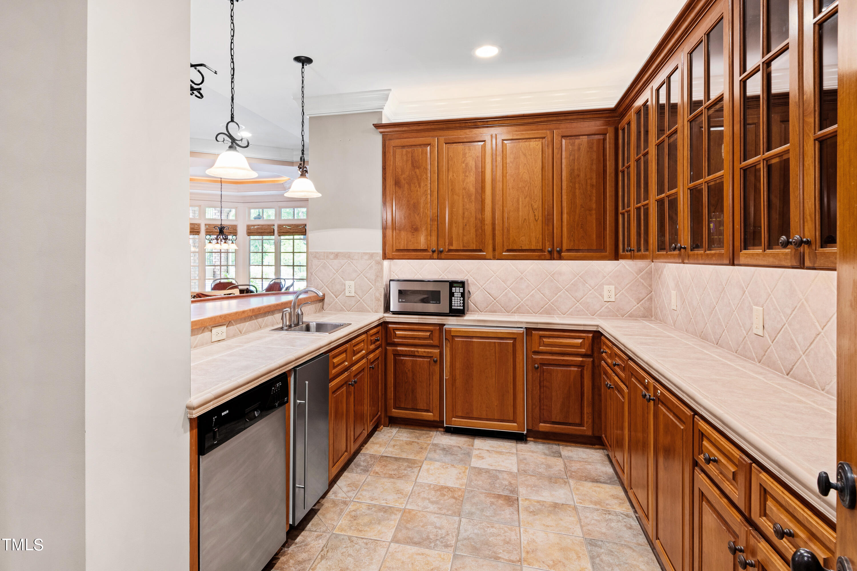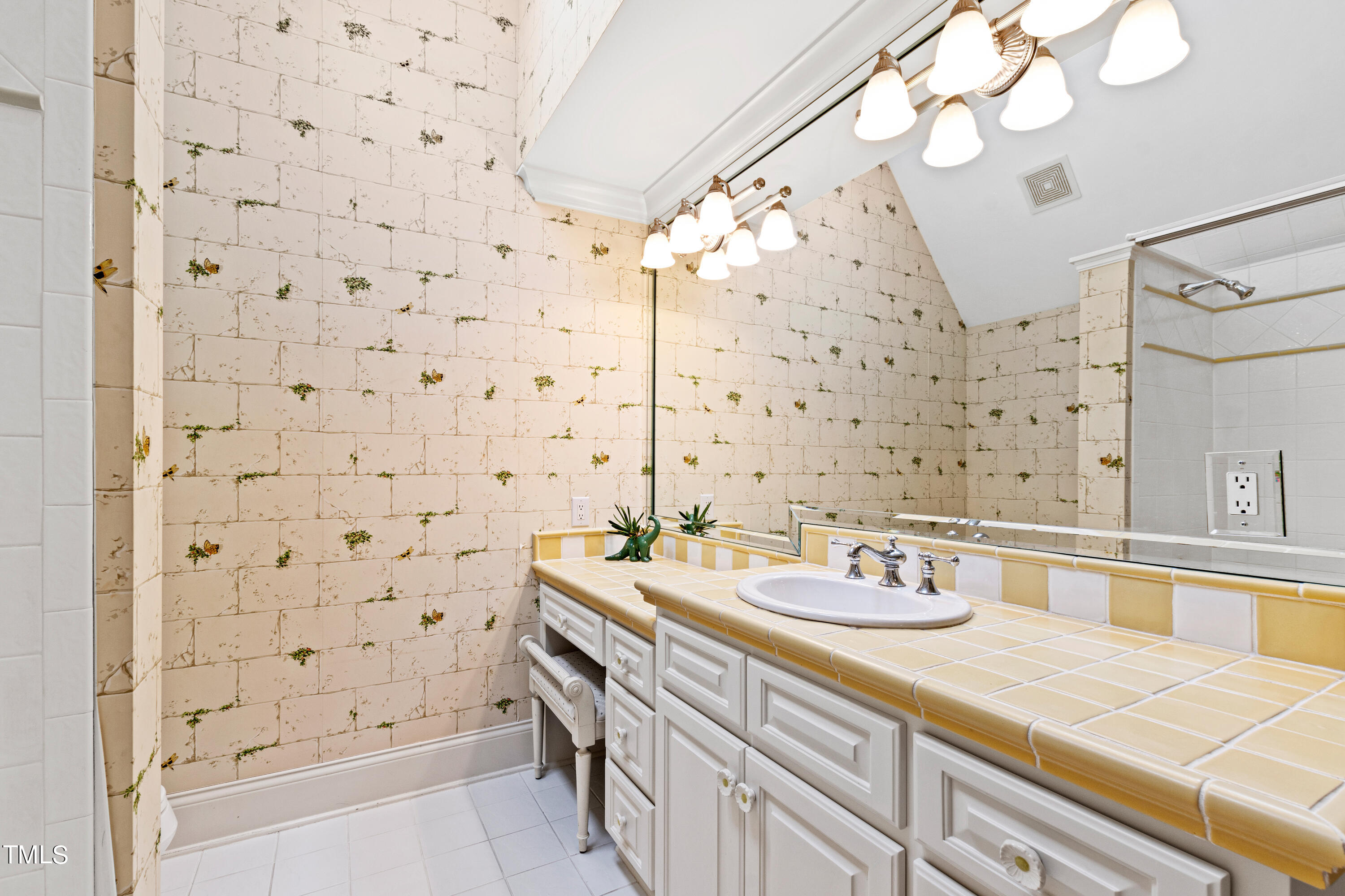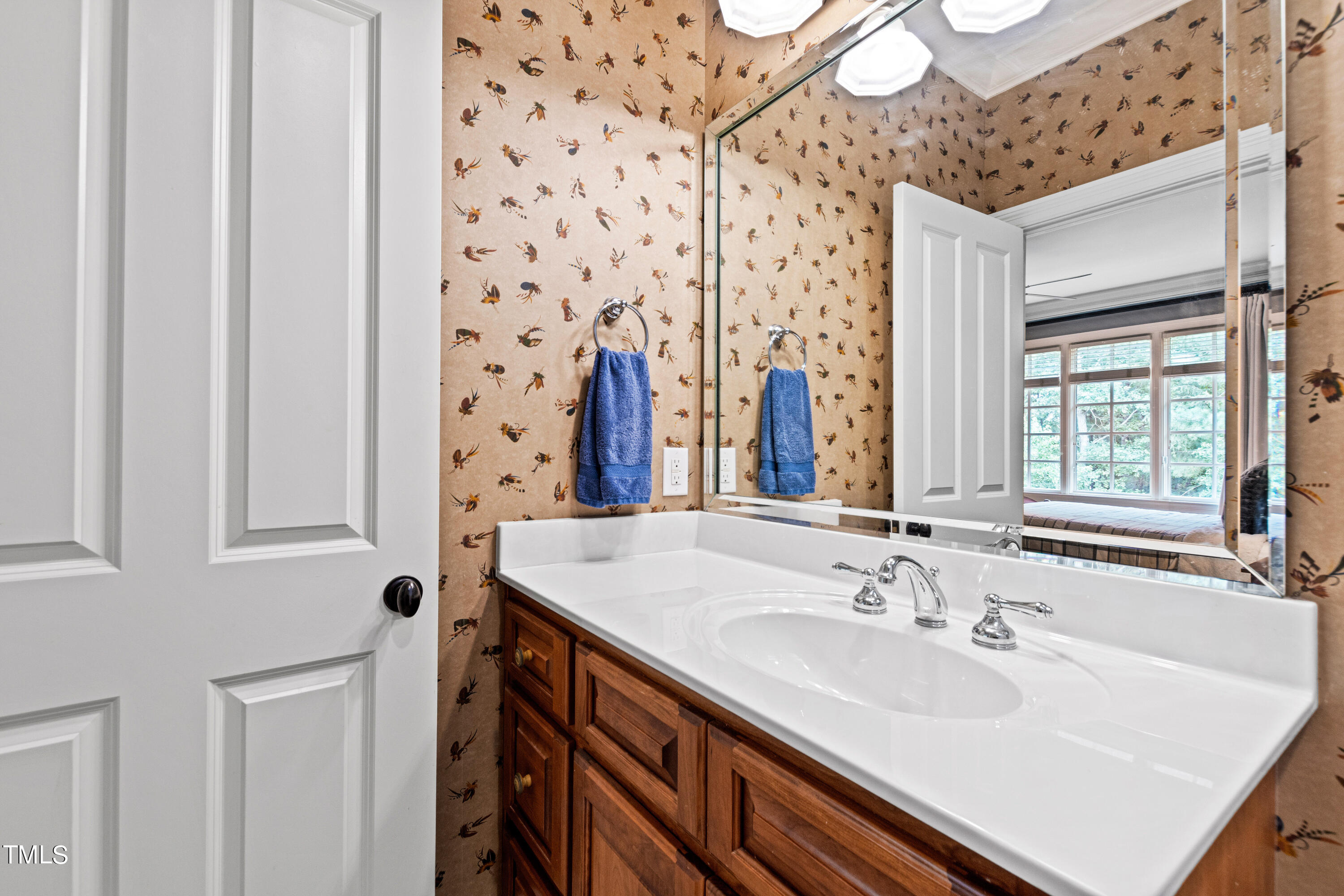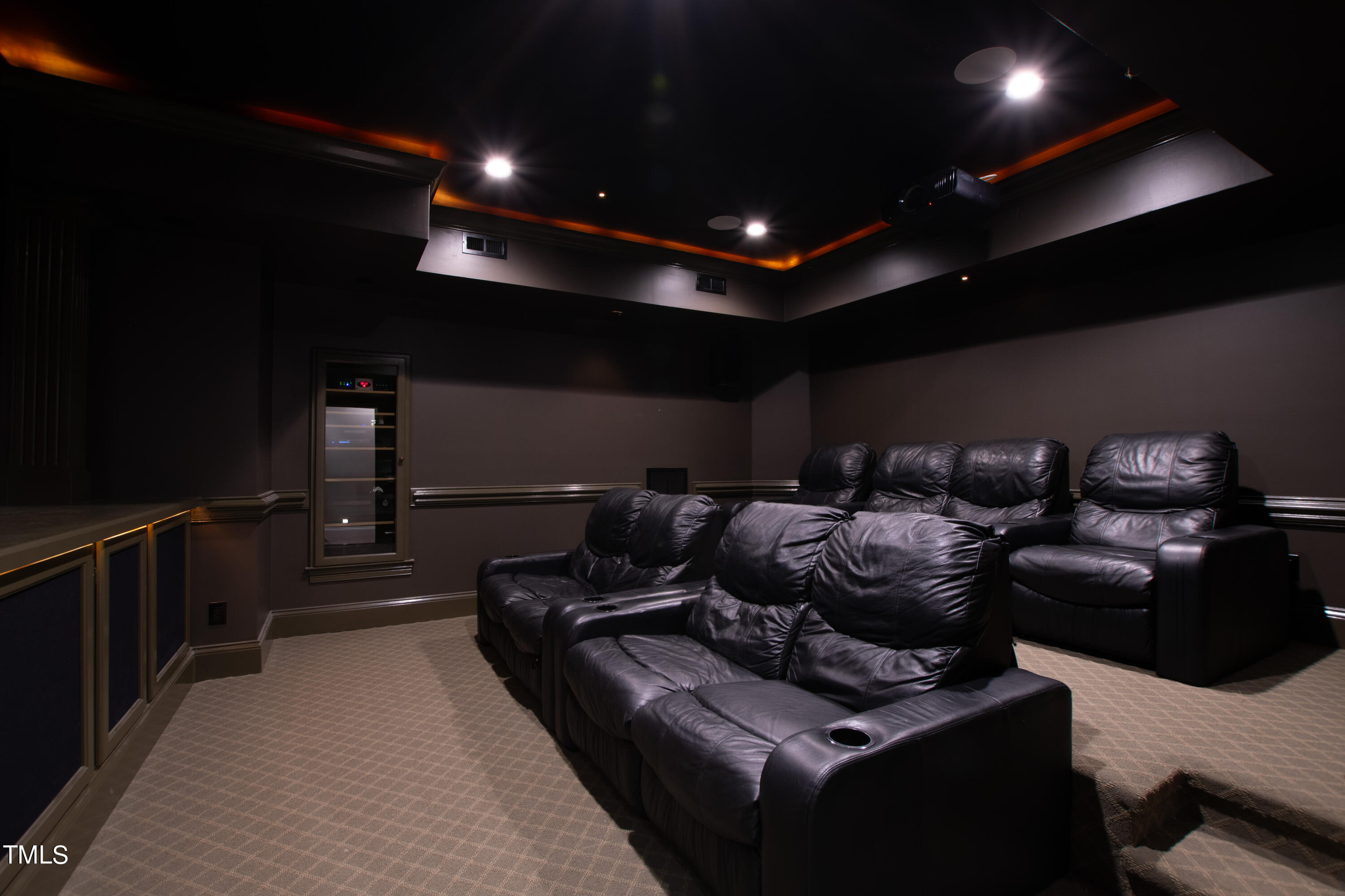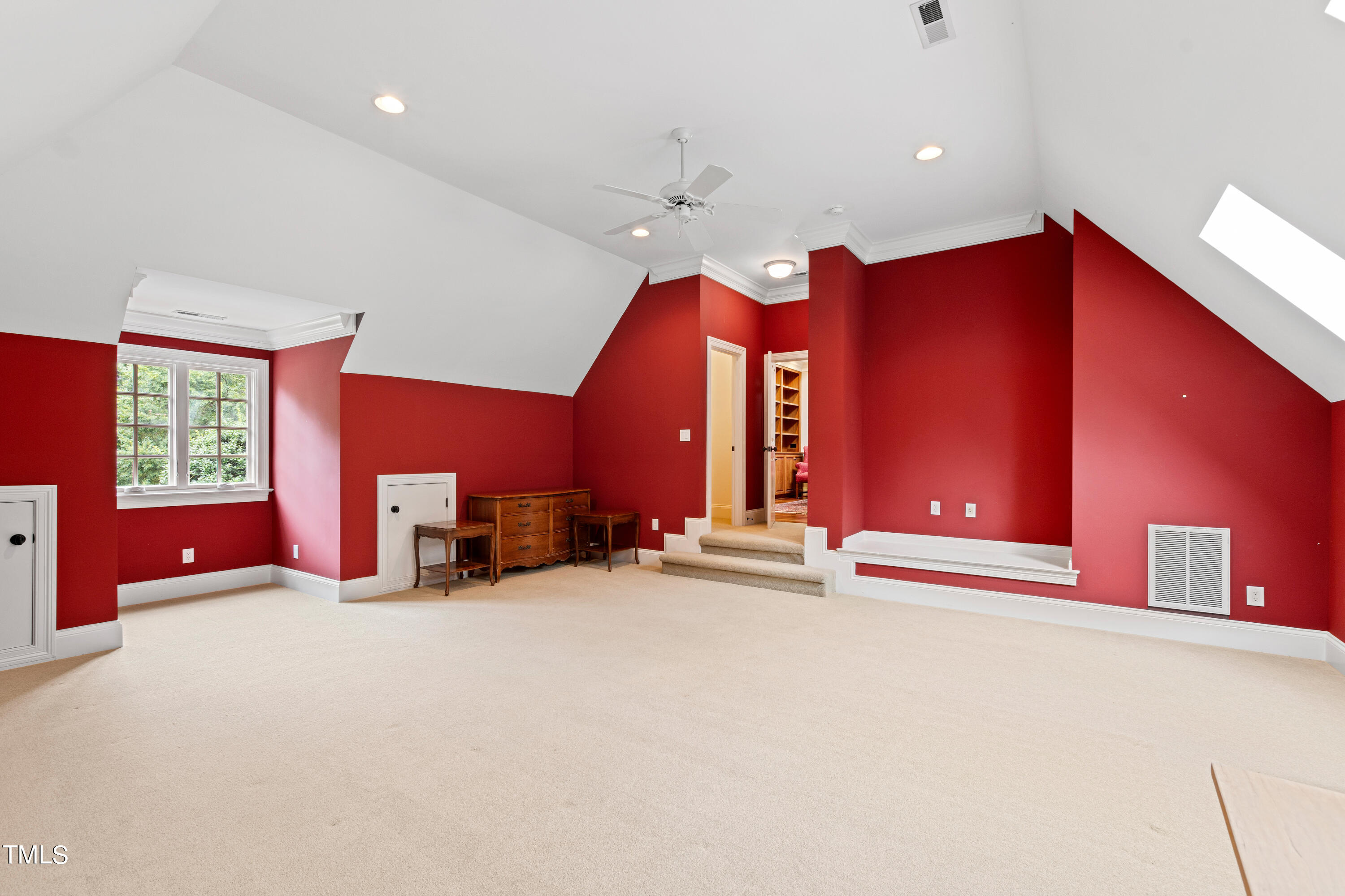 Nestled in mature trees and verdant landscaping in one of Cary's most prestigious neighborhoods, this beautiful nearly 10,000 sq-ft, Georgian- and Federal-inspired home offers six bedroom suites, five garage bays and a seemingly endless number of amenities. Its classic design, tasteful incorporation of both traditional and contemporary features, and highest quality materials and workmanship make it a standout among Regency Parkway area residences. At the end of a quiet cul-de-sac, the home's stately facade and majestic trees imply strength and security while a gently babbling water feature near the entry evokes a sense of calm abiding. Within, an air of relaxed luxury begins in the spacious foyer with its richly stained wood floor and soaring ceiling. A delicately curving staircase of polished wood and wrought iron rises to a second-level overlook.
