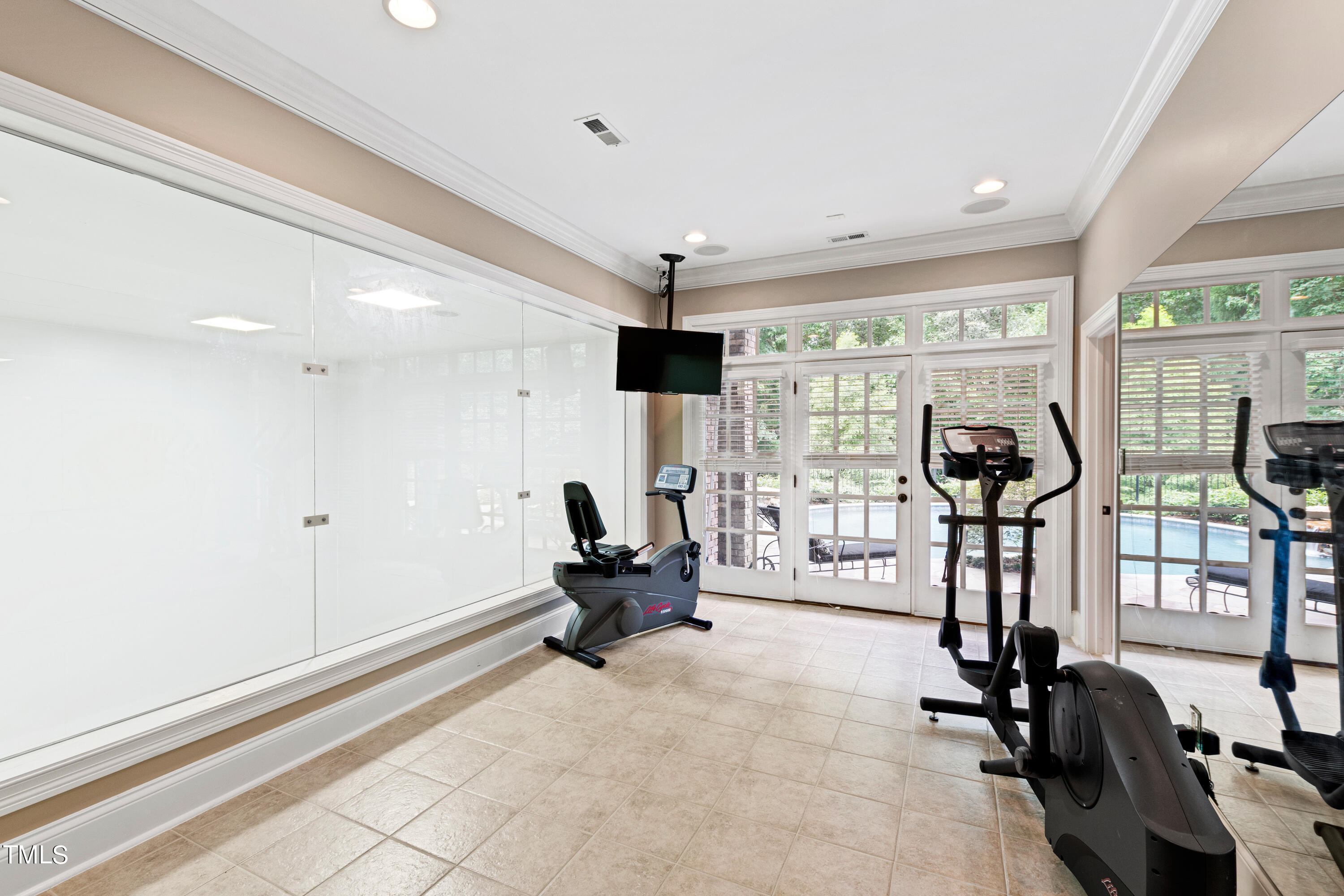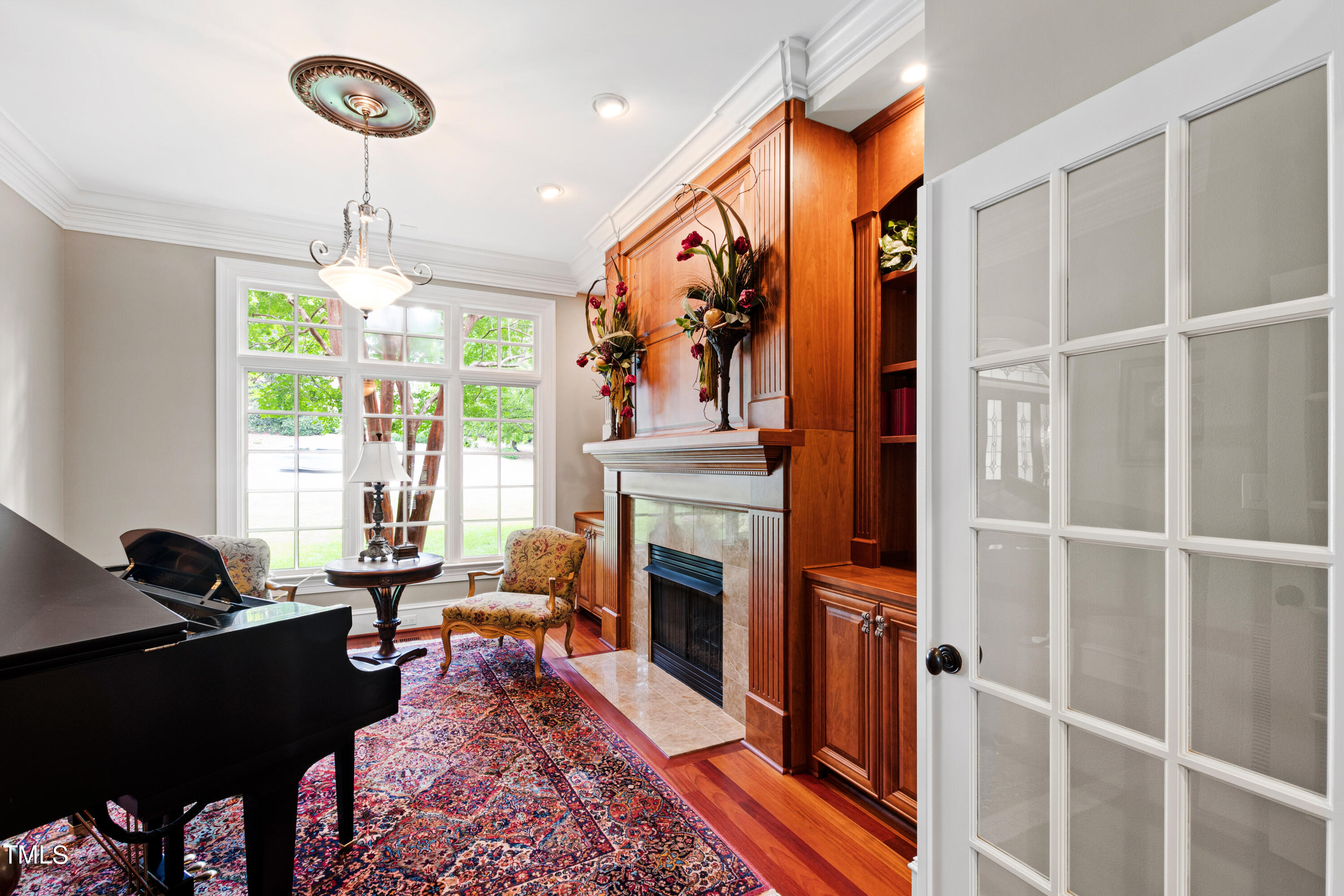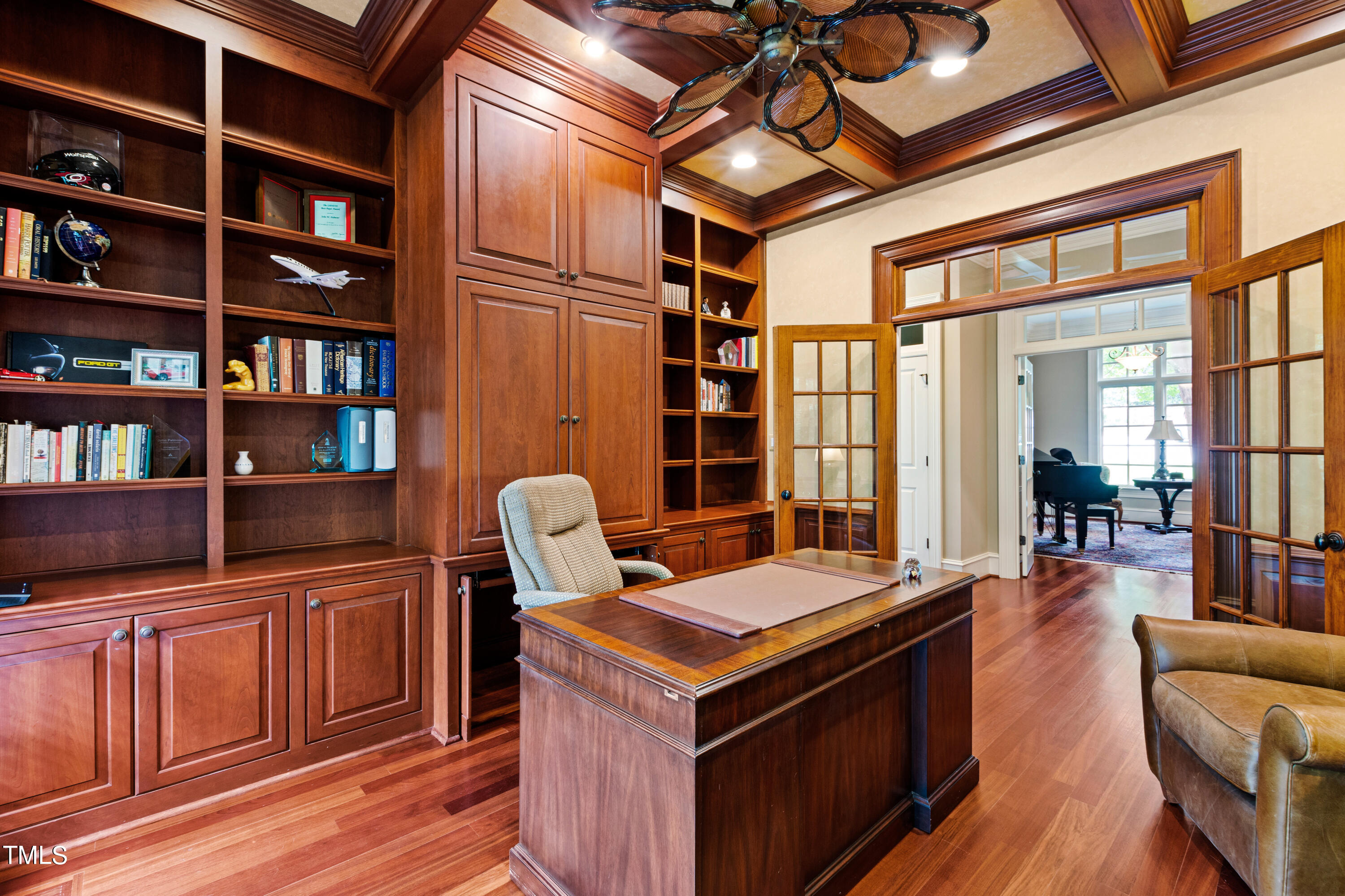 lovely crown molding, wainscoting, and triptych of multi-pane windows looking out to the alluring grounds. Across the foyer and through French doors, the study provides a
