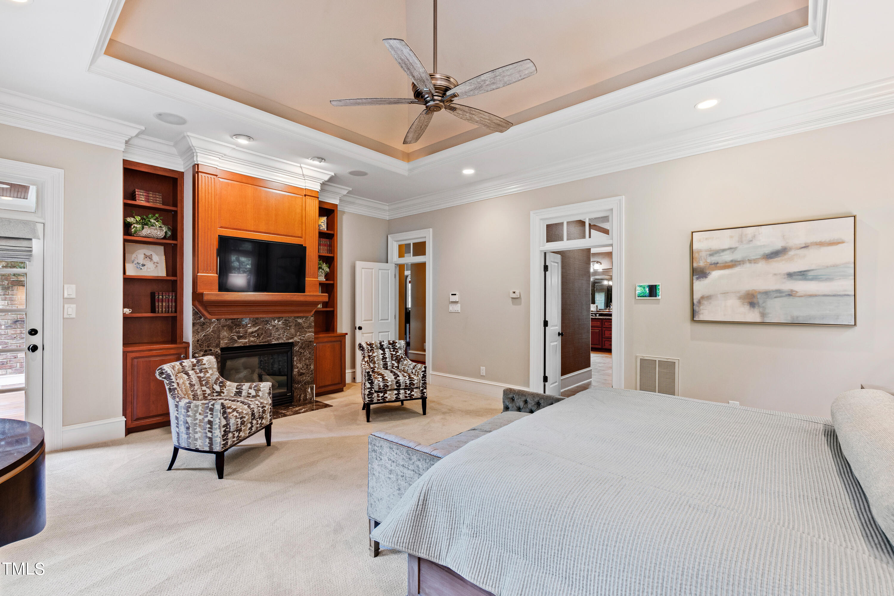 adjacent deck makes al fresco dining a must-do option. The bedroom suites of this extraordinary home are designed for optimum comfort and are located to ensure utmost privacy. The impressive primary suite, for example, is conveniently though discreetly placed on the home's main level. There are spaciousness, serenity, and enjoyable design features here, such as a tray ceiling, handsome fireplace, and sumptuous amenities including two walk-in closets and a luxurious bath. The lavish bath offers dual sinks and vanities complemented by striking marble countertops, beautiful cabinetry, a towering tray ceiling above the spa tub. A private balcony is accessible from the primary suite's companion home office, where tradition abounds in the form of a coffered ceiling, a wall of handsome custom cabinetry, and French doors embellished by sidelights and transoms. Upstairs, a lengthy gallery hallway provides access to four guest rooms and a significant bonus room. Even the most discerning guests or family members would be pleased by the comfortable accommodations.