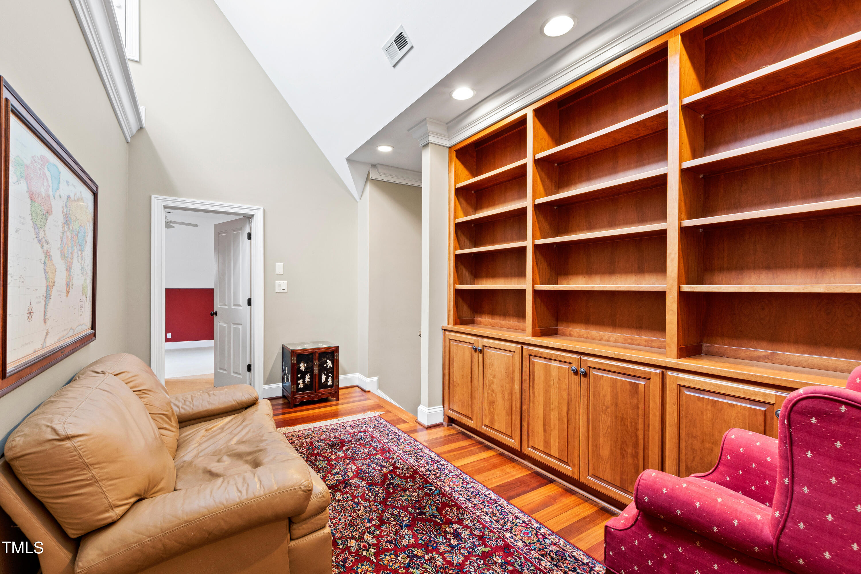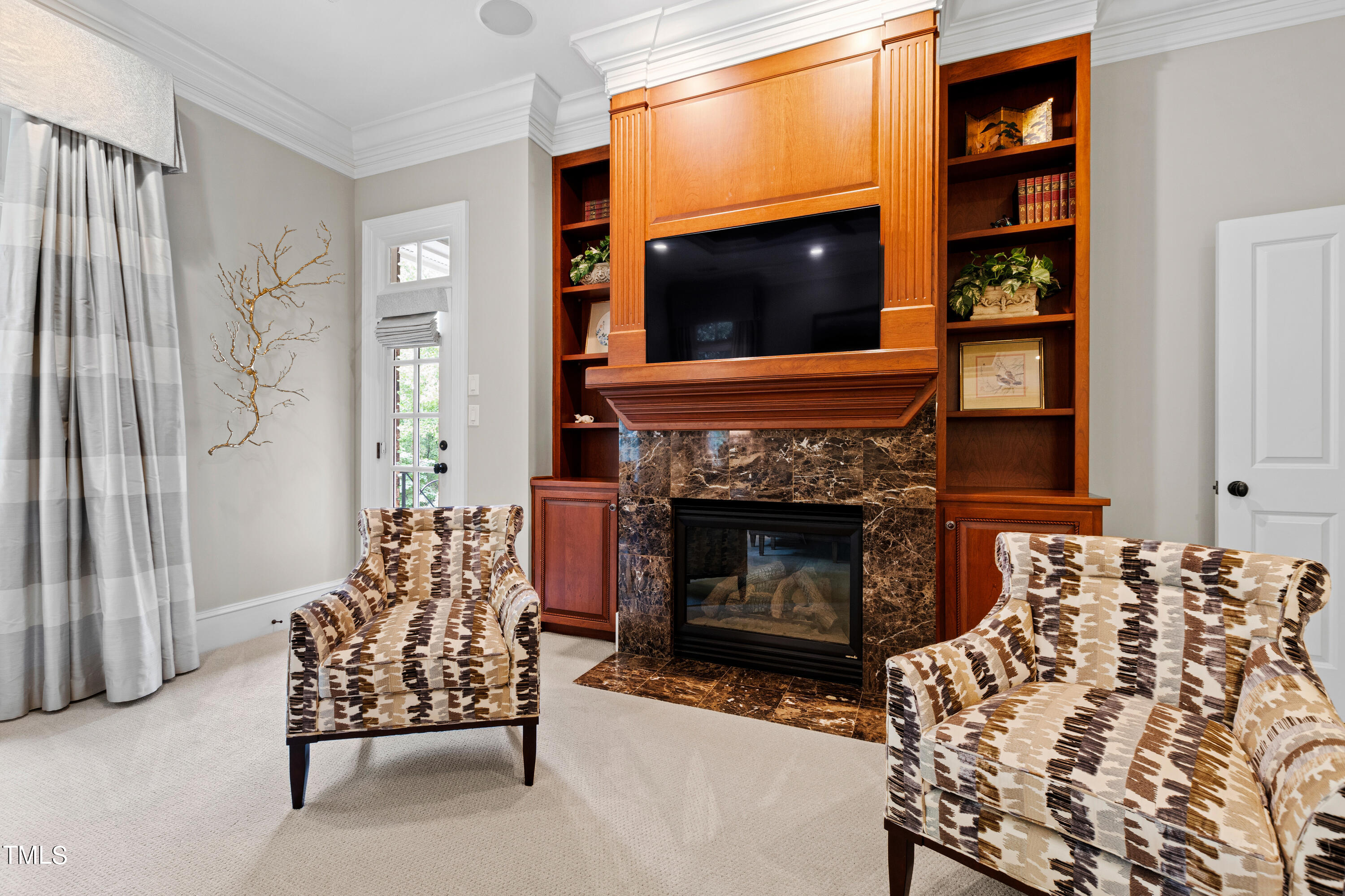 welcoming ambiance with its large windows and wall of built-in cabinetry flanking a