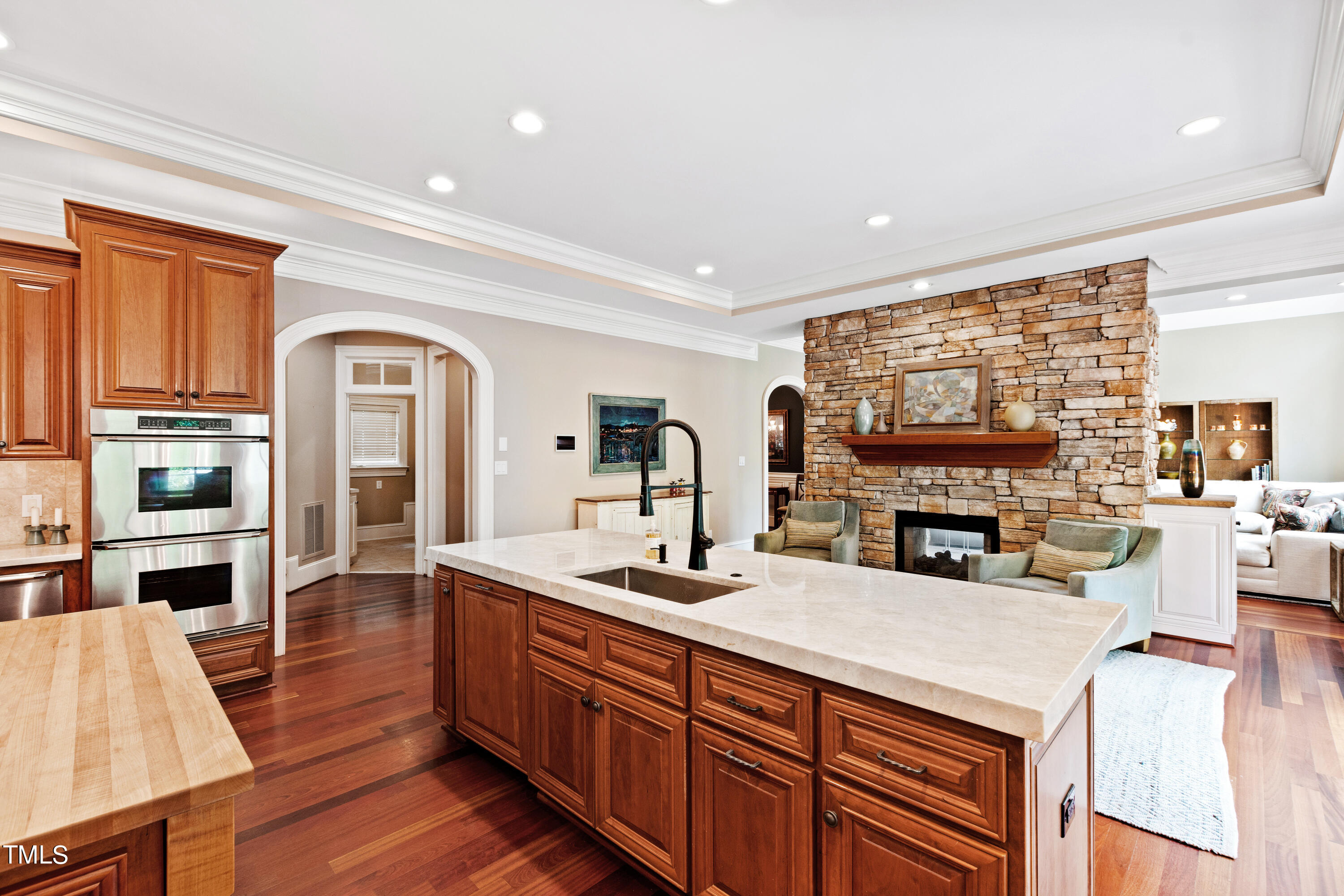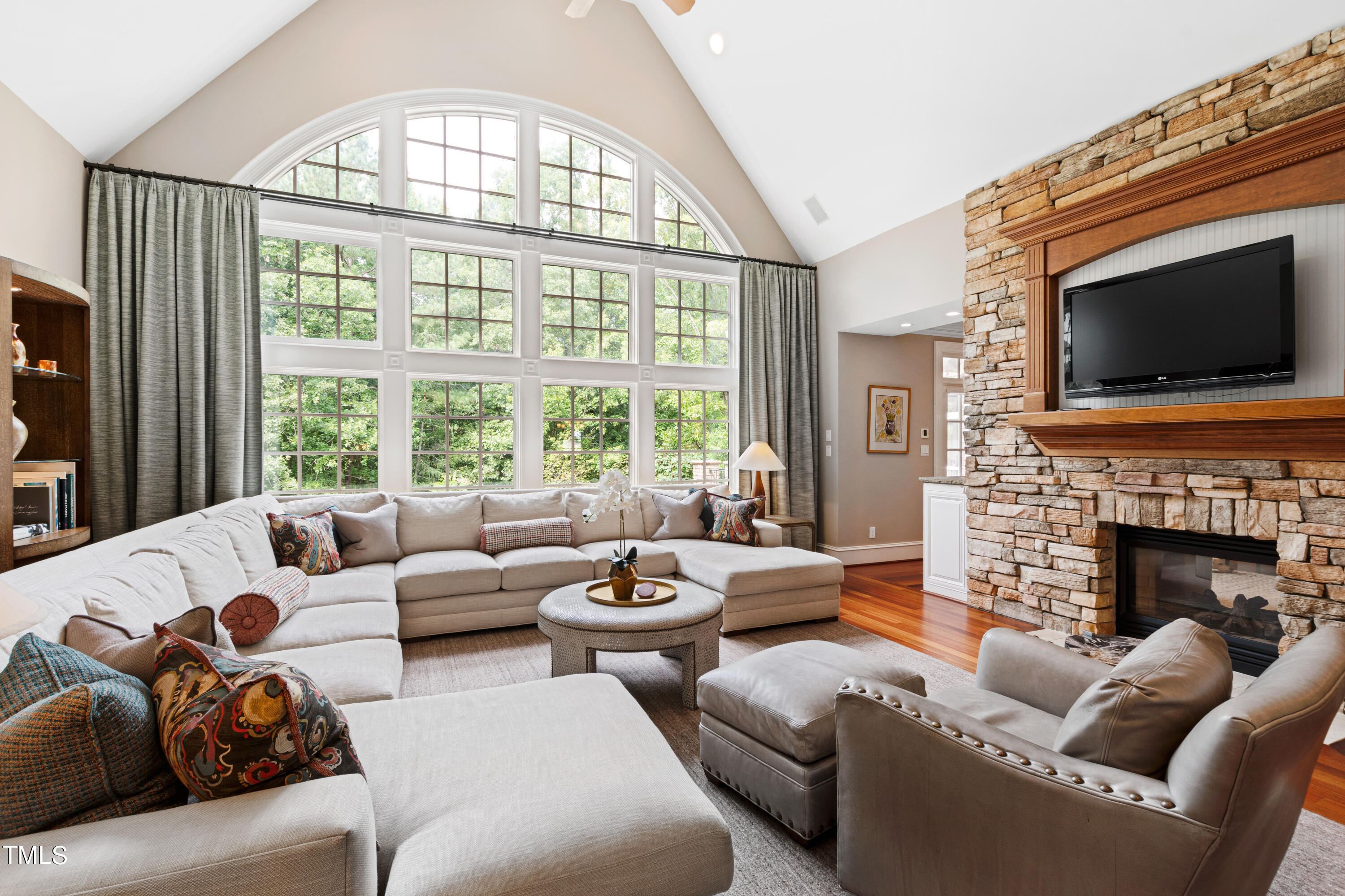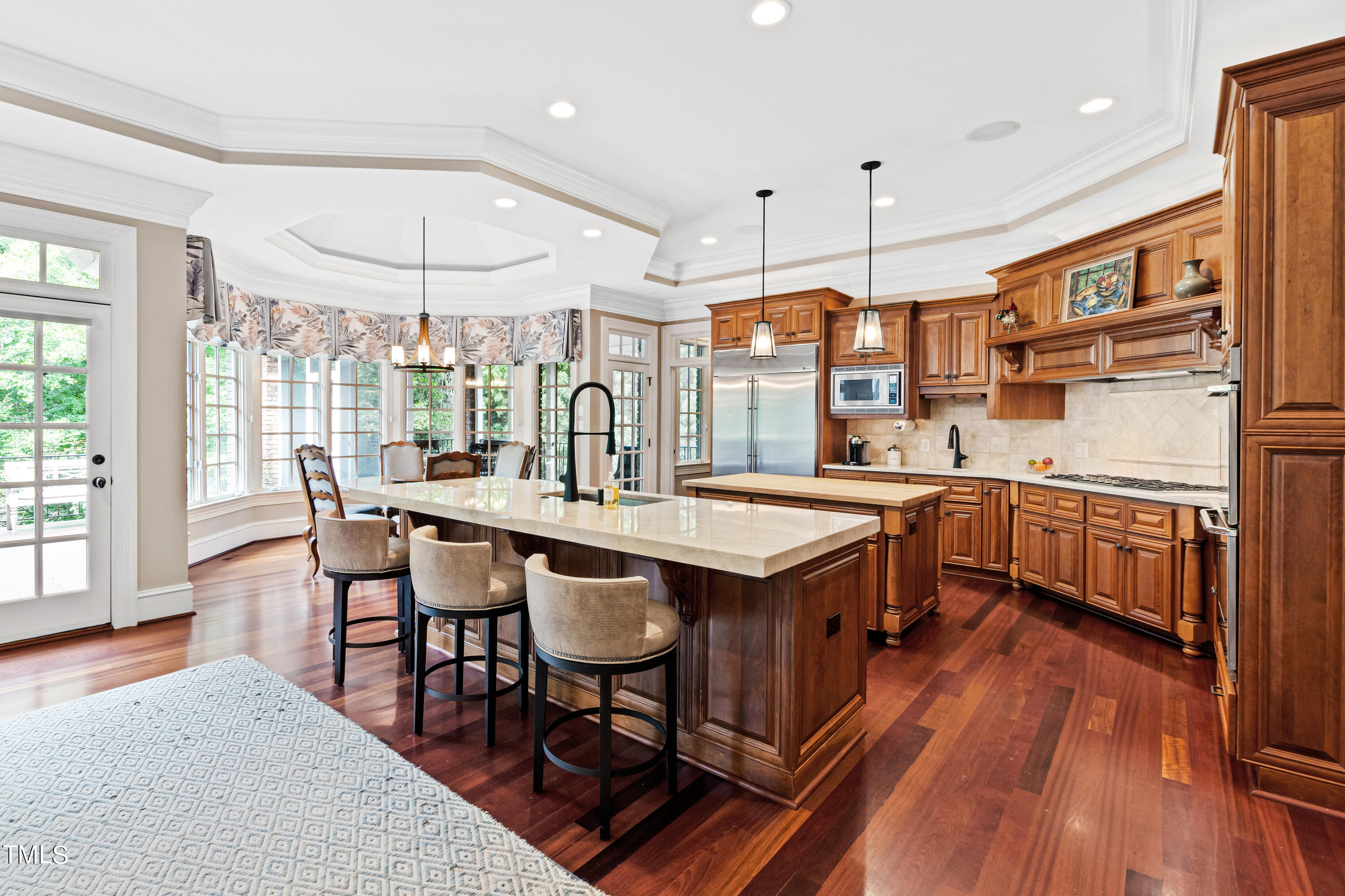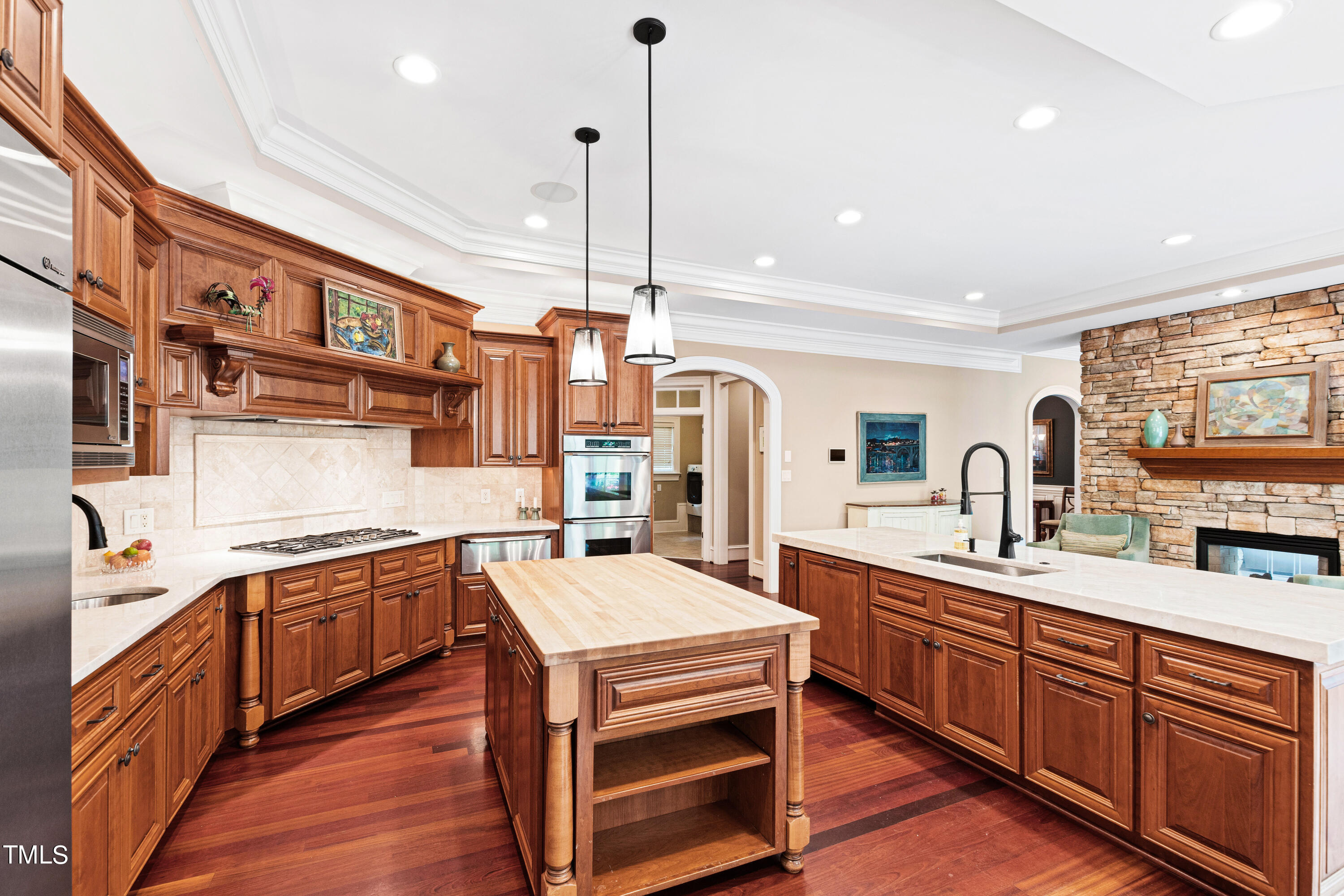 fireplace. The family room is bathed in natural light cascading through a near floor to cathedral ceiling bank of multi-pane windows. Adding to the room's dramatic presence is a wall of stacked flagstone surrounding the fireplace that passes through to the keeping room and culinary center. There, the sizeable kitchen hosts dual prep and serving islands, abundant cabinets, and high-end stainless appliances. There is a pantry and a dome