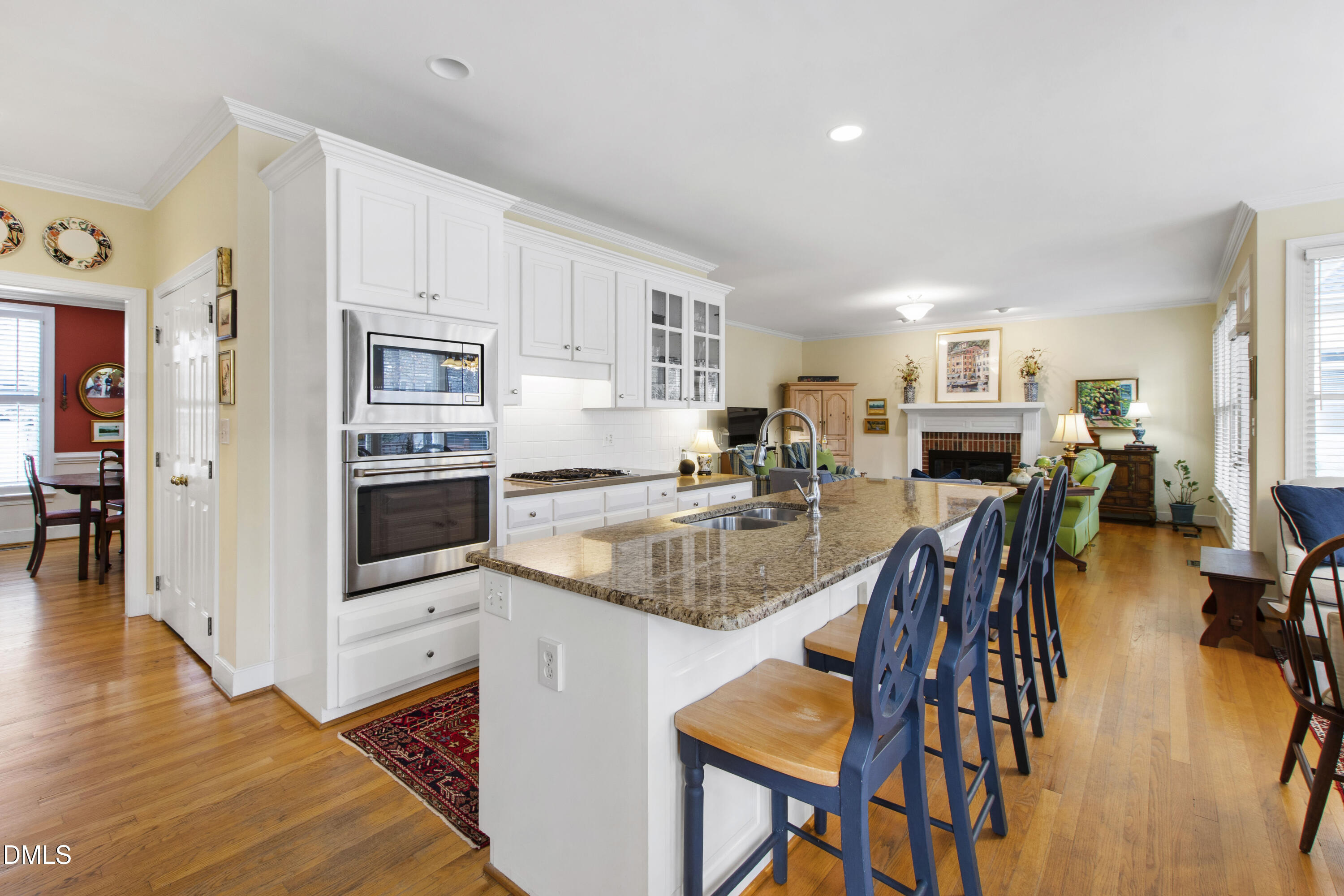 large center island, custom cabinetry, a walk-in pantry, and a convenient butler's pantry that flows seamlessly into the dining room. The kitchen opens to a welcoming family room with a cozy gas fireplace, as well as a bright breakfast area--each lined with abundant windows overlooking the inviting deck, patio, and backyard beyond.
