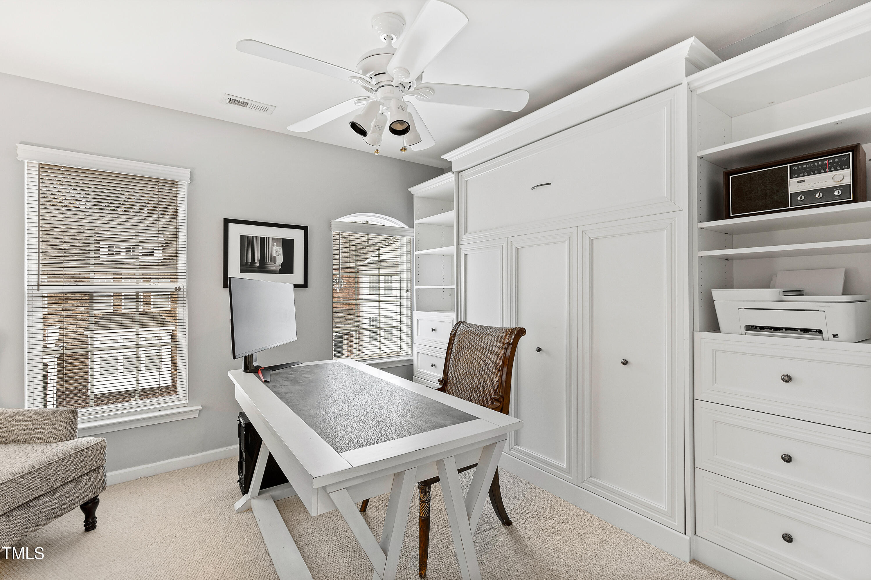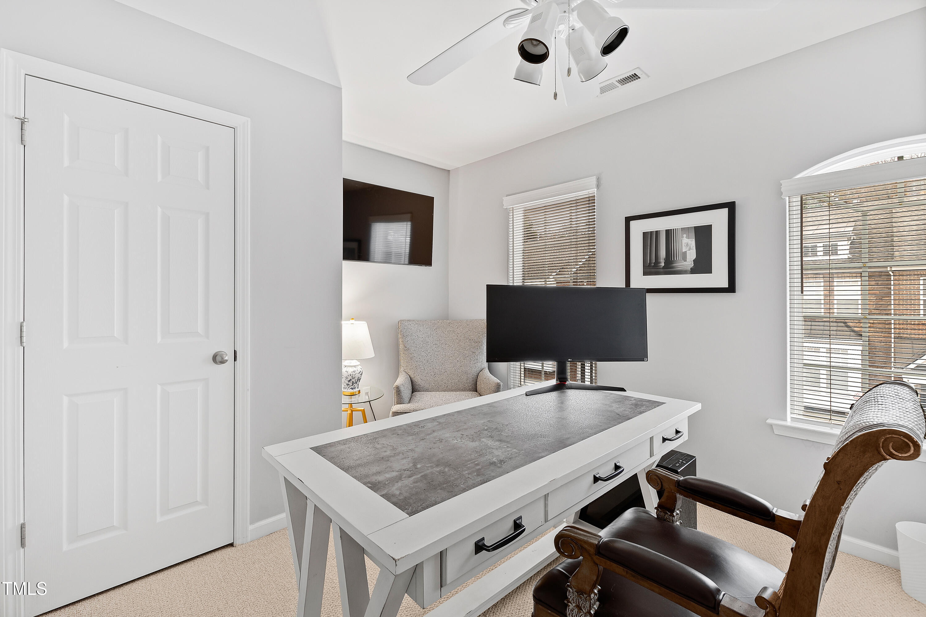 The spacious owner's suite is a highlight, featuring a sunny bath and a generous walk-in closet. Two additional guest bedrooms are located upstairs--one currently set up as an office--both share a well-appointed hall bath. Whether you're hosting guests or enjoying quiet time at home, this townhome offers an ideal blend of comfort and style.