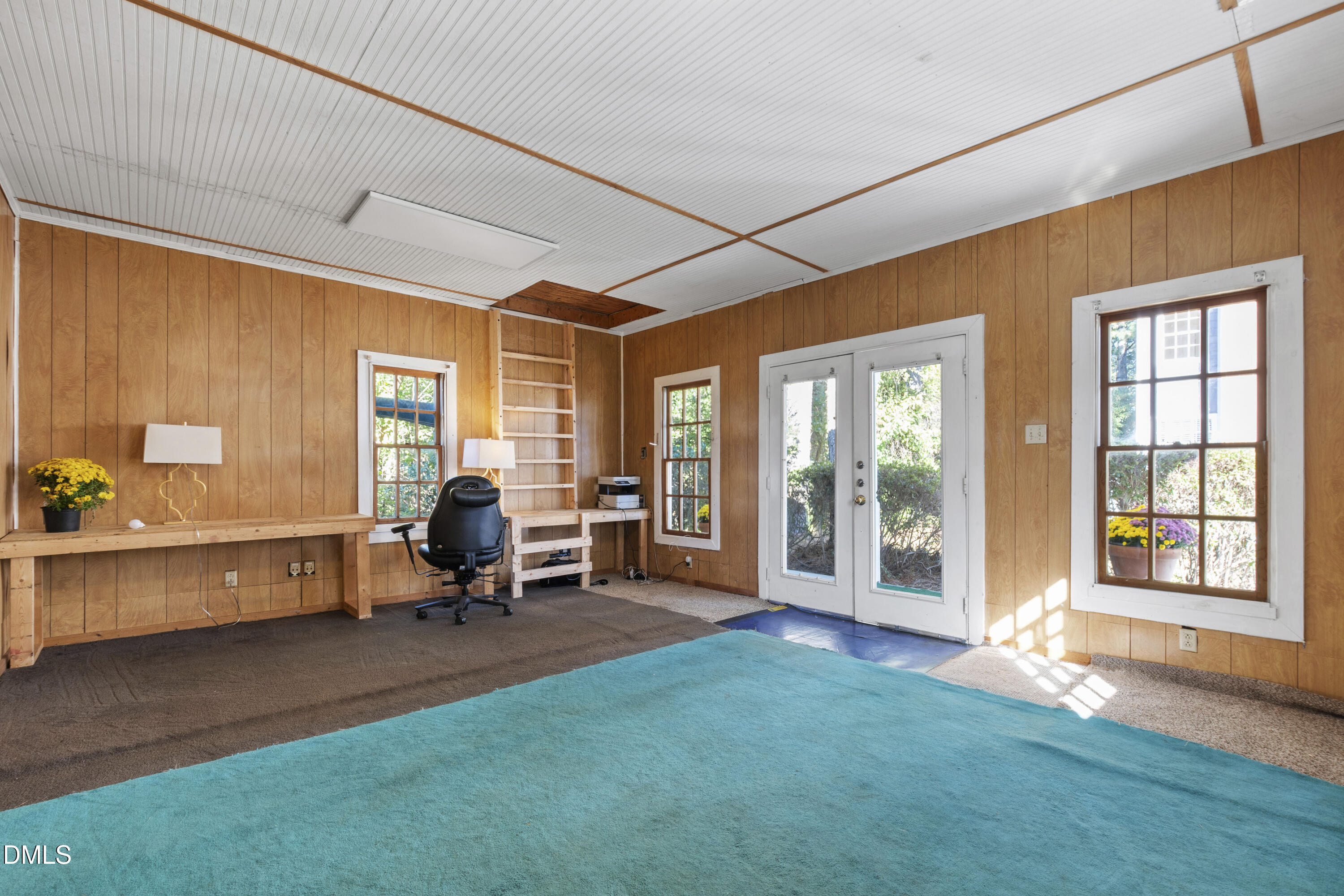 The flat lot features a large backyard, ideal for entertaining or relaxing. A detached storage/office/workout shed adds versatility, and the built-in gas grill makes outdoor living even easier.