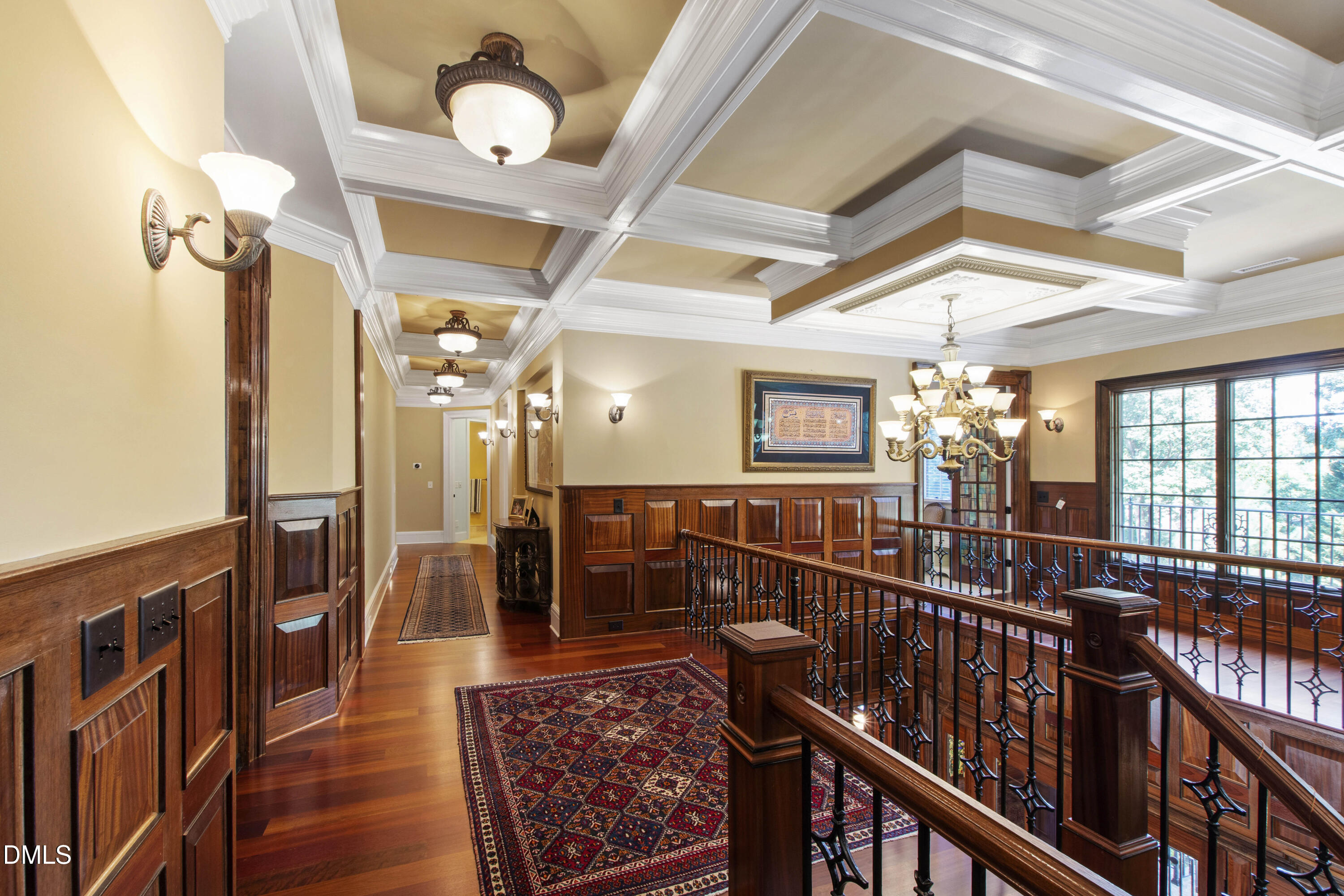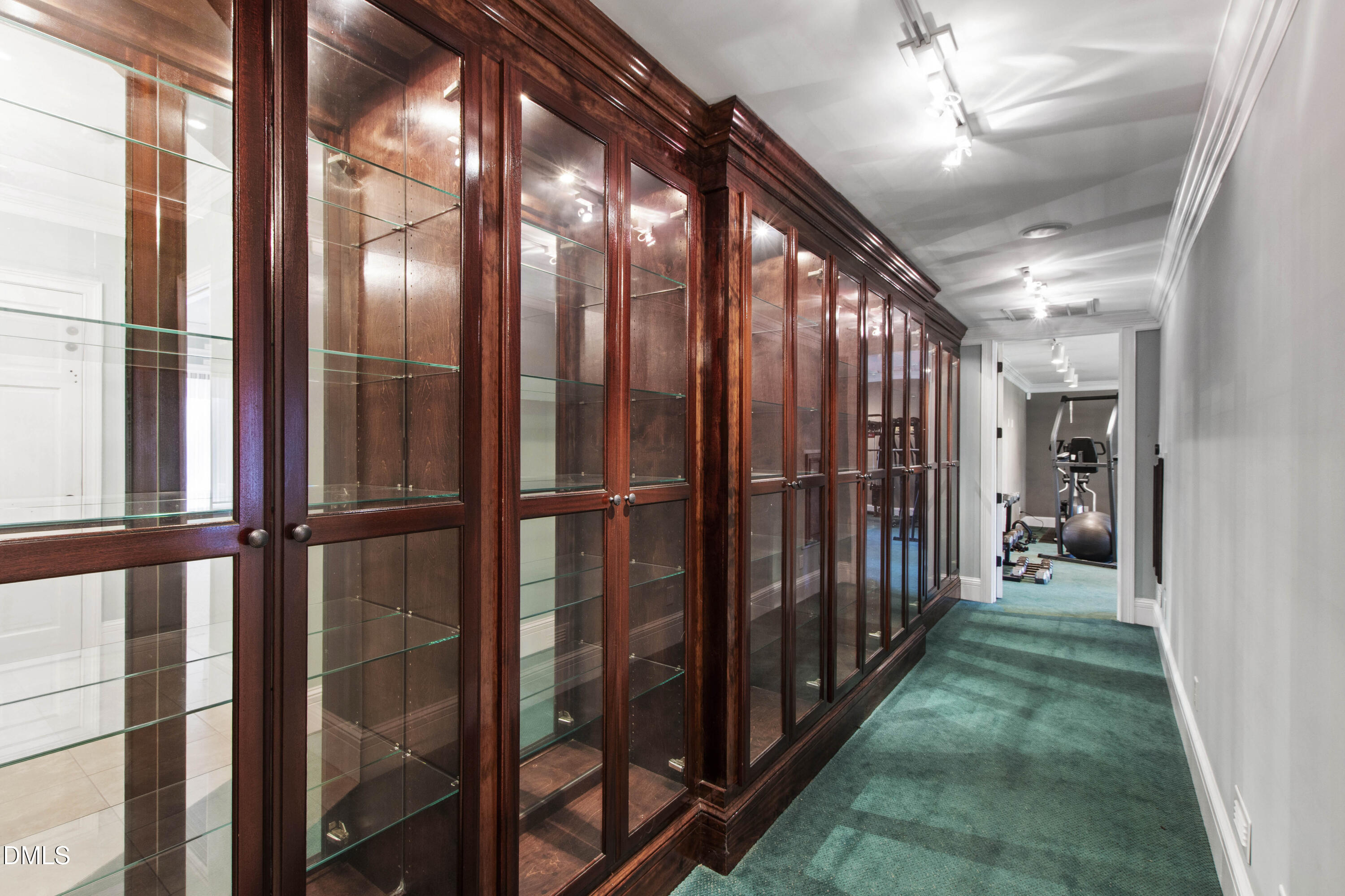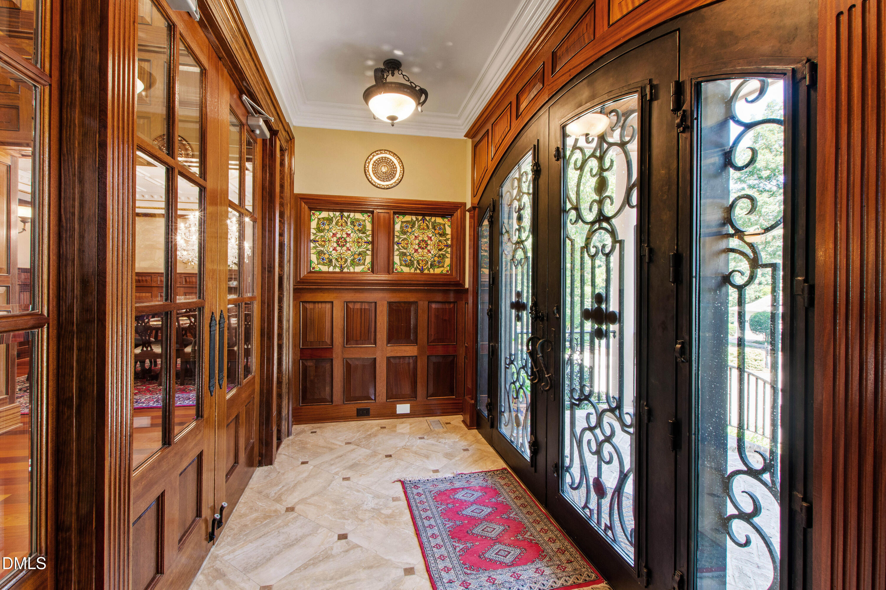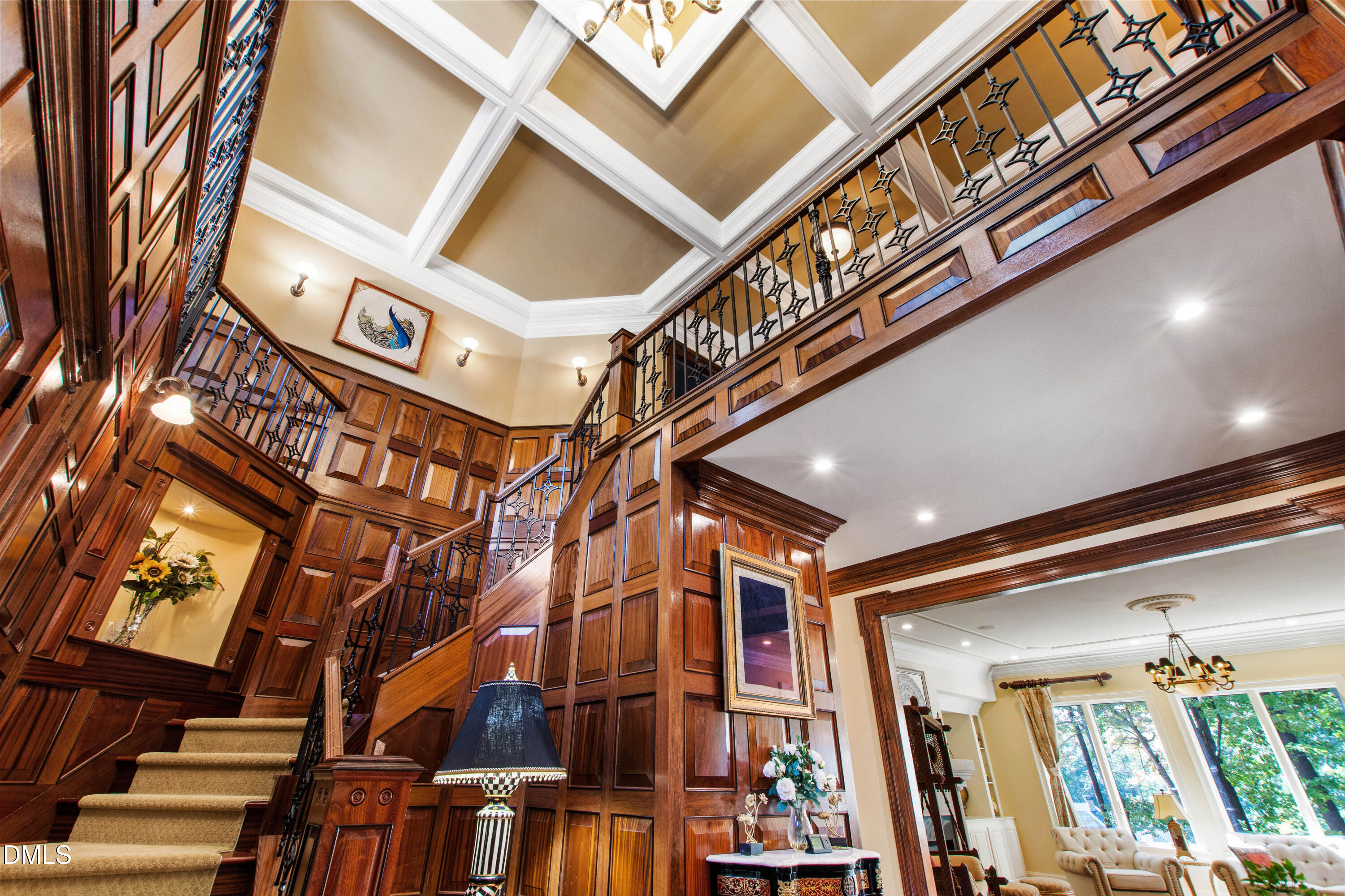 The formal dining room exemplifies this artistry with 18-carat gold leaf ceiling trim modeled after a historic downtown Cary landmark, mahogany wainscoting, padded silk wall coverings, and a 24-arm Italian crystal chandelier of nearly 1,200 individual pieces. Four gas fireplaces showcase unique surrounds of this home, from carved marble to stately limestone, adding warmth and distinction throughout.