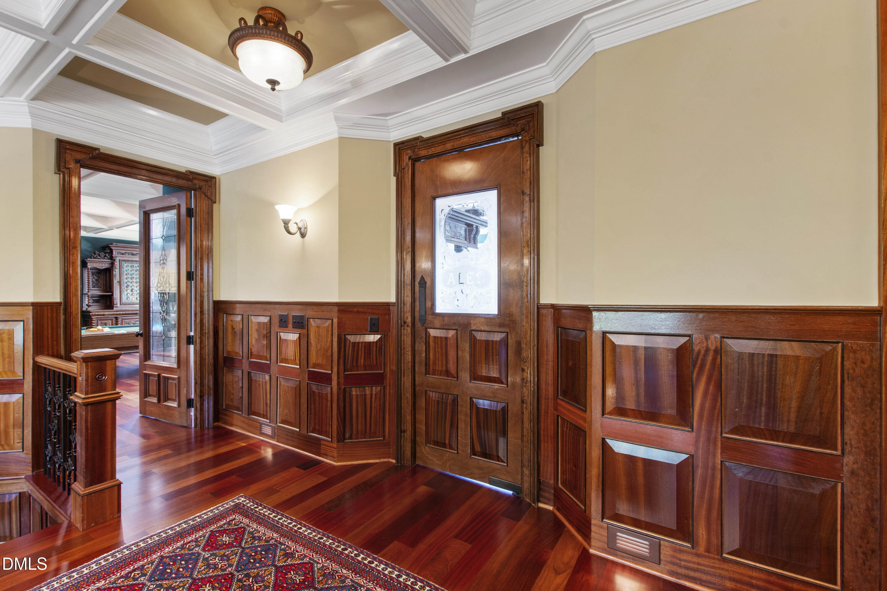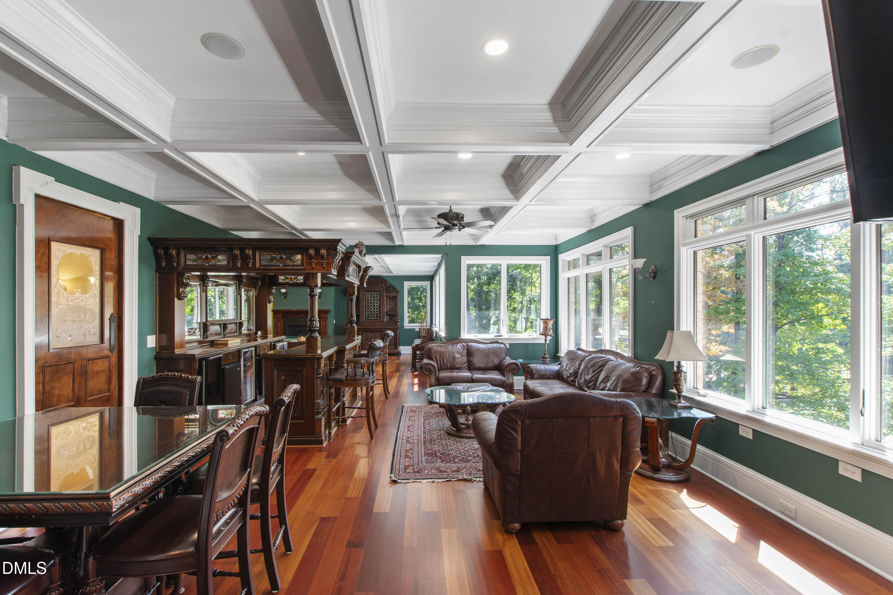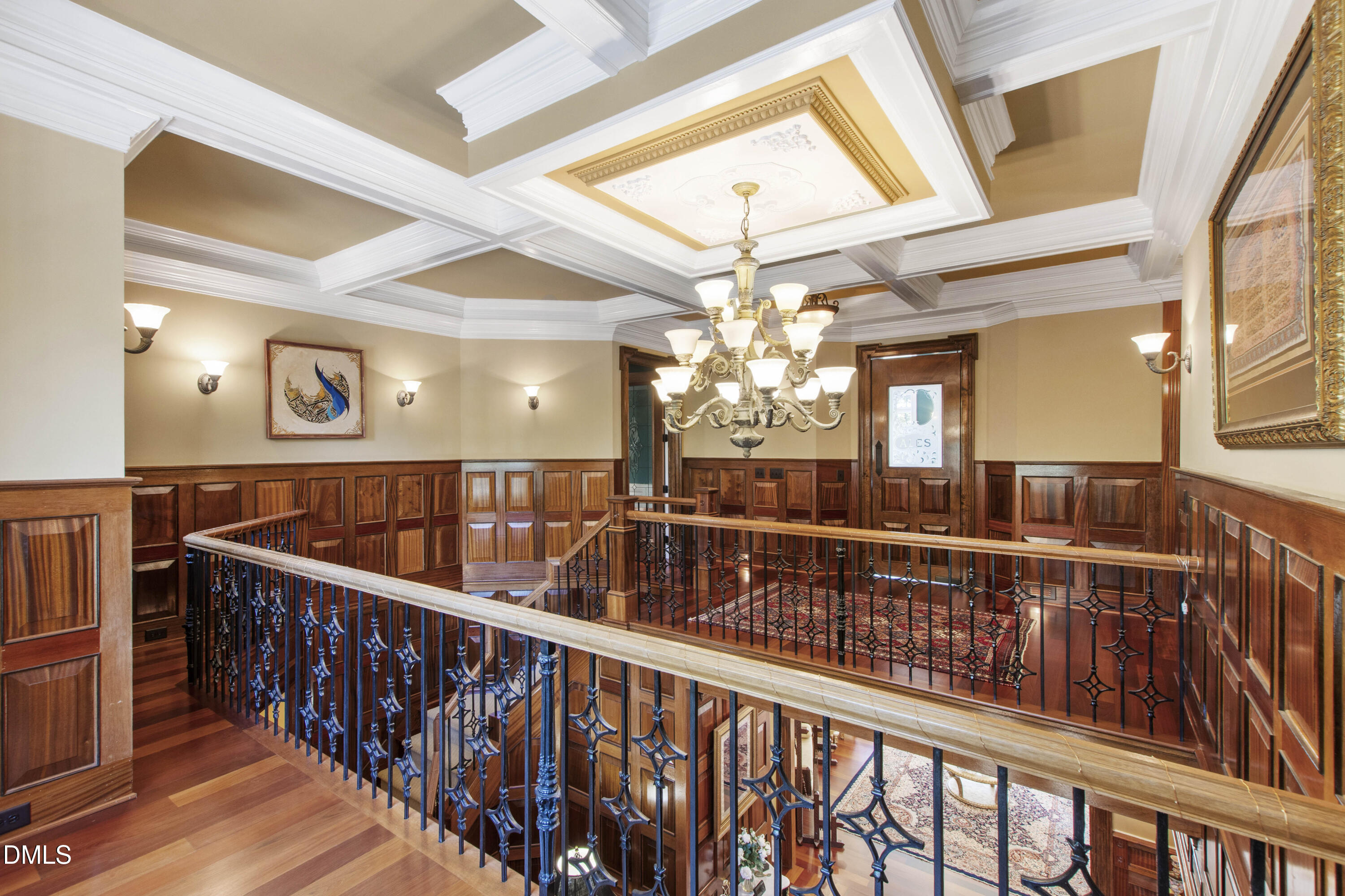 The formal dining room exemplifies this artistry with 18-carat gold leaf ceiling trim modeled after a historic downtown Cary landmark, mahogany wainscoting, padded silk wall coverings, and a 24-arm Italian crystal chandelier of nearly 1,200 individual pieces. Four gas fireplaces showcase unique surrounds of this home, from carved marble to stately limestone, adding warmth and distinction throughout.