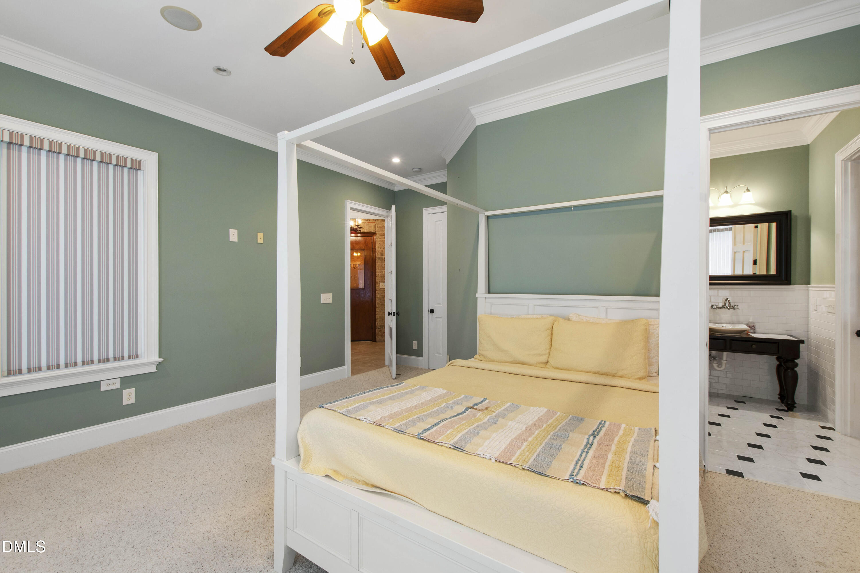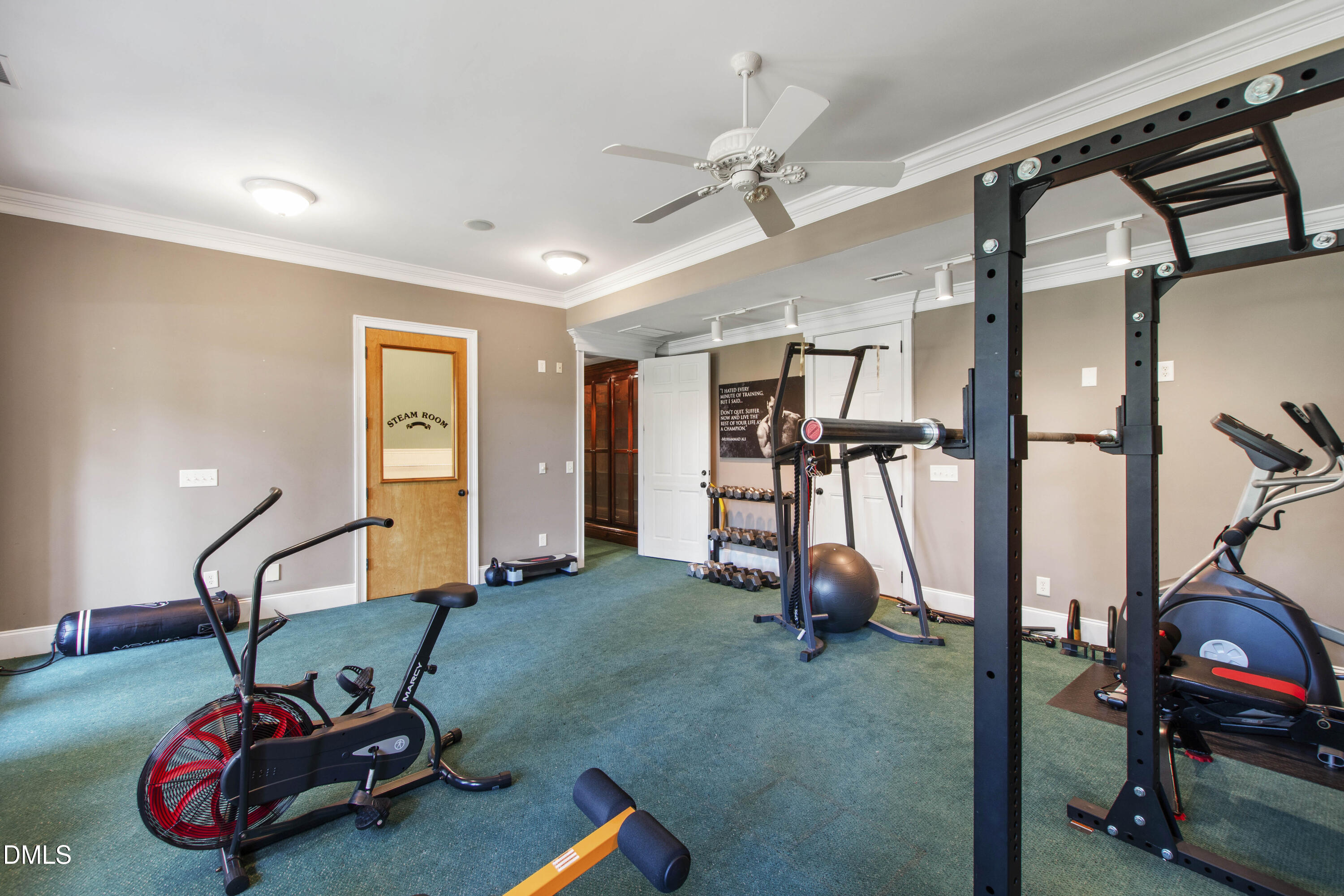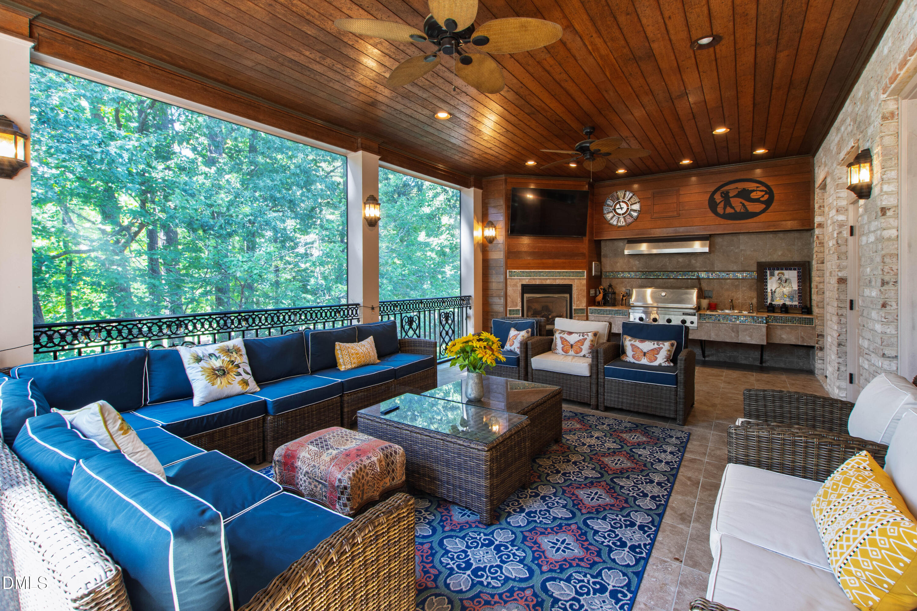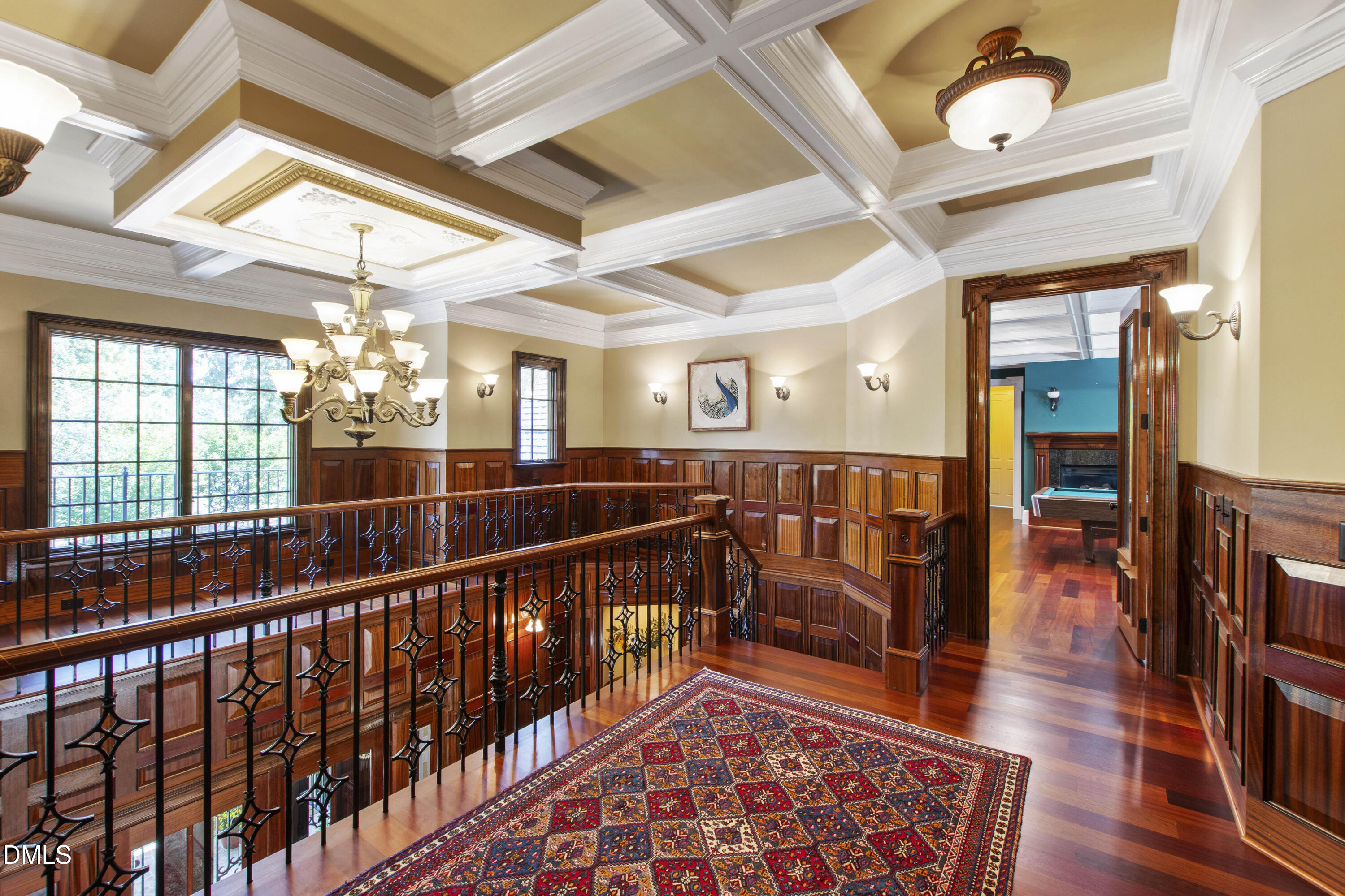 The formal dining room exemplifies this artistry with 18-carat gold leaf ceiling trim modeled after a historic downtown Cary landmark, mahogany wainscoting, padded silk wall coverings, and a 24-arm Italian crystal chandelier of nearly 1,200 individual pieces. Four gas fireplaces showcase unique surrounds of this home, from carved marble to stately limestone, adding warmth and distinction throughout.