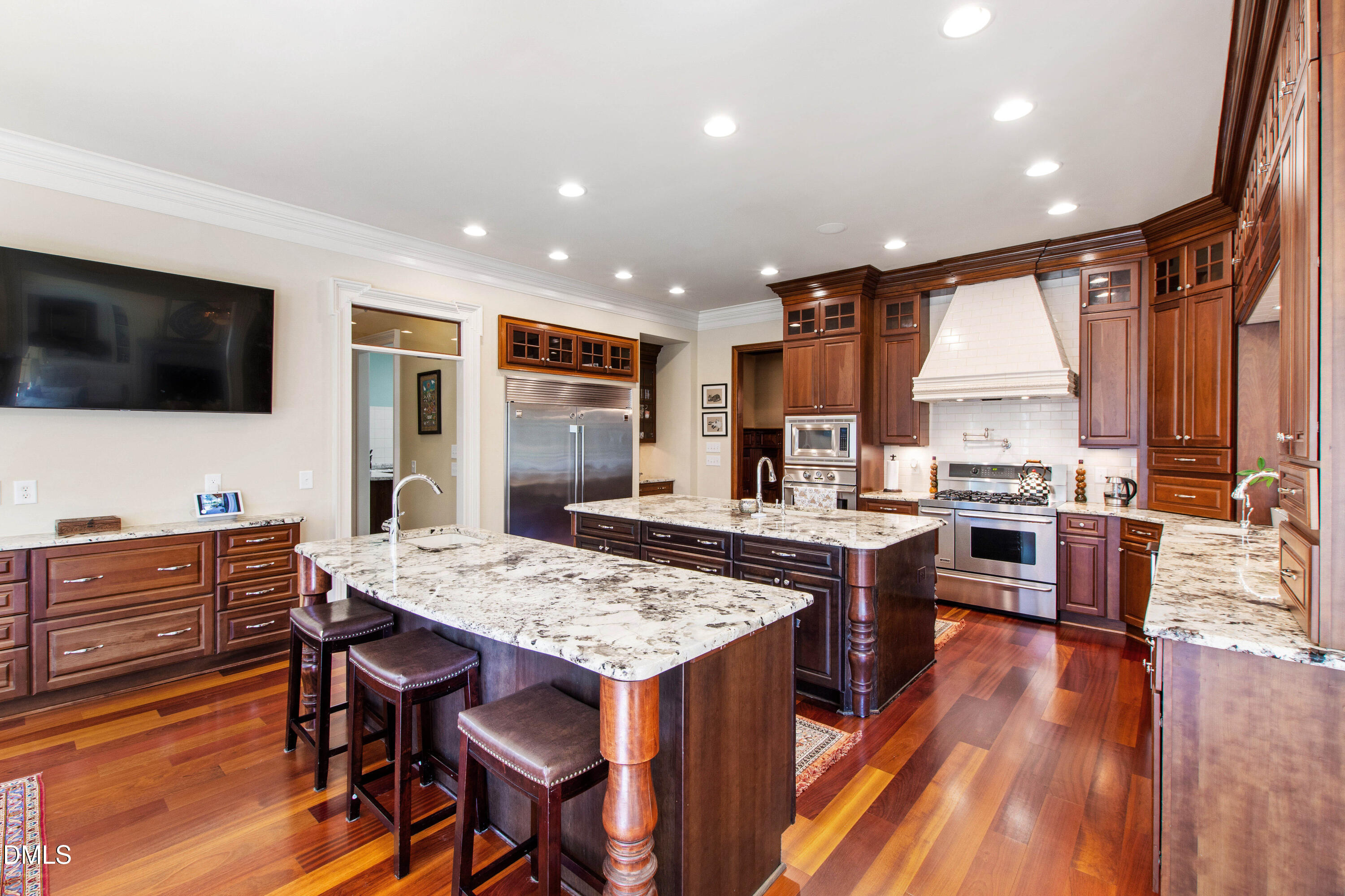 At the heart of the home lies the dual-island kitchen with cherry cabinetry, commercial-grade appliances, three dishwashers, and a butler's pantry. A separate catering kitchen supports large-scale entertaining. The breakfast room and screened porch with outdoor kitchen overlooking the 9th fairway, seamlessly blending indoor and outdoor living.